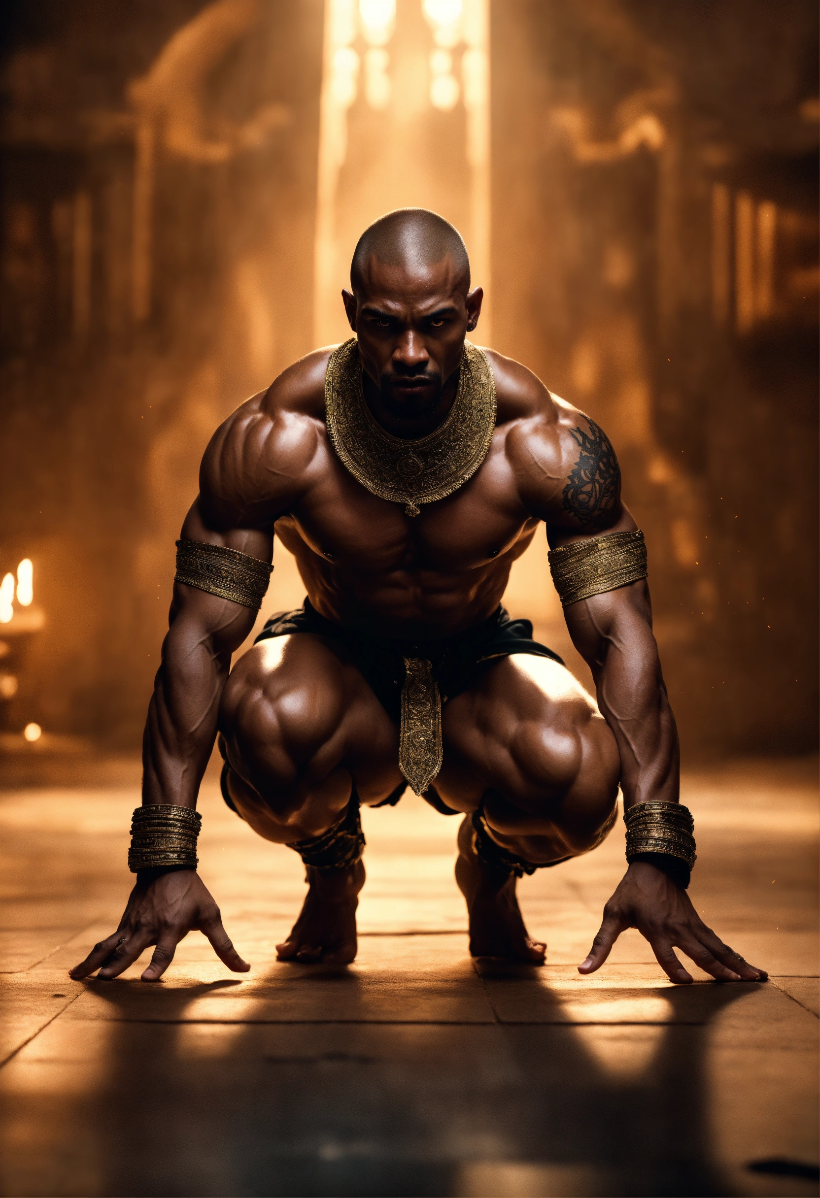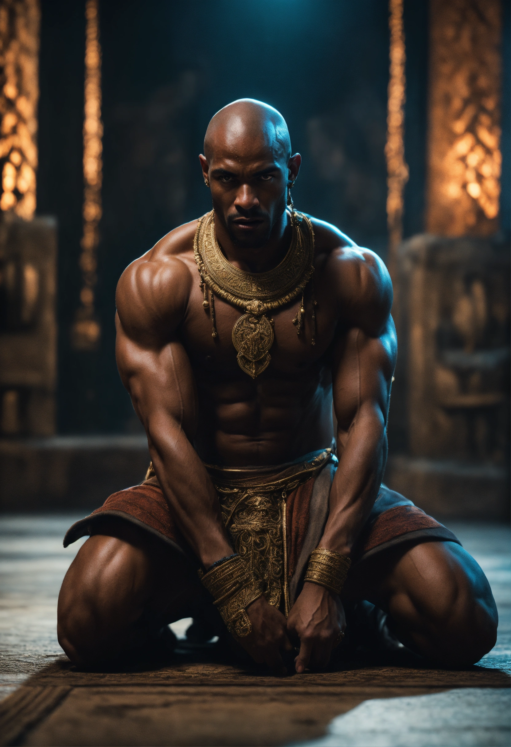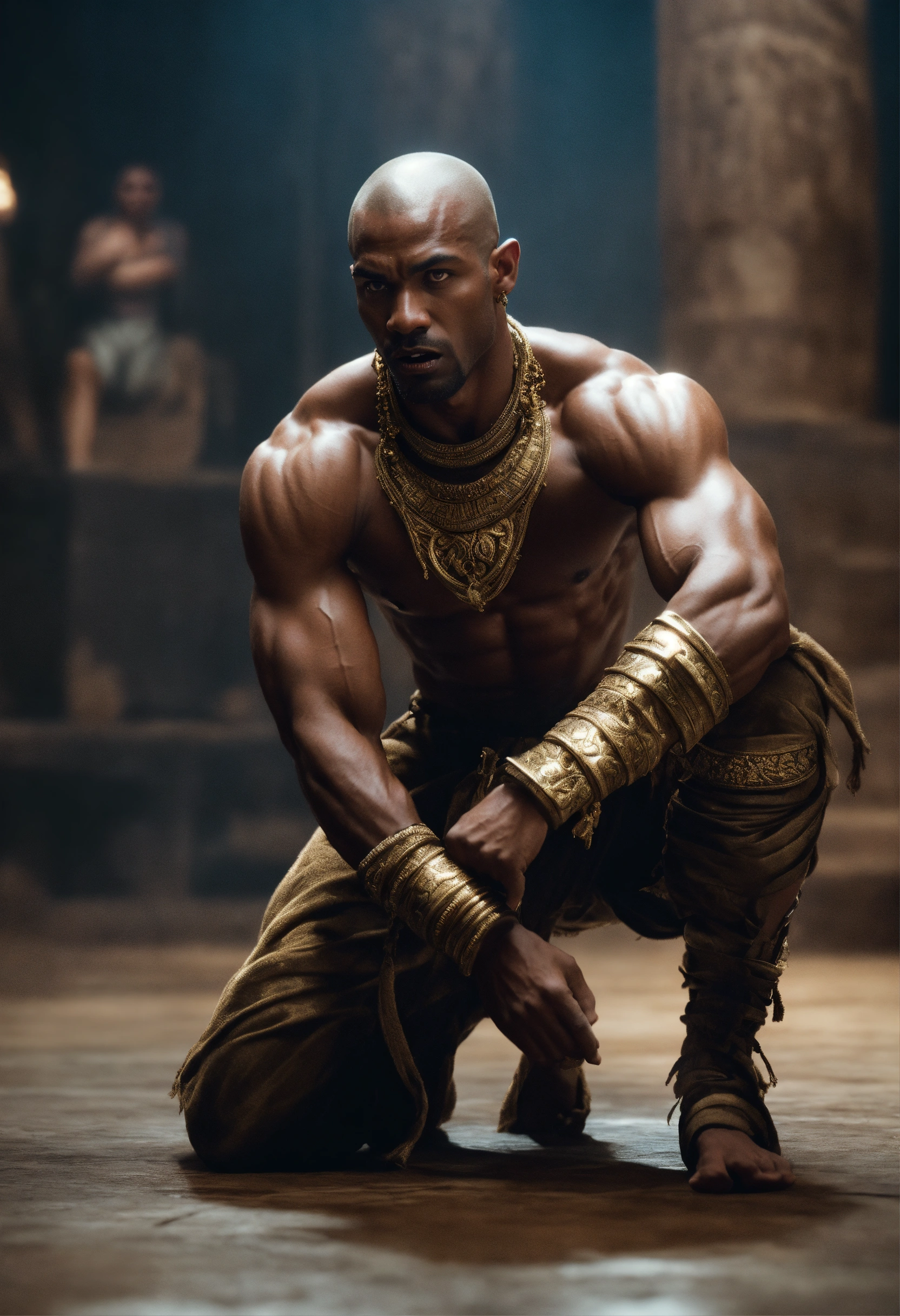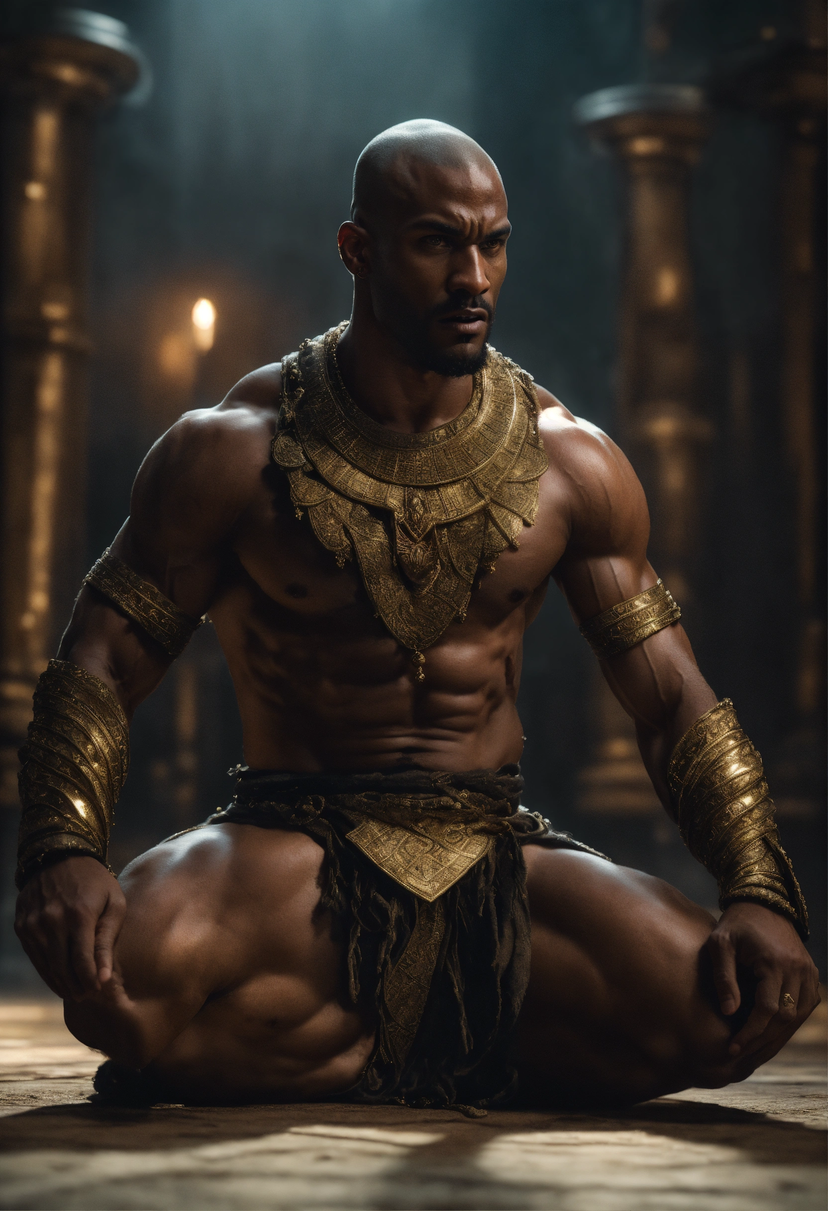 An epic fantasy scene featuring a muscular ancient nubian male with frighten look, fell on his knees on the floor, highly-detailed, full motion, high expression, shaved head, photo realistic, beautiful, moody lighting, best quality, realistic, real picture, intricate details, depth of field, back close view, raw photo, 8k uhd, film grain