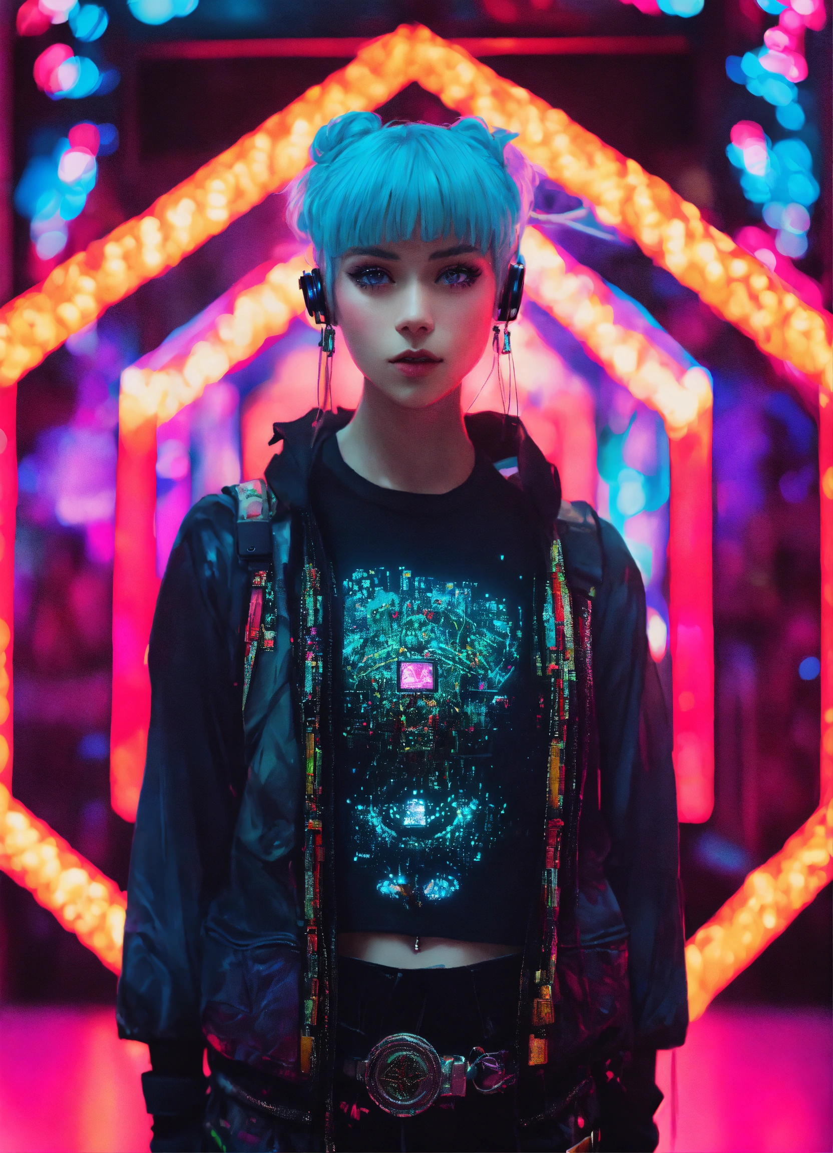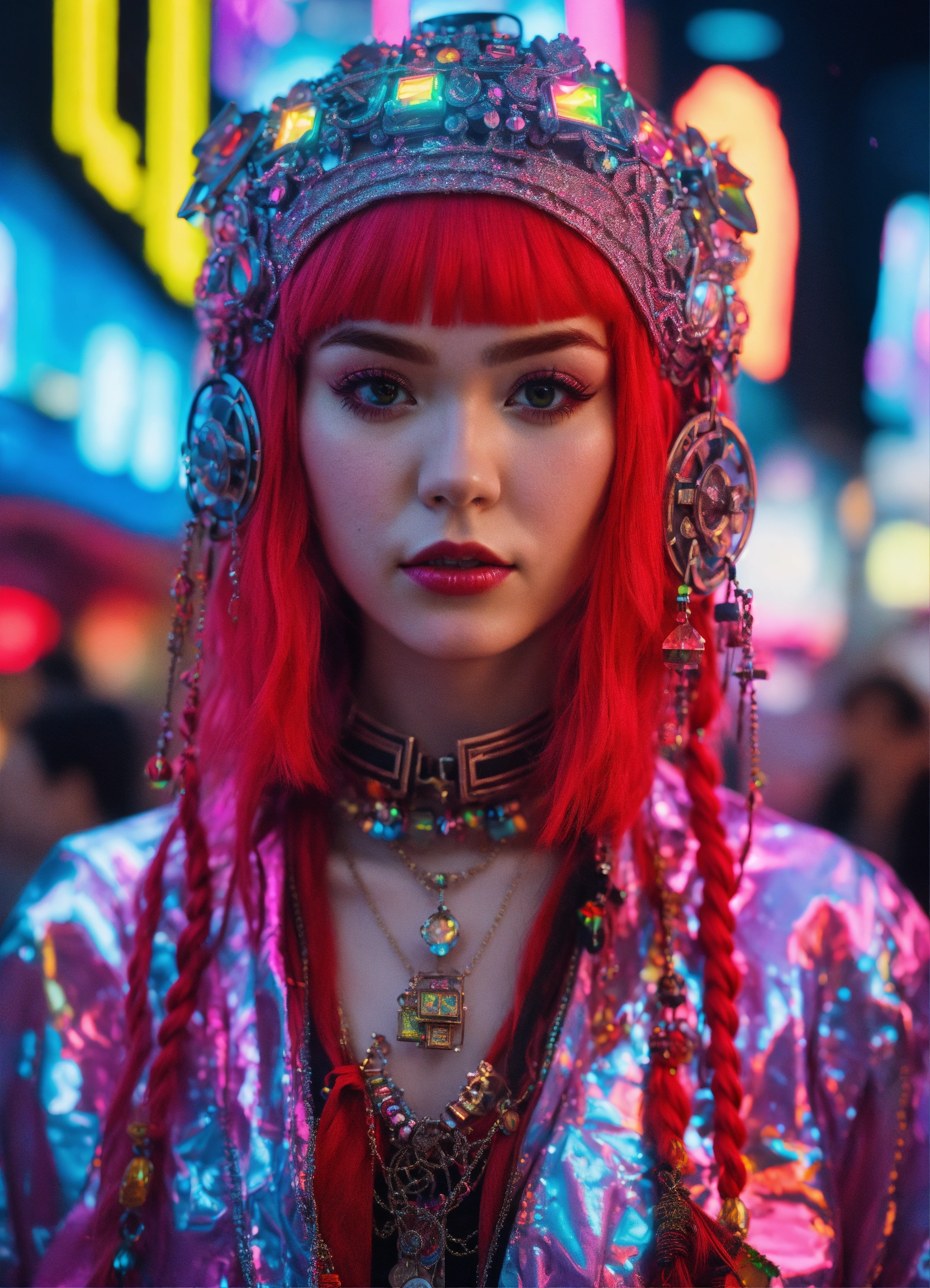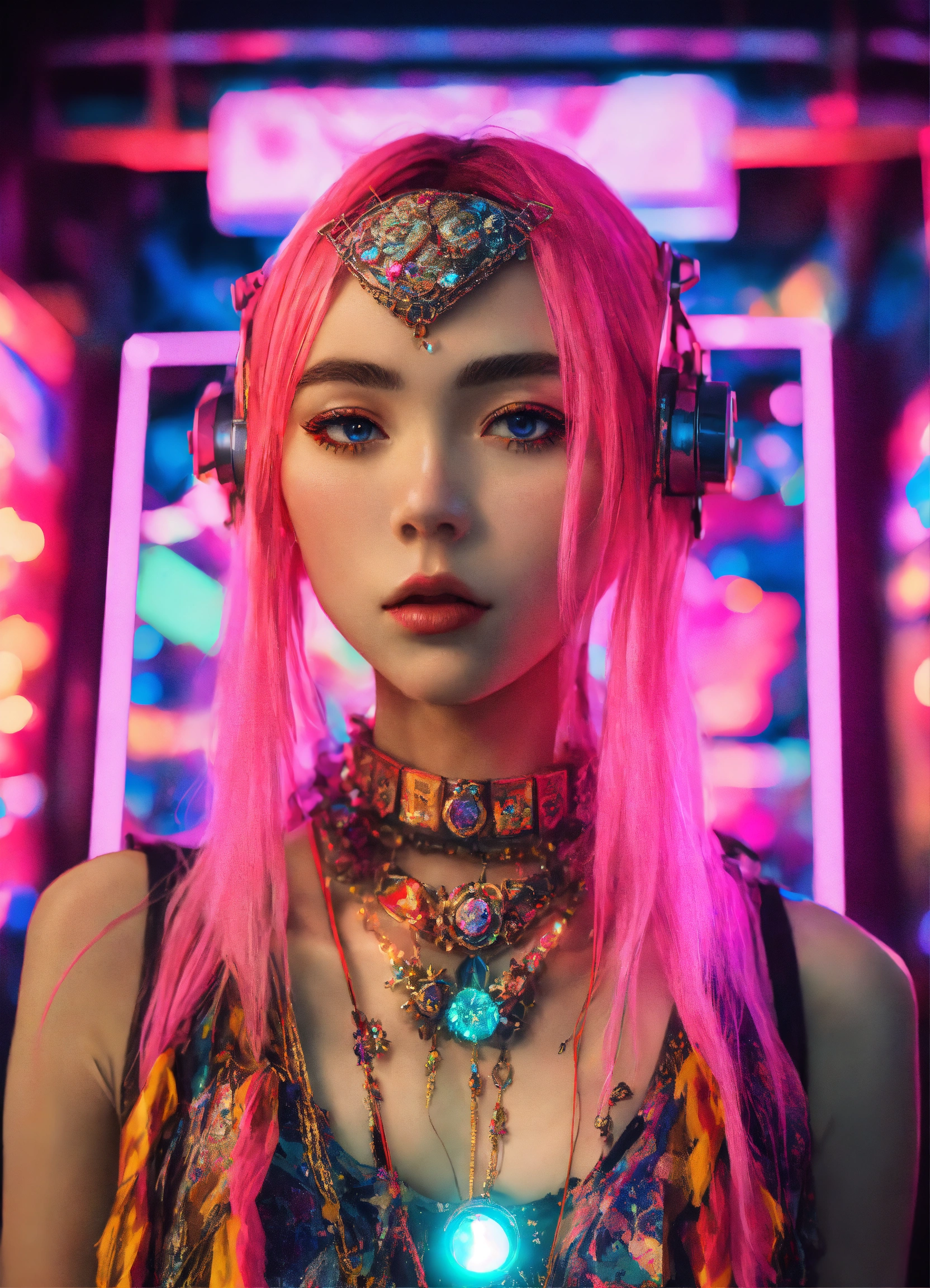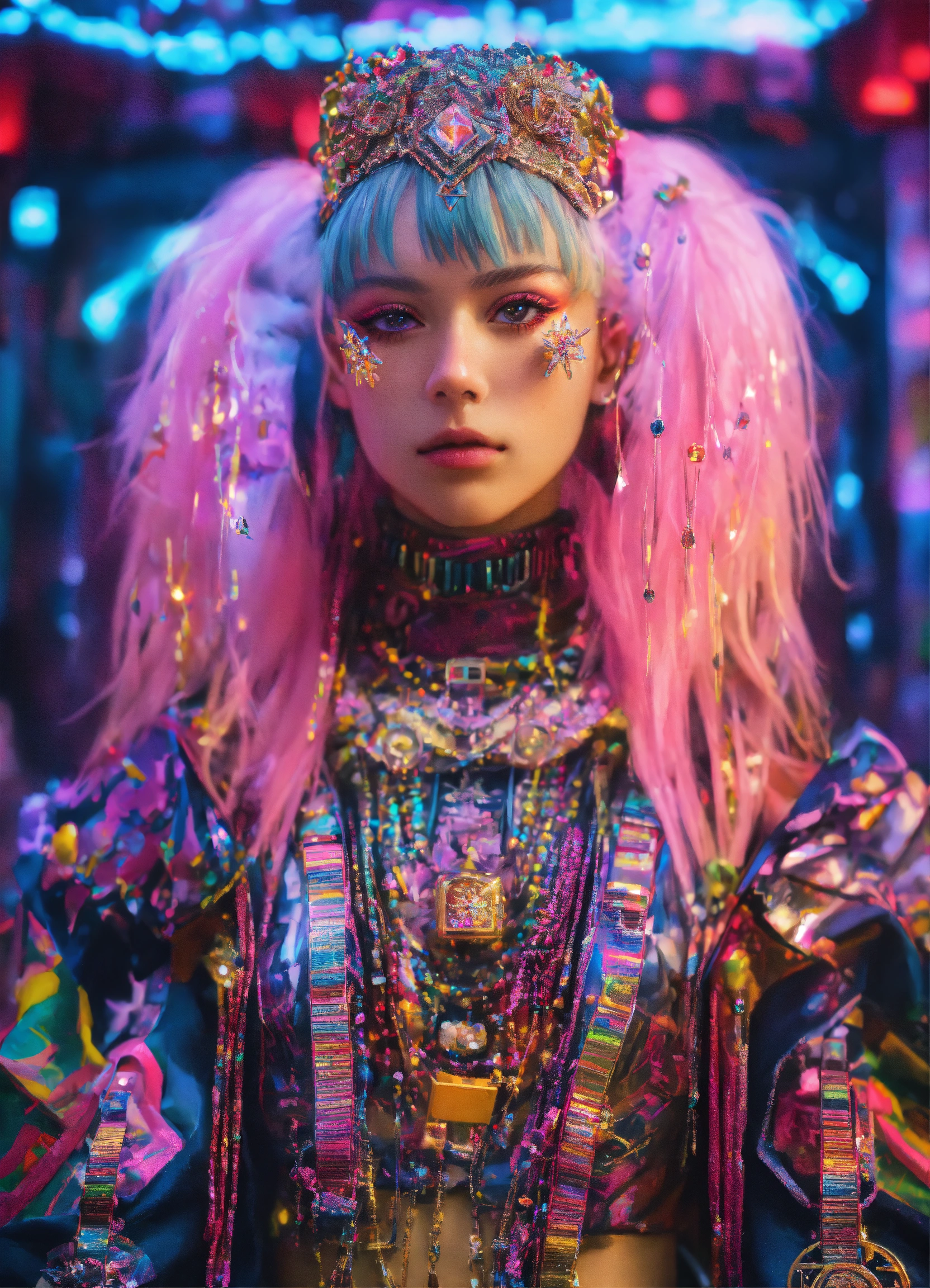 I’m photorealistic portrait of a diamond metal occult technology grimes ai god kawaii punk in folk costume, photorealistic tokyo arcade a death note cyberpunk colorado festival raver style with diamonds, of a person in urban dmt qr code wear, techno dmt neon room photorealistic, volumetric lighting, 8k, highly detailed