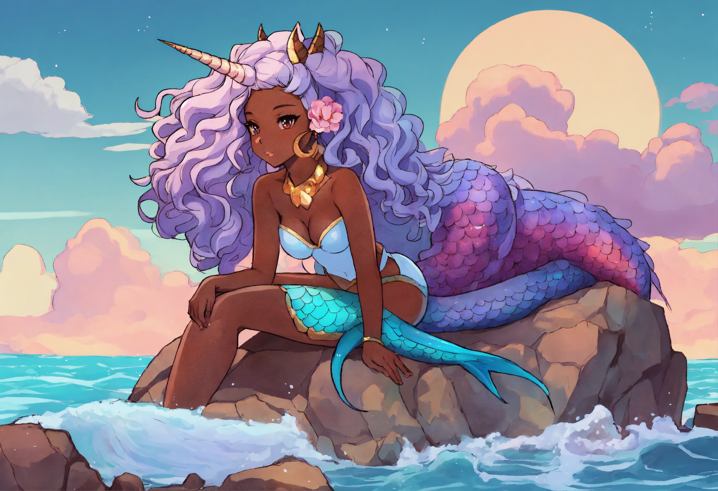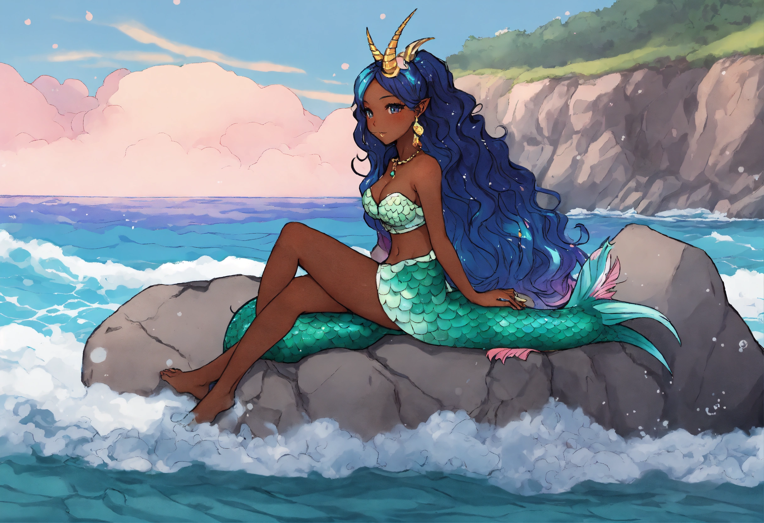 Manga kawaii melanated woman dragon-unicorn-mermaid resting on a raised rock close to the shore, waves crashing against surrounding rock outcropping