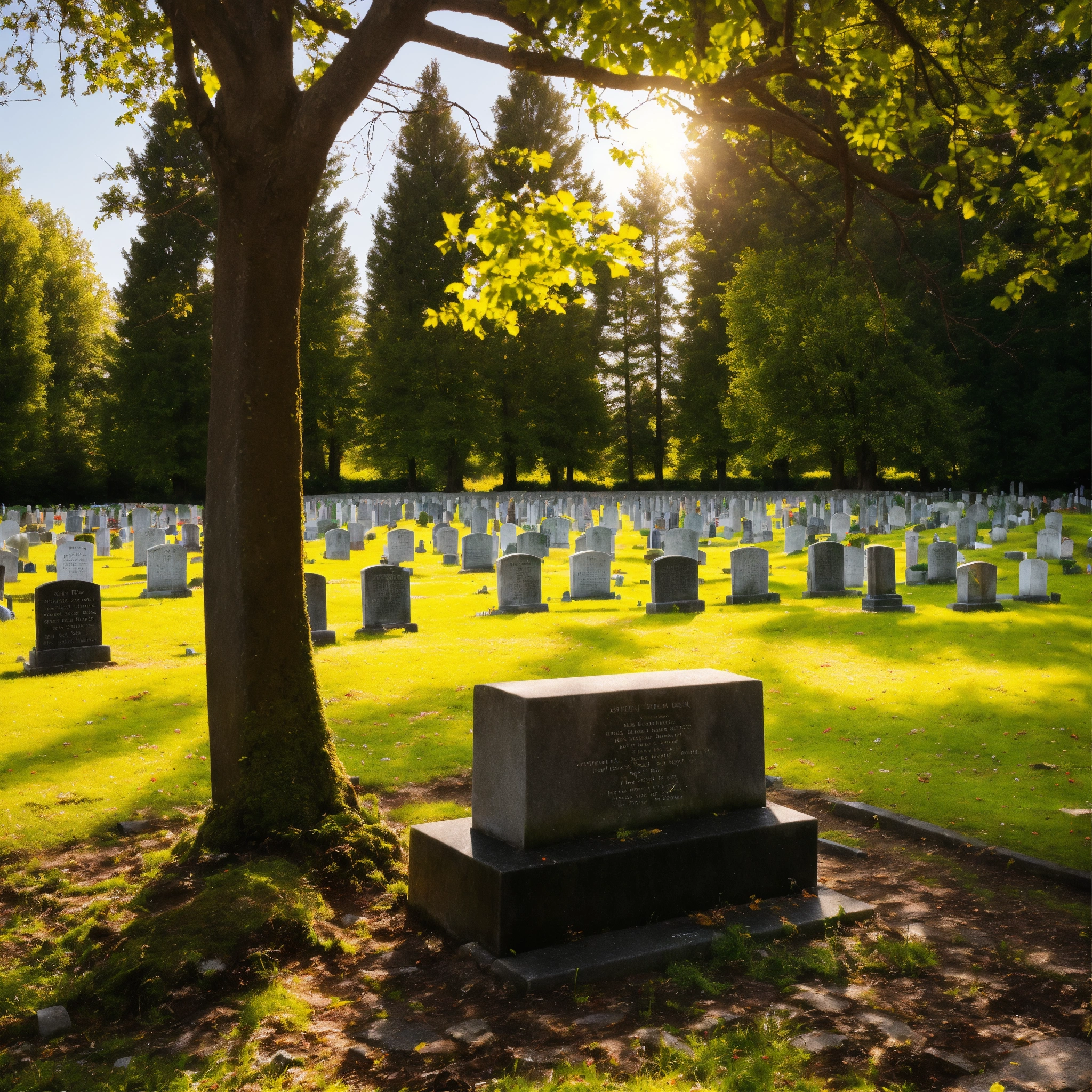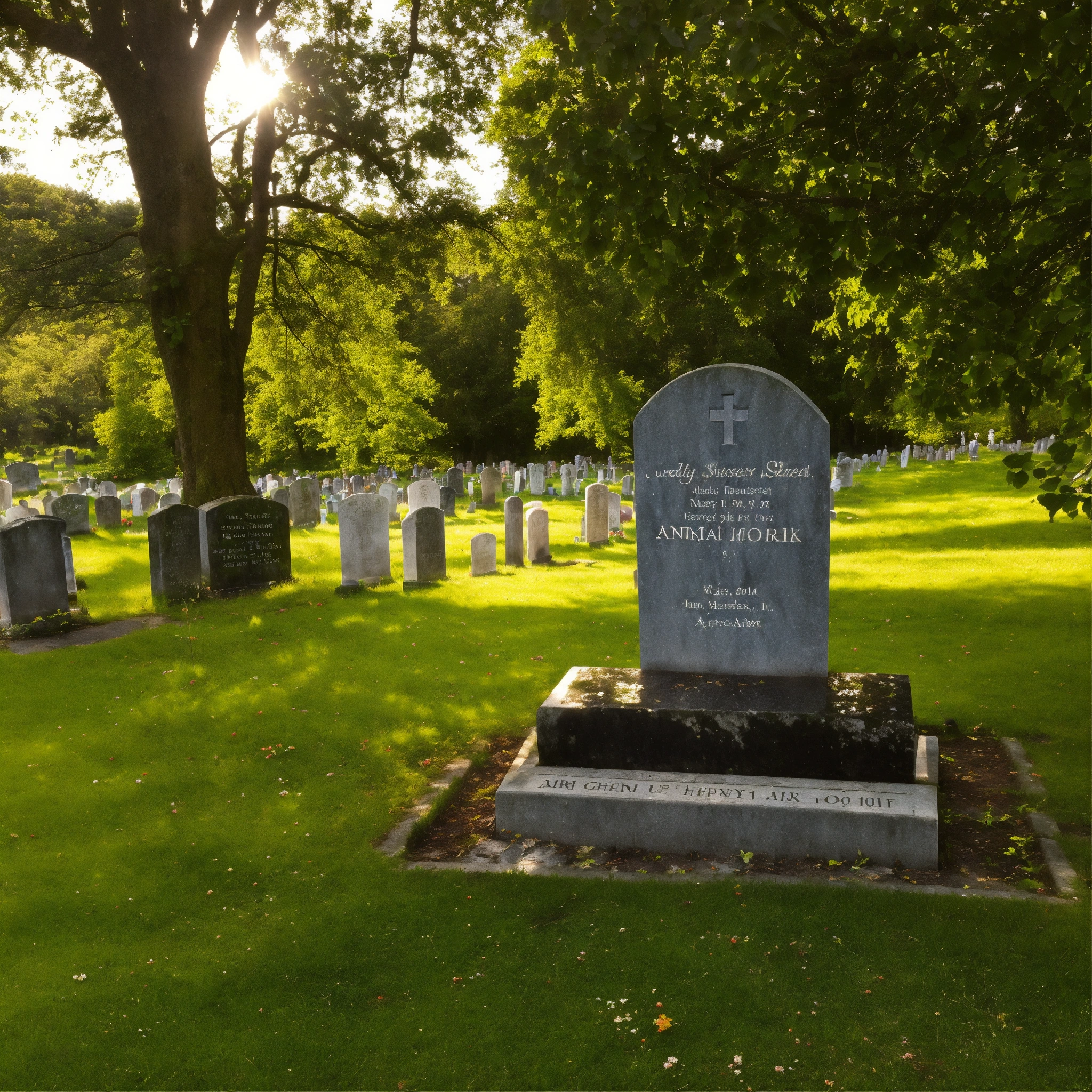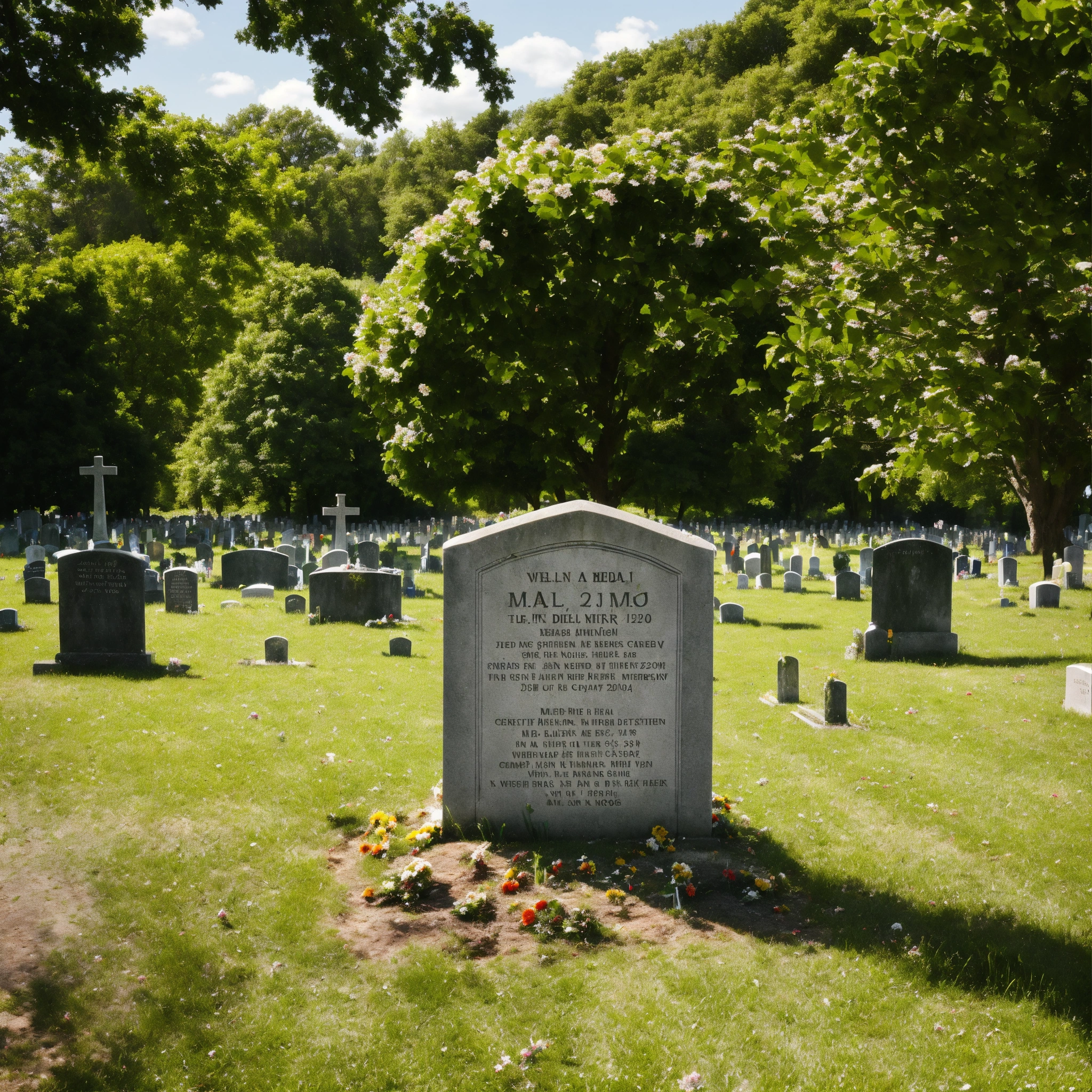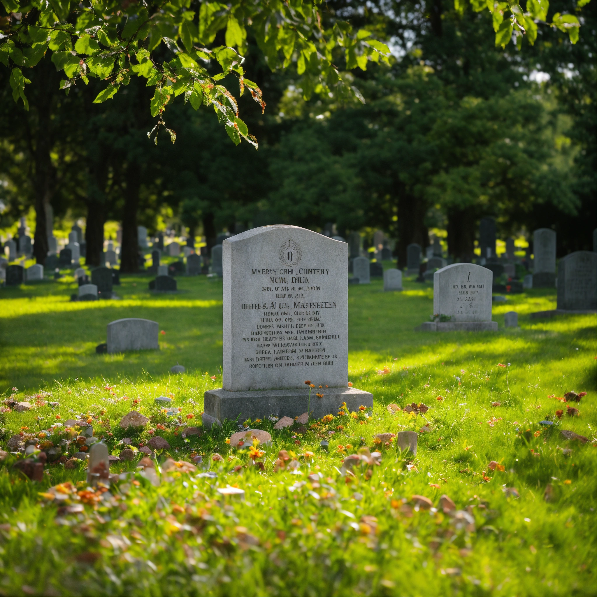 A photo of a cemetery with a headstone, the headstone is made of stone and is engraved with the name and dates of the deceased, the cemetery is surrounded by trees and grass
