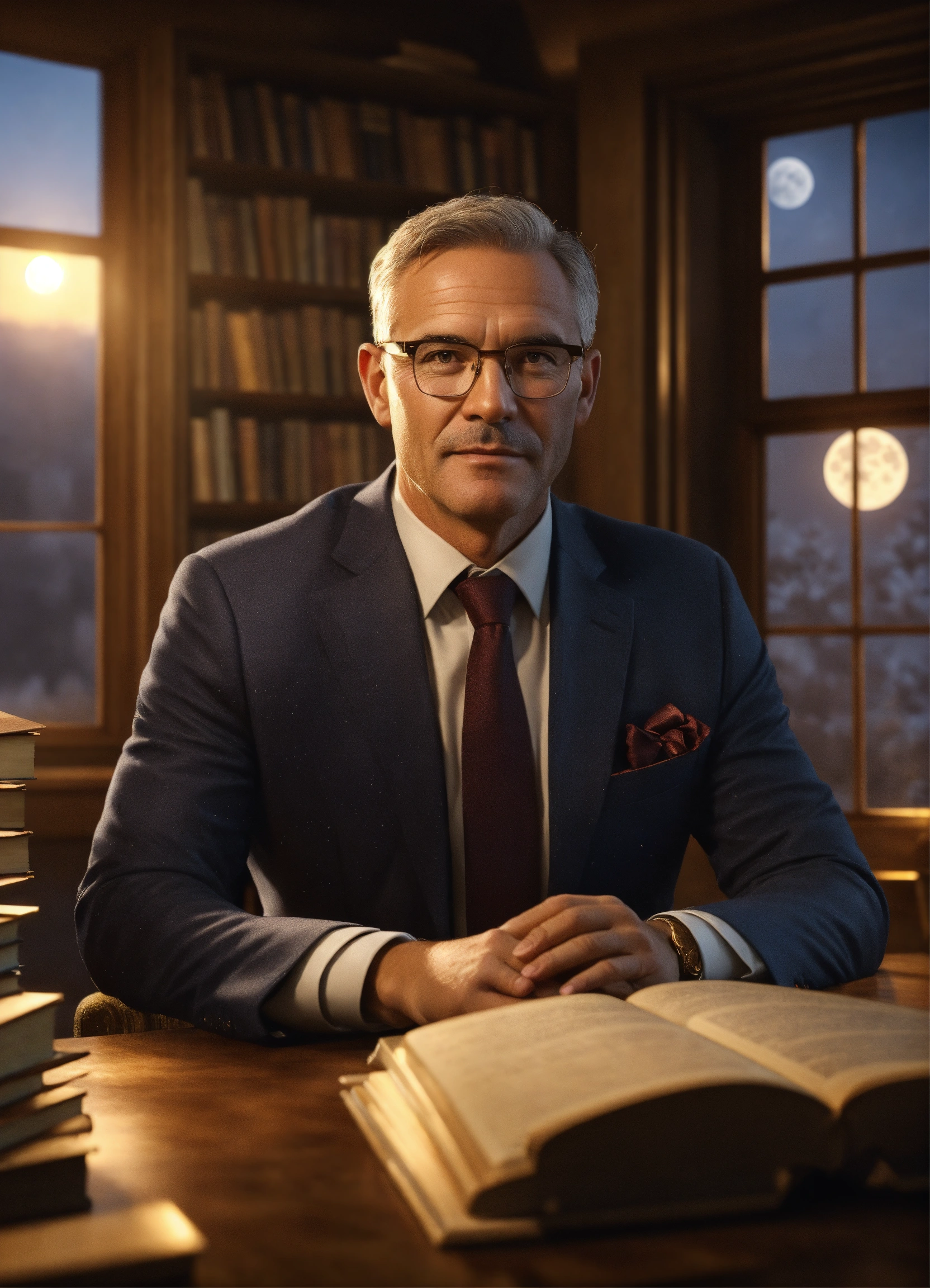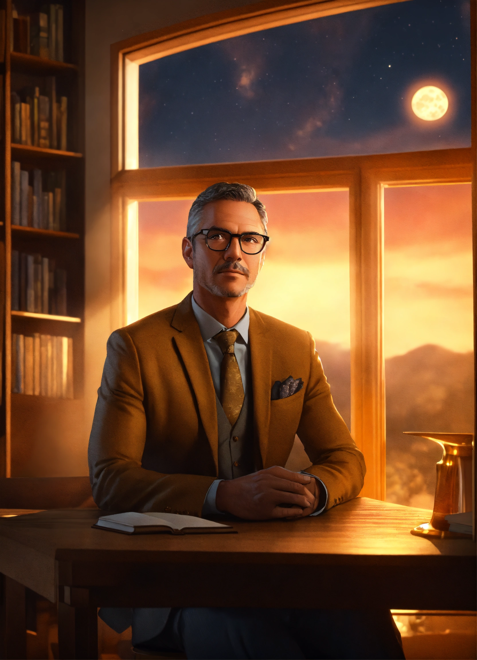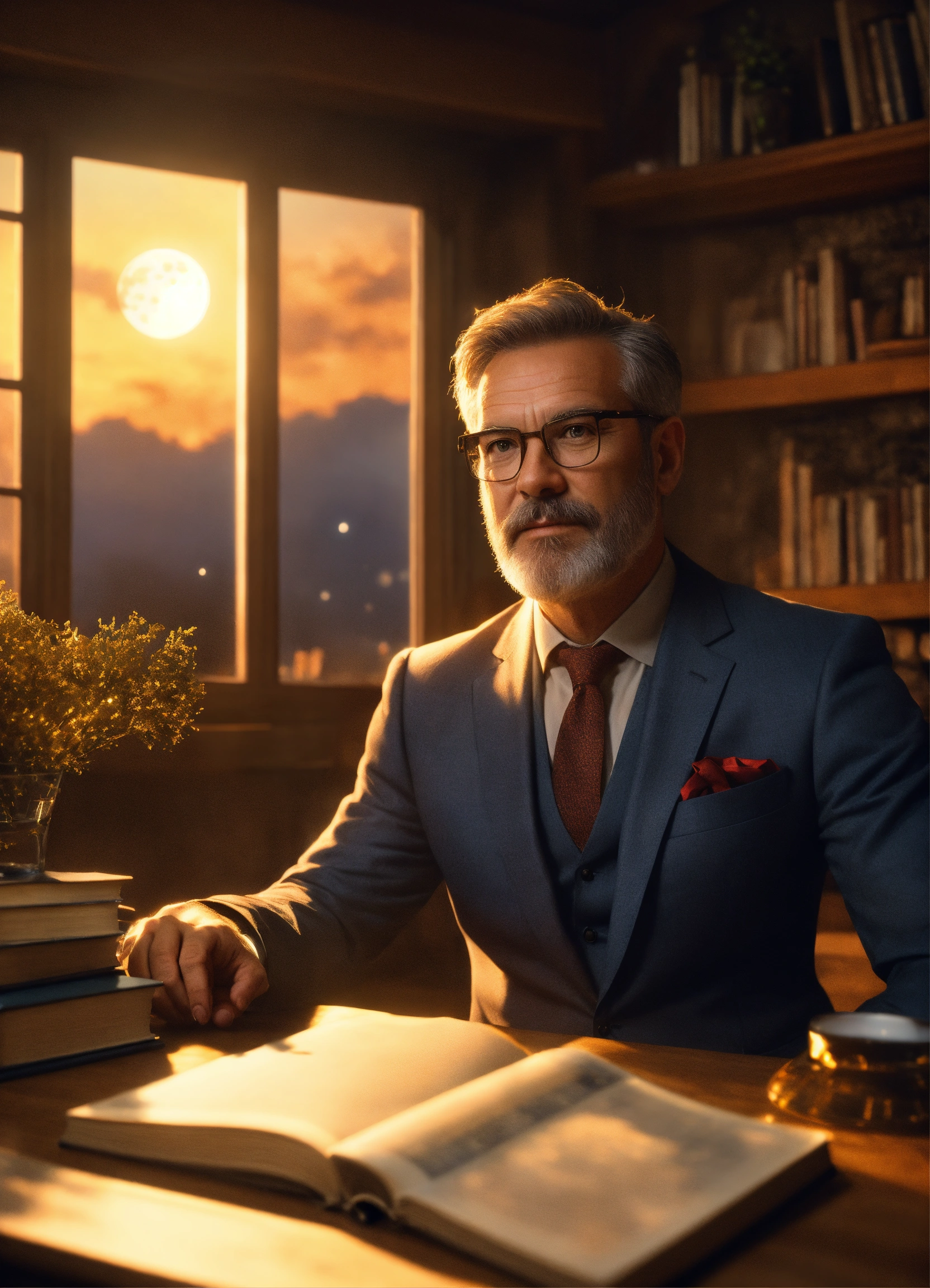 A handsome, reassuring-looking 50-year-old businessman, wearing glasses and looking straight at the camera. sitting on a table with books. he is in a cosy room with a fireplace behind him and a large glass window behind which is a beautiful moon. golden, comic style, 4k, uhd, octane render.