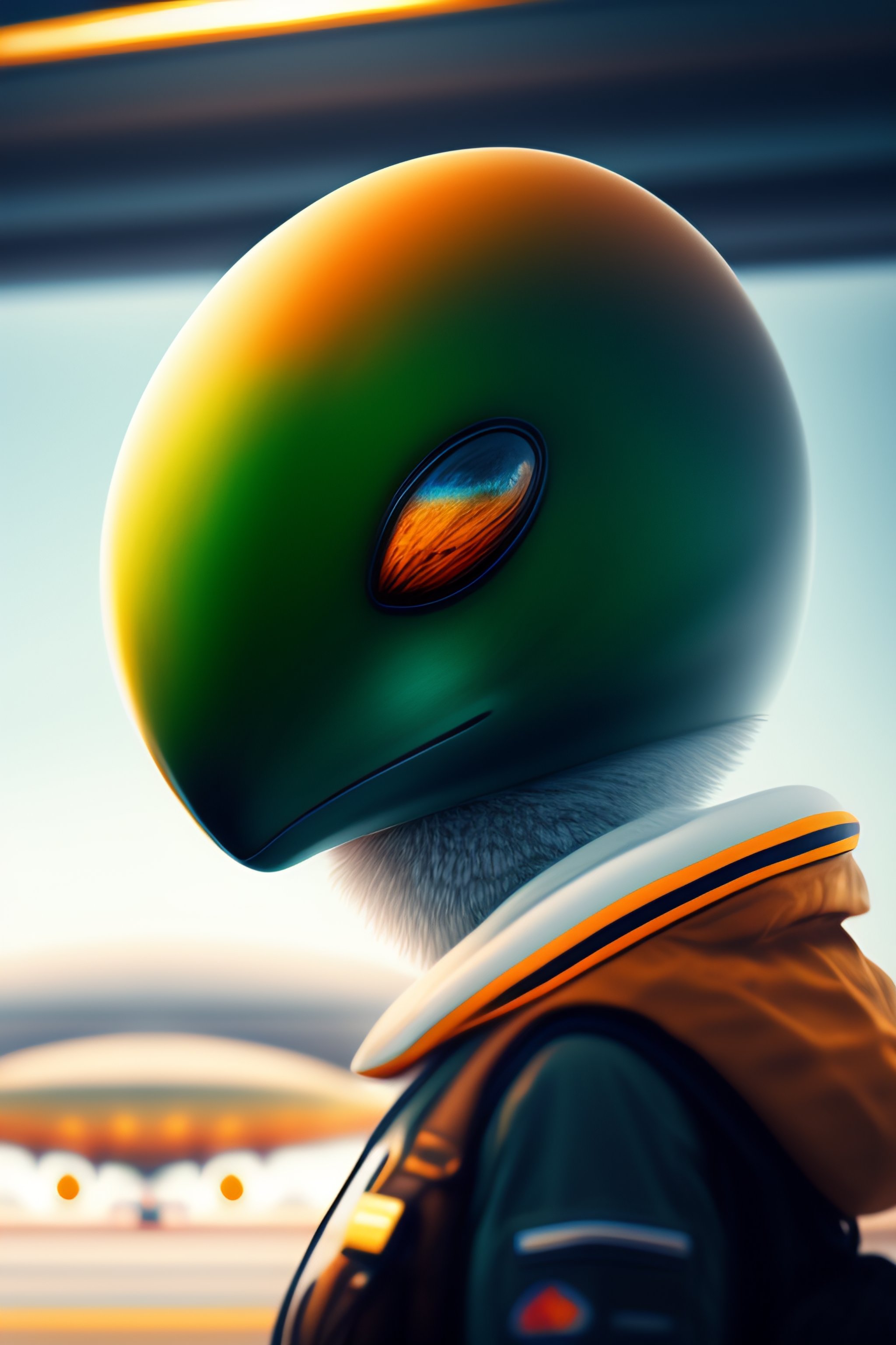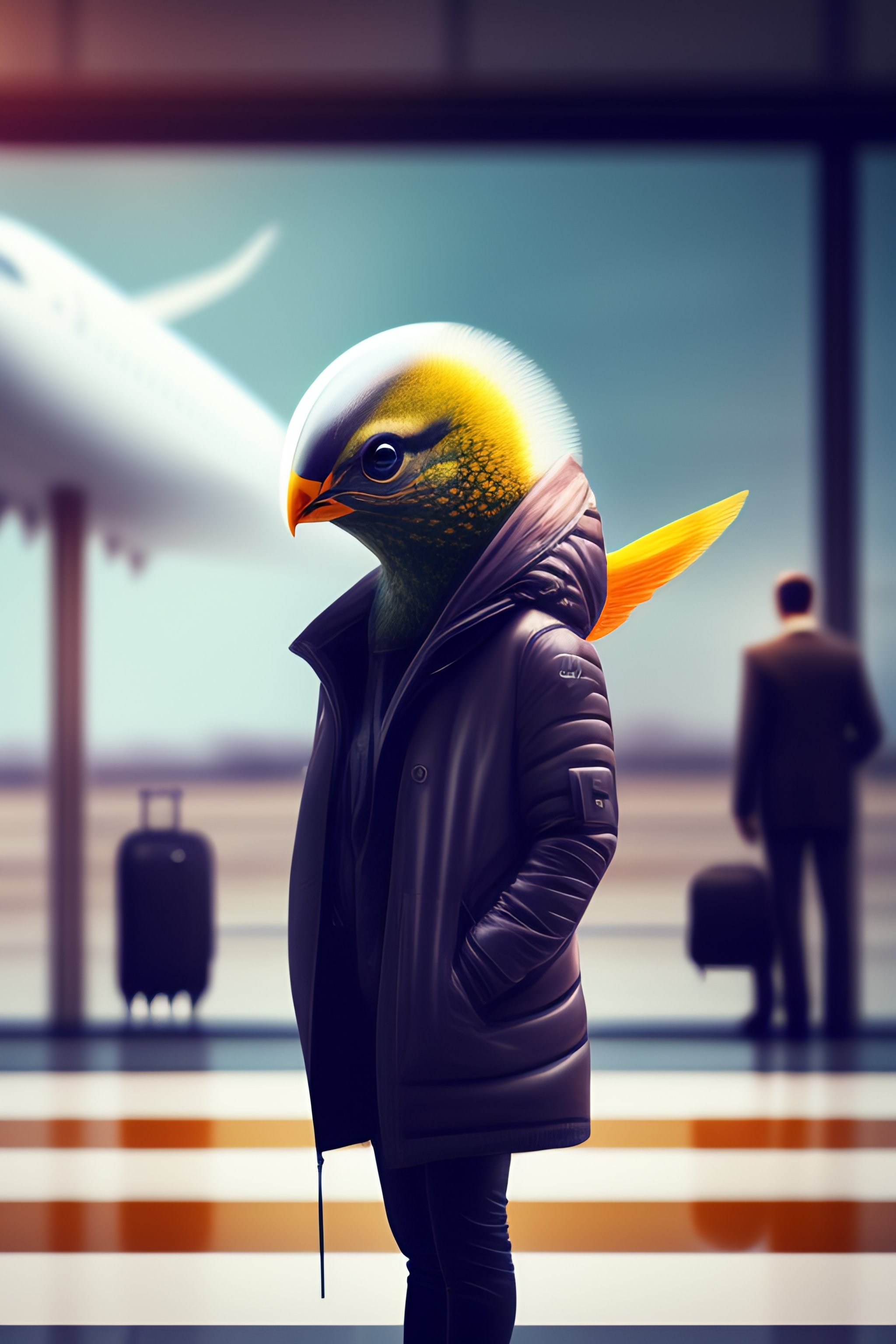 Alien with bird face walking on an interestelar airport