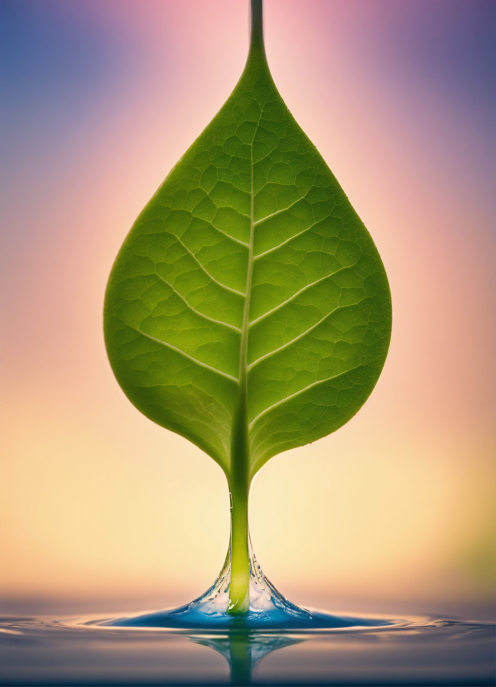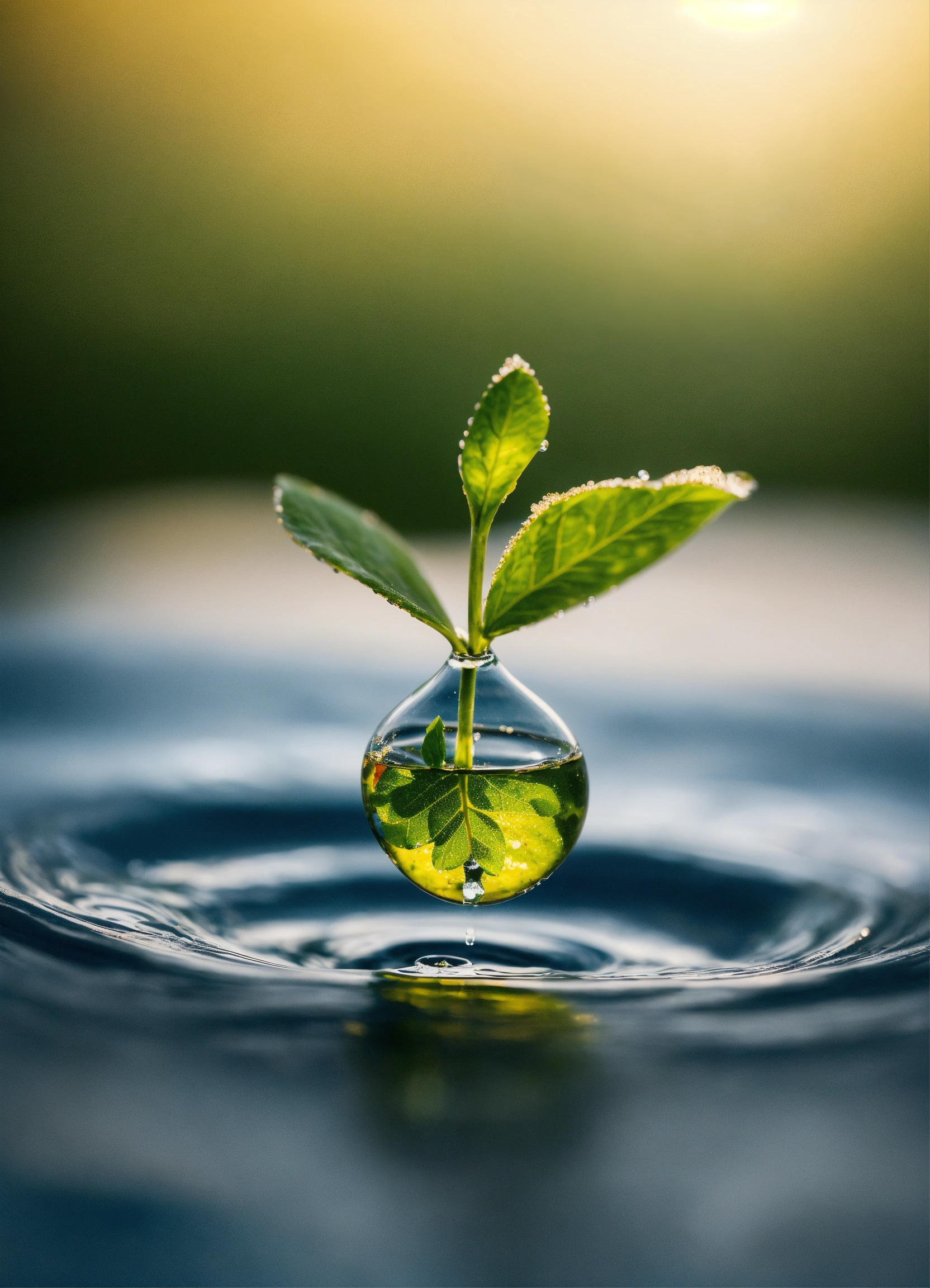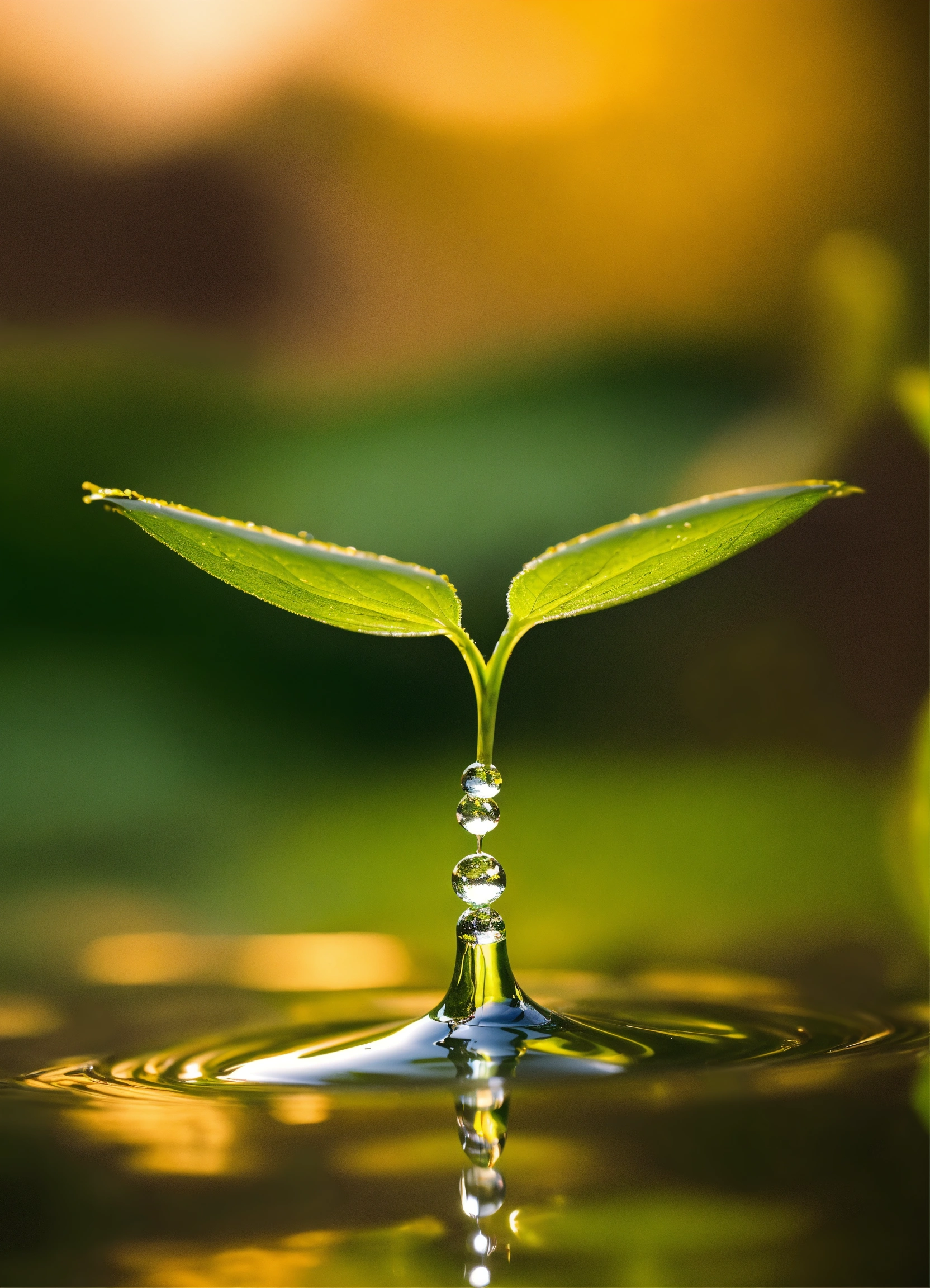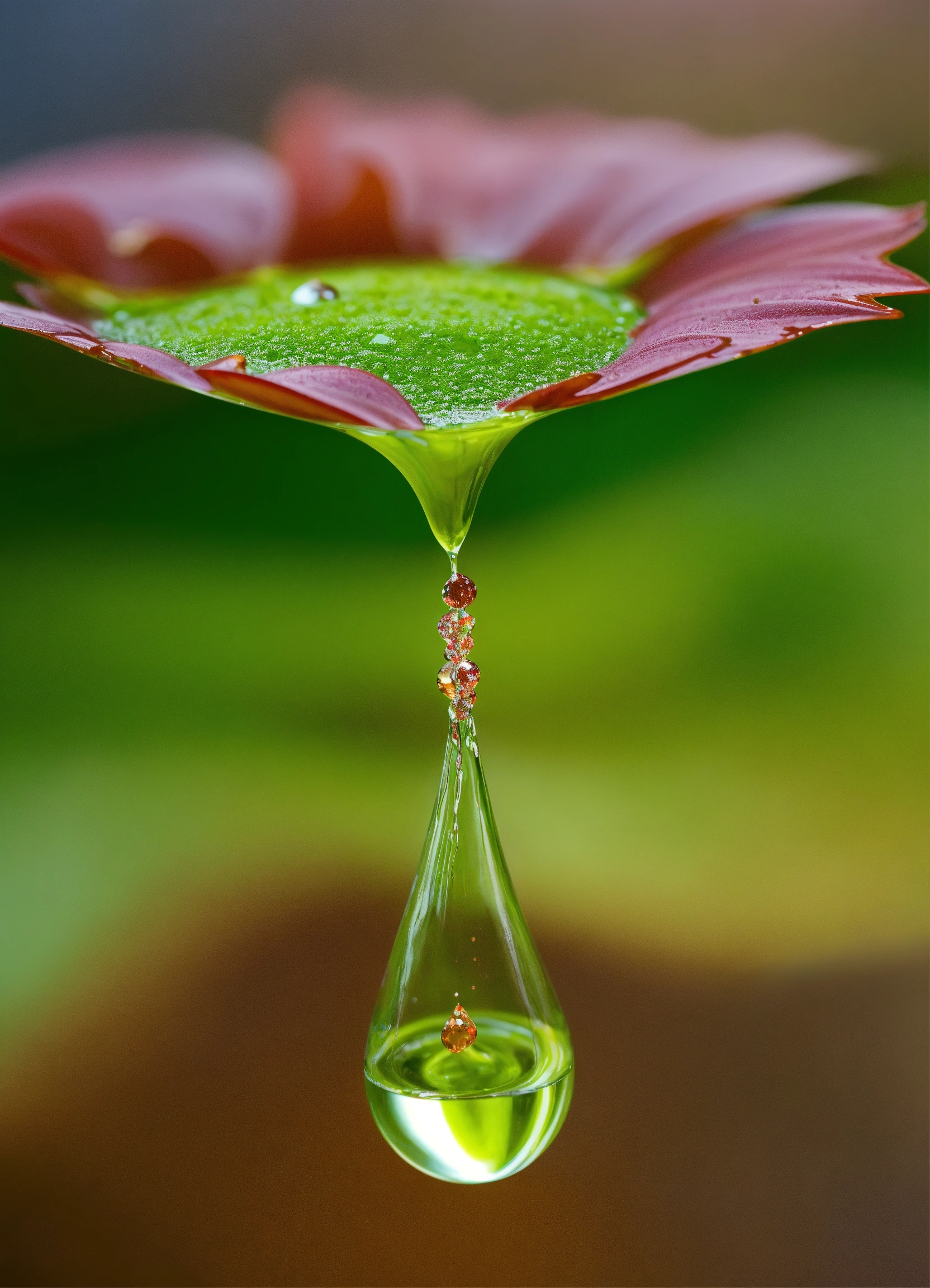 The drop briefly disappears beneath the liquid's surface, symbolizing the nurturing and growth of life. as it resurfaces, it forms a shape resembling a growing plant.