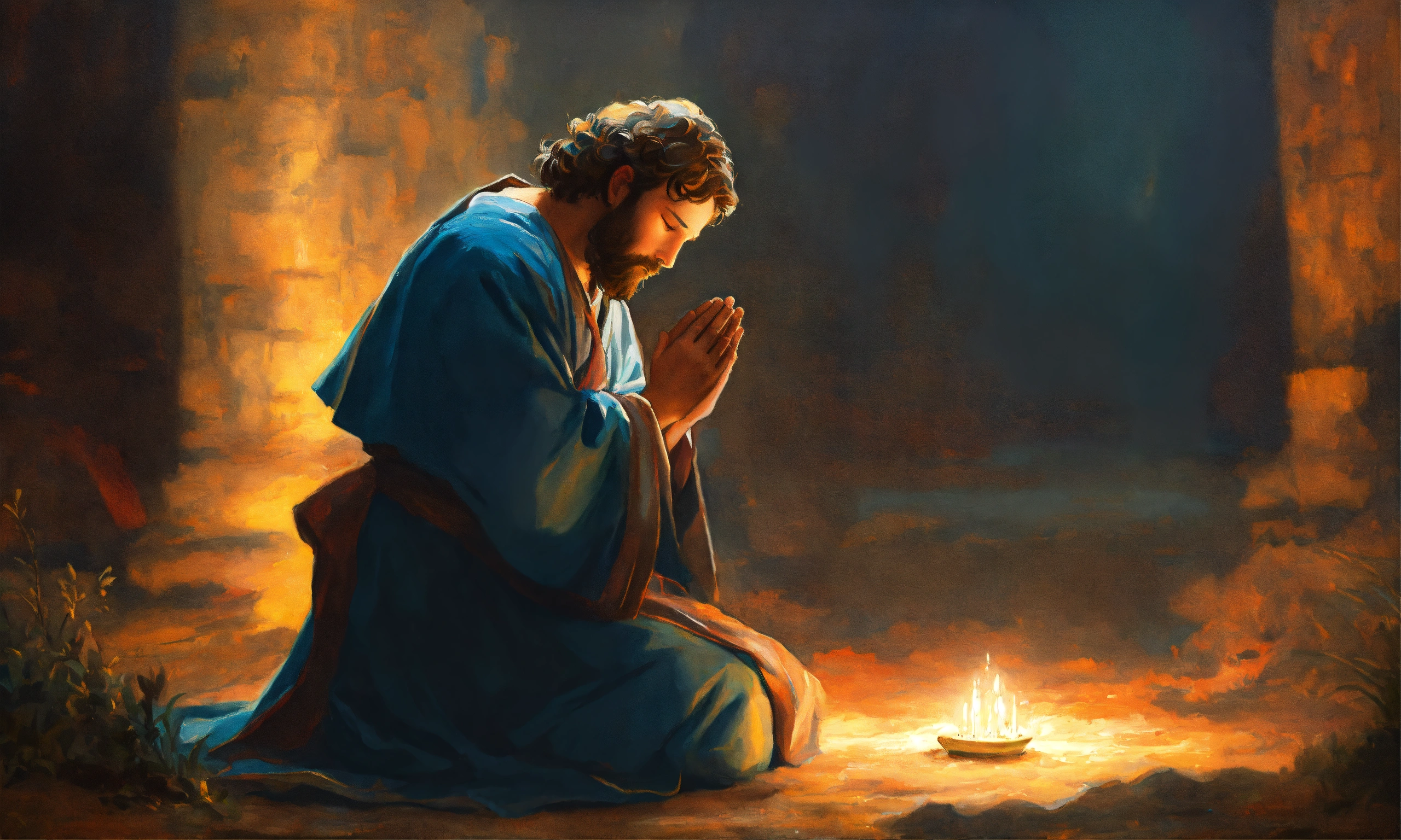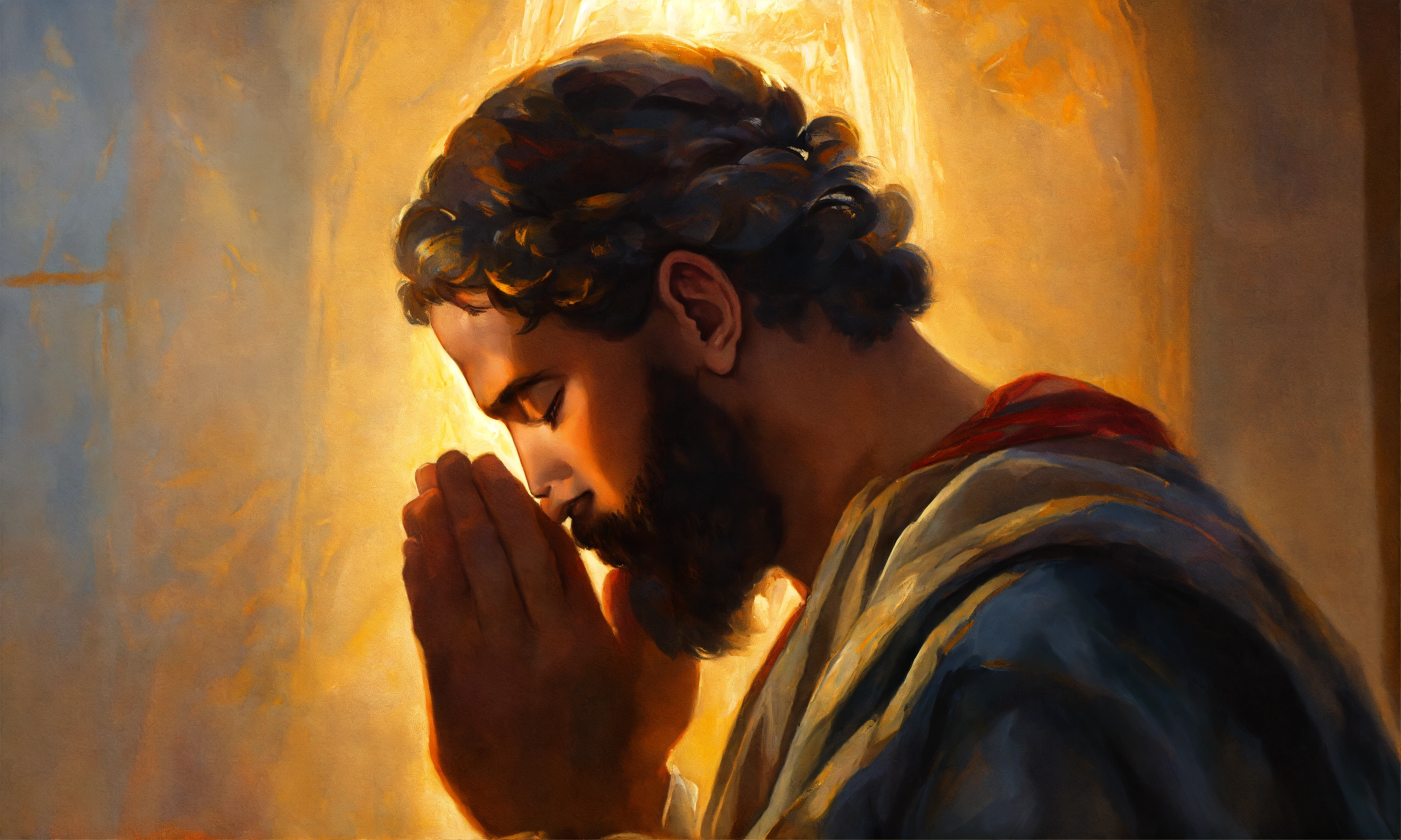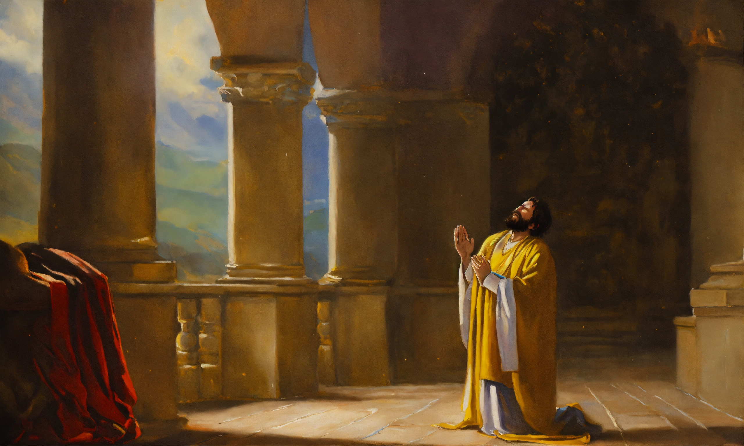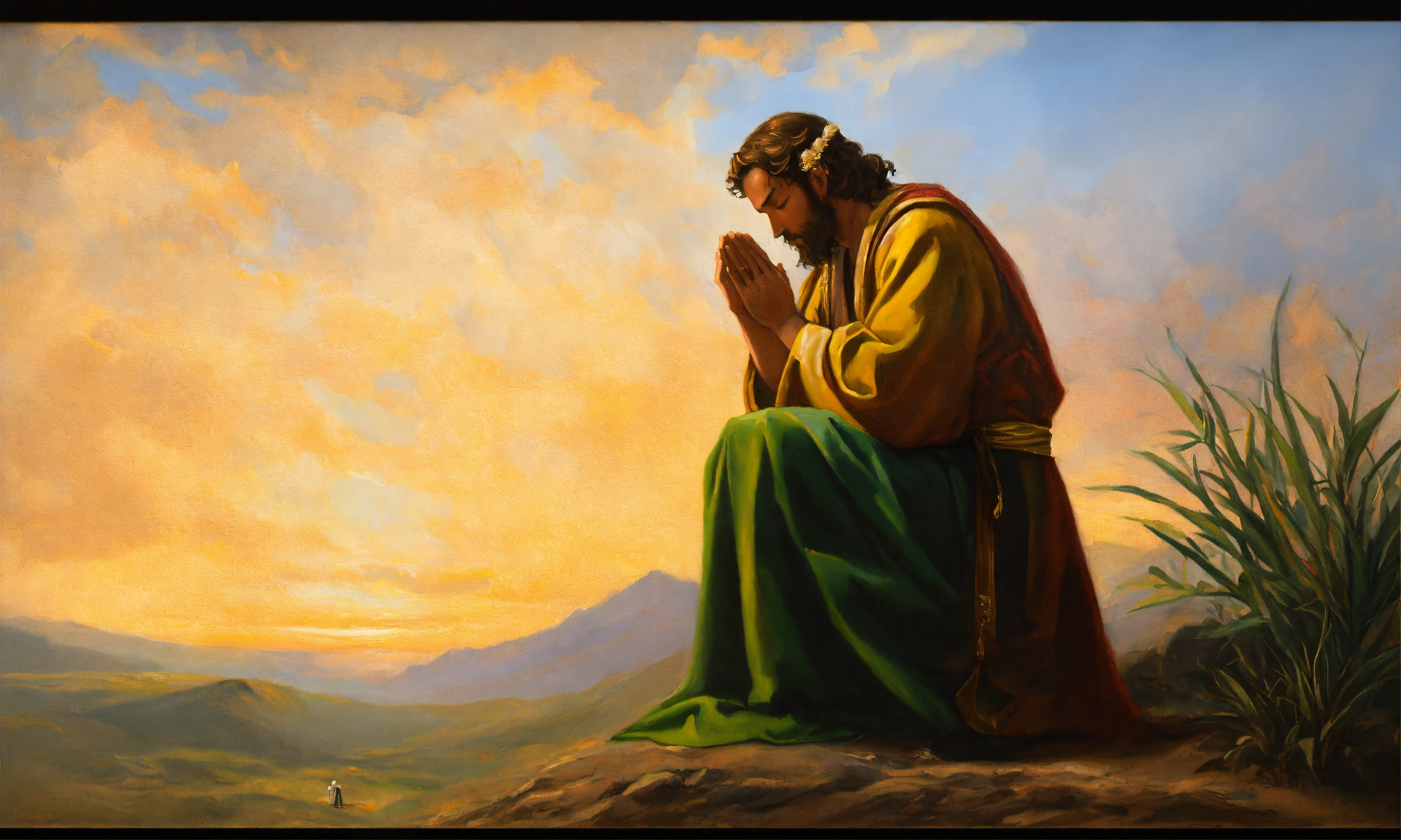 Oil painting of a biblical man praying to god