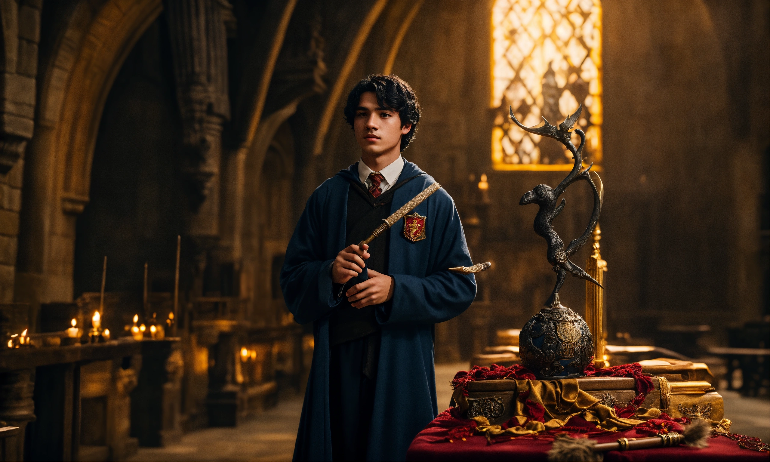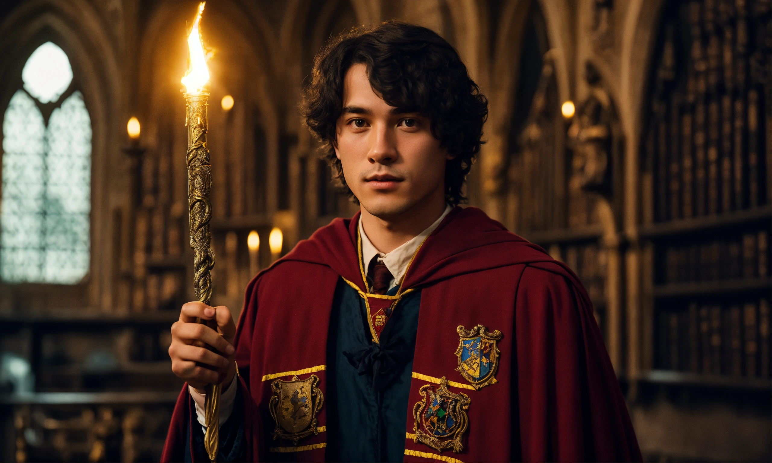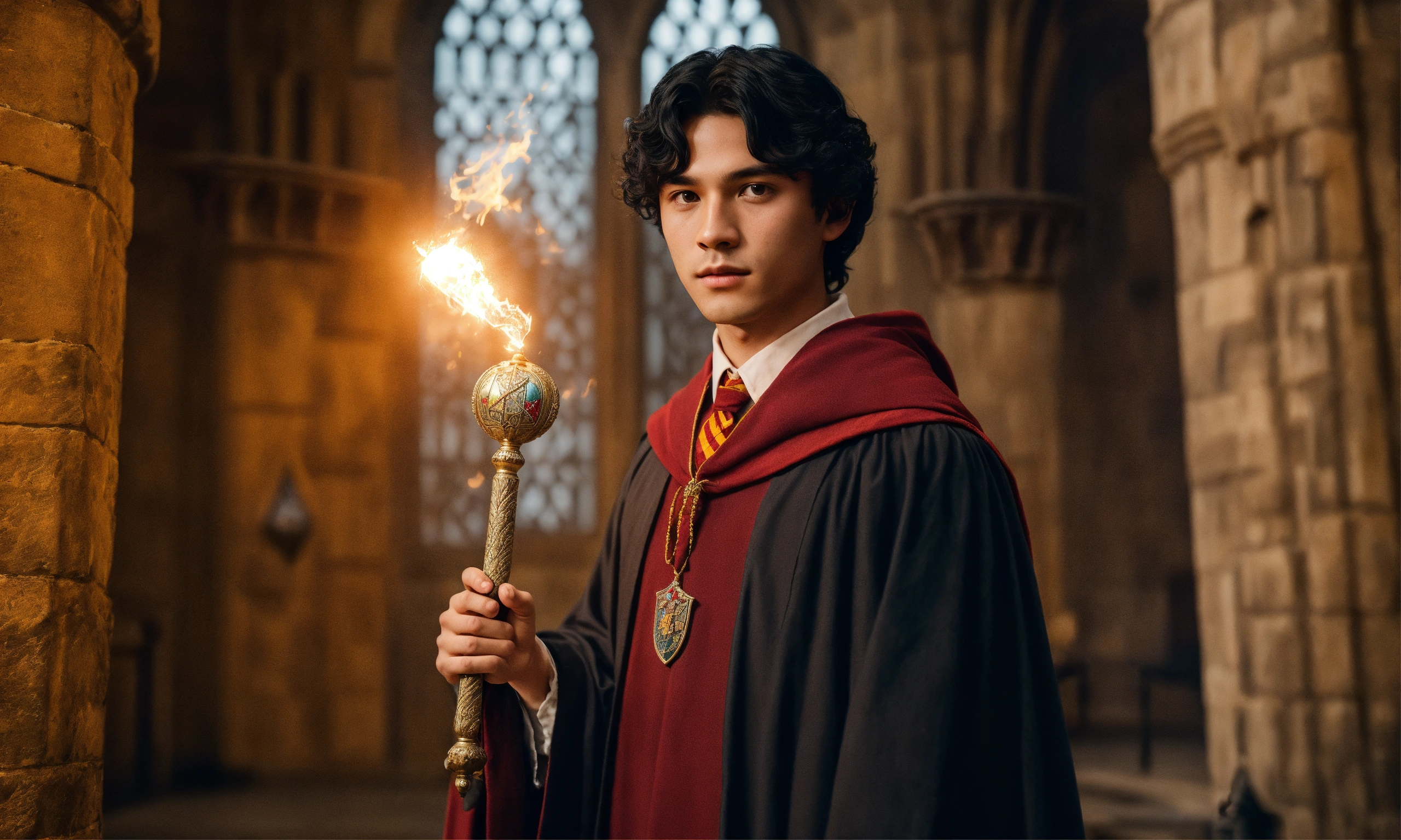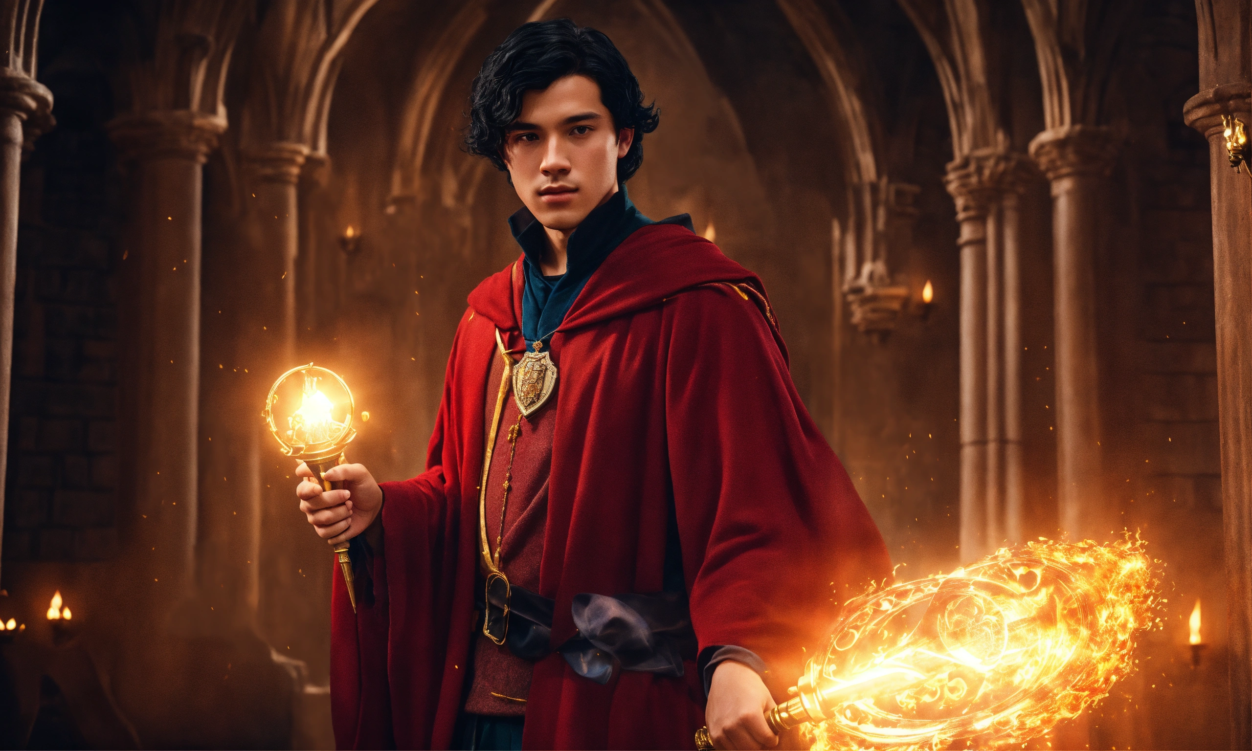 Man young wizard, inside hogwarts with a mystical scepter in his hand 2023 year, gryffindor, without fingers without showing them, black hair