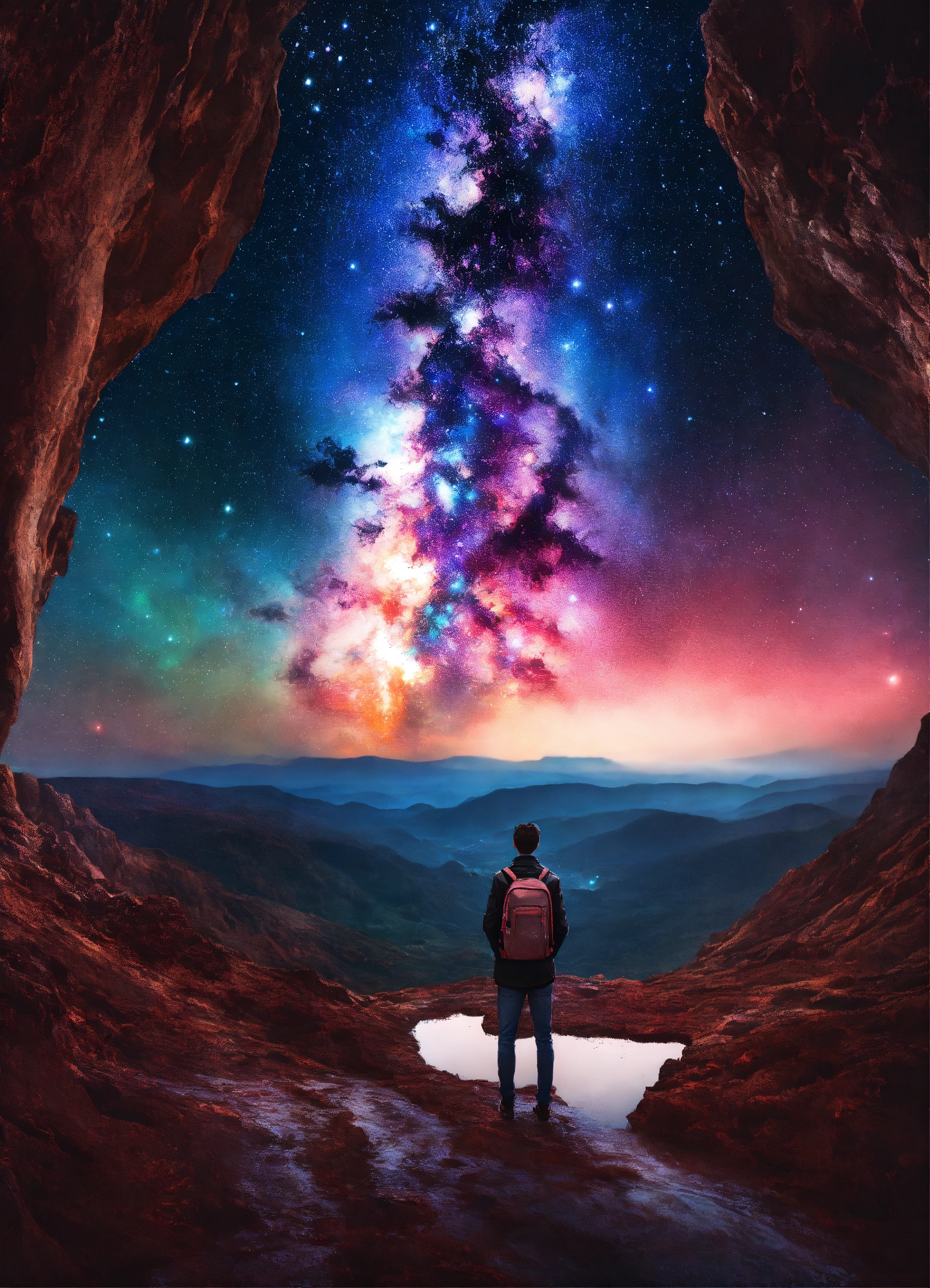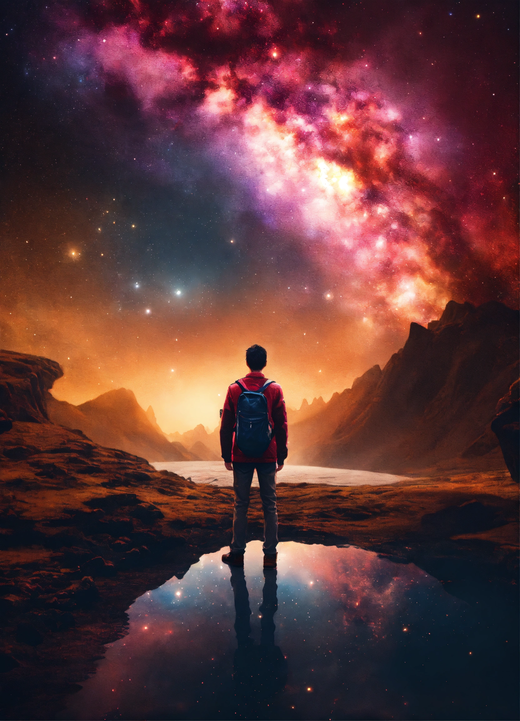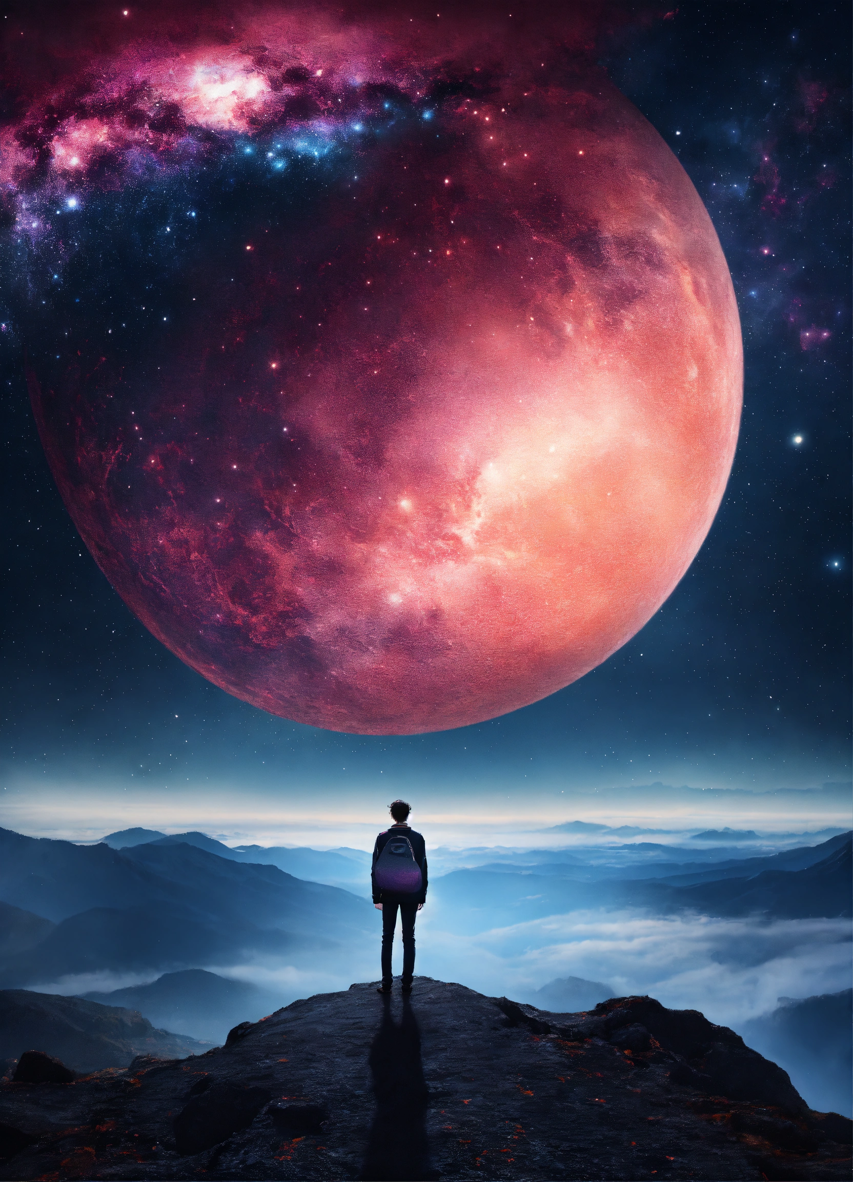 Galaxy dream world with a person standing looking into the distance