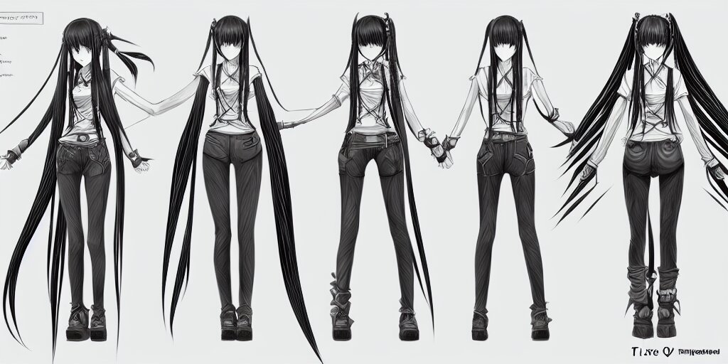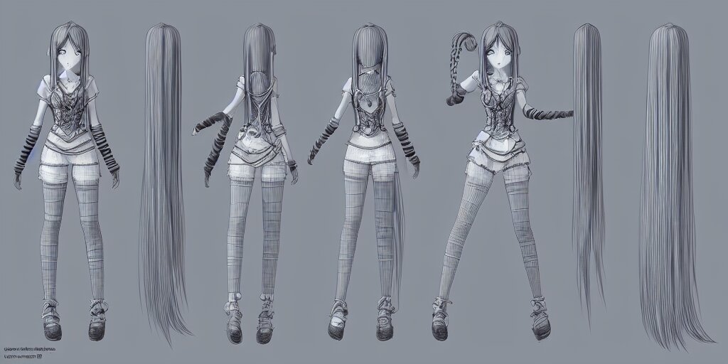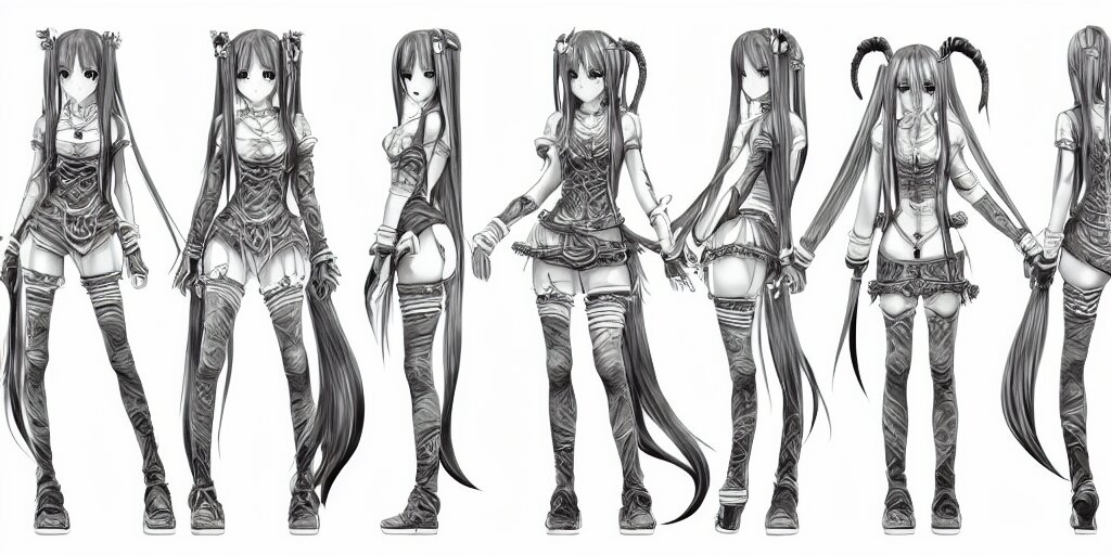 Anime woman, long braids, fantasy theme, t pose, orthographic view, front side/back/view character sheet, three views, lineart, varying thickness, manga pen, traditional art, indian ink, in the style of final fantasy ix, 3d modeling concept sheet, white background