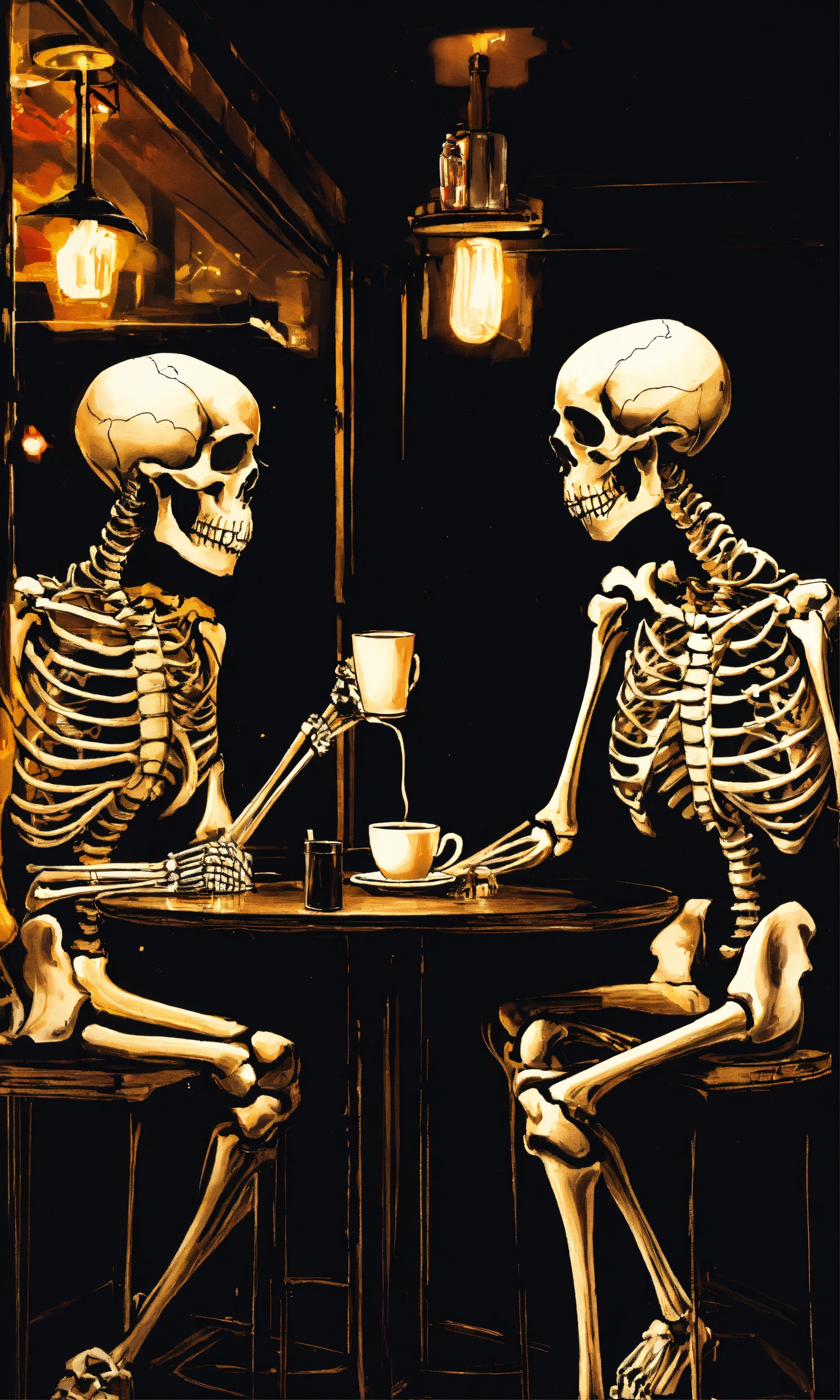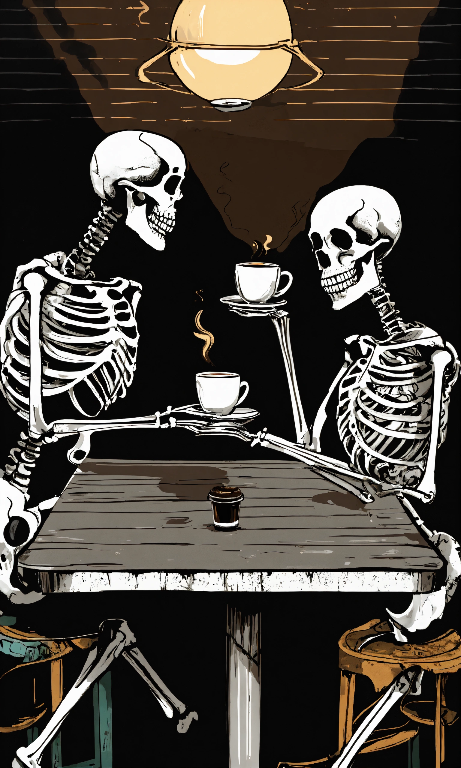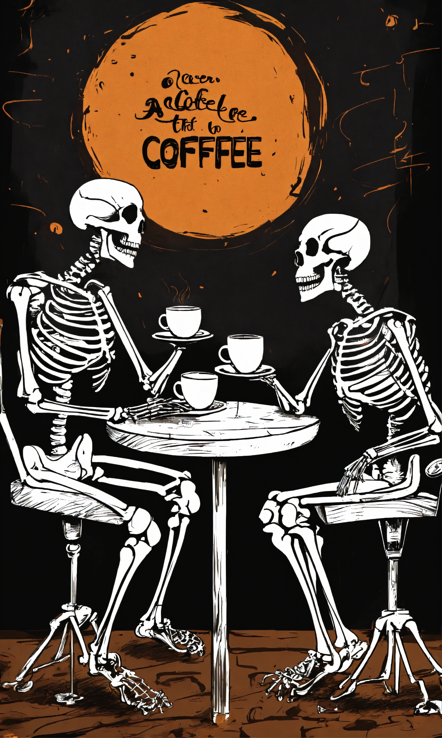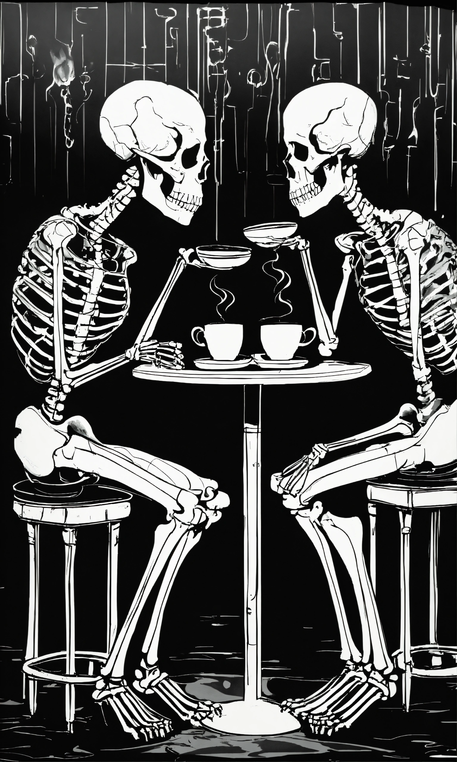 Graffiti template of two body skeletons addicted to coffee. talking at a high table in a bar, with totally black background