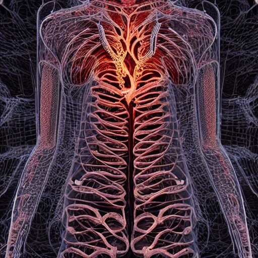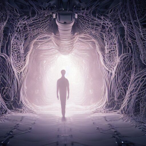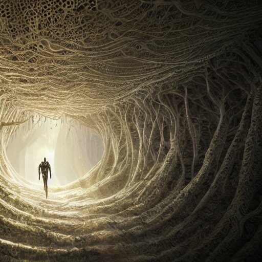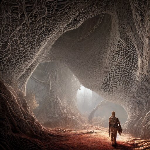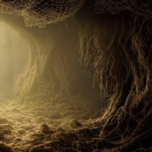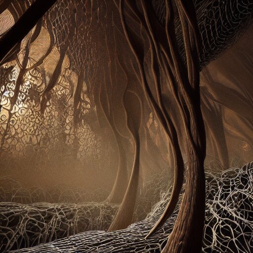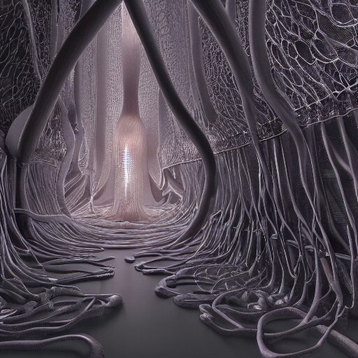 Biocomputer human organ inside a bio - neural network made like antique lace in a biomechanical cave forest, biocomputer epic environment, matte painting, diffused lighting, highly detailed cinematic, epic atmosphere, diffused lighting, highly detailed digital art, trending on artstation, depth of field, wide angle