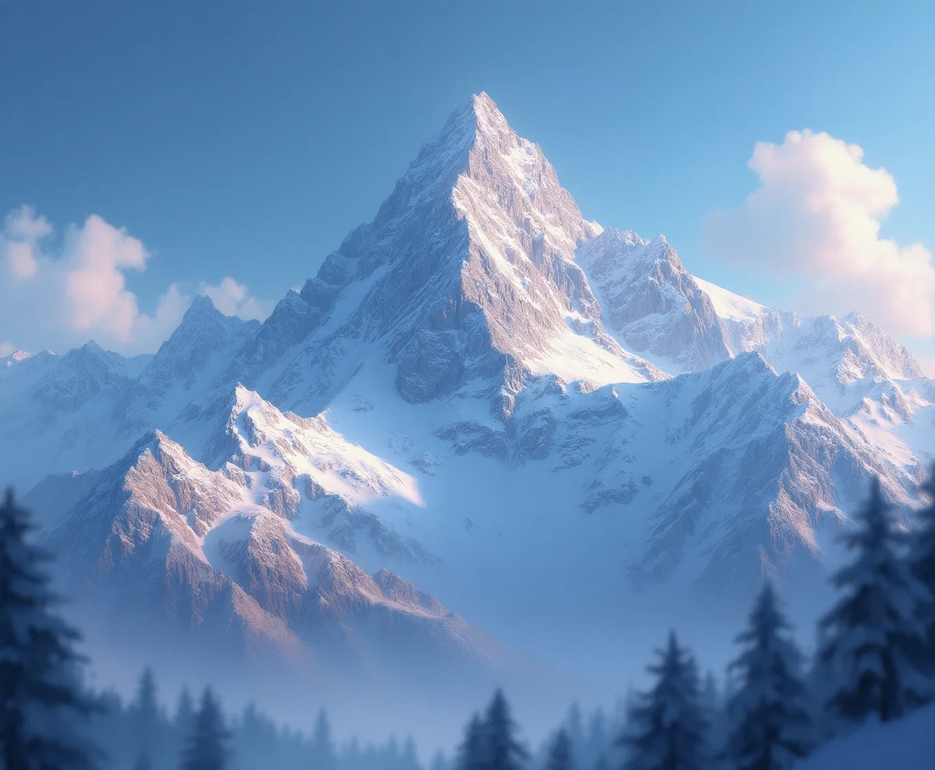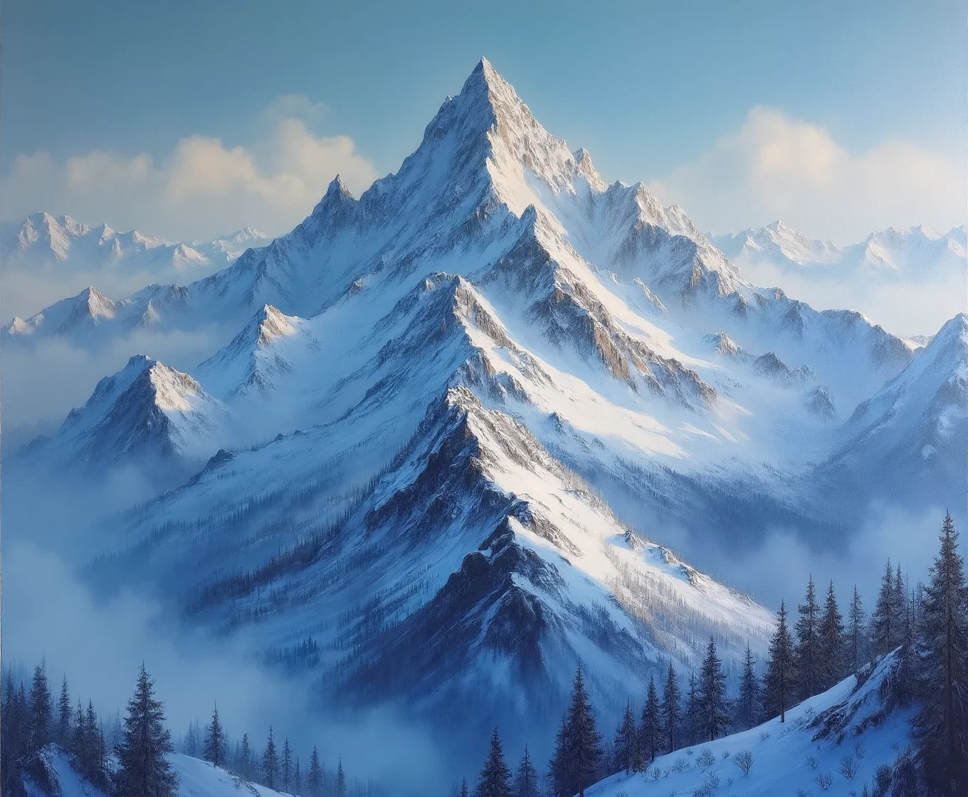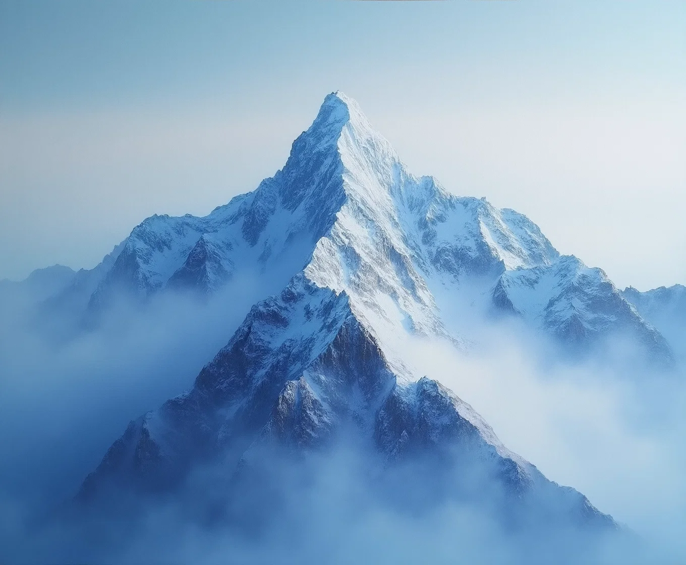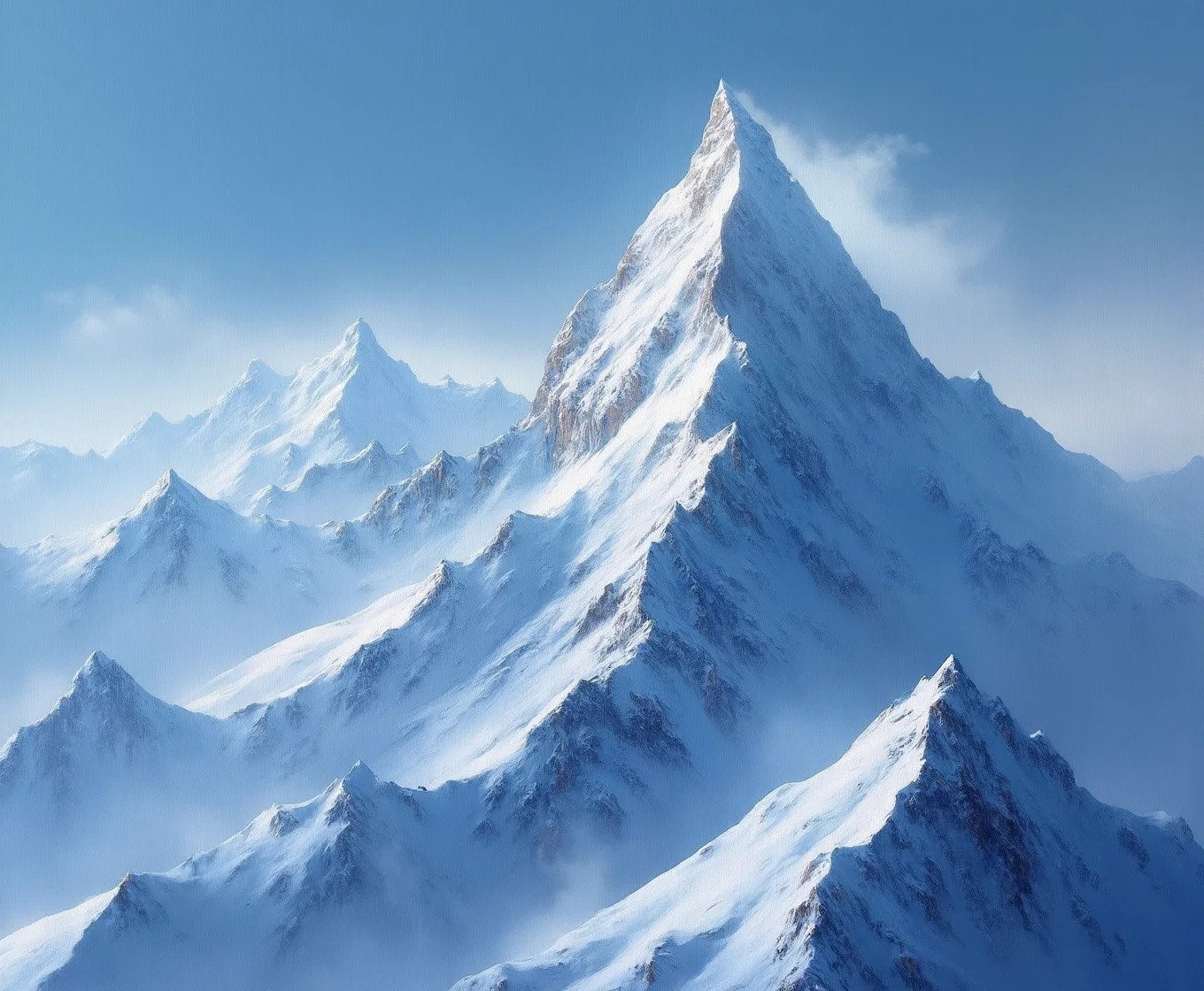 The very top of the mountain in winter visible in the central place of the painting. the rest of the mountain and the background, bokeh, blue balance, gray and white, megapixel