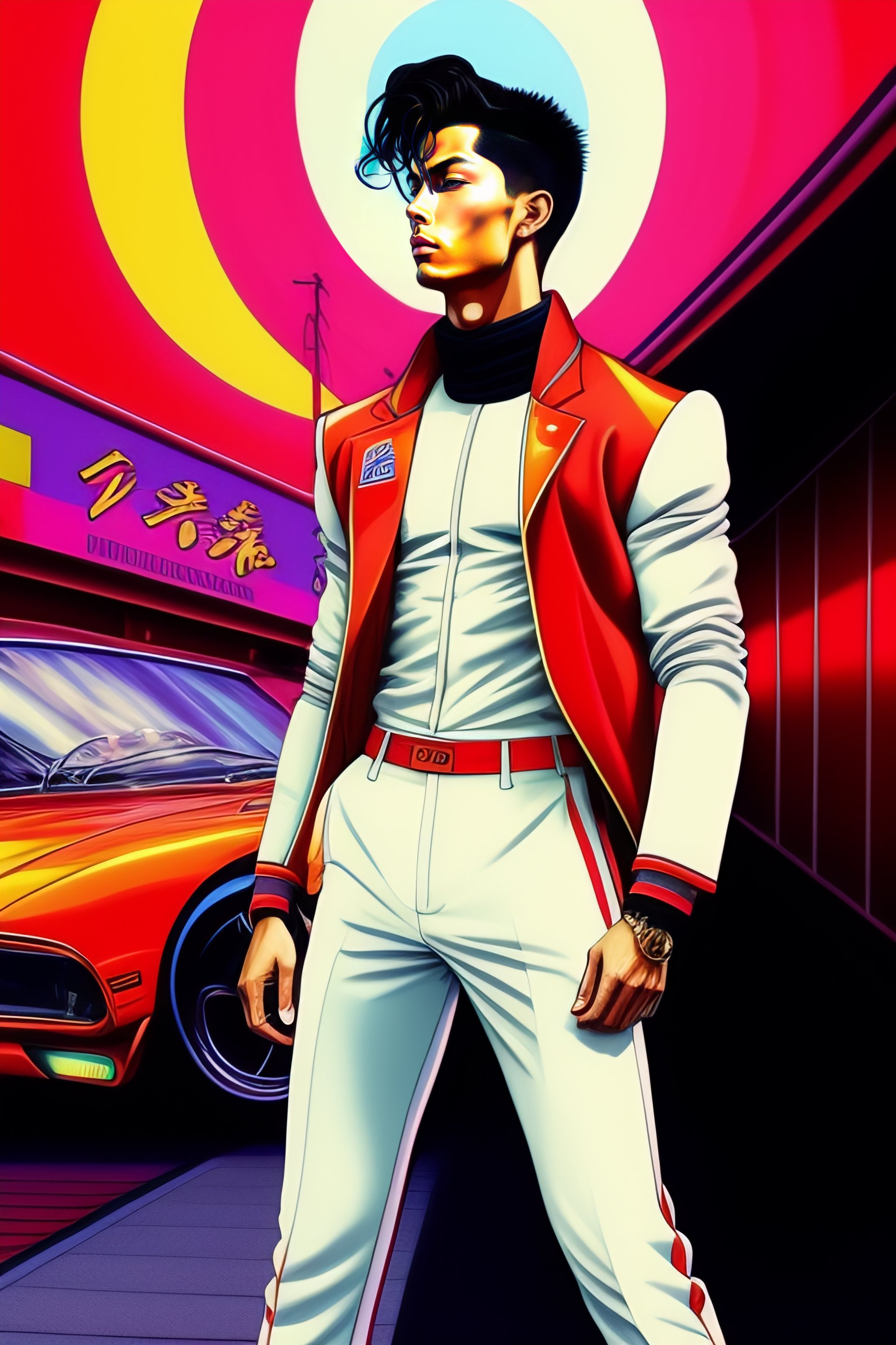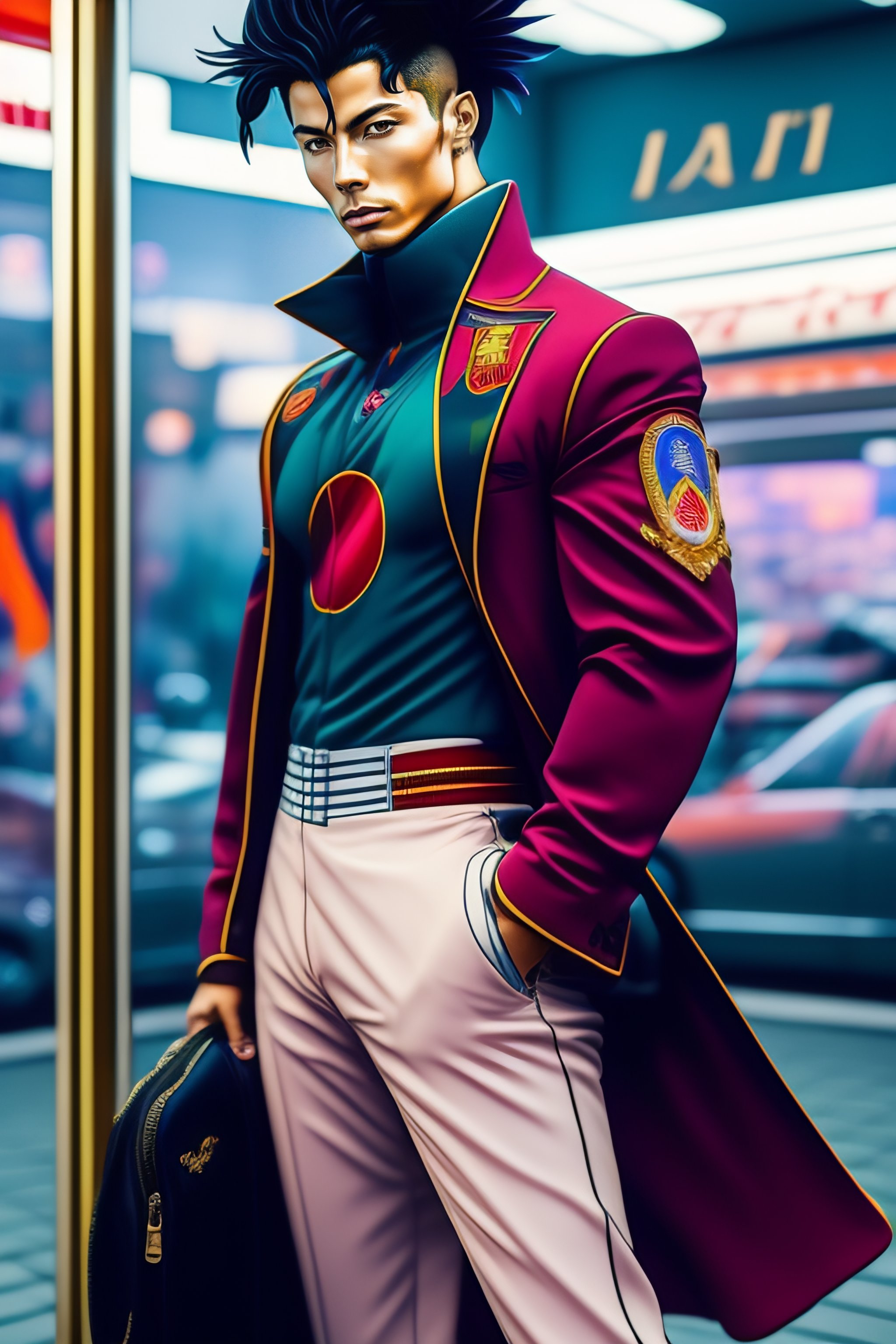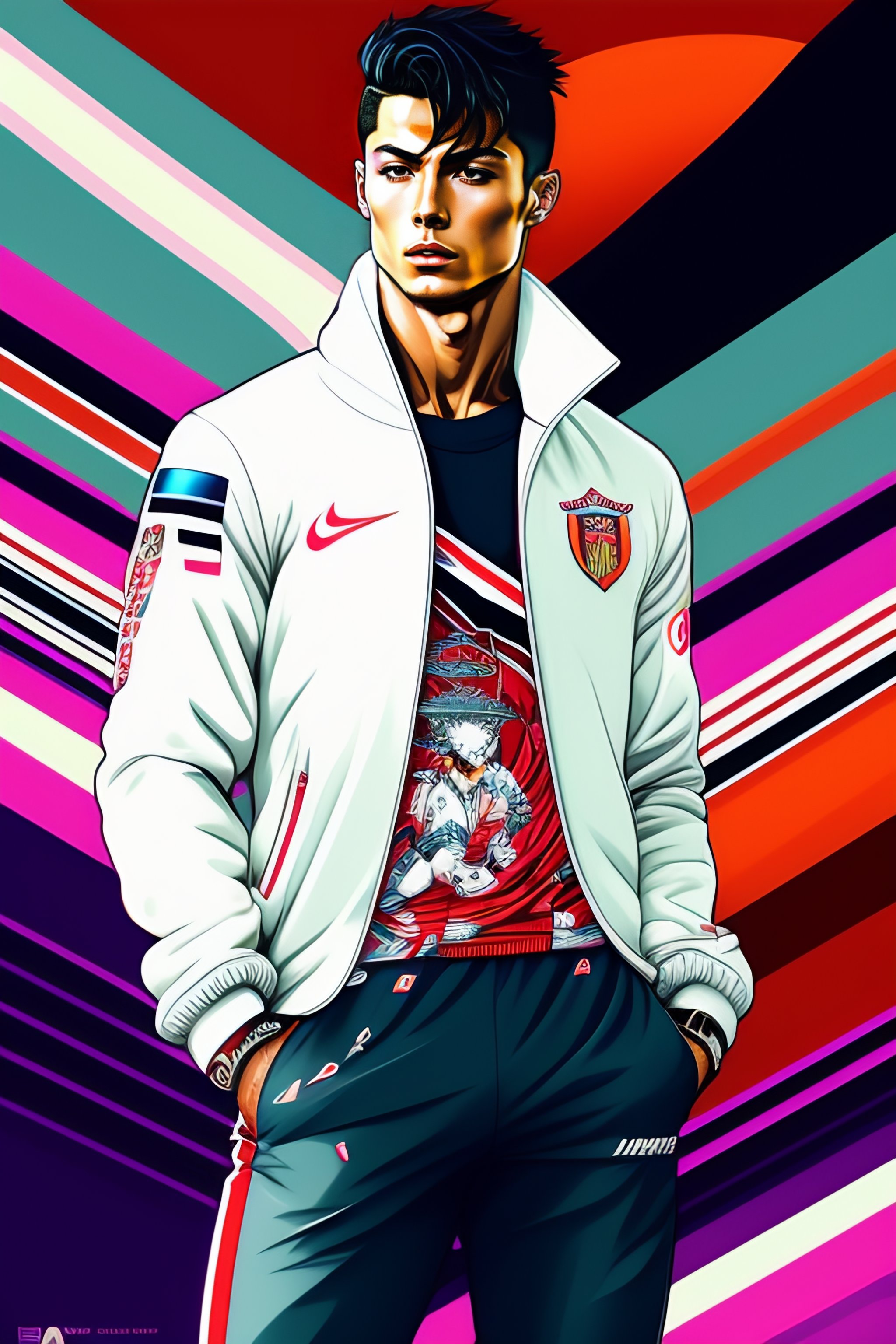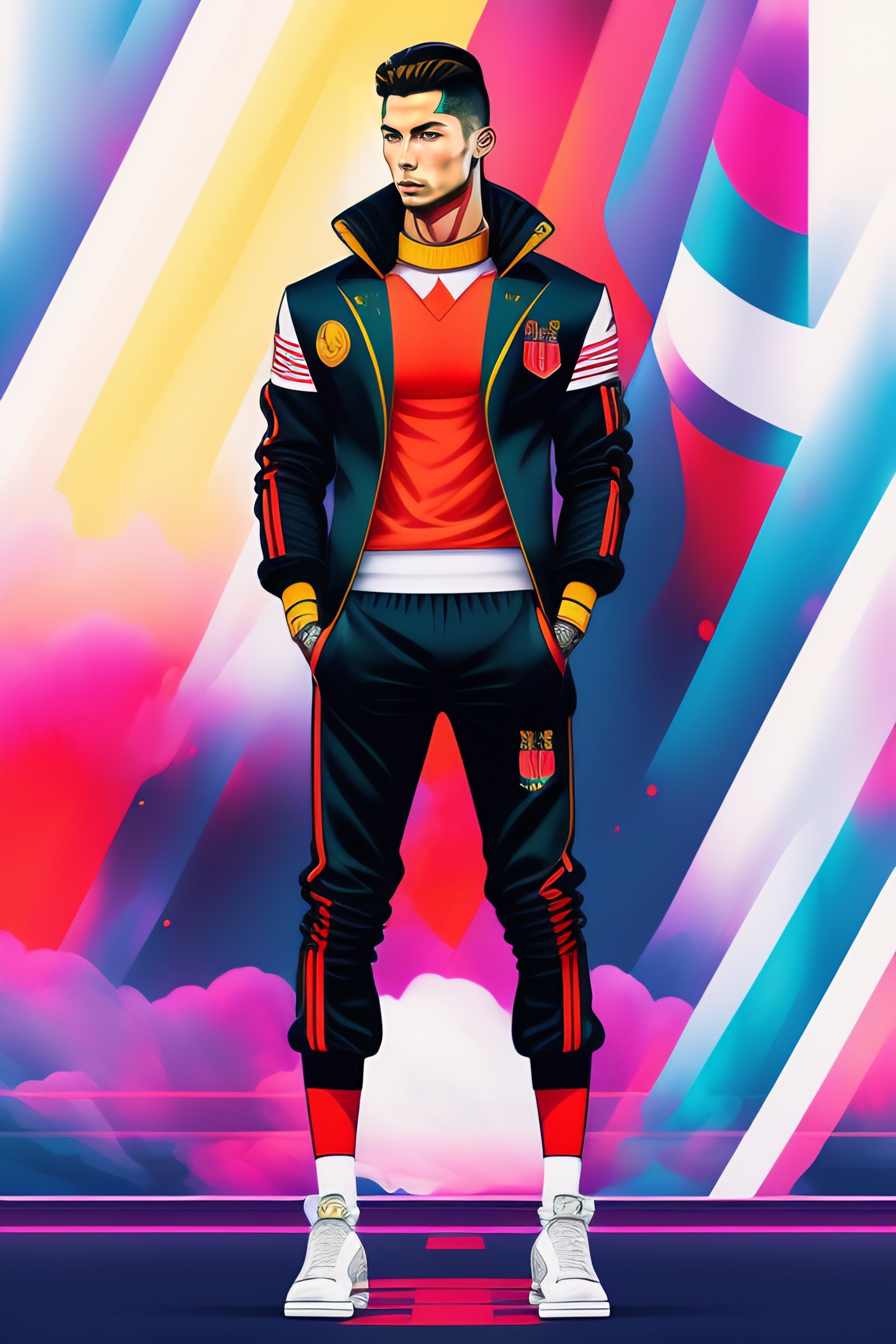 Cristiano ronaldo stylish haute couture outfit worn by model in the style of 90's vintage anime, surrealism, akira style. detailed line art. fine details. inside a 7/11 in tokyo
