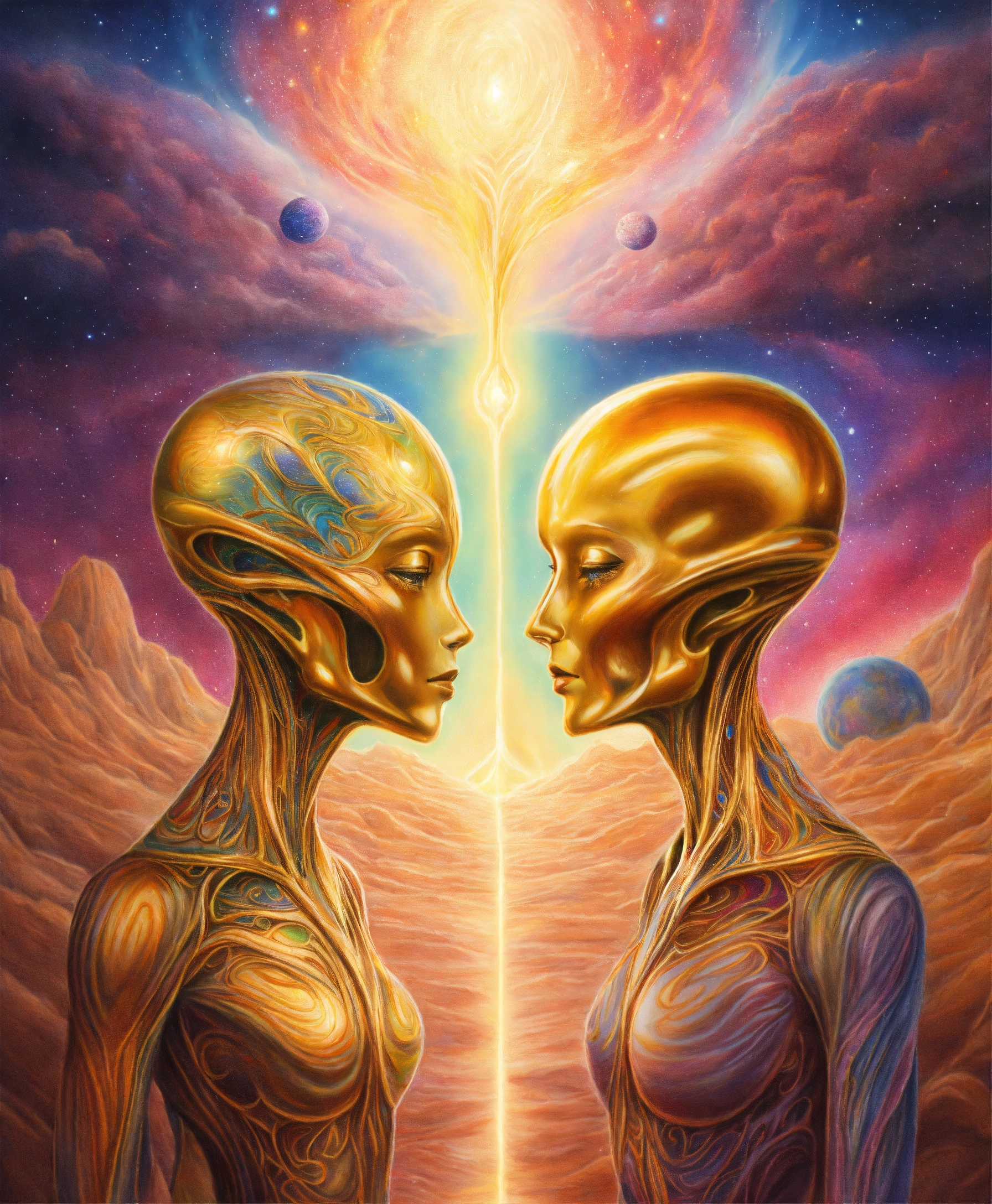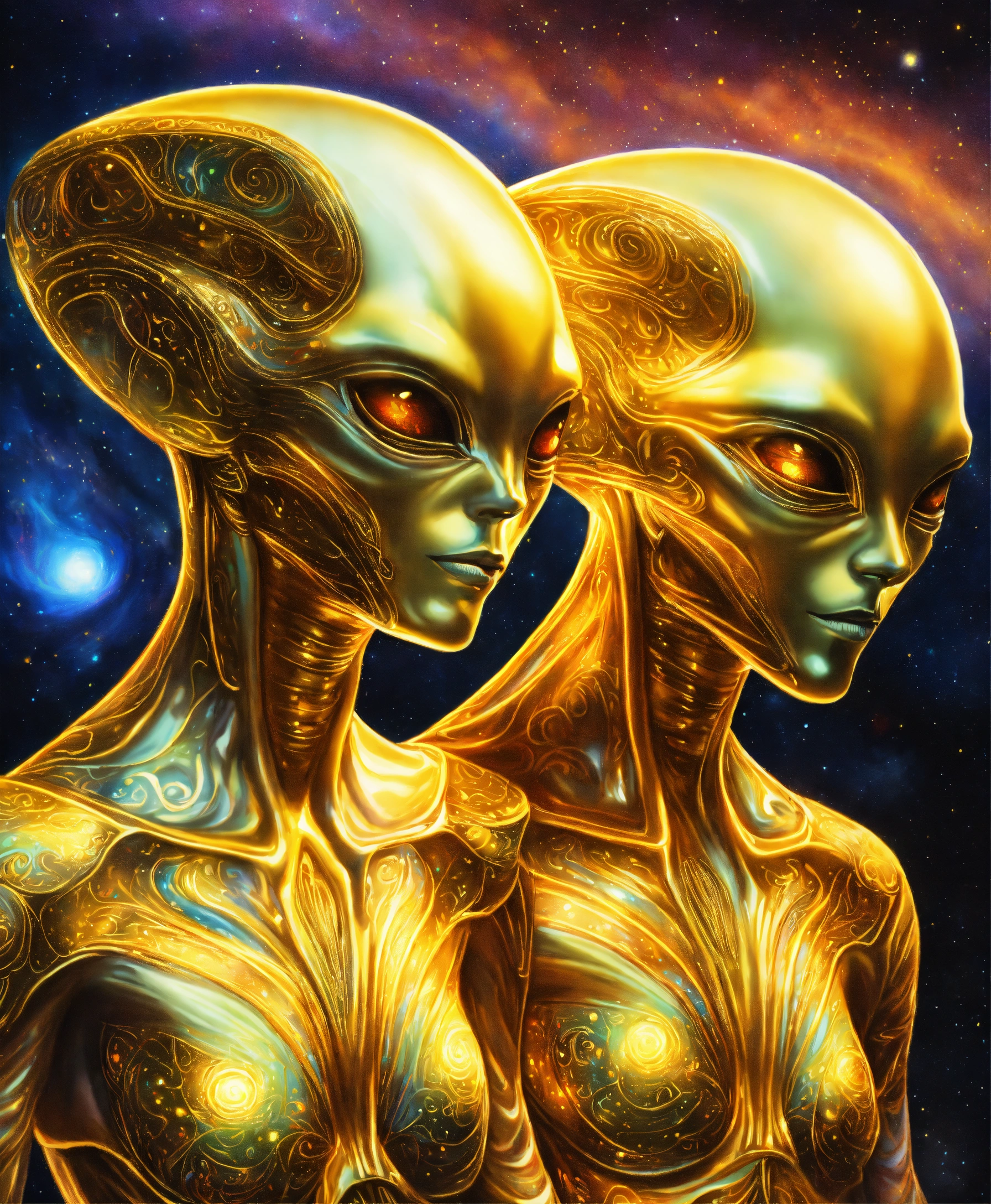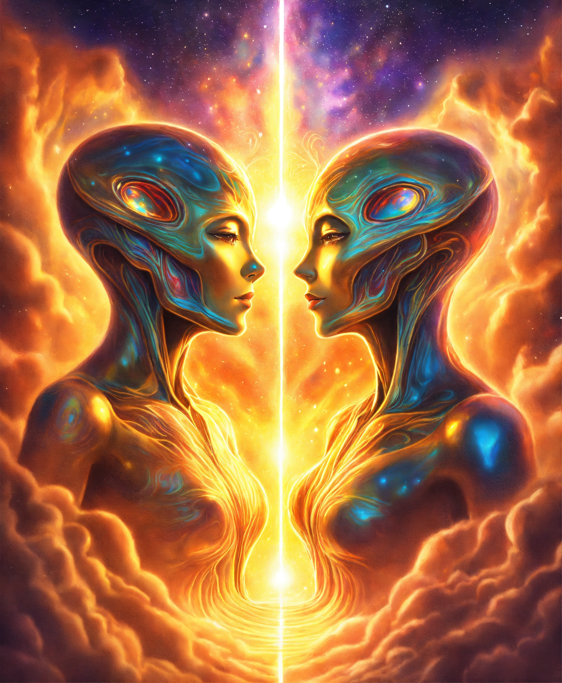 Beautifull realistic colored pencil drawing full view of a spiritual golden light surrounding two alien souls with an indefinite shape embraced, multicolored galaxy background, 4k, spiritual art