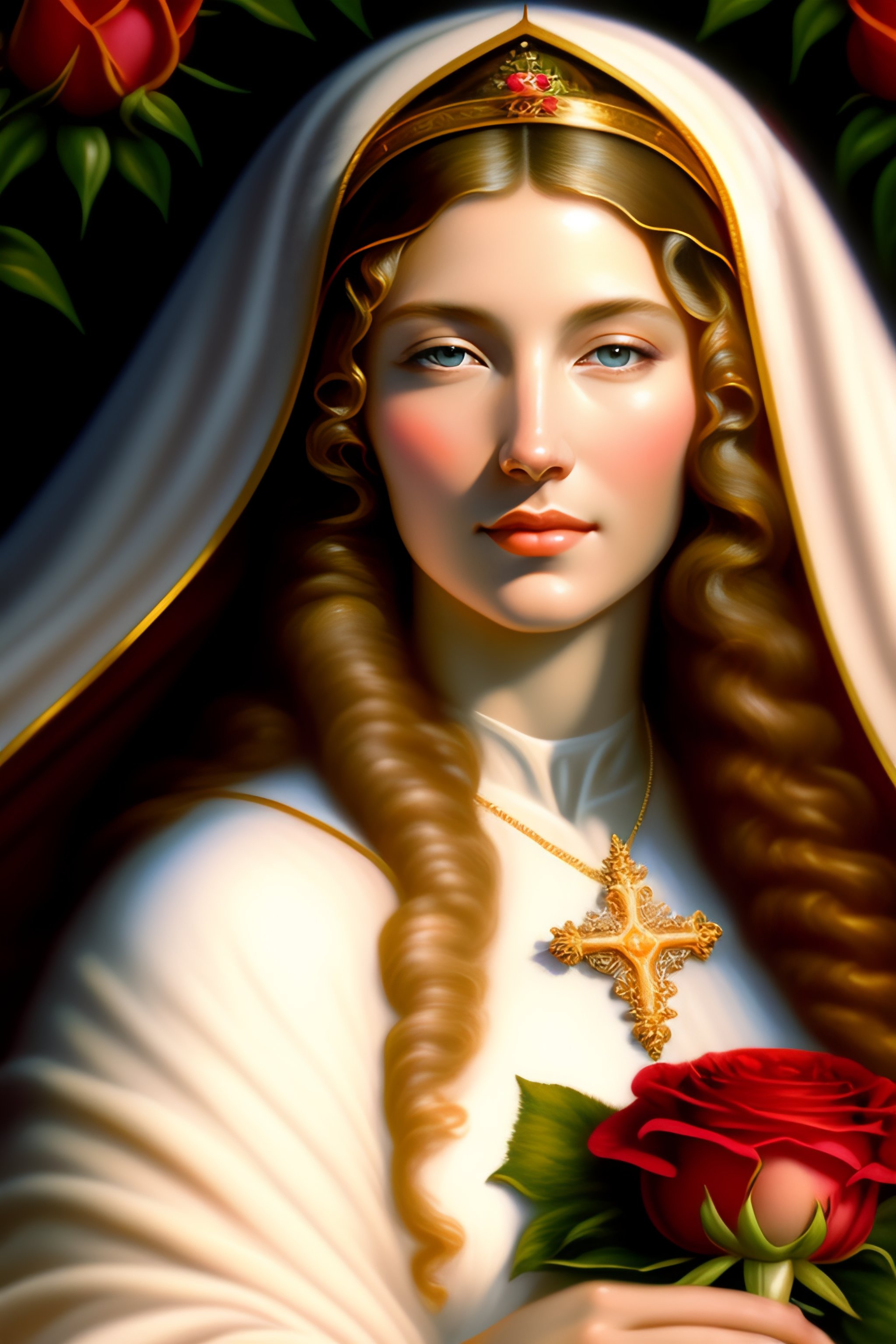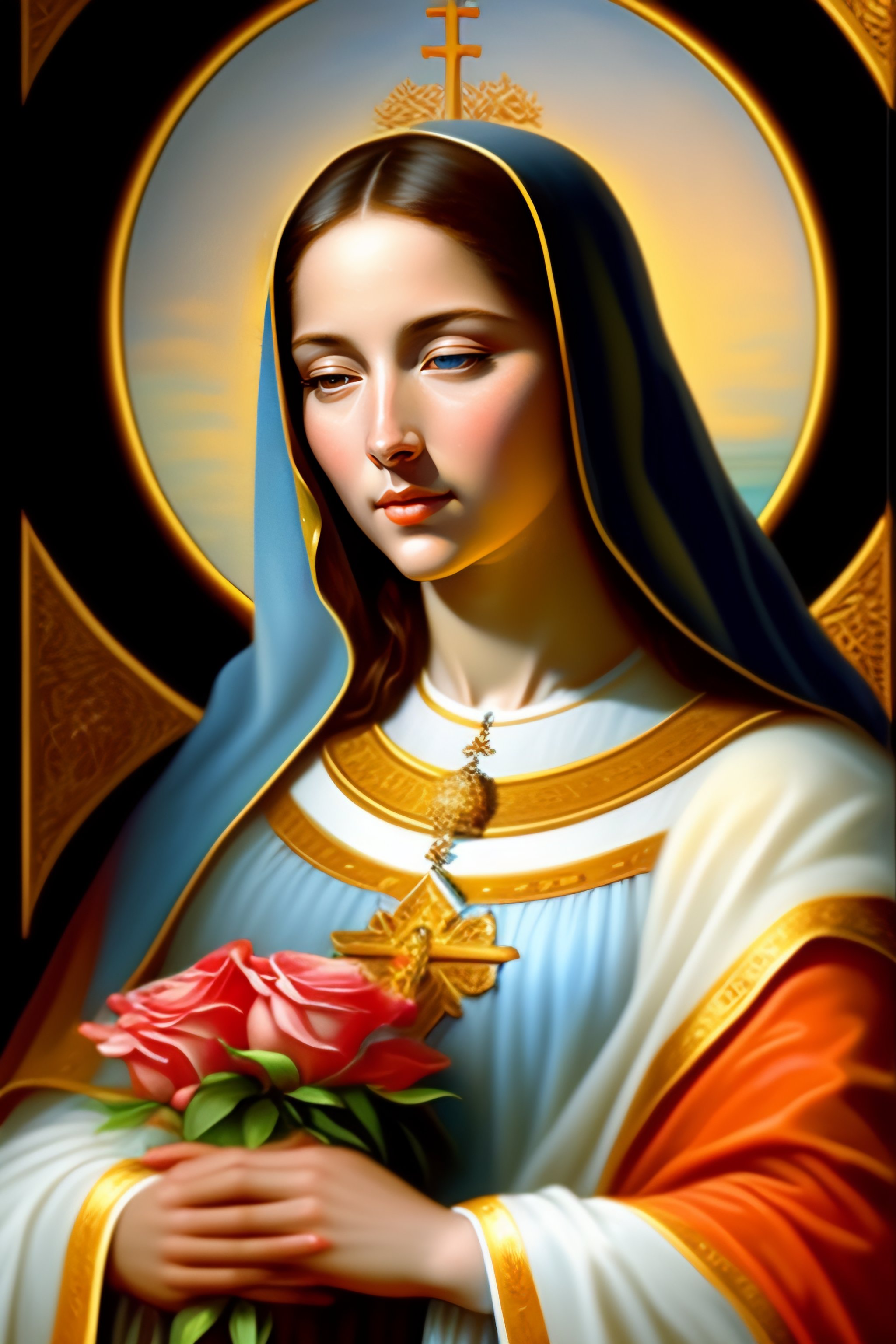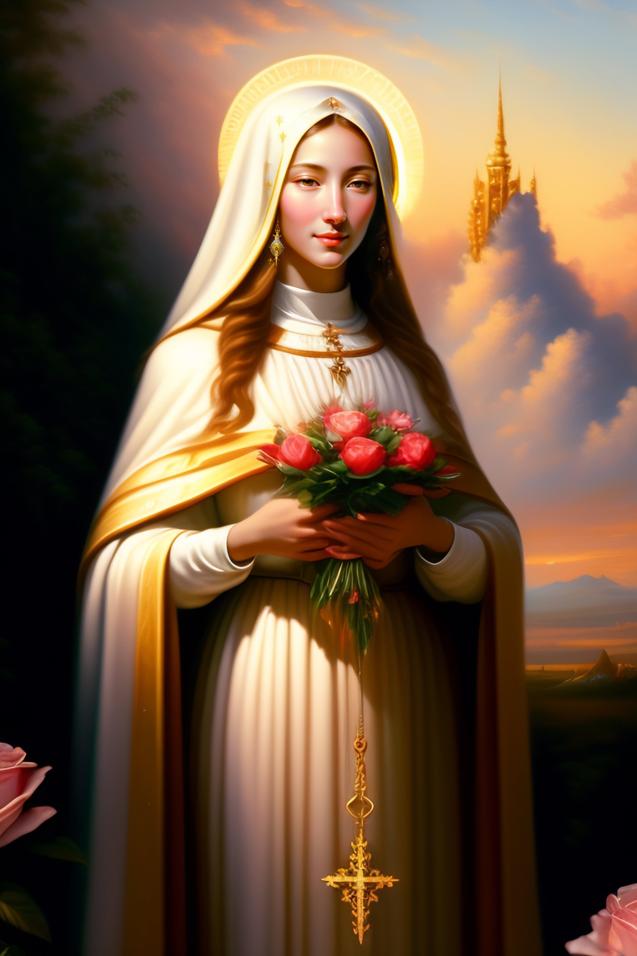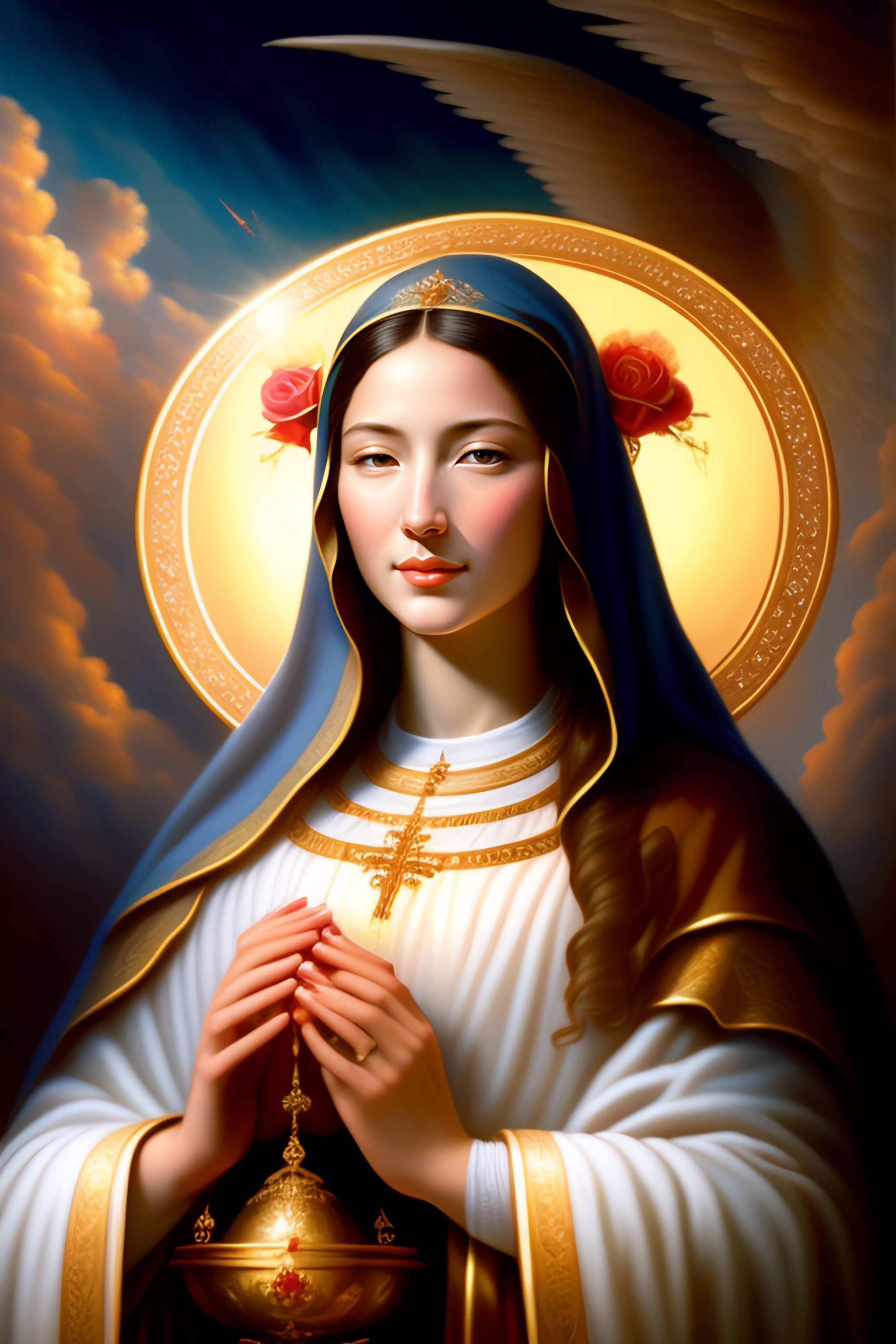 An oil painting by ross tran and thomas kincade, virgin mary mother of jesus, with roses in hands, angelical background, beautiful eyes, with rosary, immaculate conception, according to the bible, holy ghost, full body, 16k, perfect hands, skye, with clouds, realistic, catholic style, background with landscape