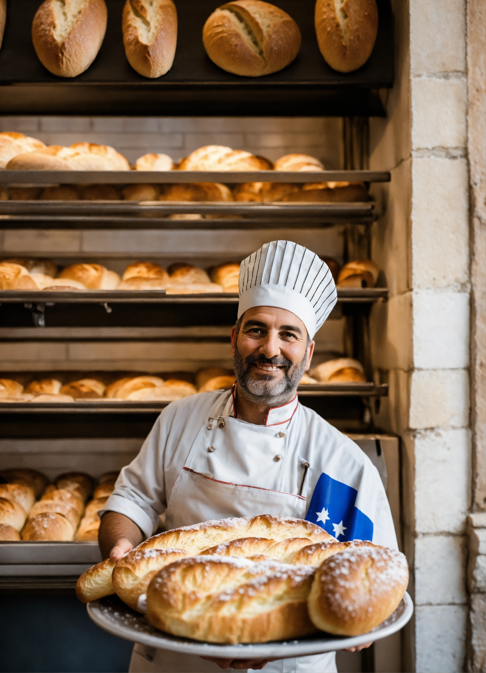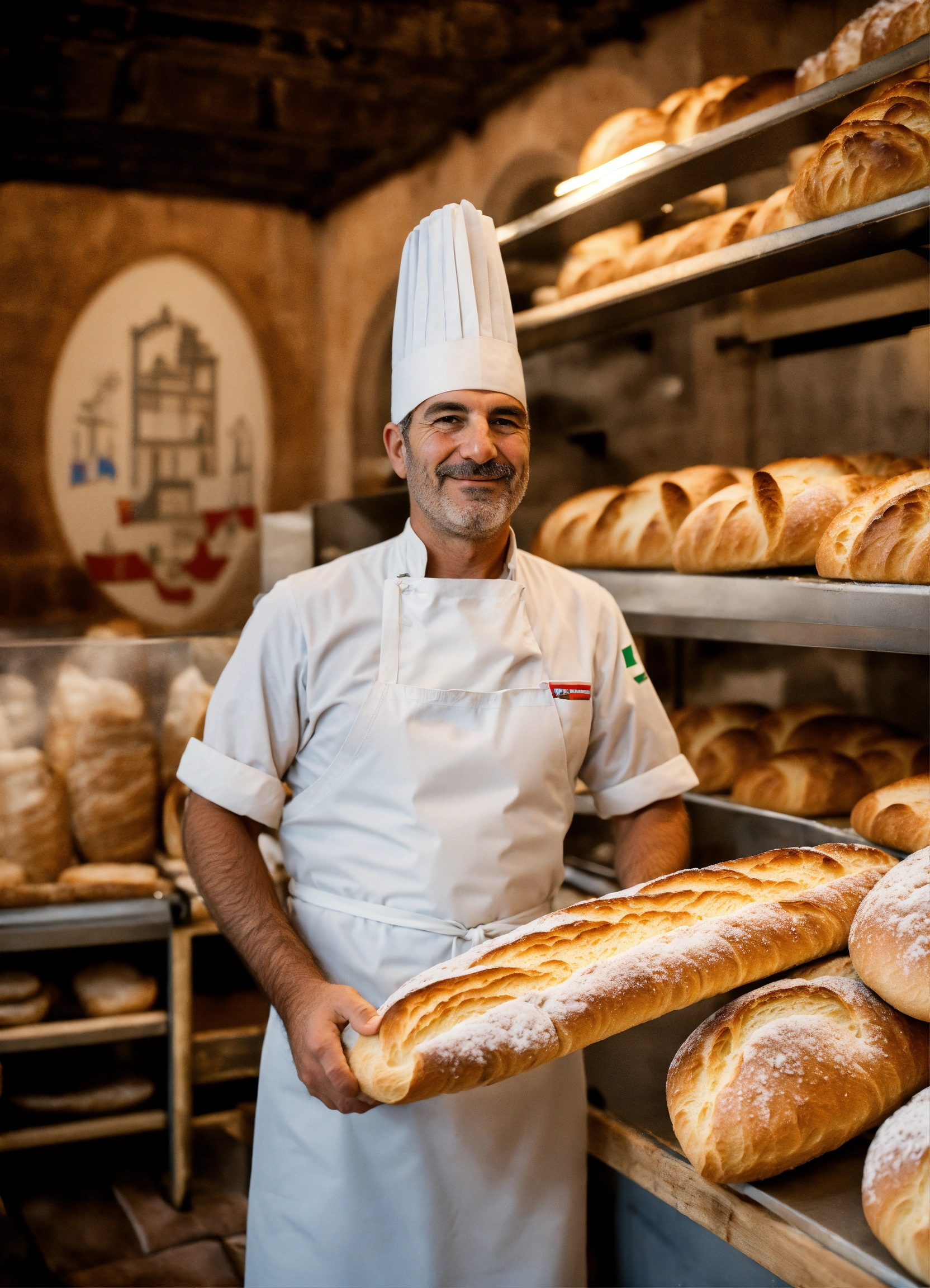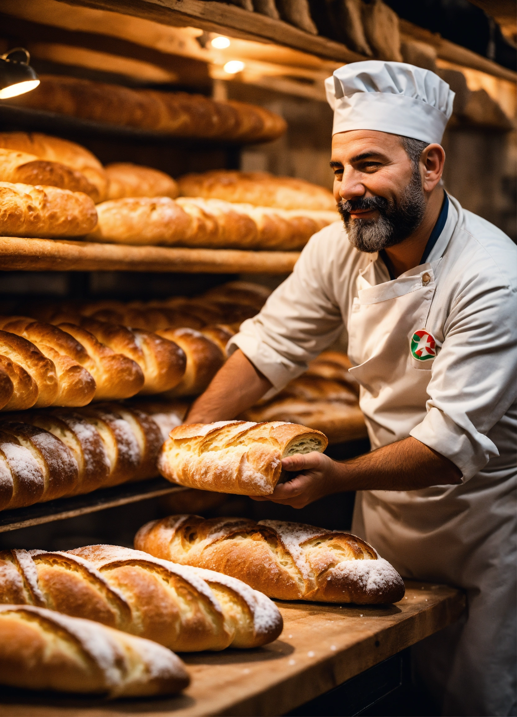 Italian baker, holding a beautiful baguette in his bakery in roma, with the italian flag and the colosseum on the back