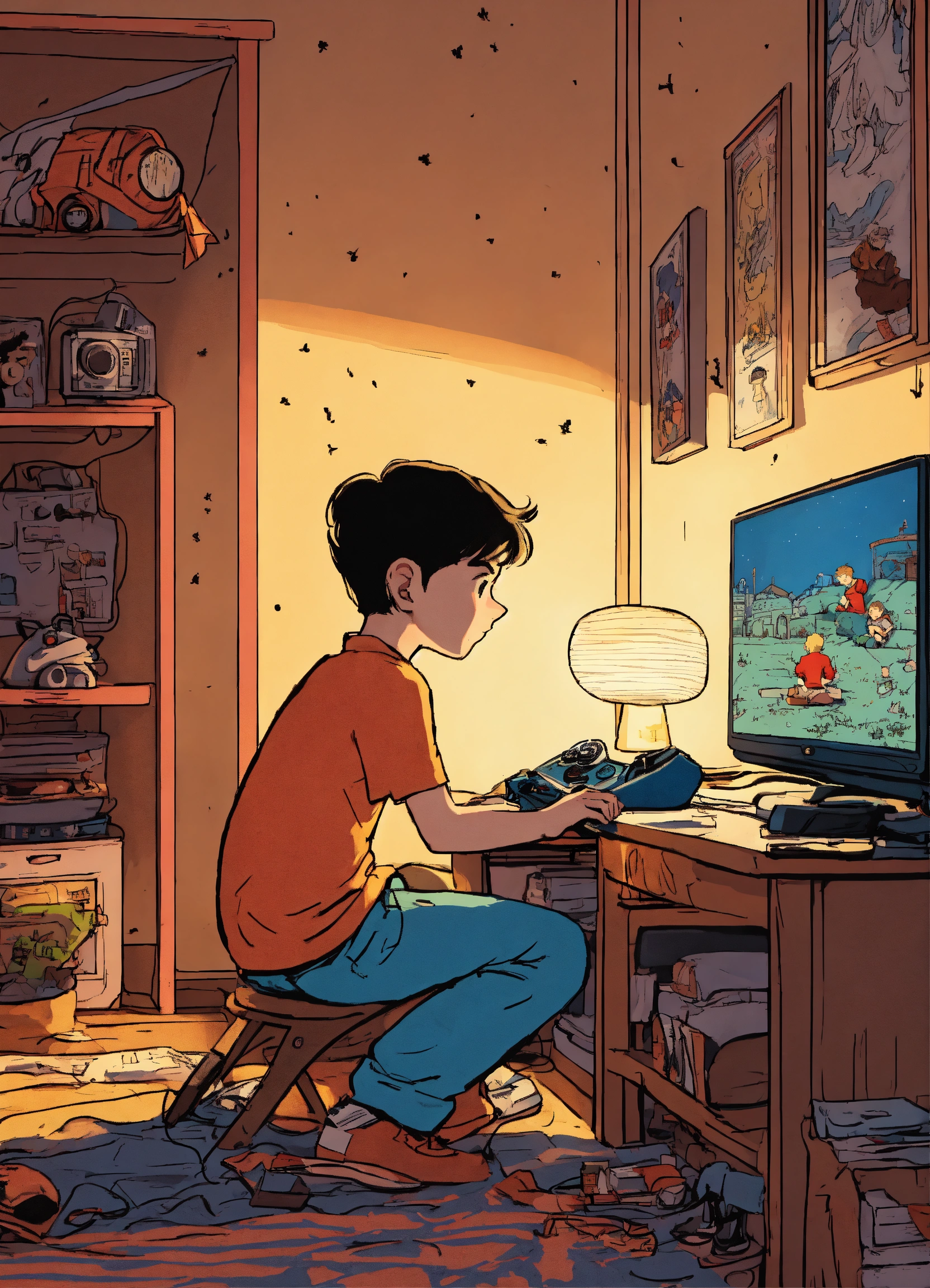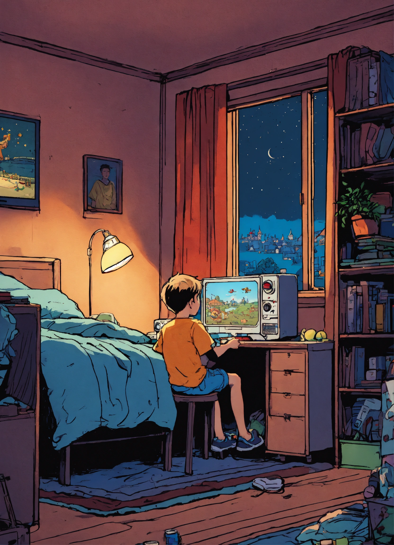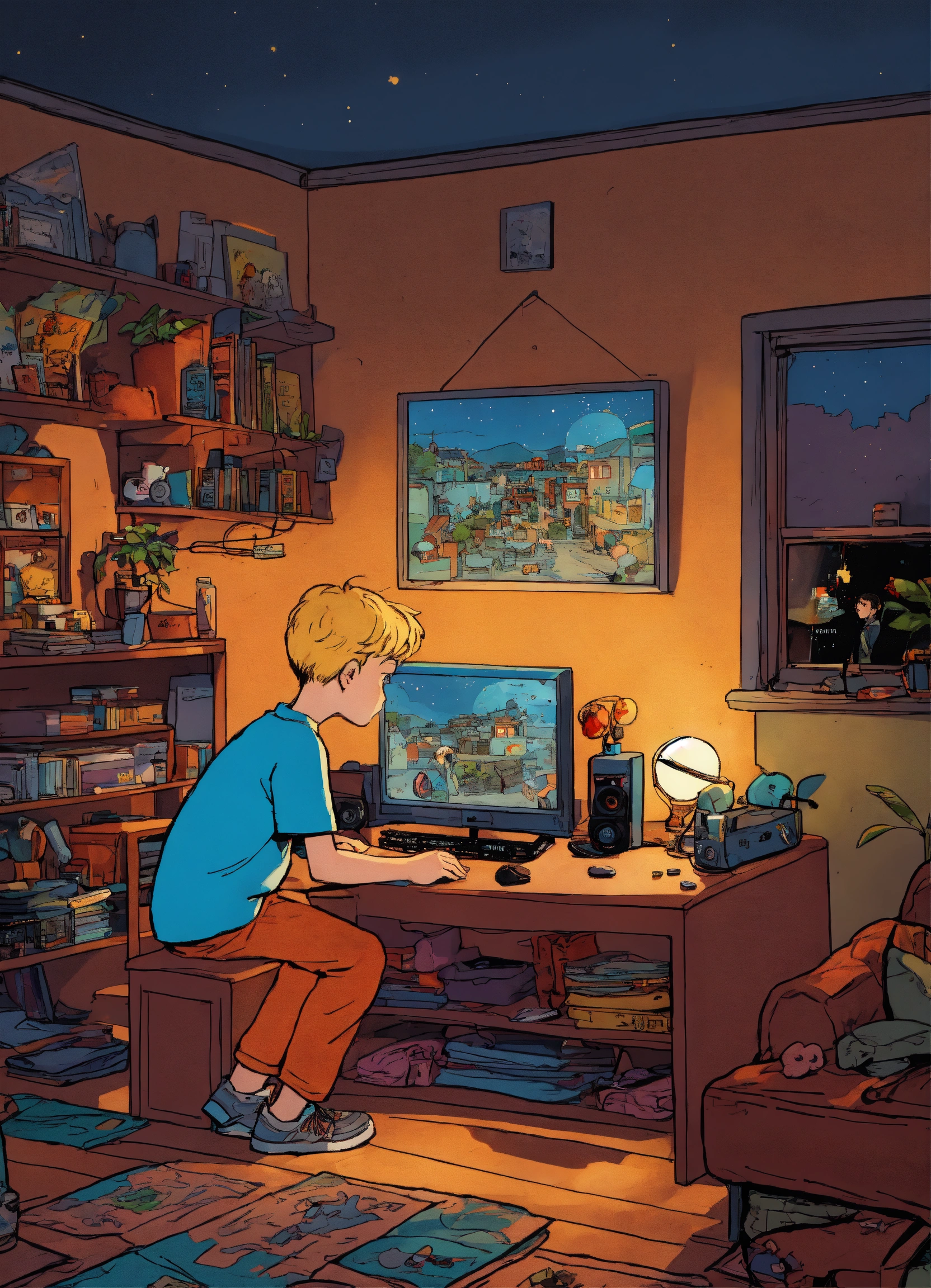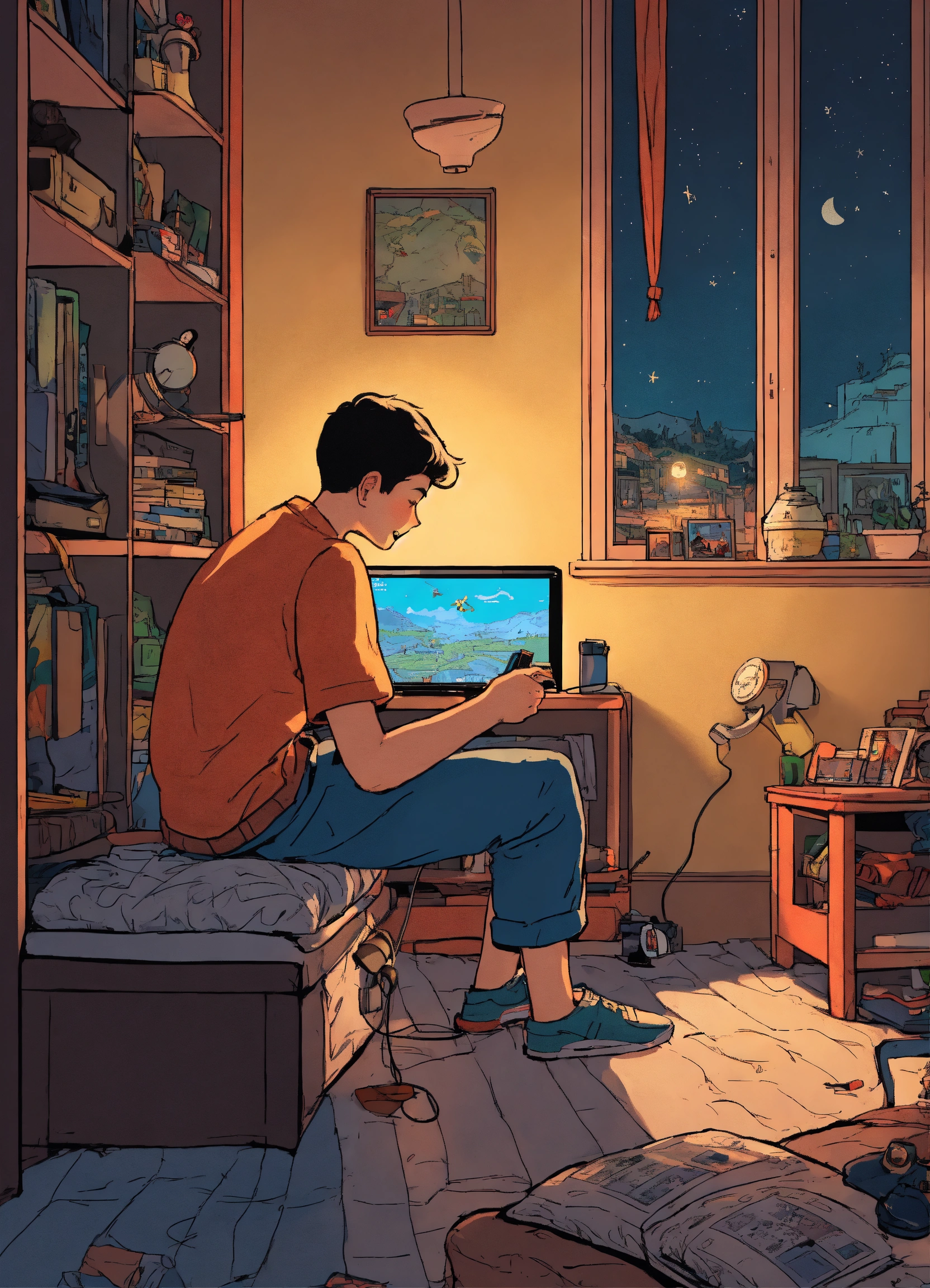A boy playing video games at night in his room