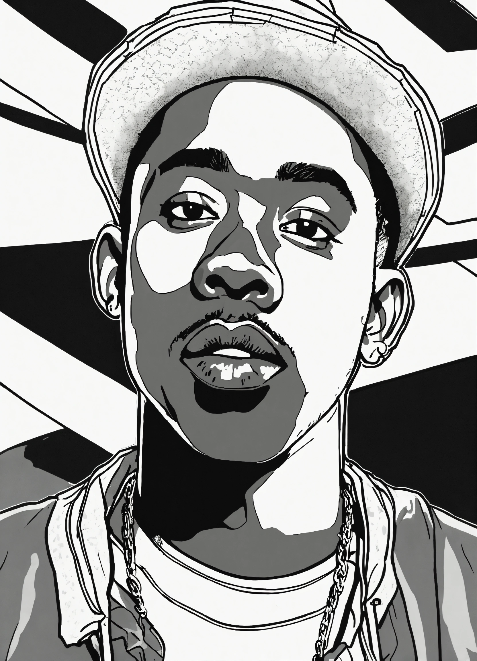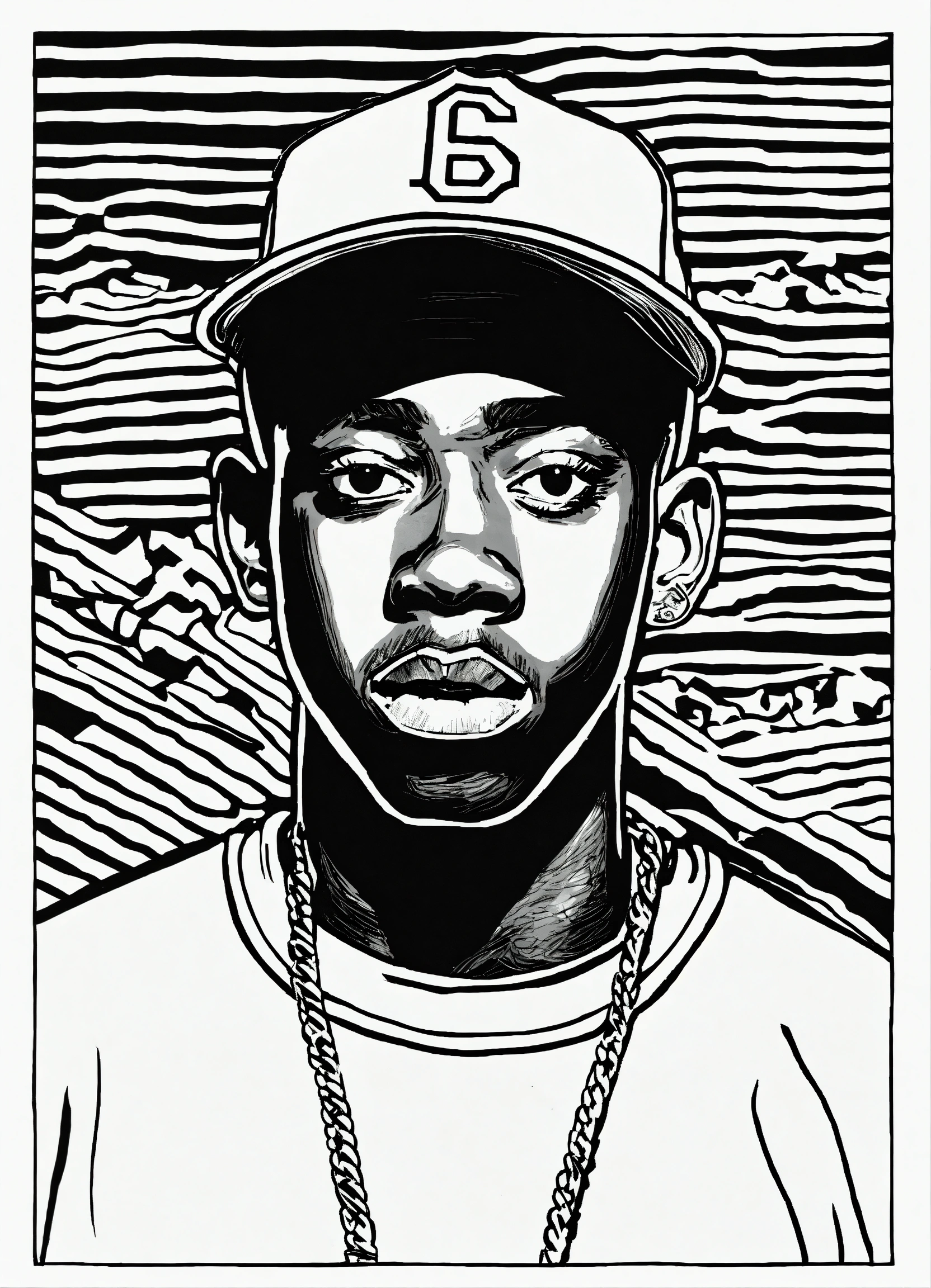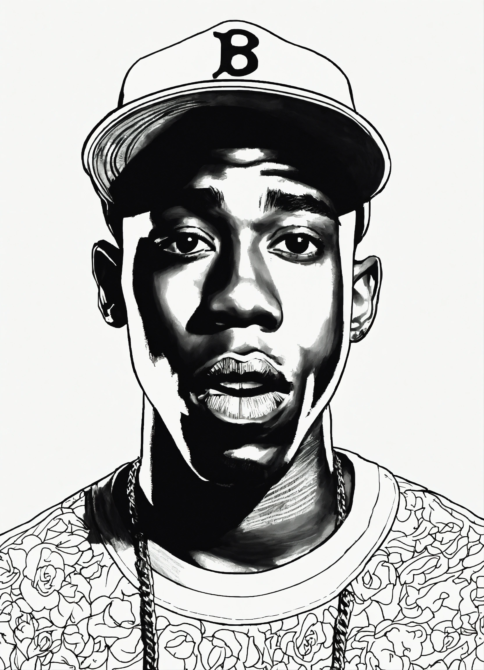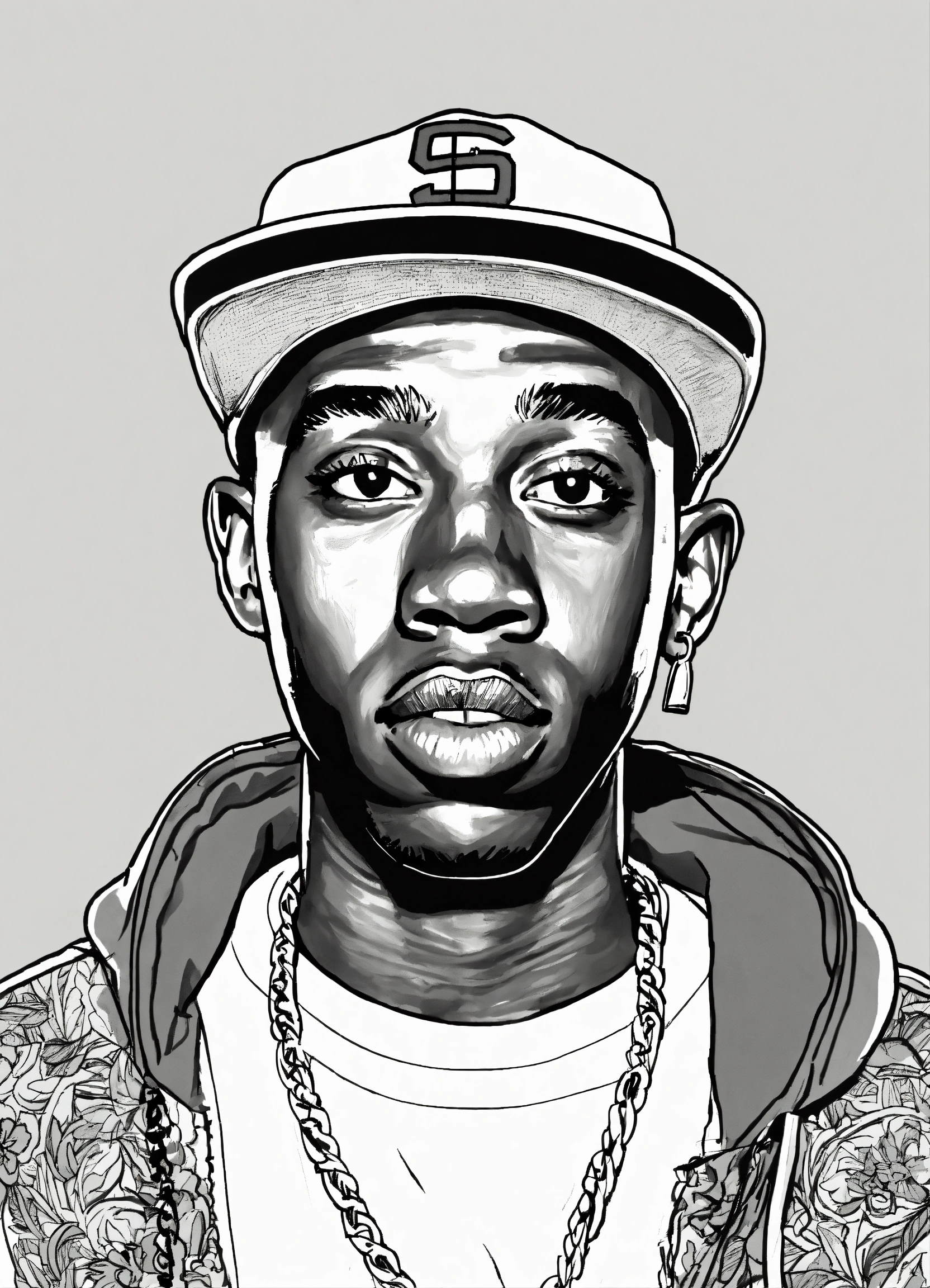Black and white line drawing, tyler the creator, upper body, shoulders, white background, clip art, 00's
