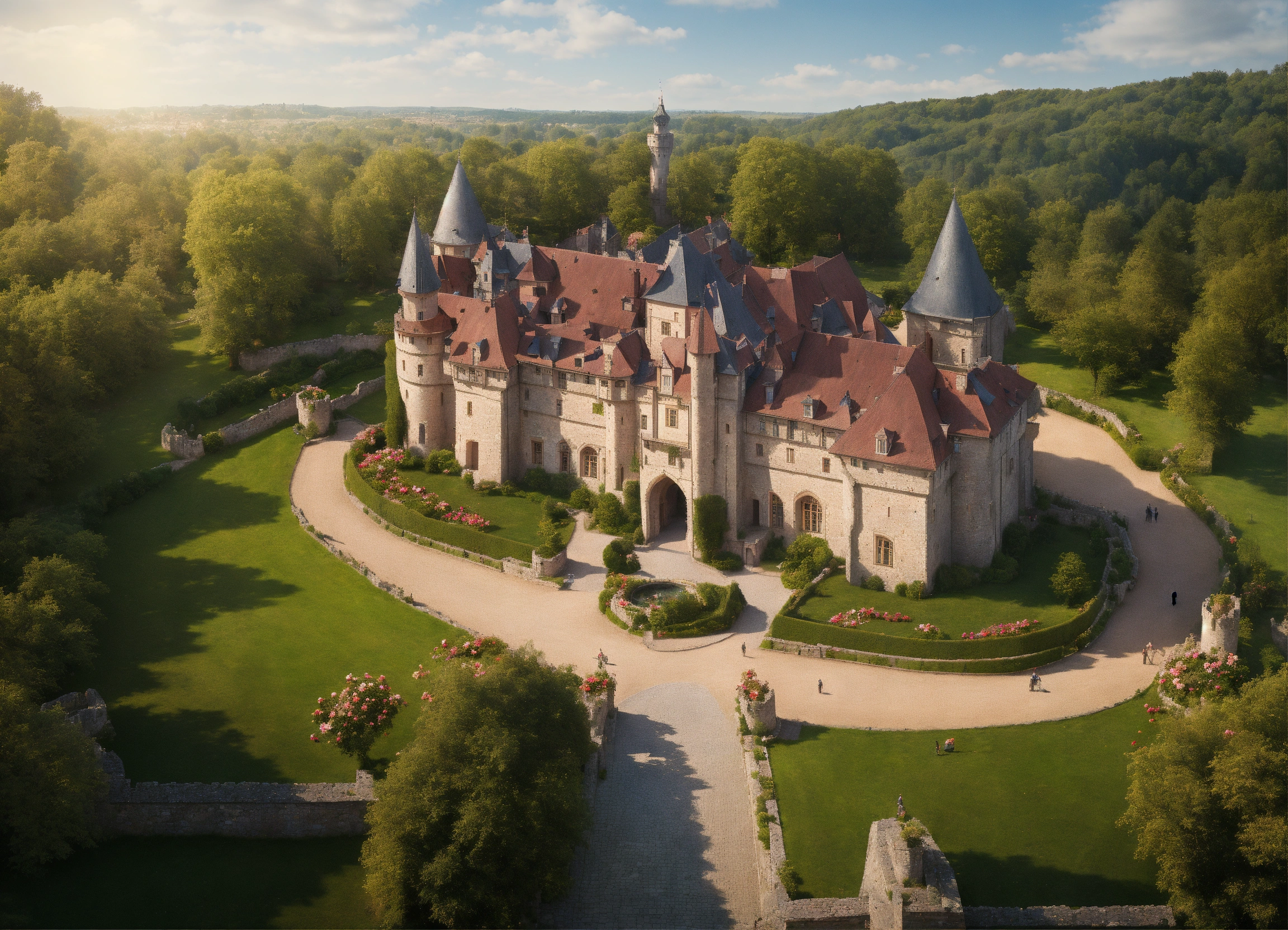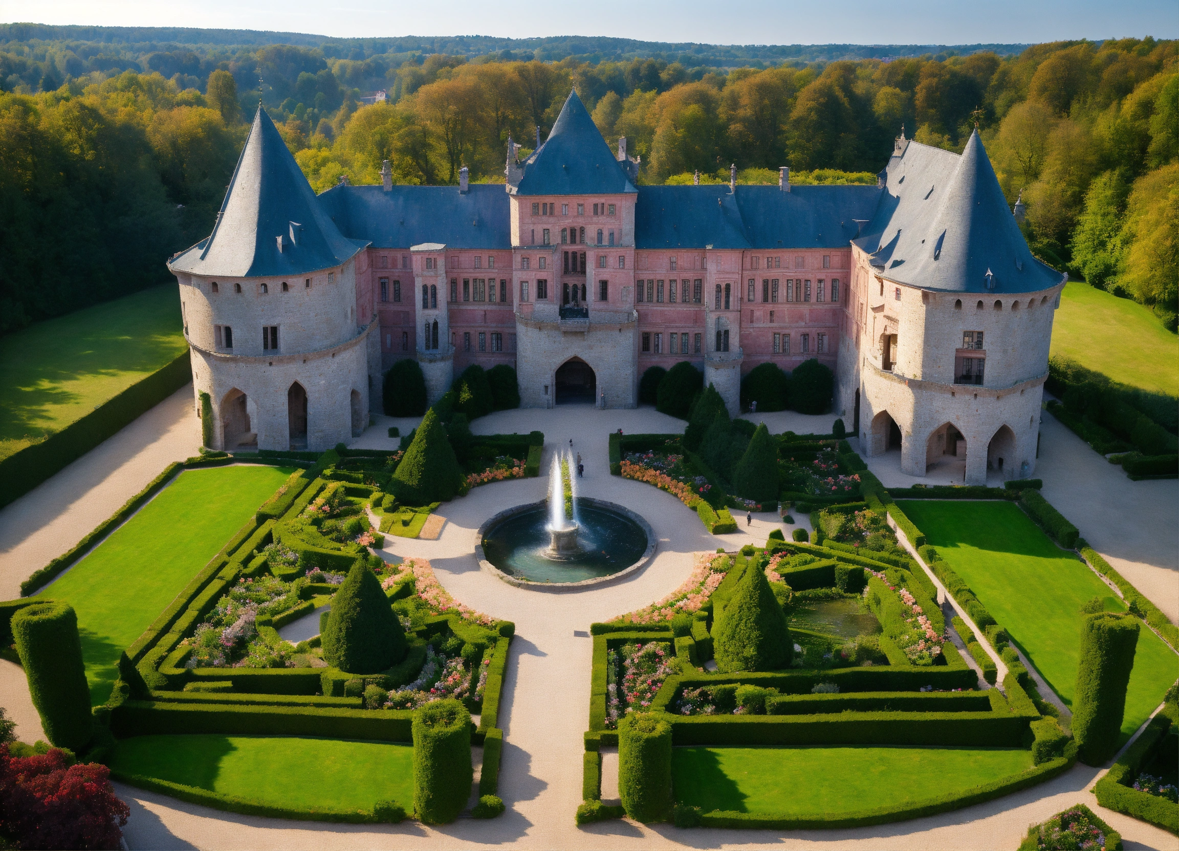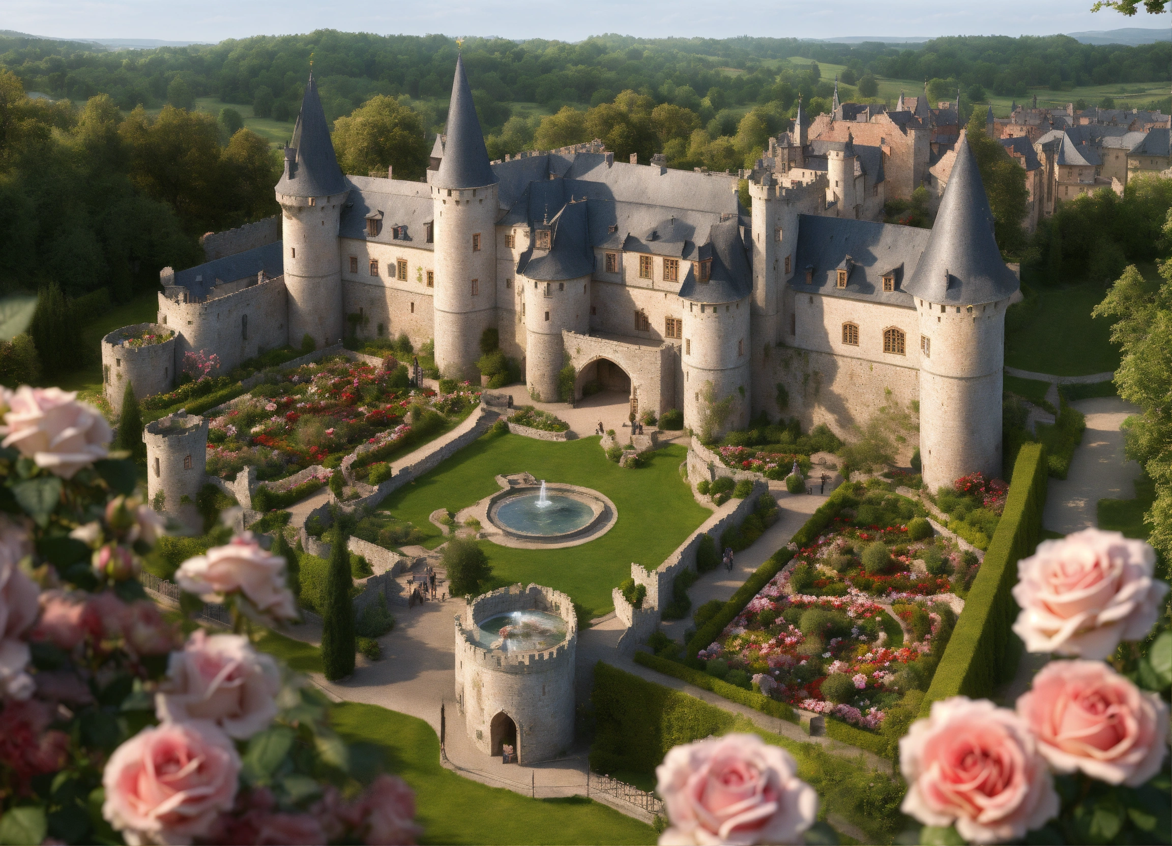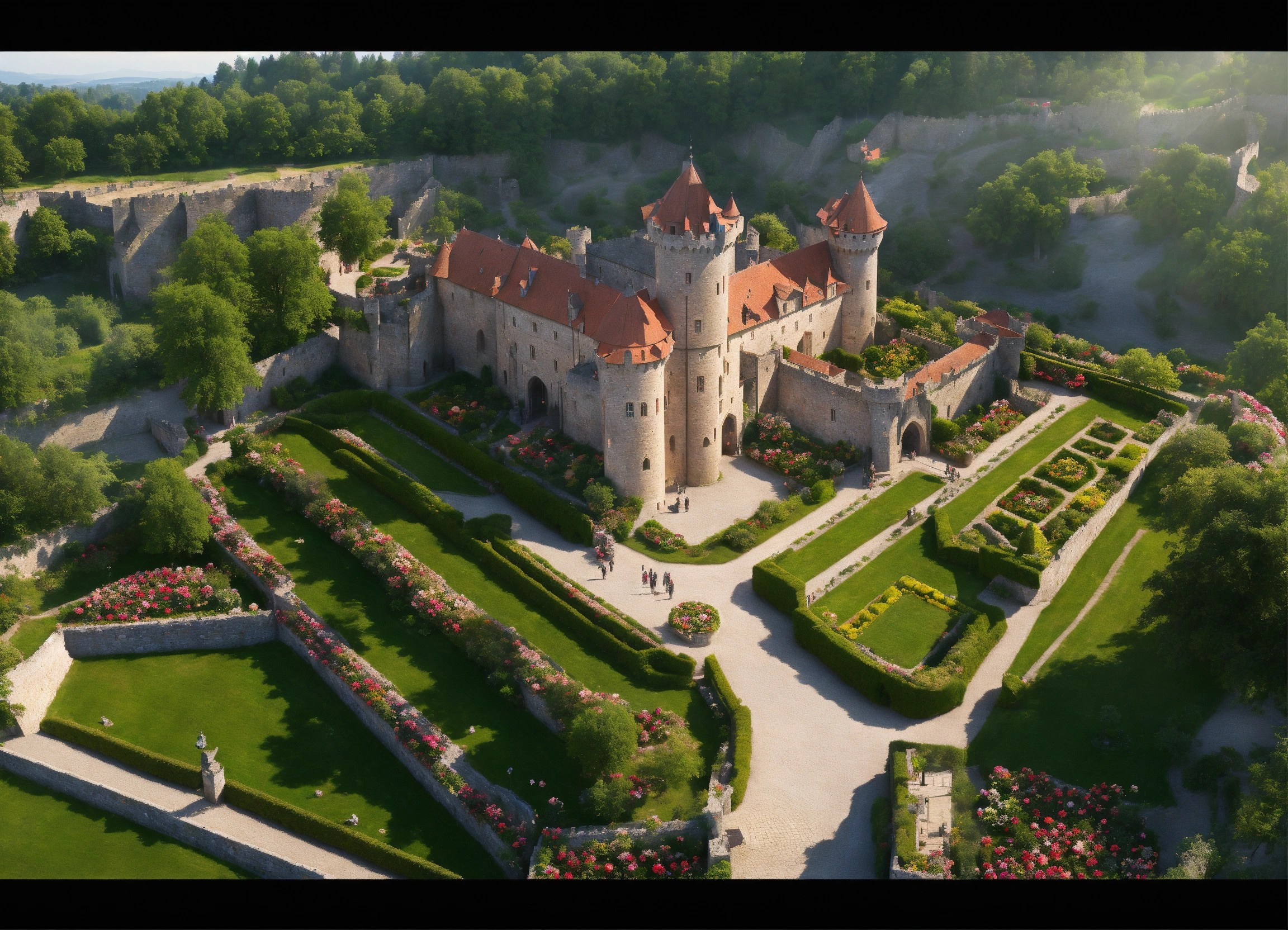 Ultra realistic, photorealistic, bird's eye view of a small medieval castle on a rock, outer bailey, garden terraces with fountain, rose bowers, magnificent rose garden and arcades, magnificent fountain, massive crenellated stone wall with a central wall gate and watchtowers surrounds the castle area, with a large inner courtyard and several servants quarters and stables, rose pavillon, pleasure grotto, large forecourt, a wide boulevard leads to the entrance to the castle, extensive rose fields on hilly landscapes in the area around the castle, ultra detailled, focus on castle, sharp focus, sharp, ambient lighting, ksiąz castle in poland