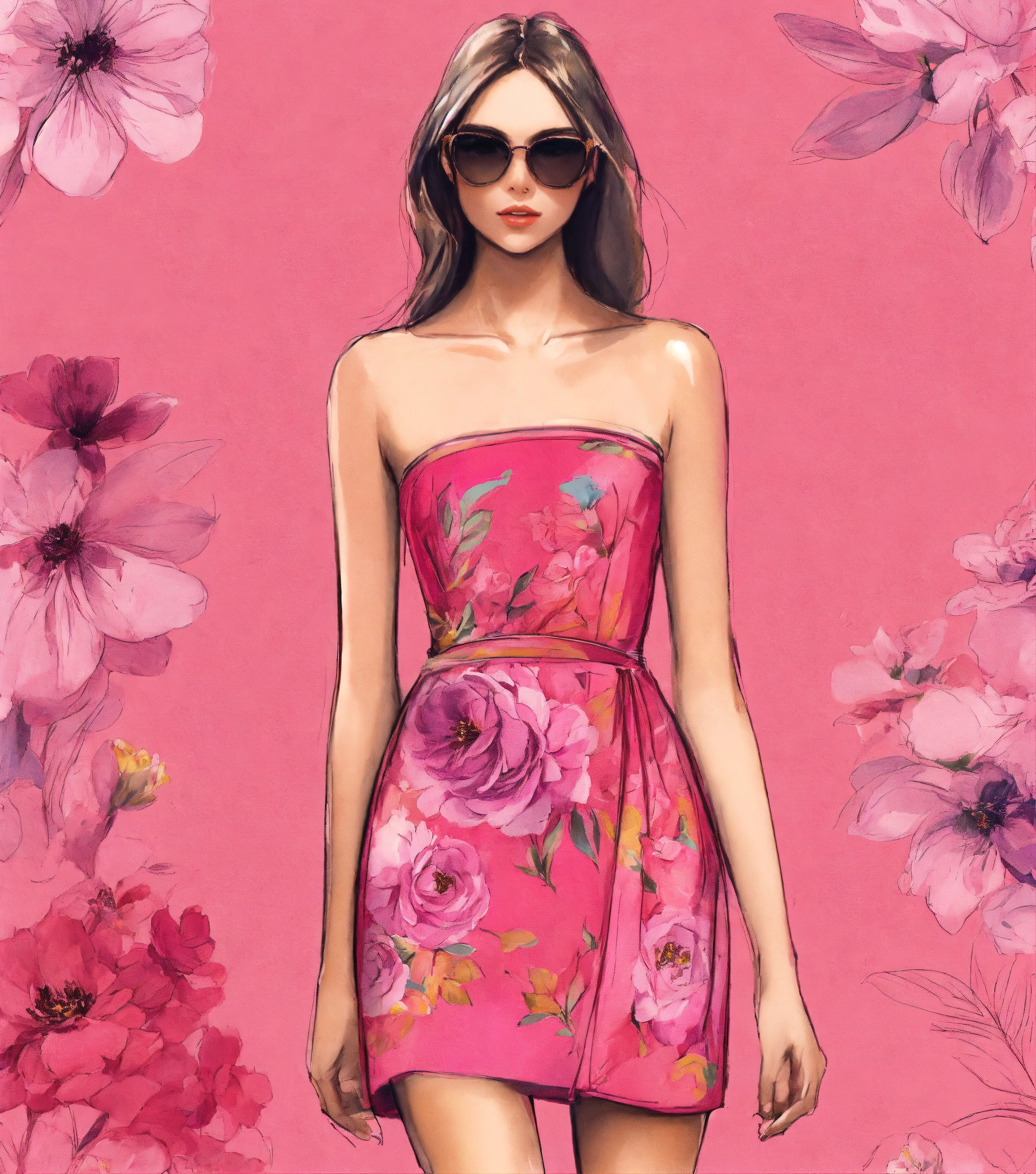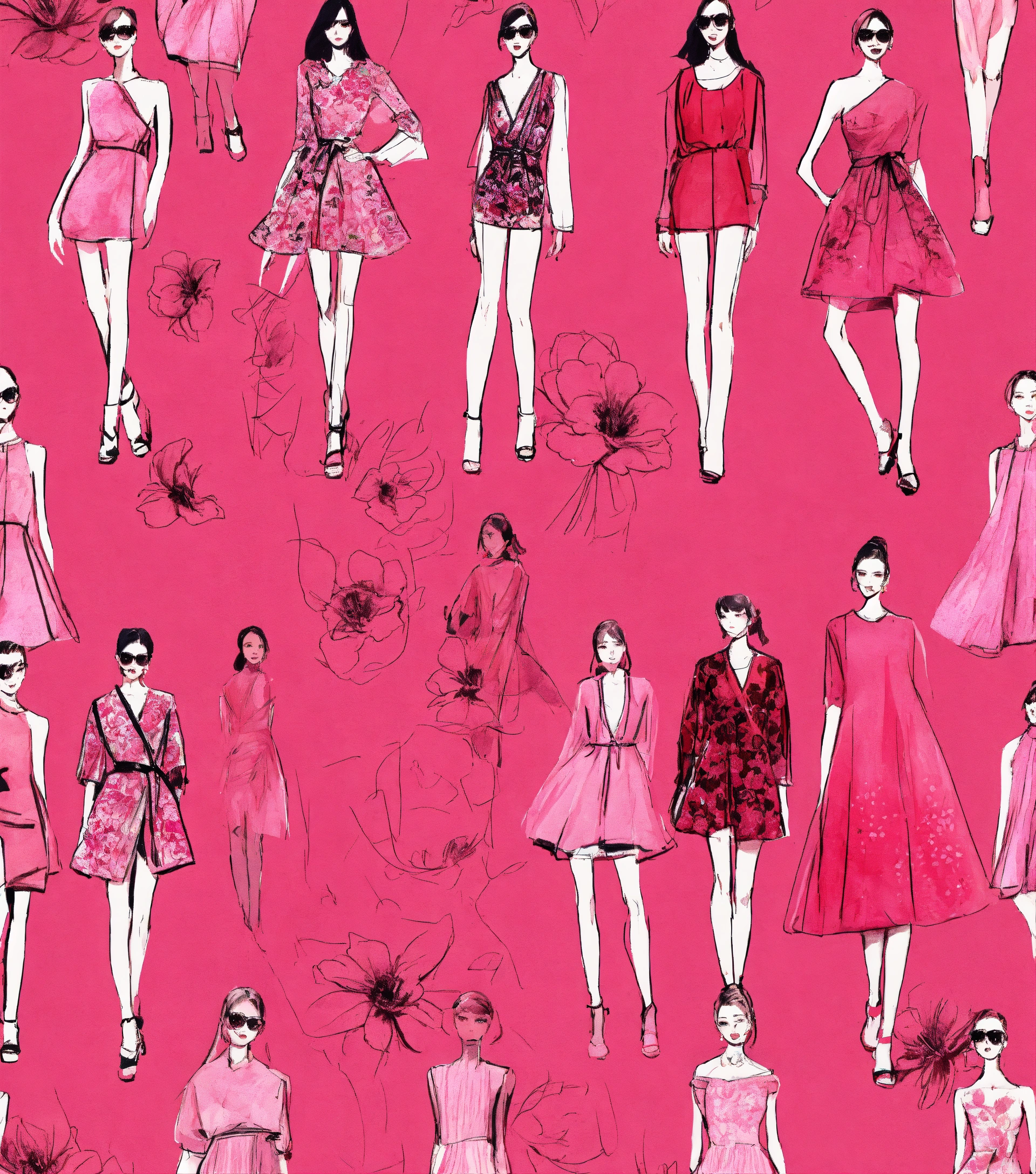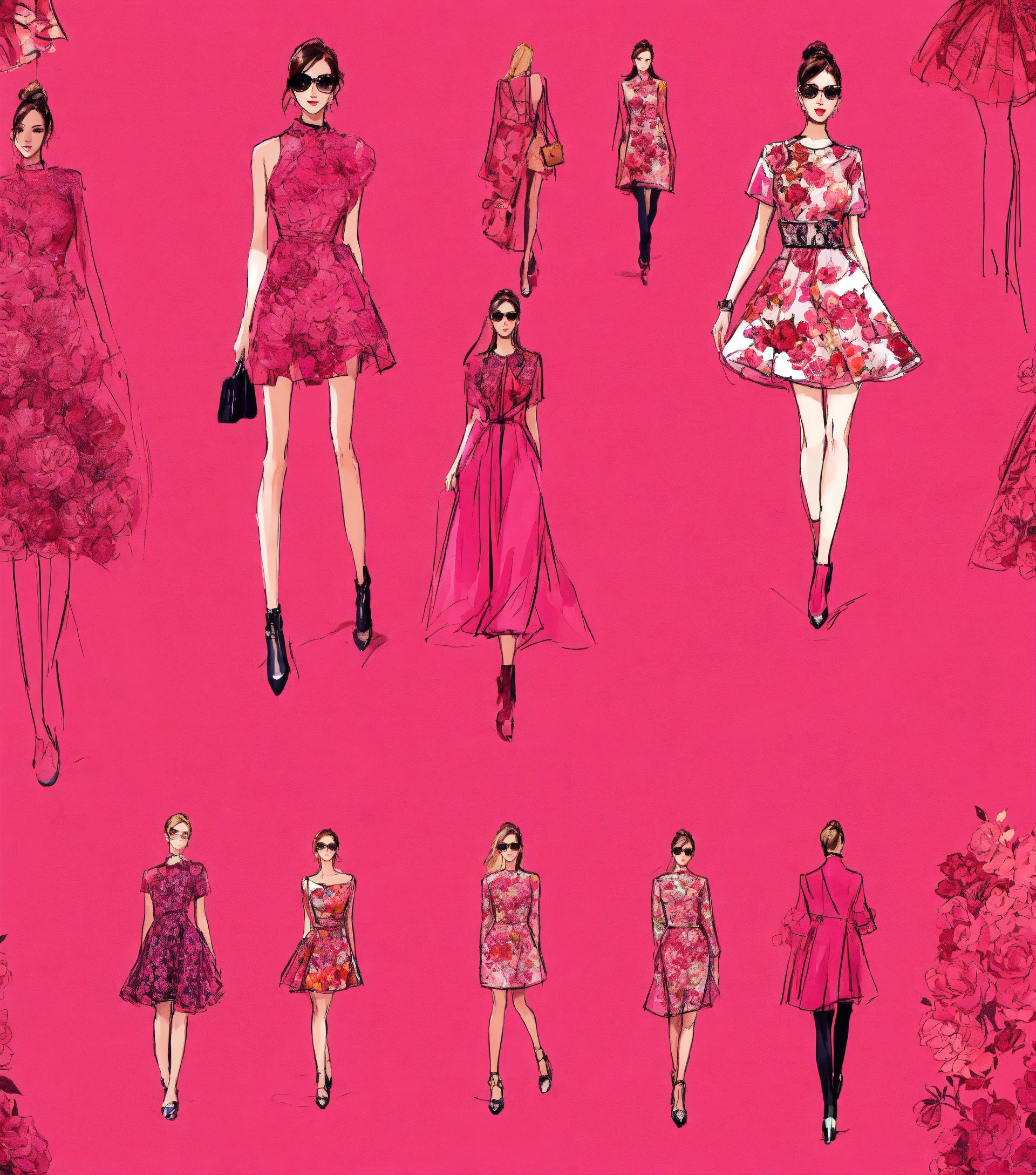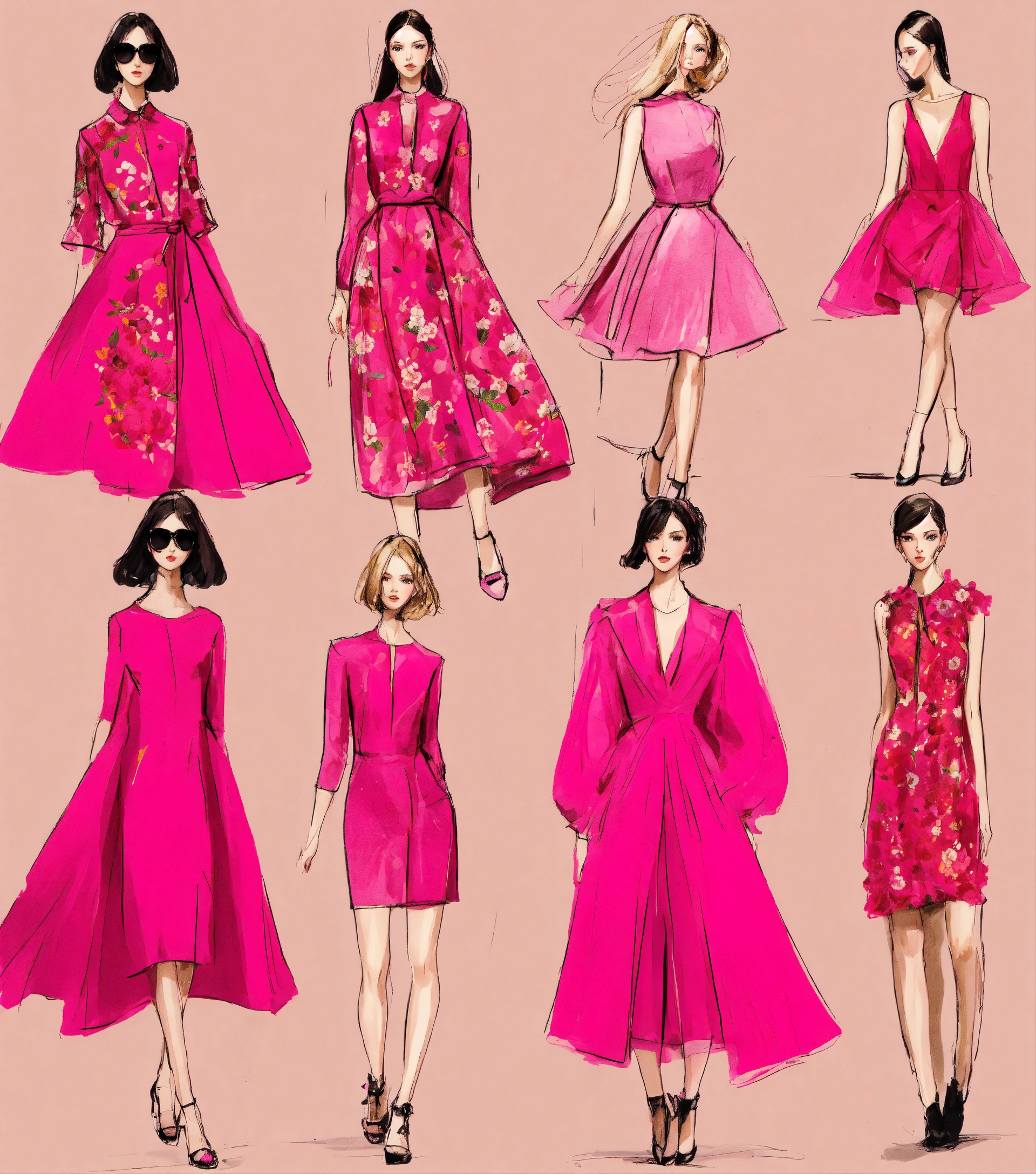 Fashion illustrations, 12 different designs, rough sketches, bright pink color dresses, illustrations, figure drawing, mini dresses with floral patterns