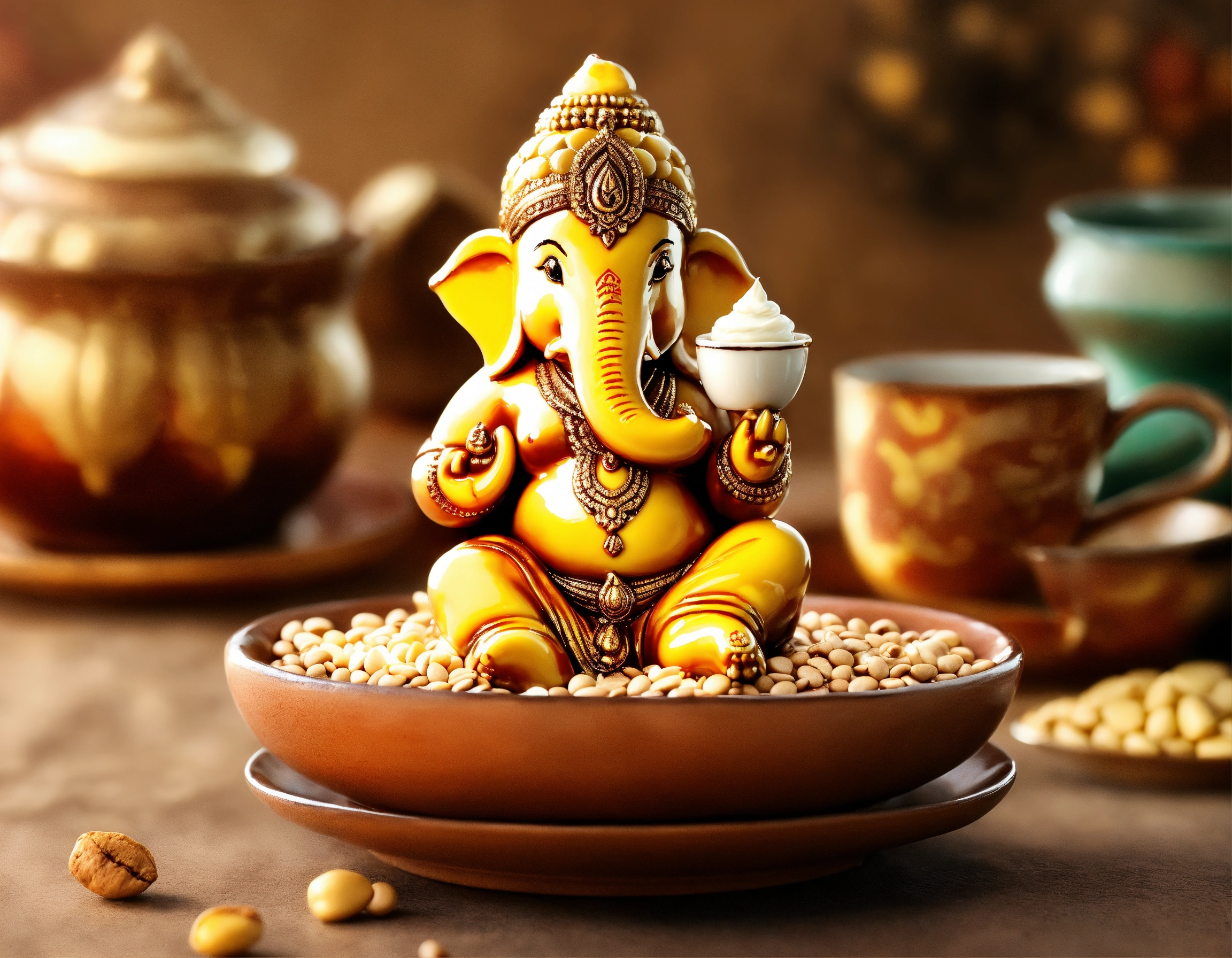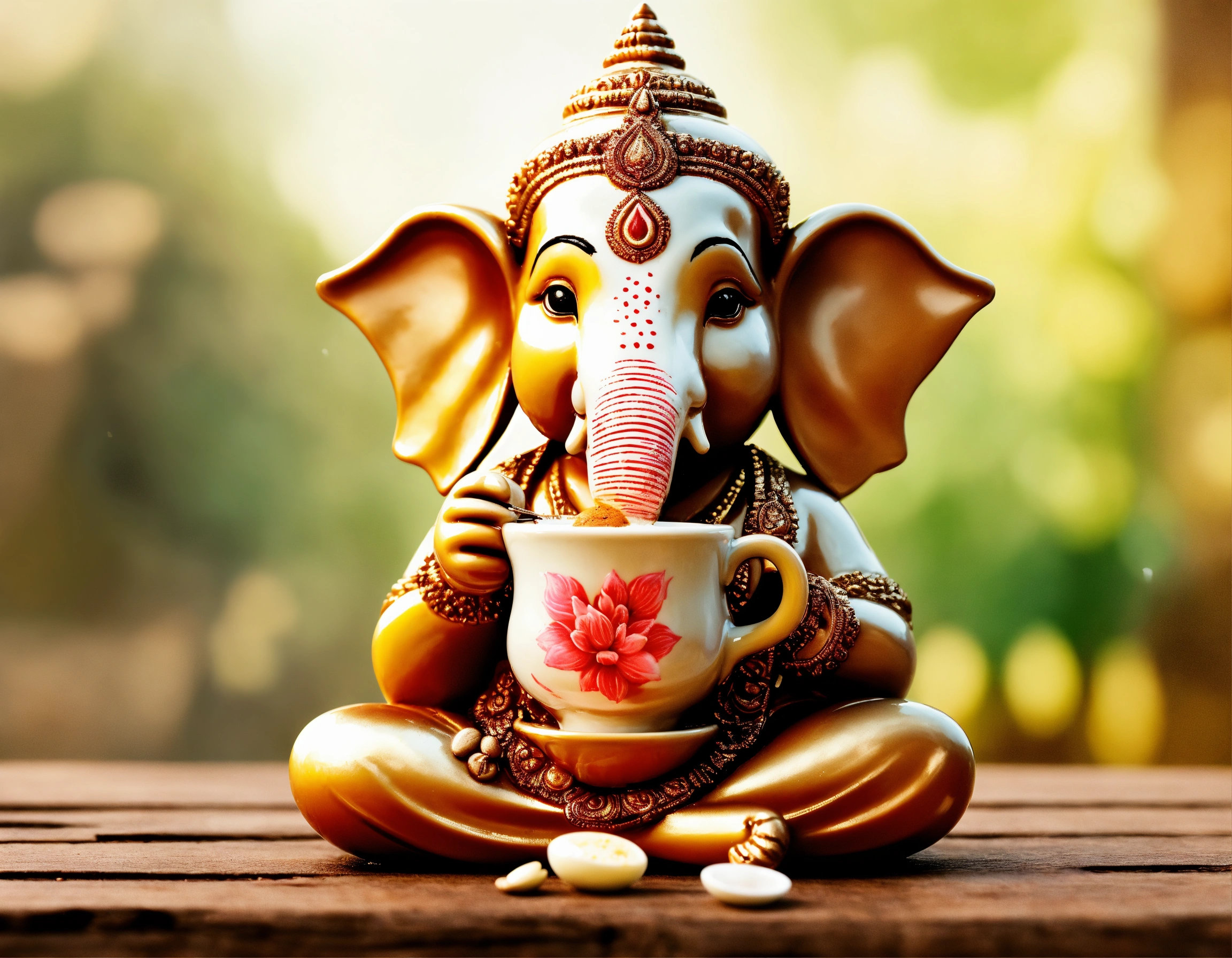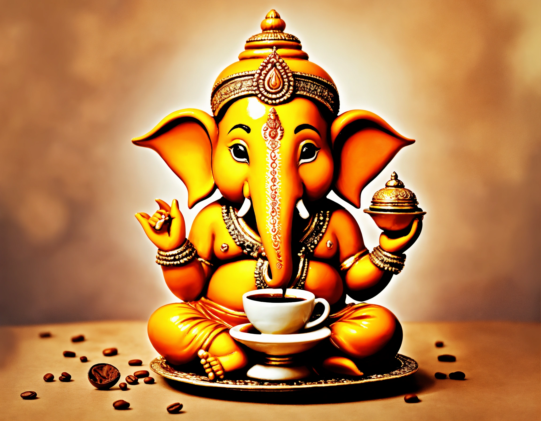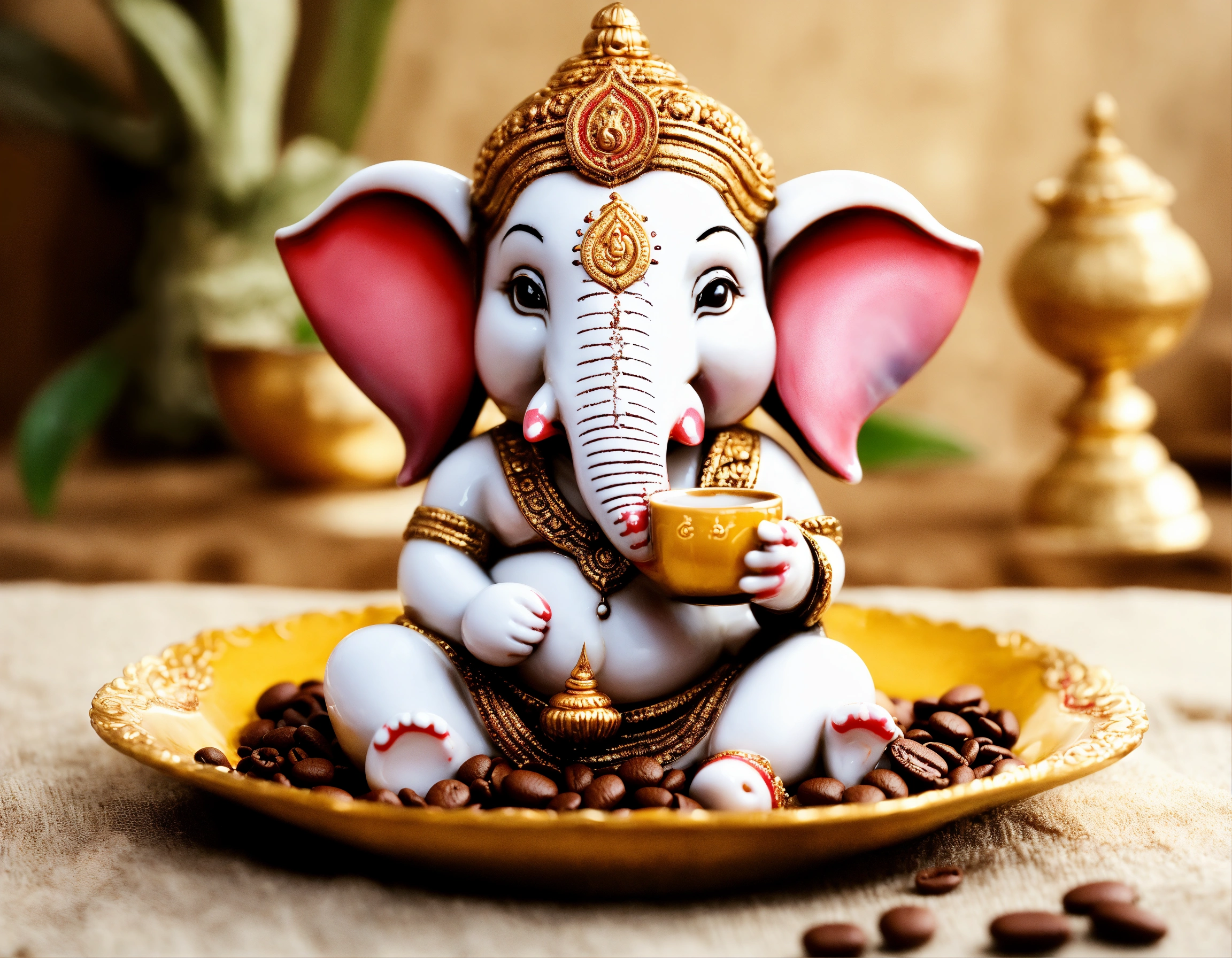 Create an image of ganesha looking cute and having coffee with modak, make it look like a childhood version of ganesha, add some coffee beans in the background, make the cup look off white