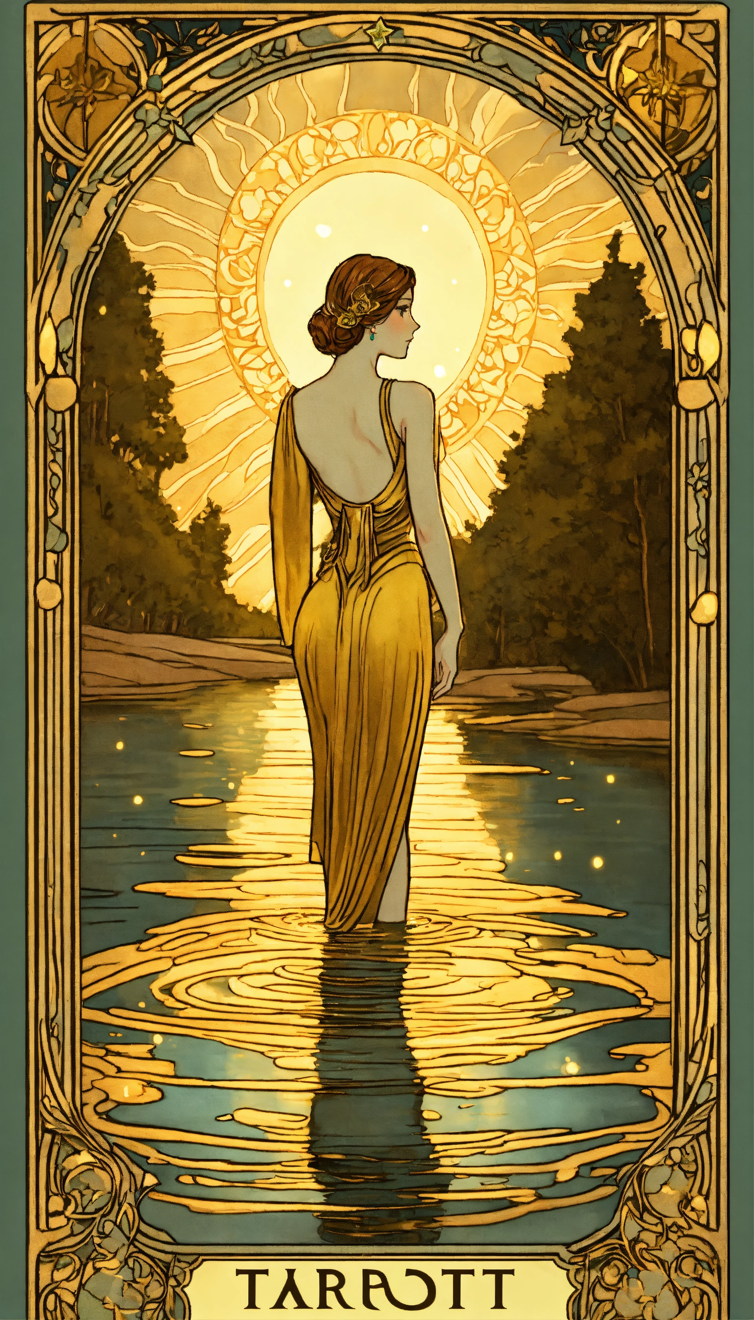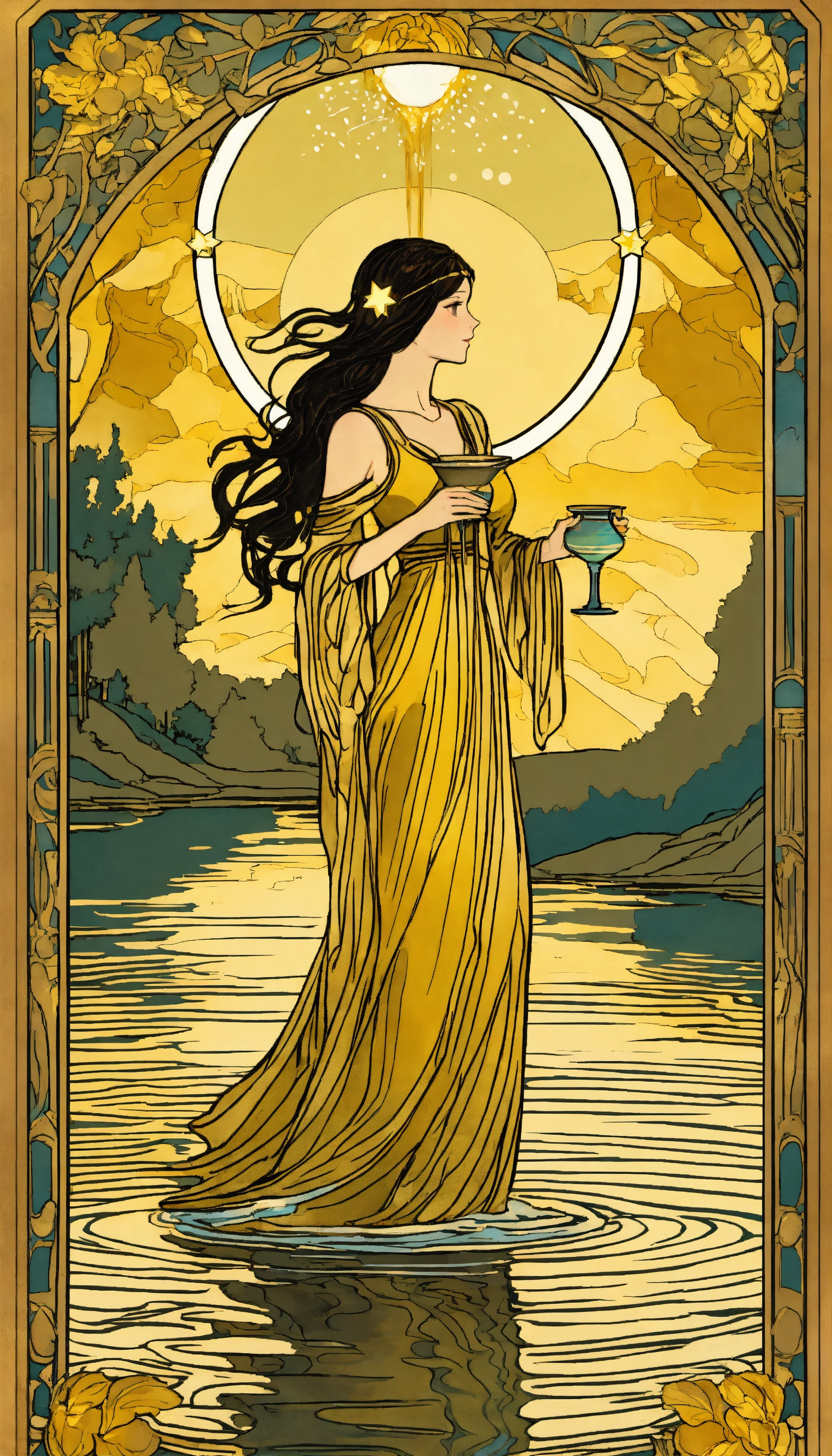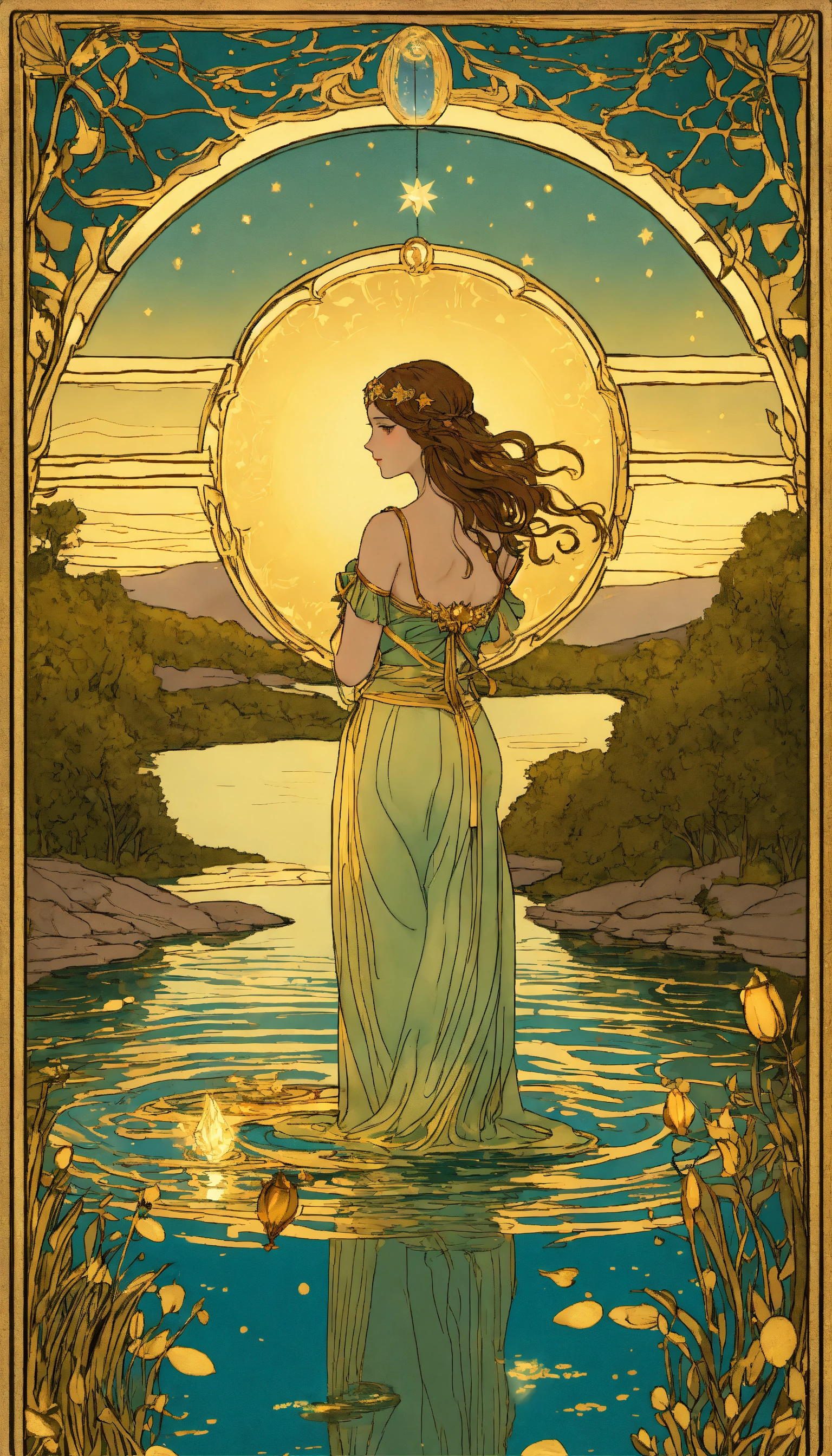 Art nouveau tarot gold glowing star woman at a lake water flowing from vessel