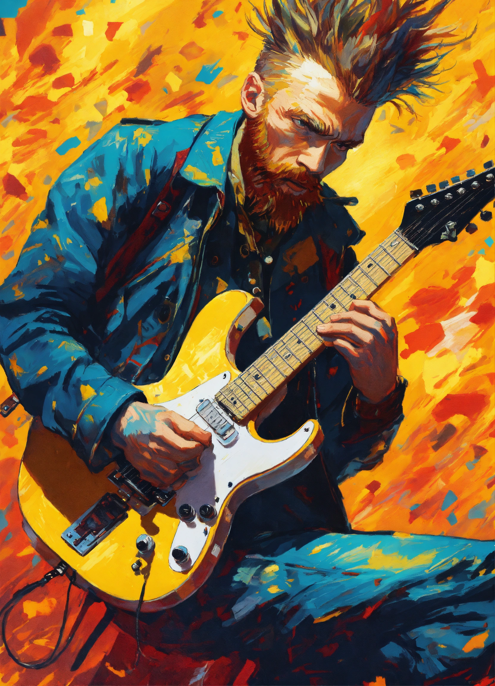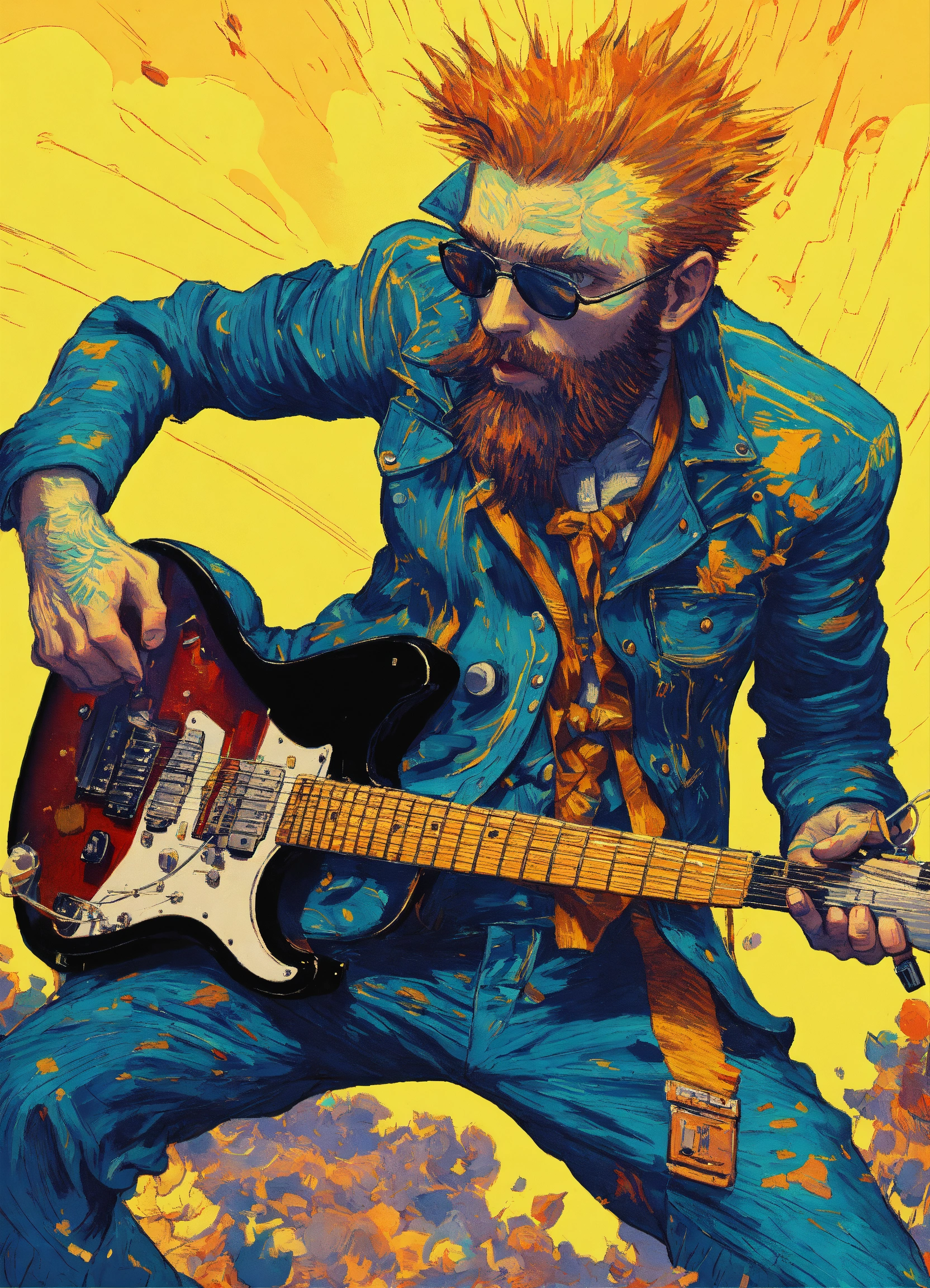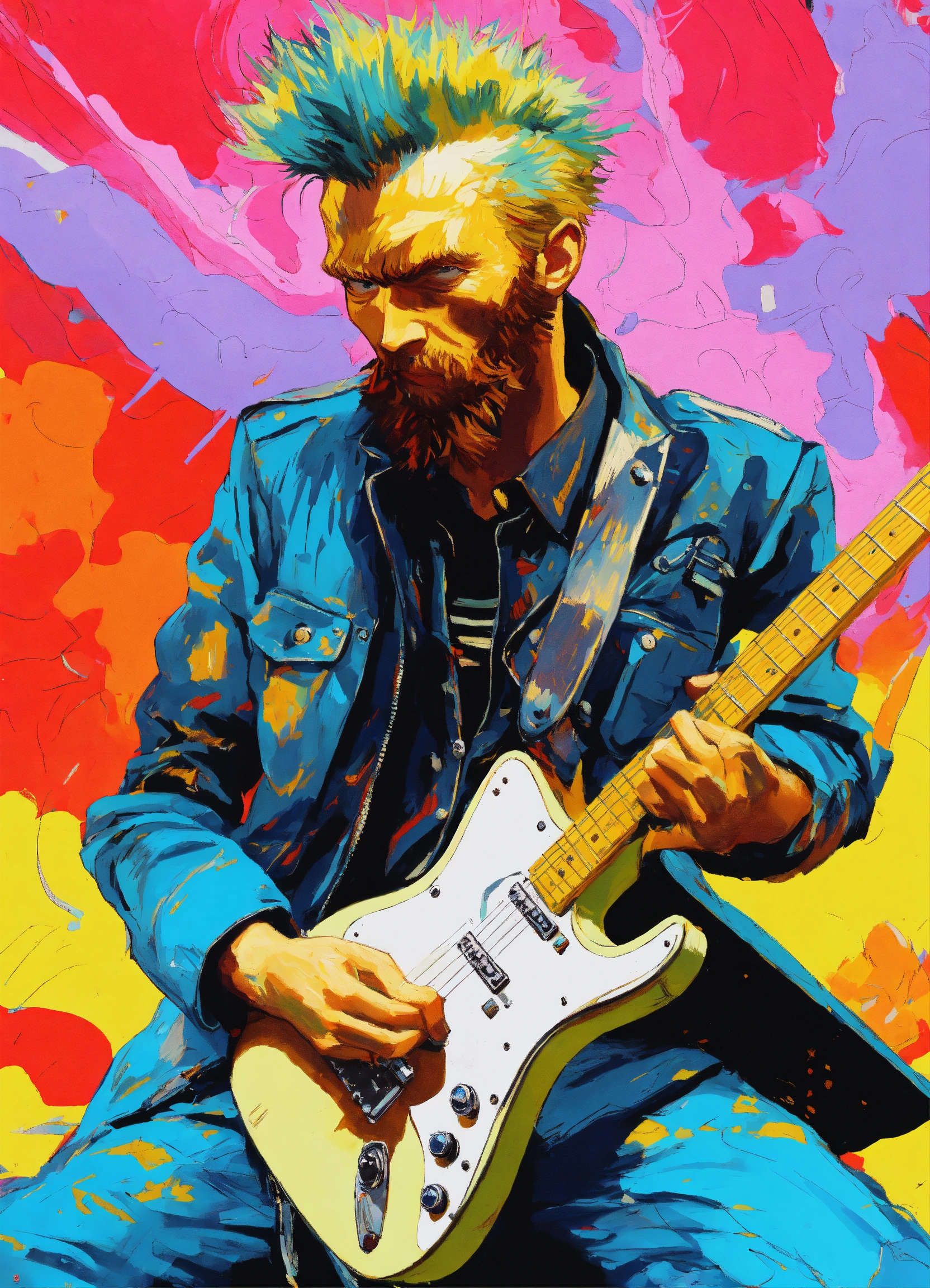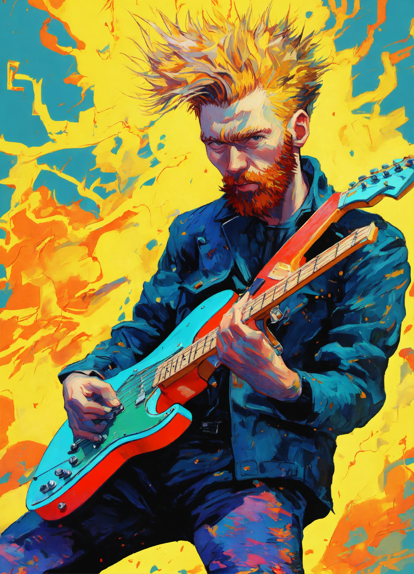White background, a punk vincent van gogh playing electric guitar, striking action pose, modern cartoon, highly detailed, vibrant colors, sci-fi punk, concept art