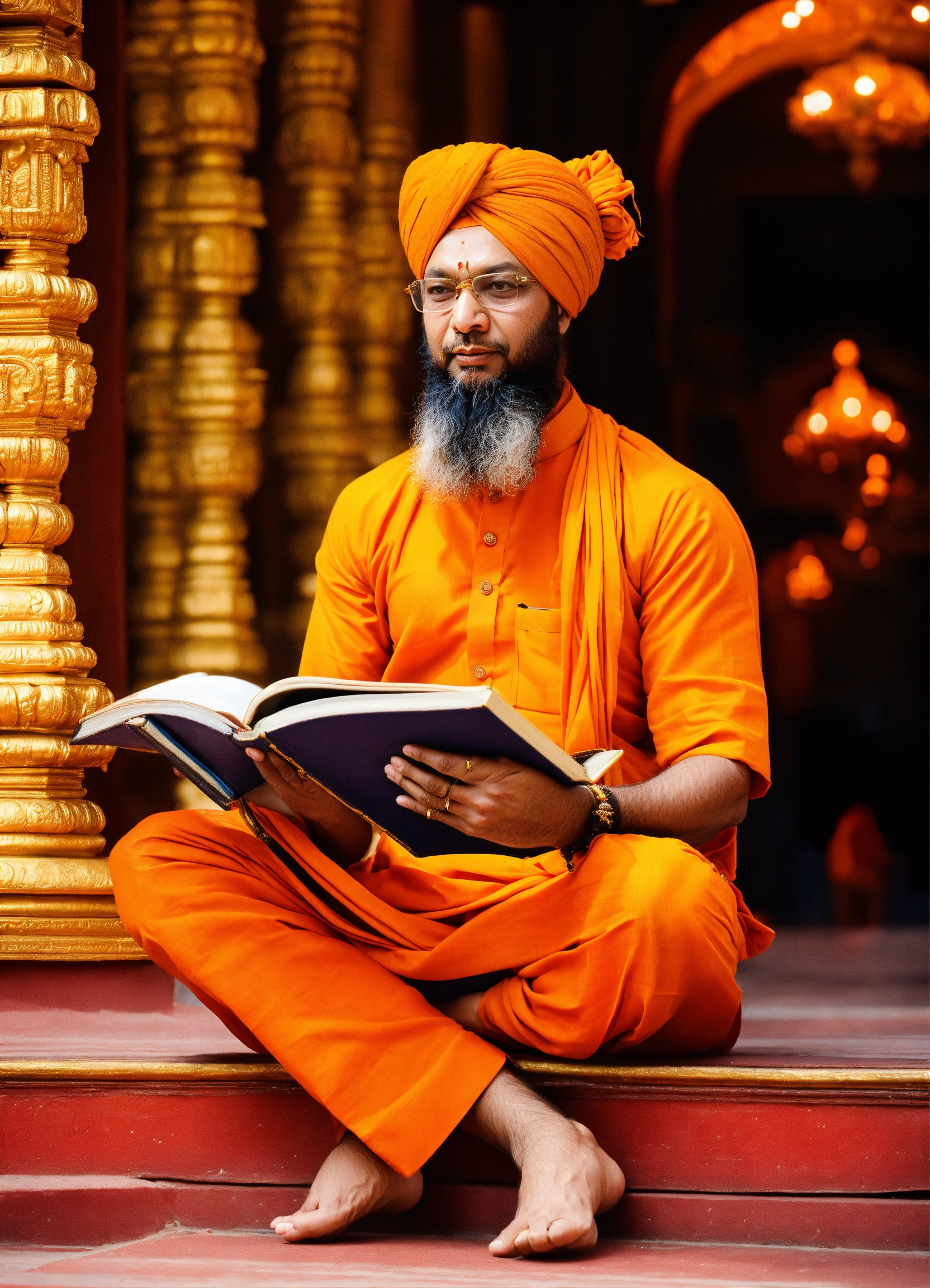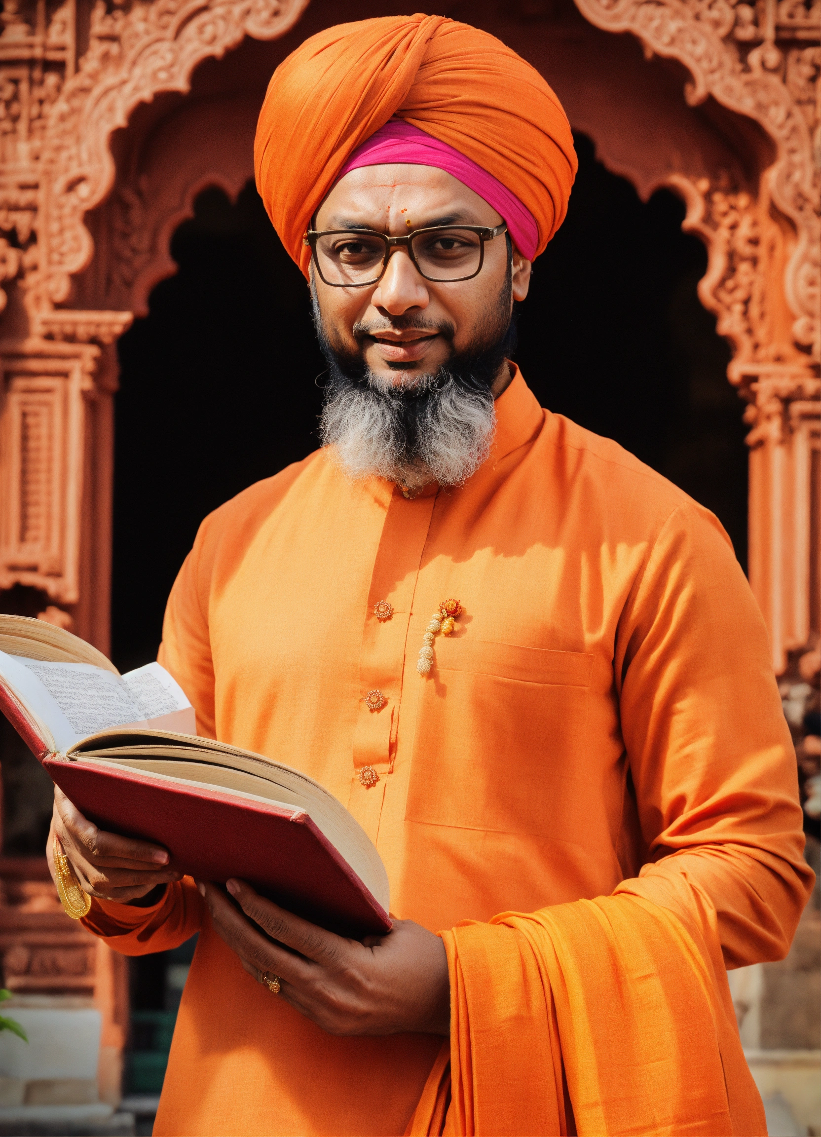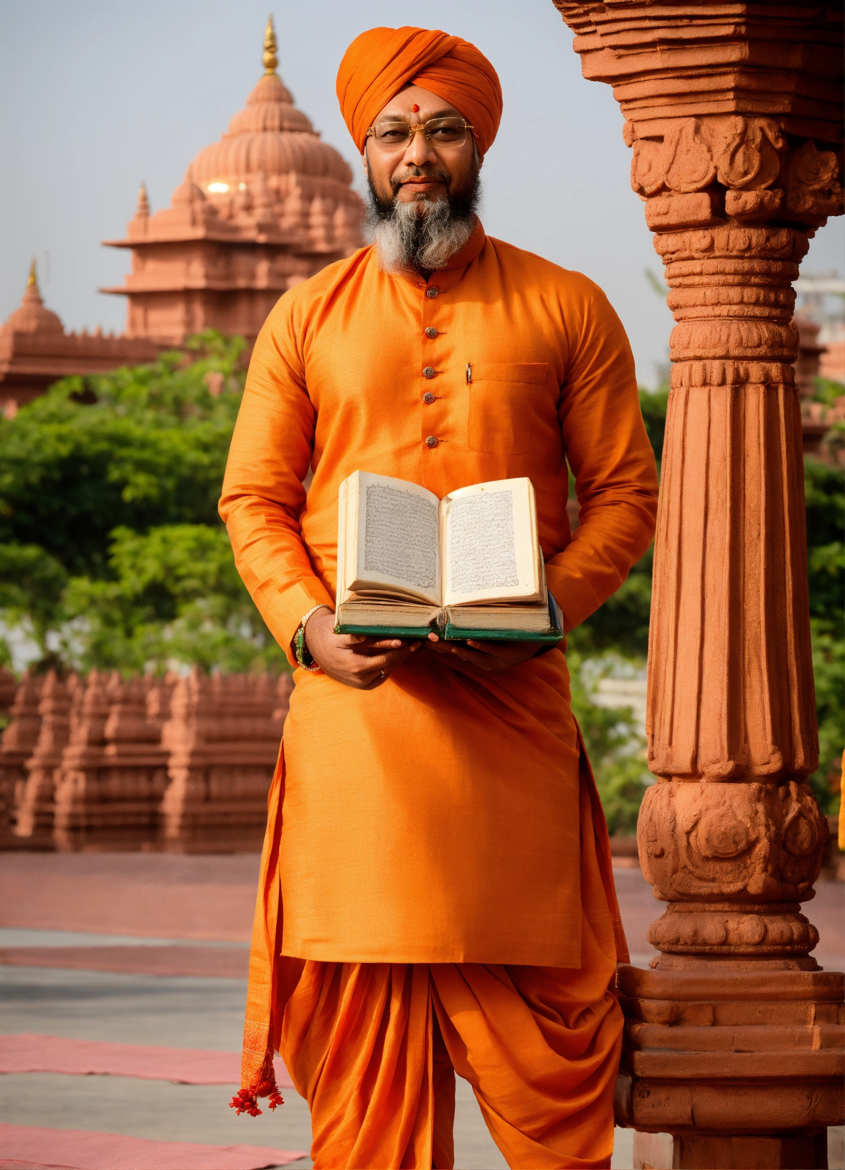 Asaduddin owaisi wearing a punjabi turban and hindu tilak on head, wearing orange dhoti and orange chola and janeu, carrying large book of ramayan in left hand, and rudraksh mala in right hand, hindu temple in background