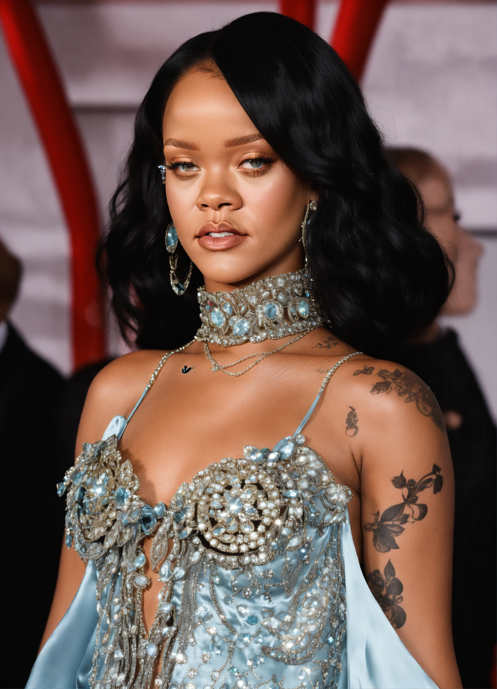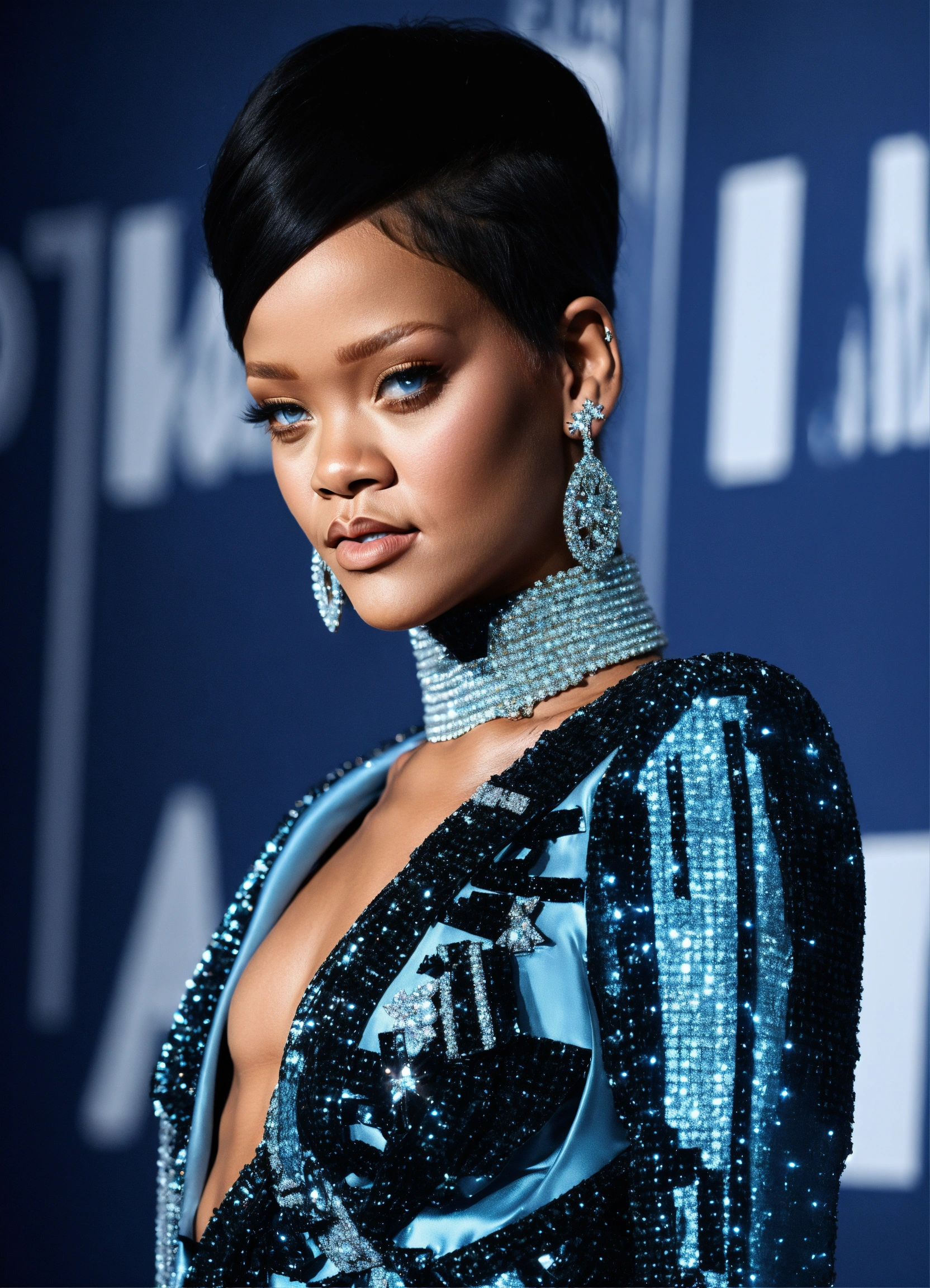 Rihanna glamorous sparkly diamond studded black and light blue silk full outfit
