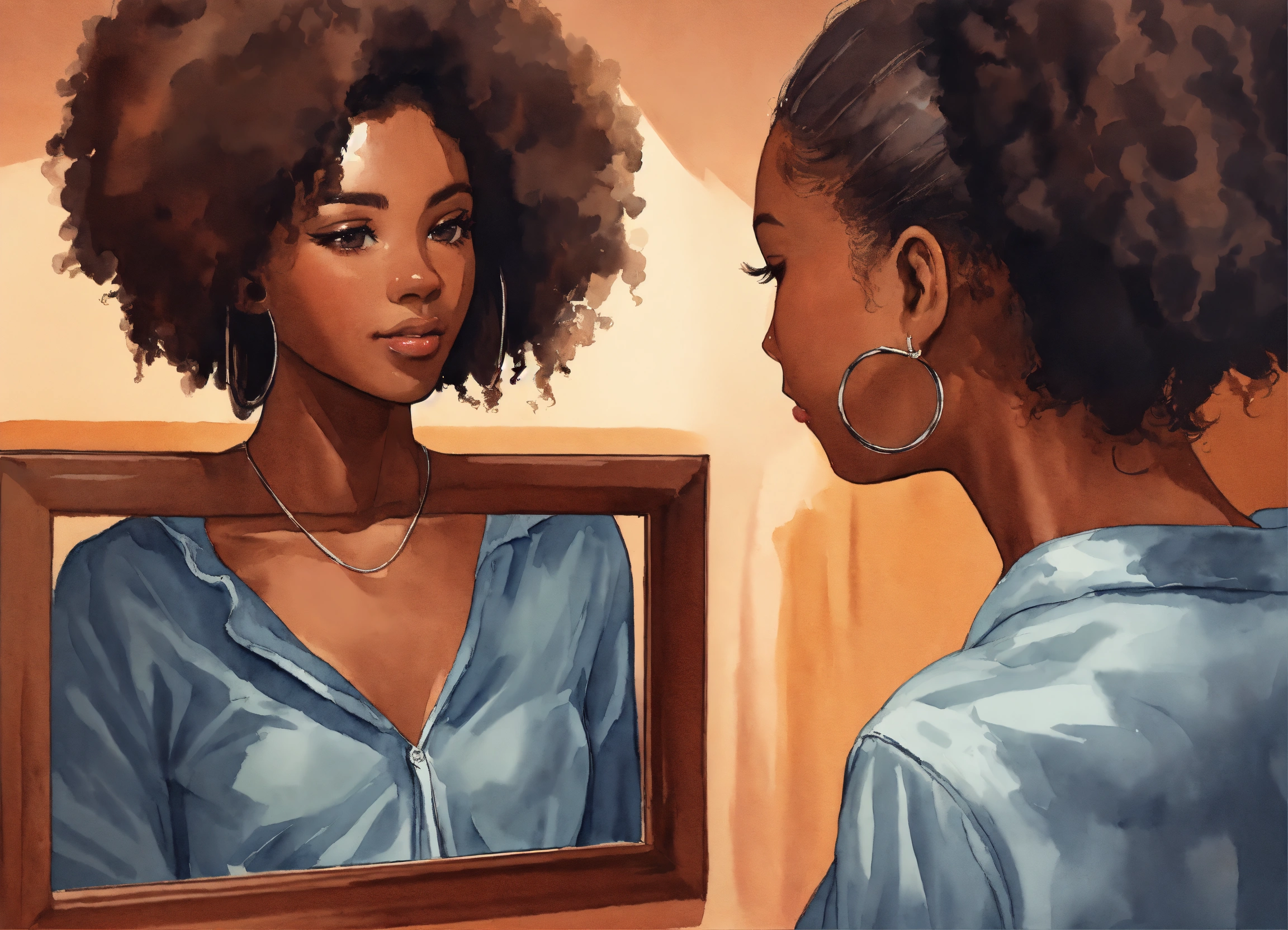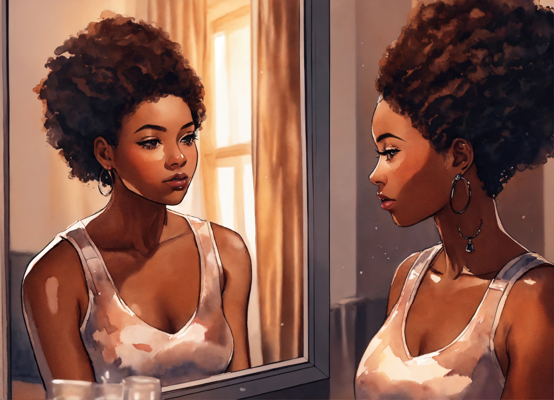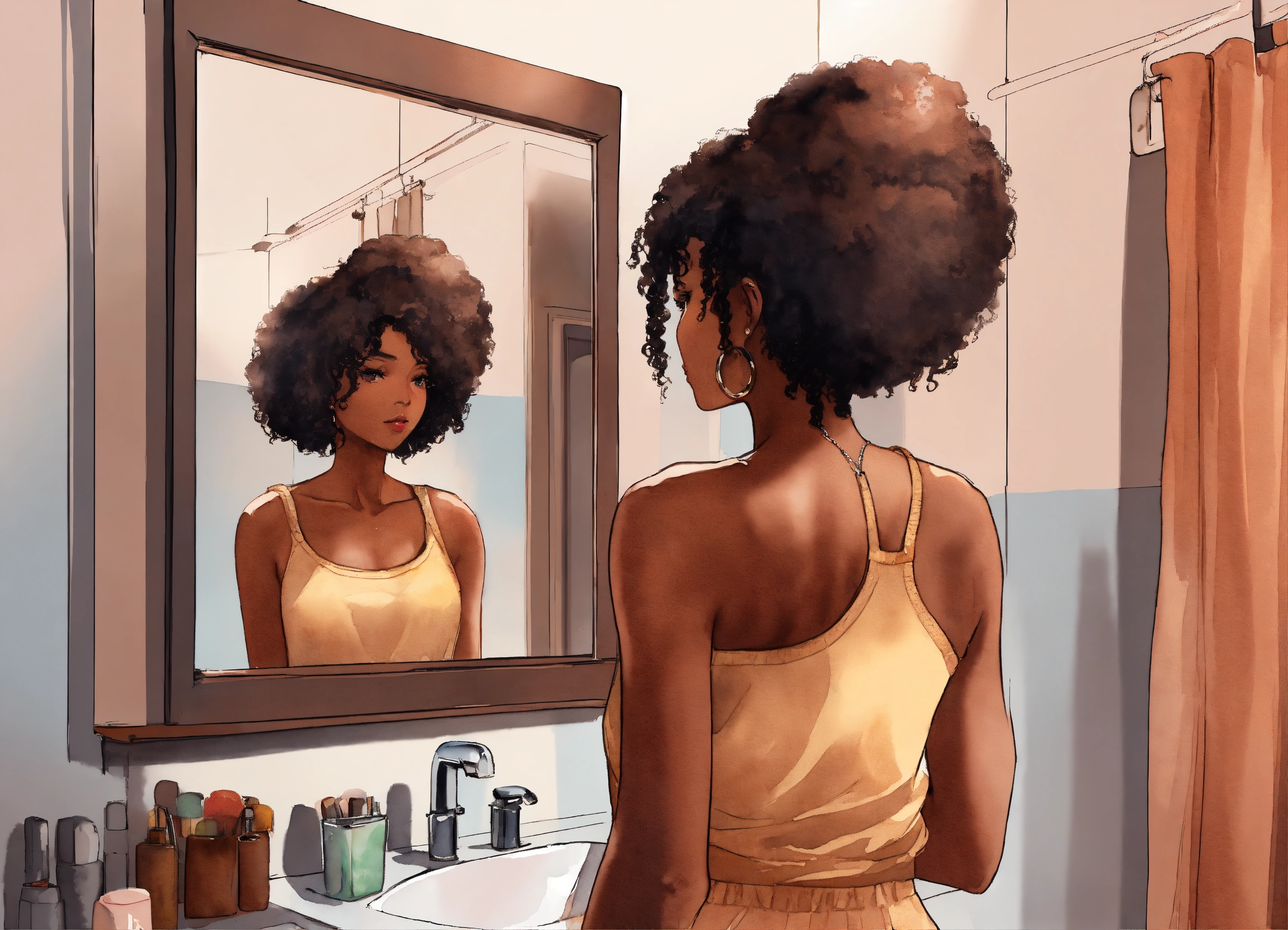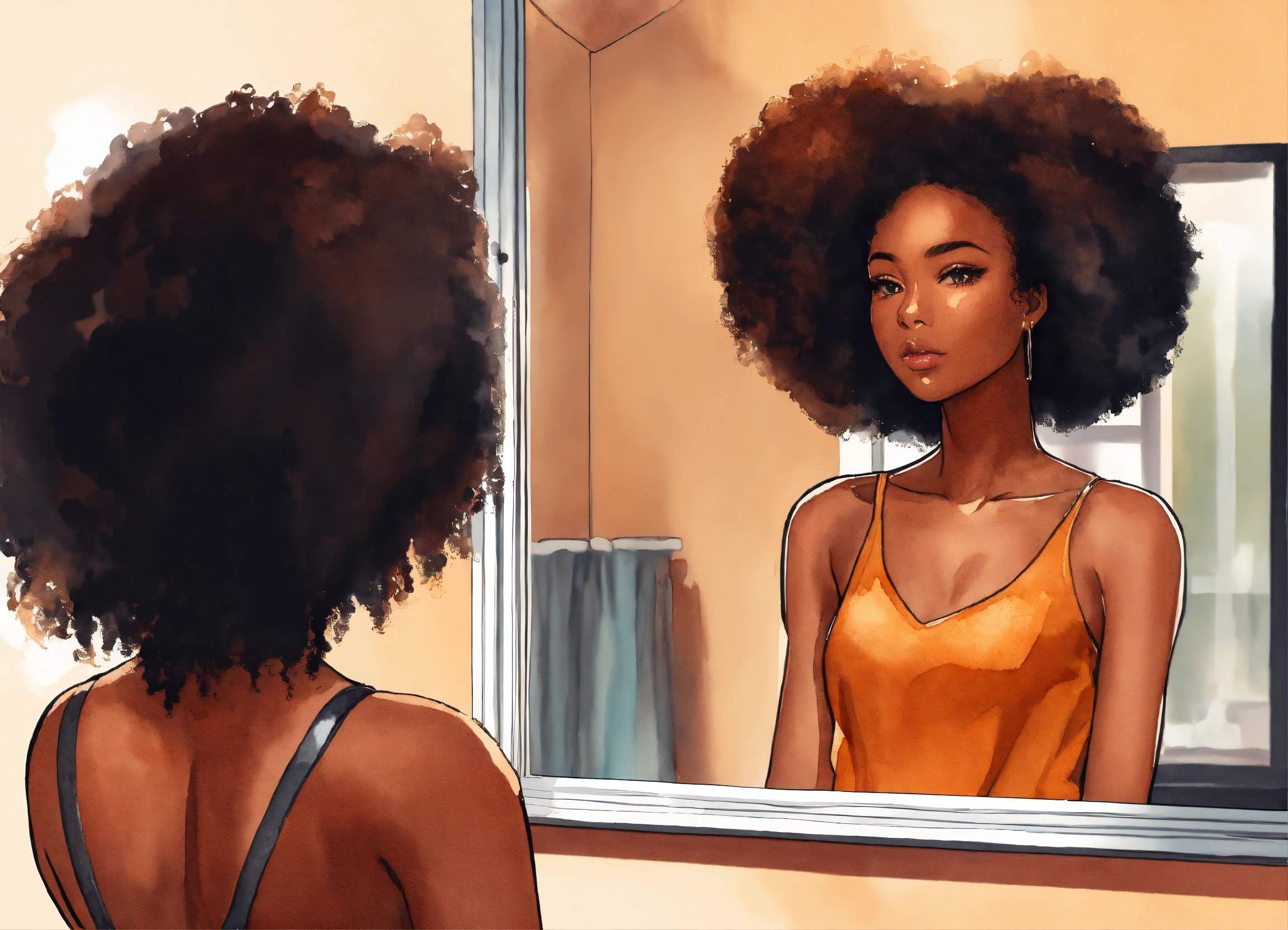 A realistic watercolor painting, 5d, flat vector faceless illustration, extreme close, urban brown skin woman, staring at herself in the mirror admiring her kinky coily hair. mirror reflection. manga. black character.