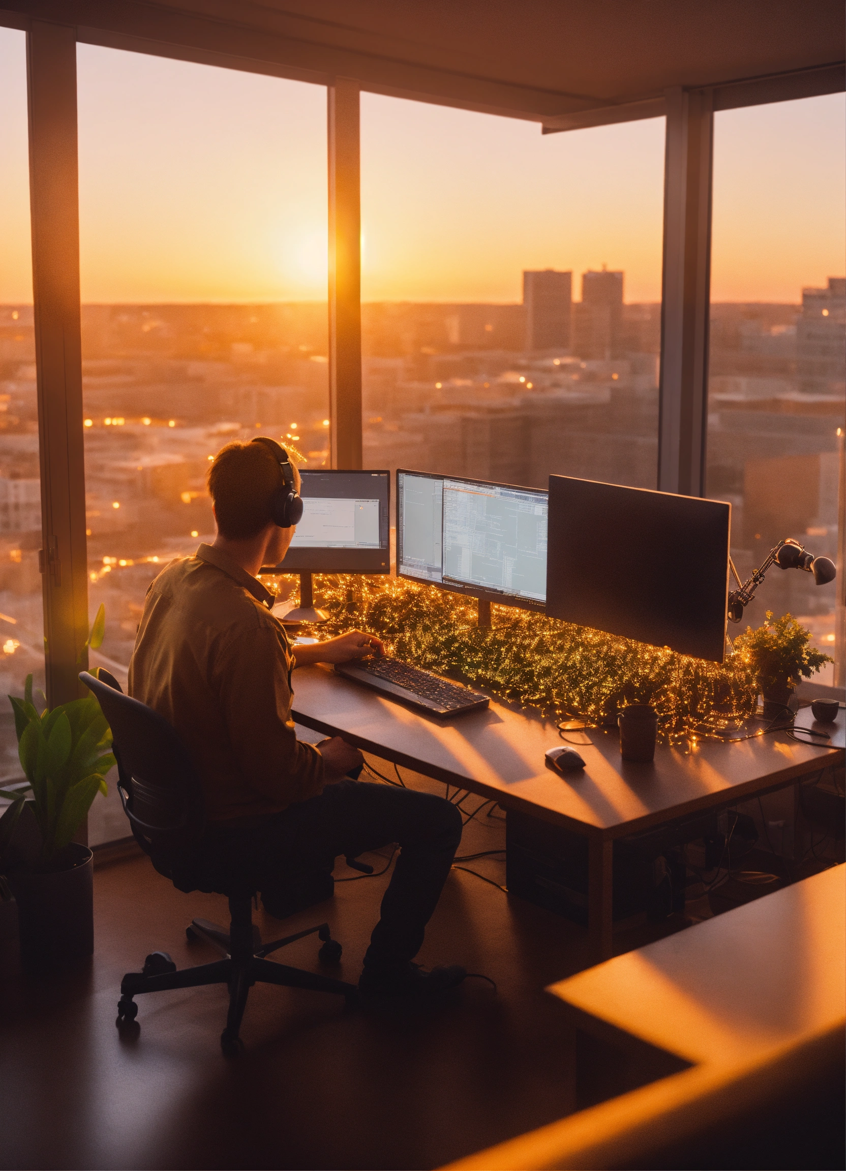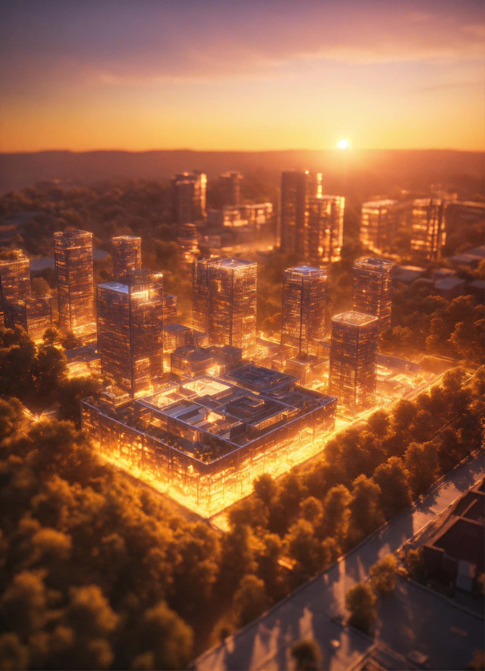 Ultra realistic bright photo of developers working on a a very high tech 3d software code structure lit with bright golden hour light