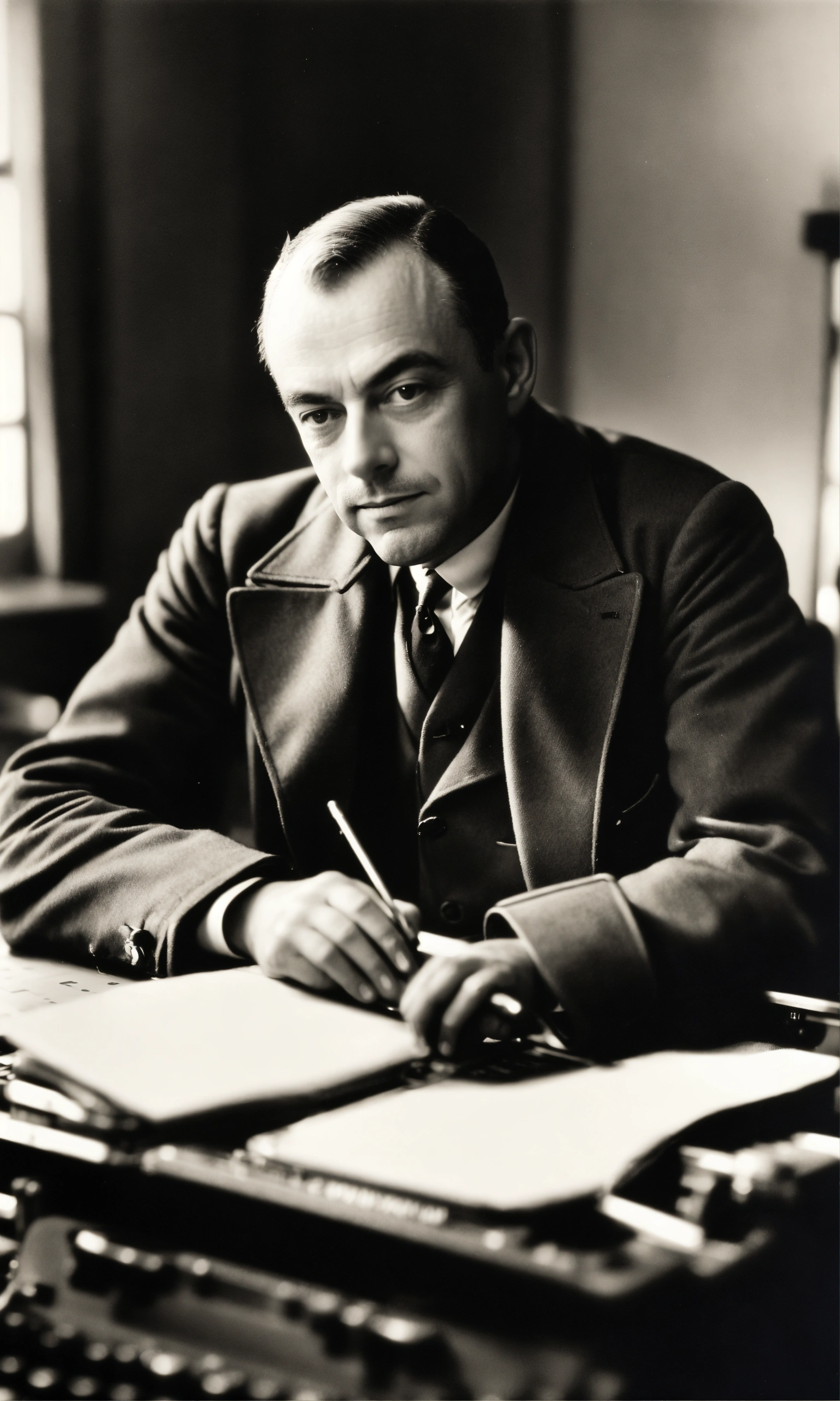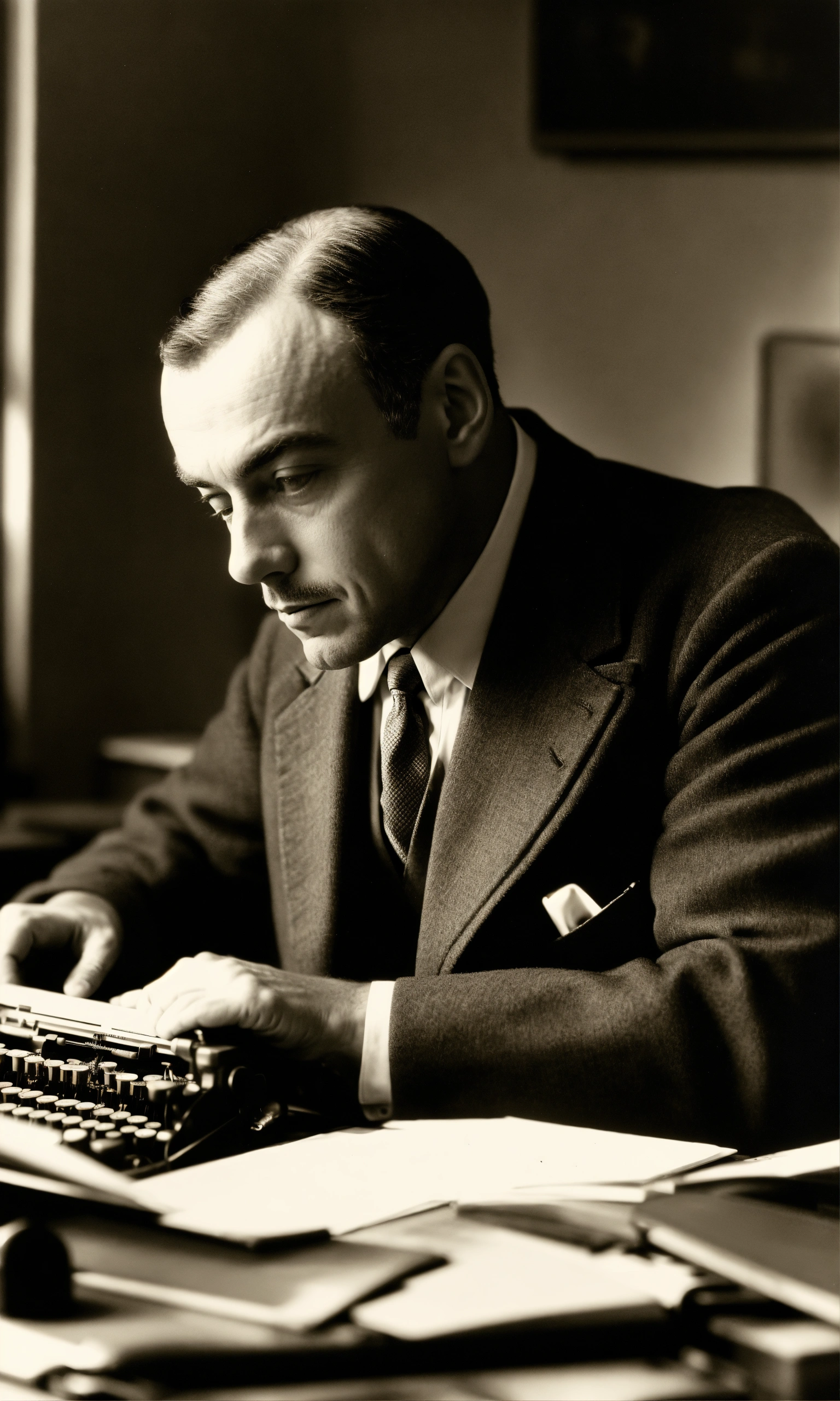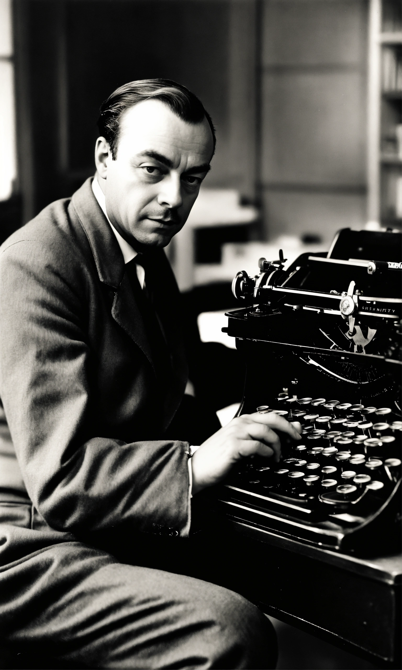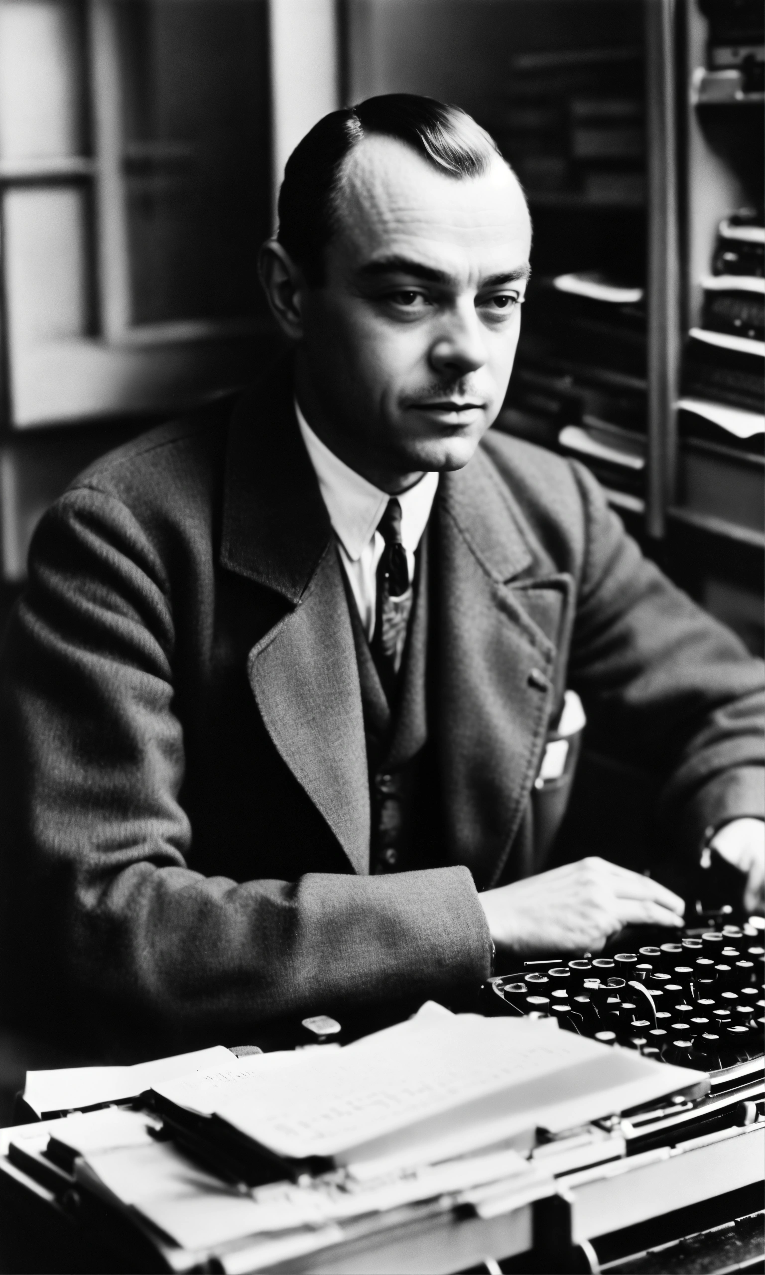 The image captures antoine de saint-exupéry in a timeless moment. he is portrayed in a classic black and white photograph, sitting at a desk with a vintage typewriter.