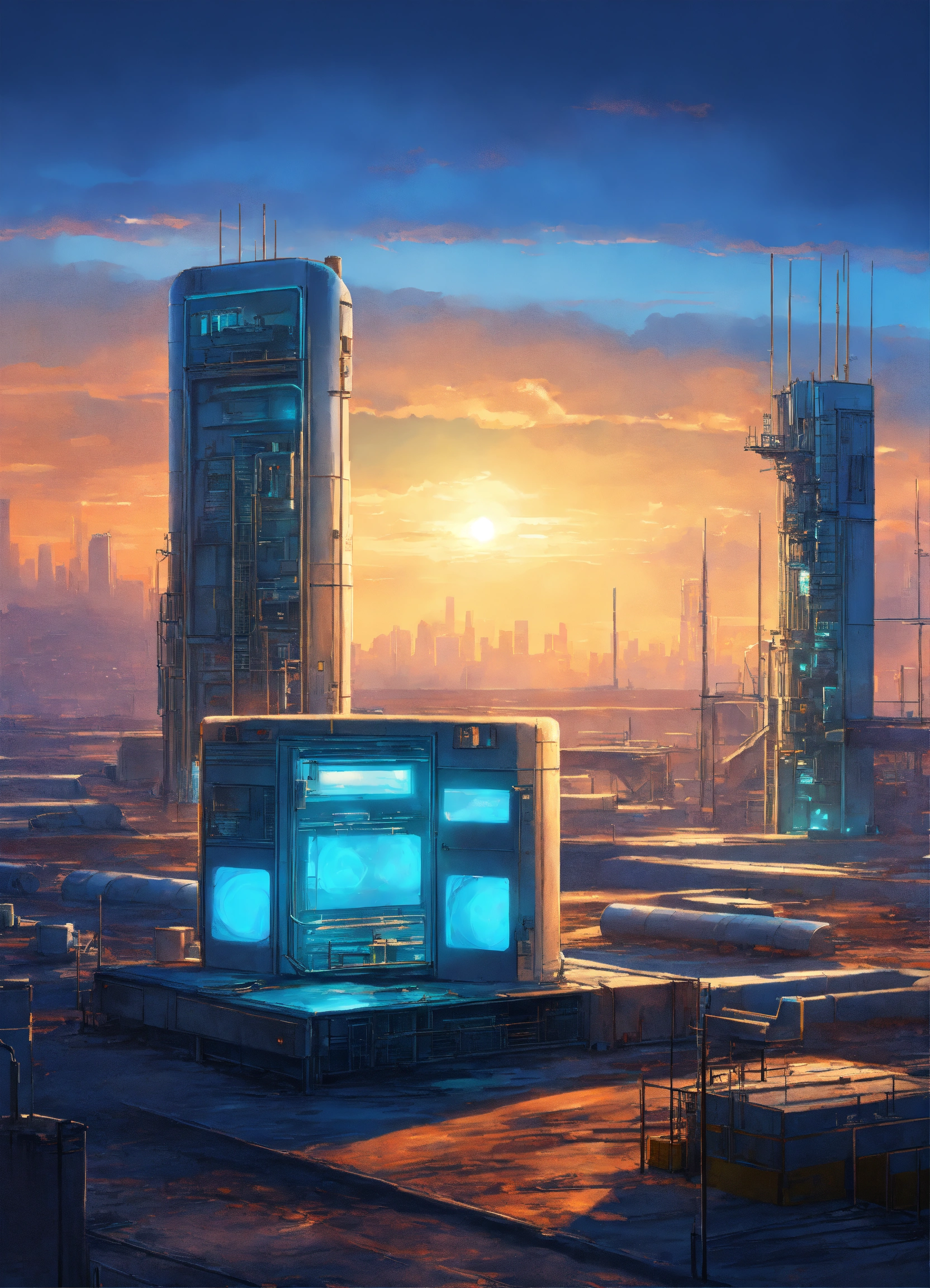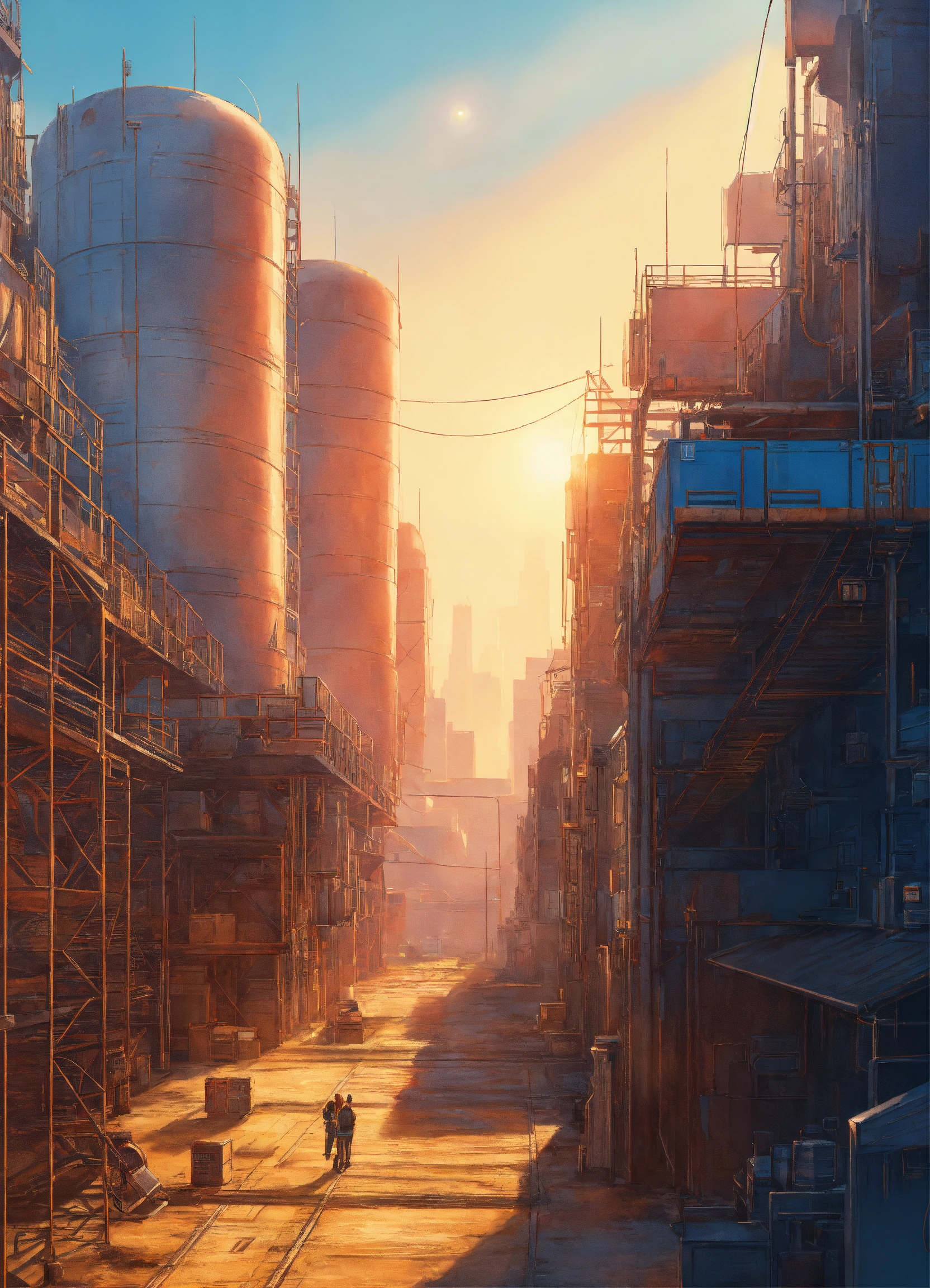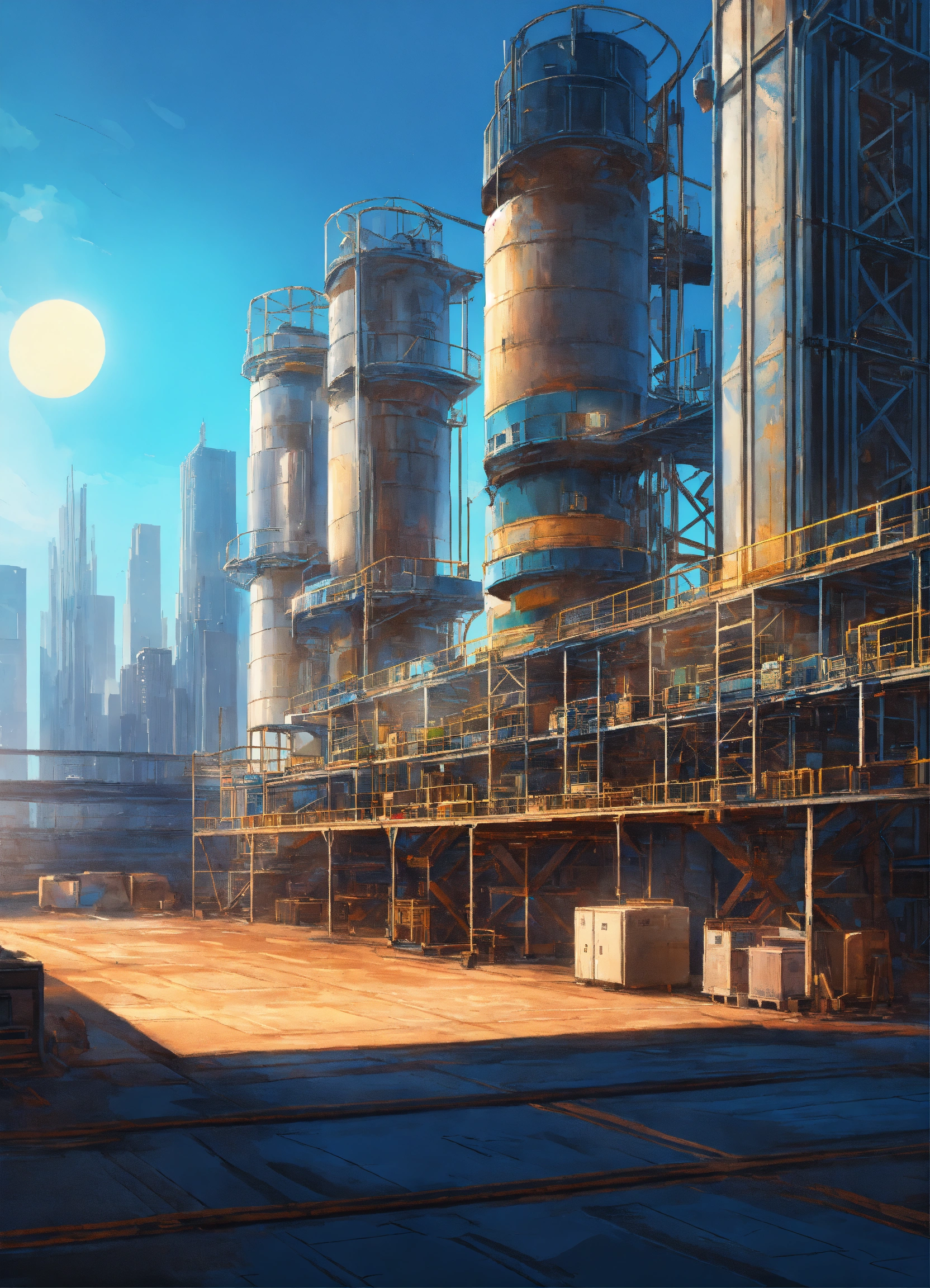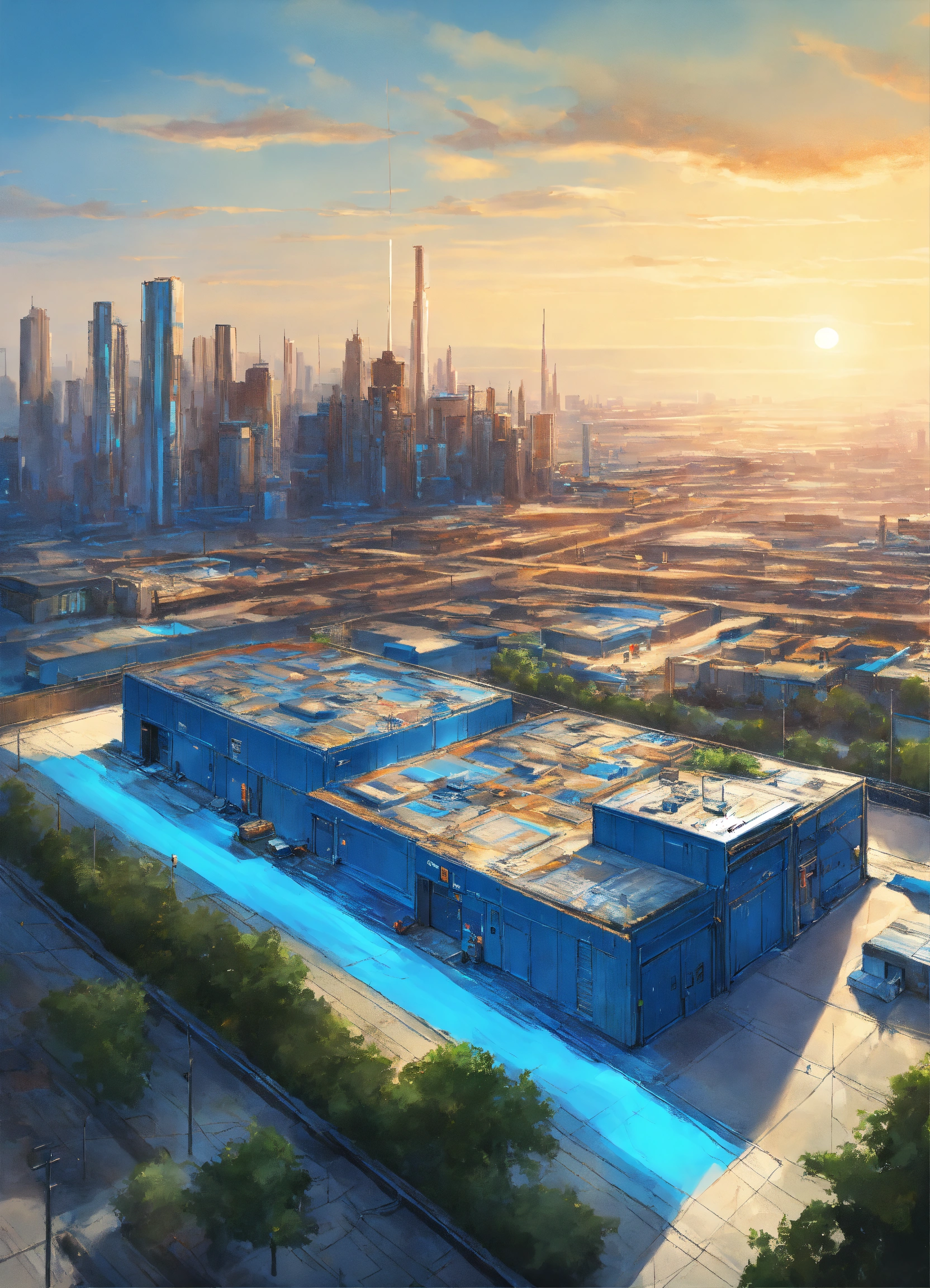 Deserted hi-tech storage facilities, bright blue sun high above, the city in the background far far away, artsation digital painting, high detail, digital painting, high resolution 8k, realistic style