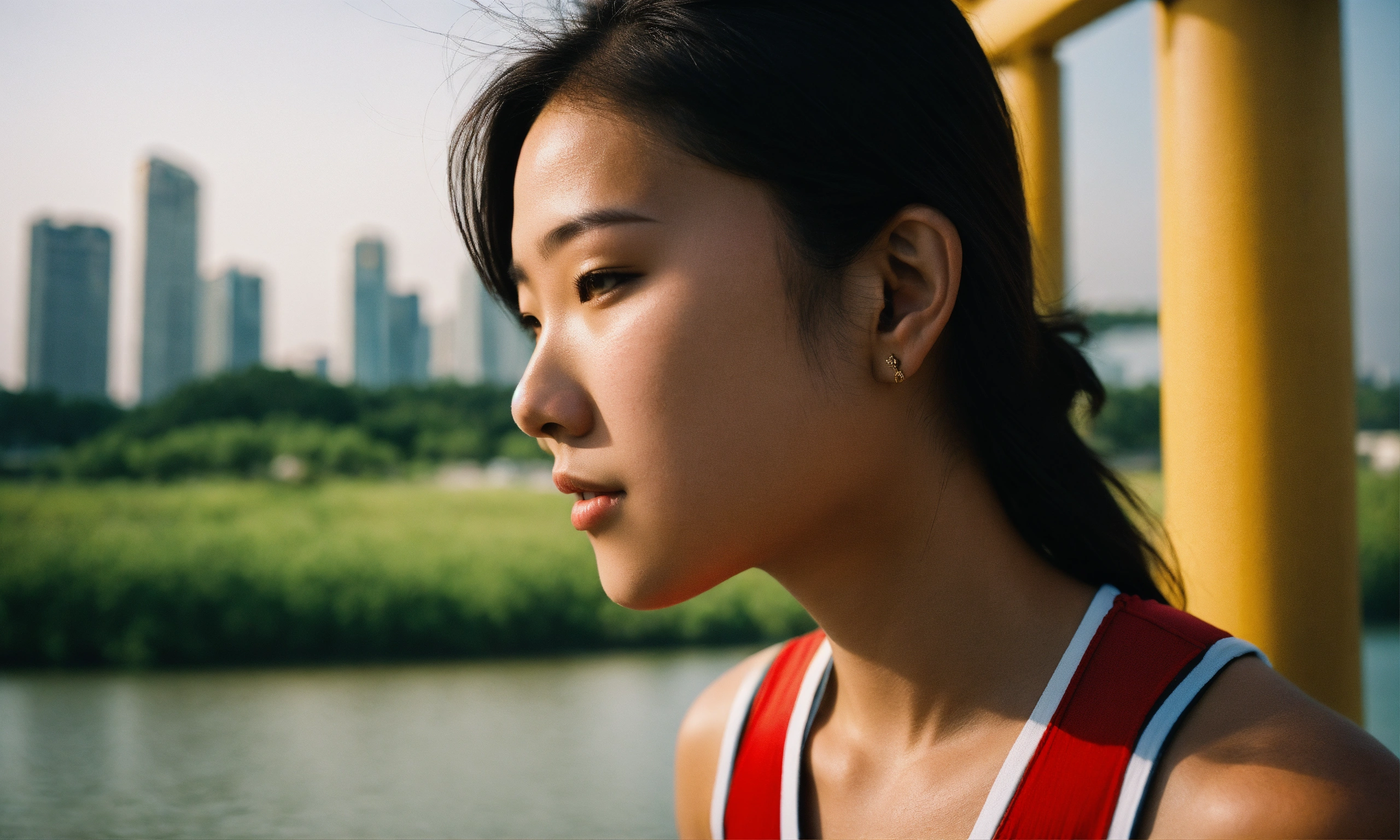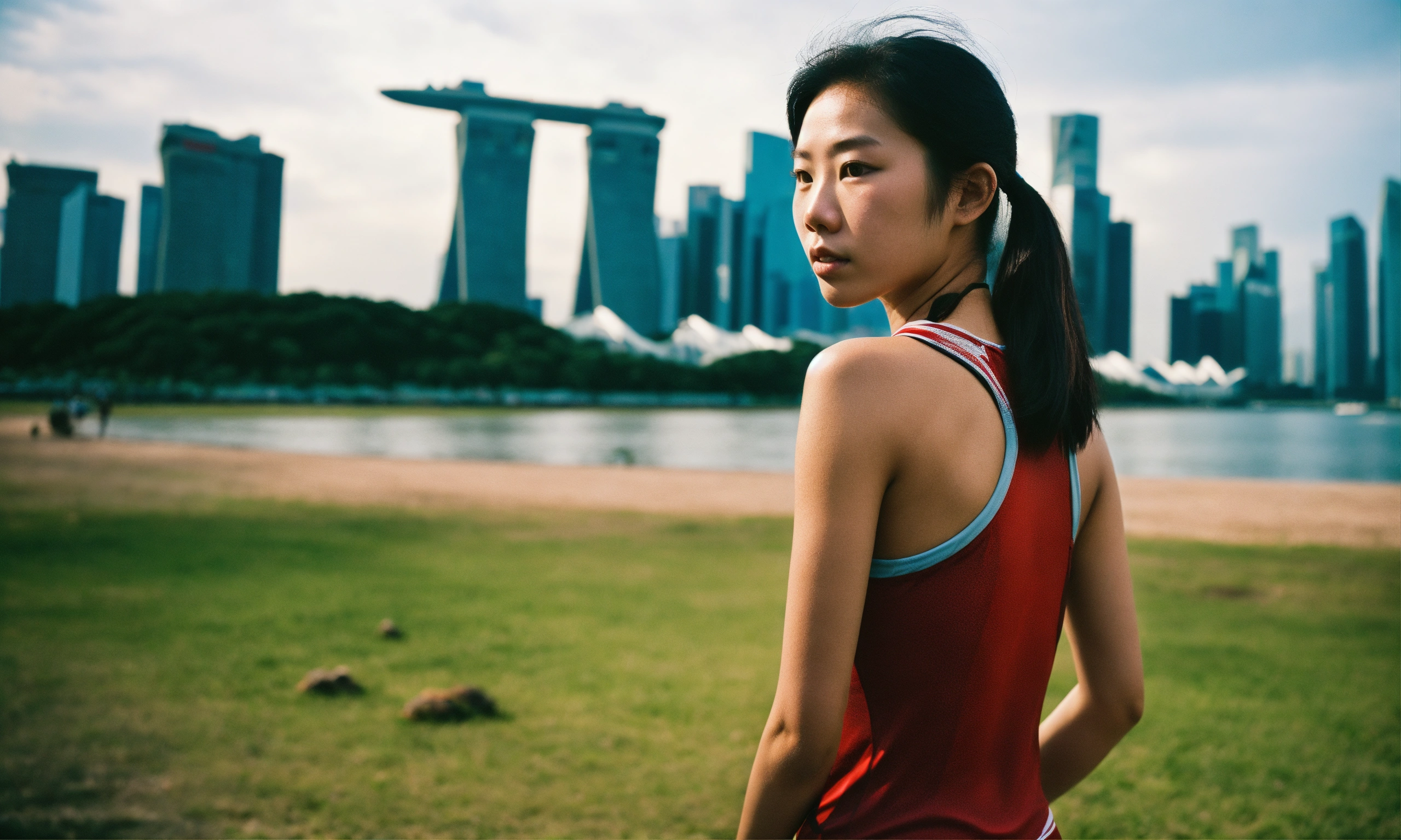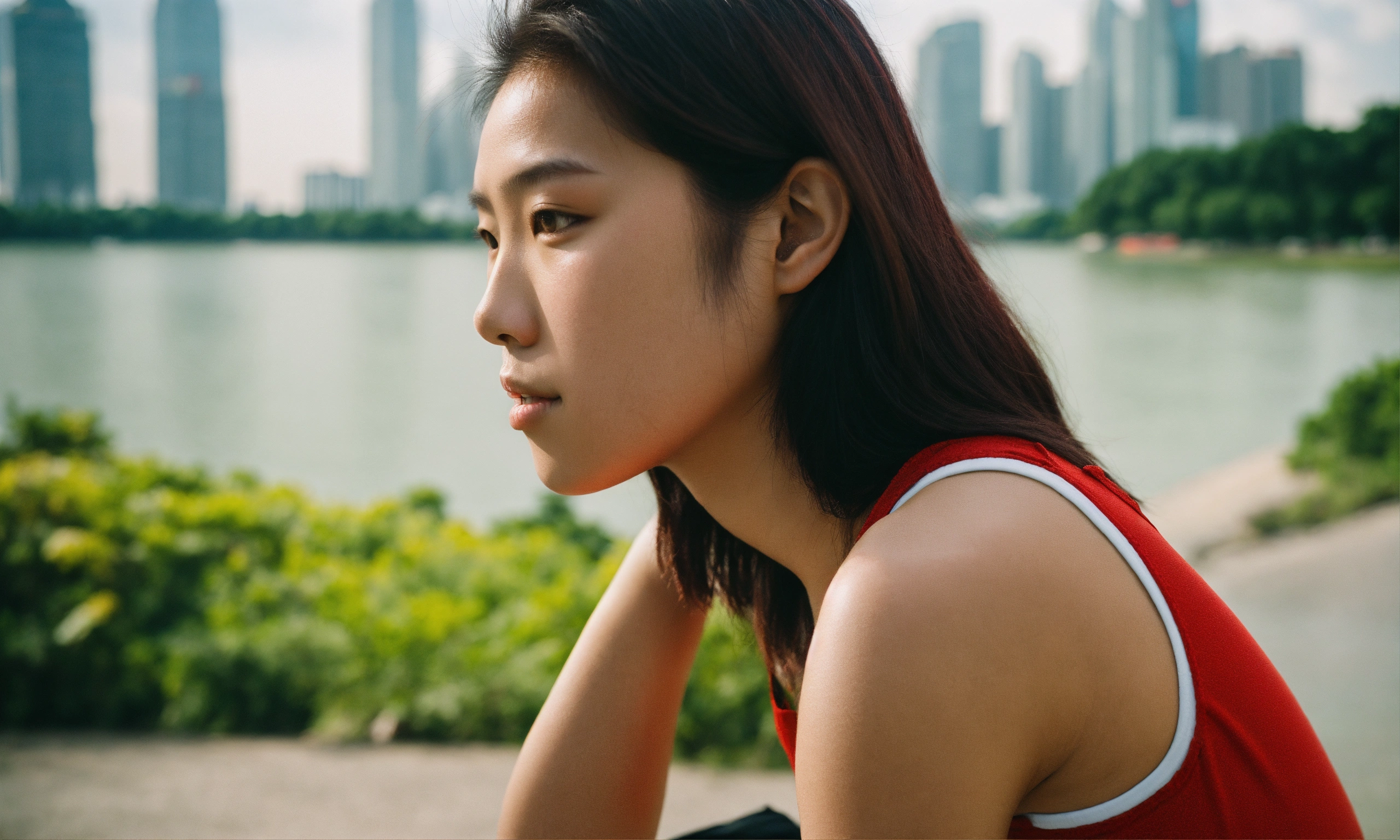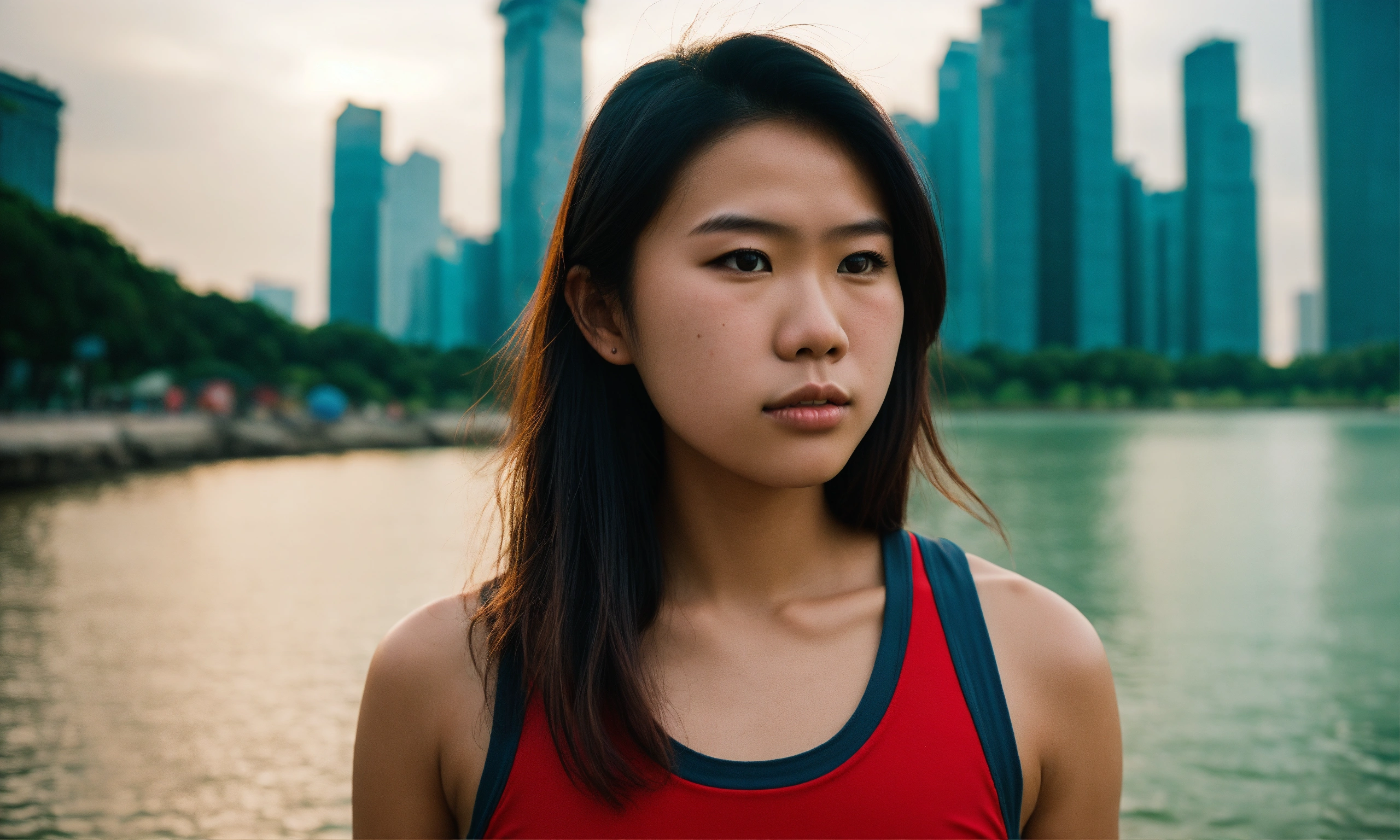 Sunny day, mid-day lighting, close-up side shot, slightly tanned face, athletic 18-year-old asian girl, singapore's east coast park, talking, dissapointed, looking towards towards city scape beyond the edge of the water, wearing a plain red singlet, captured using leica summicron 35mm f2.0 lens, intricate details of expression, shot with kodak portra 400 film, cinematic richness.