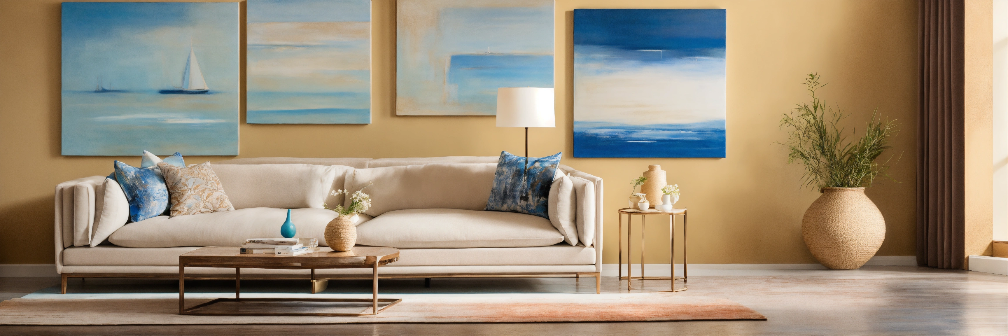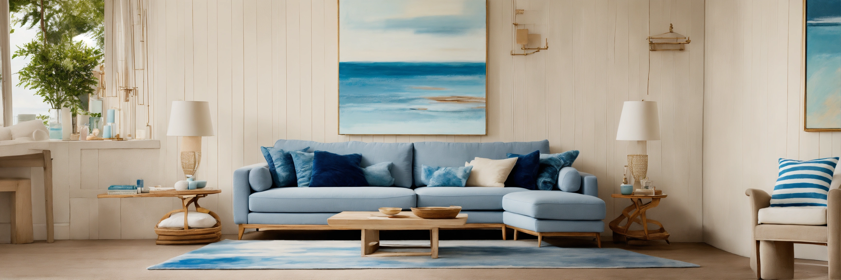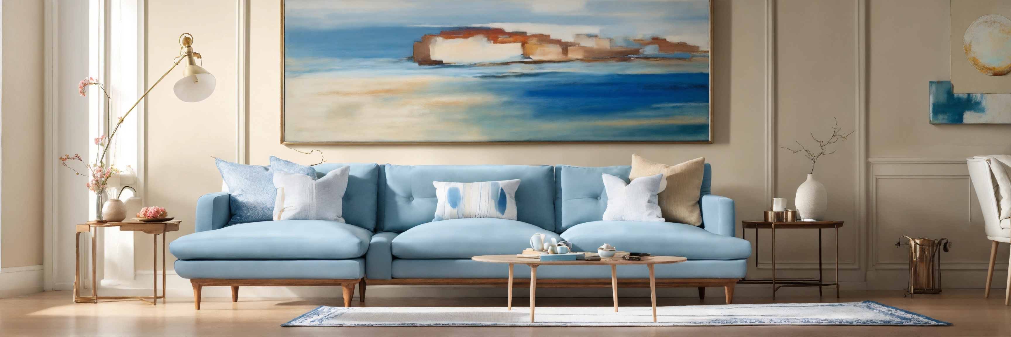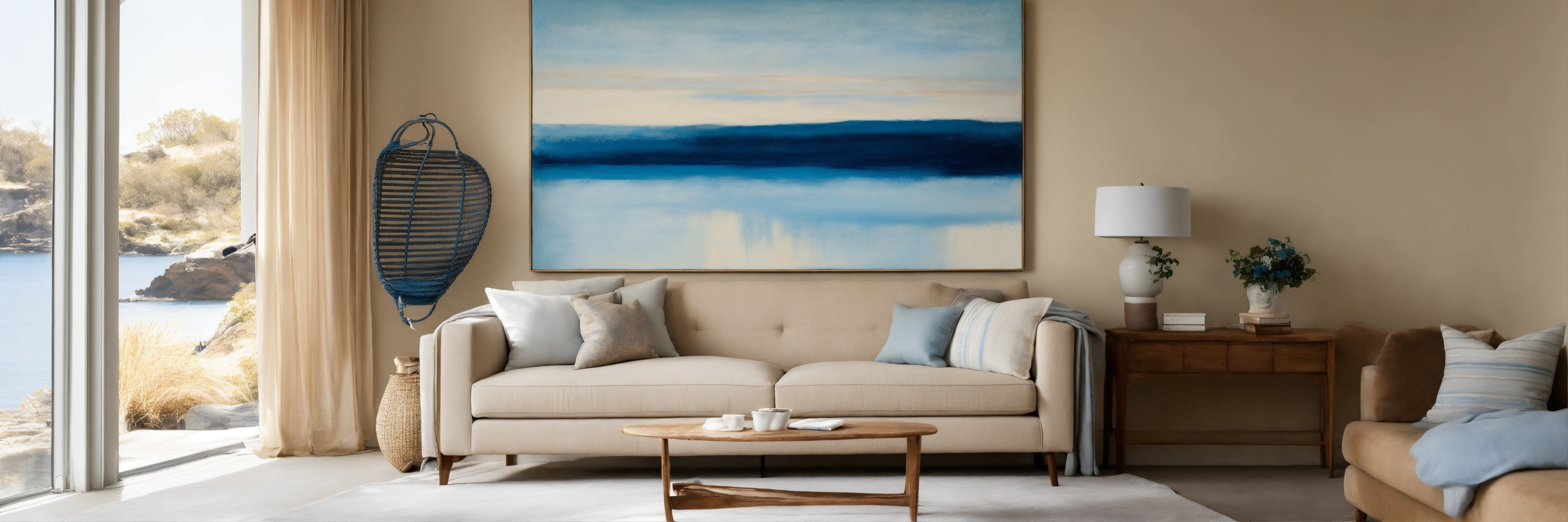 Abstract pastel blue and white painting on empty white wall behind beige couch with maritime pillows
