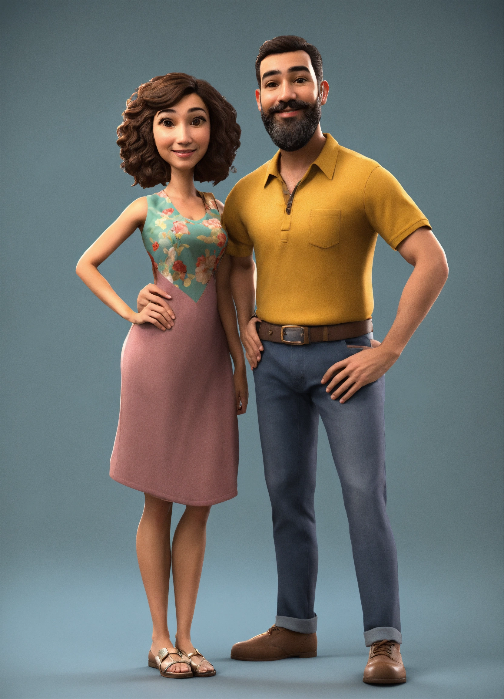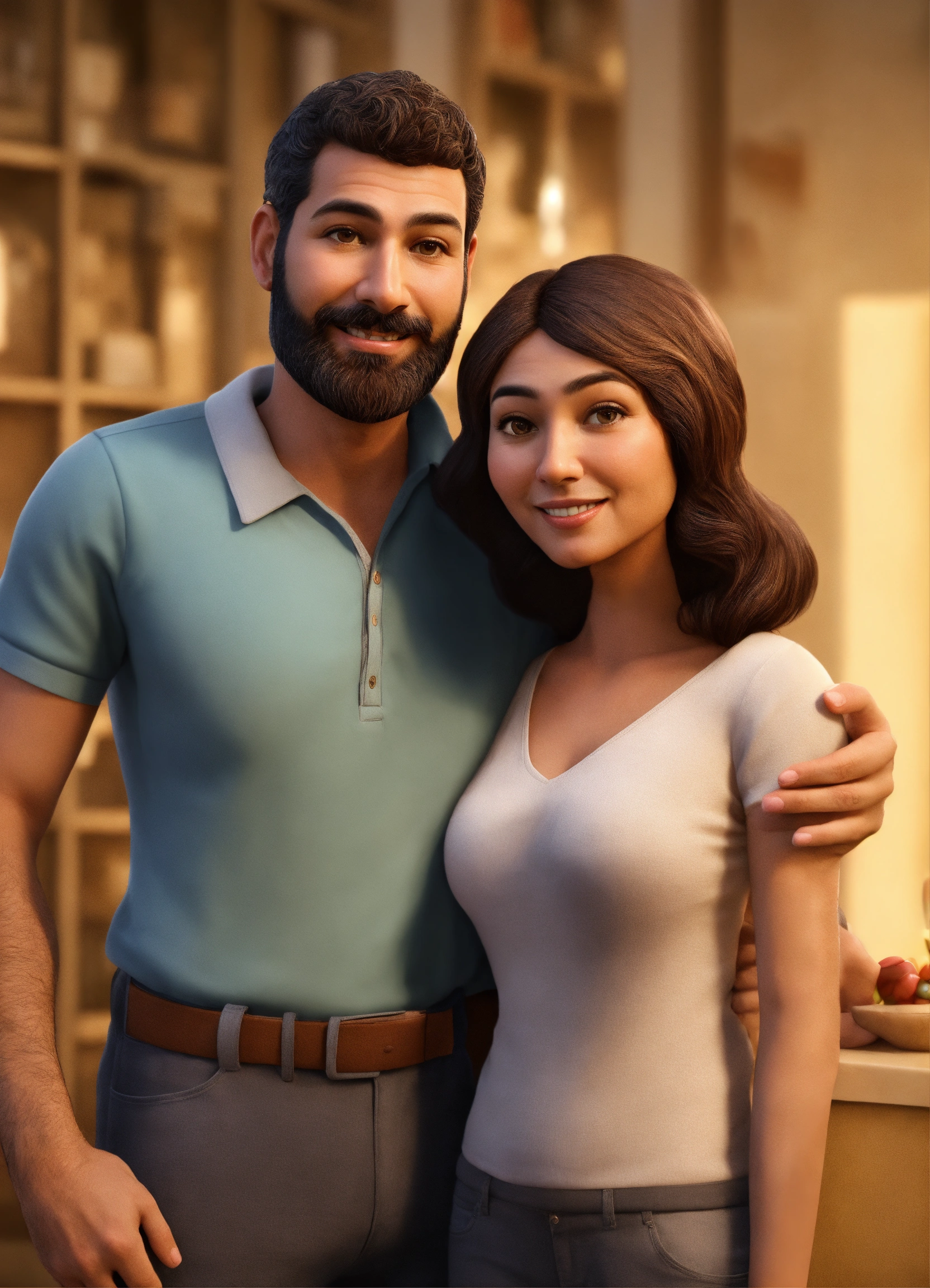 I need a modern mom and dad 3d human realistic in a fun interactive pose standing up full body shot, the dad is modern and egyptian with a brown short beard and one arm around his wife, the mom is resting her head on his shoulder in a fun pose, both of them have one hand up waving and inviting you