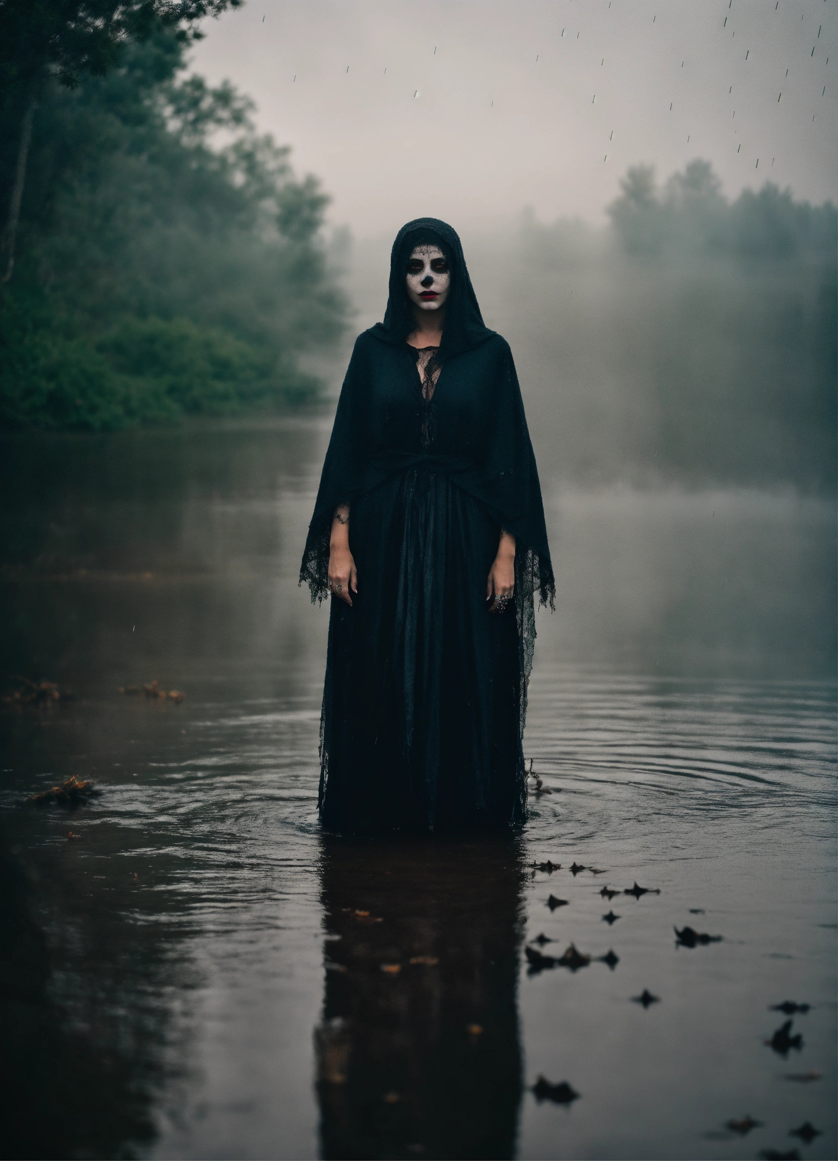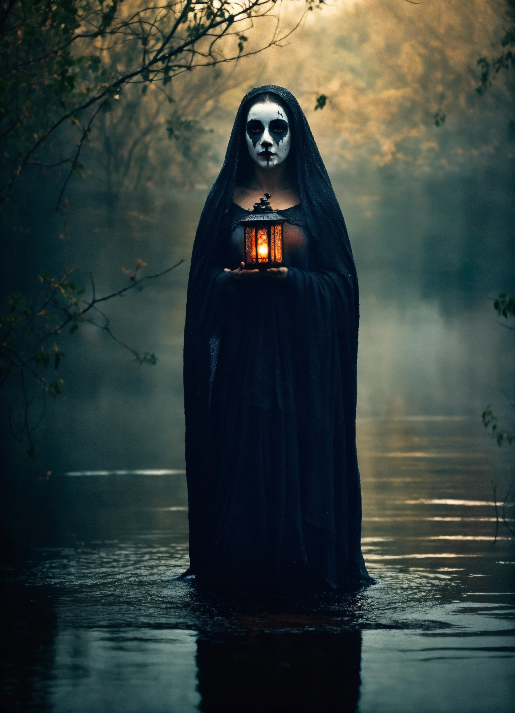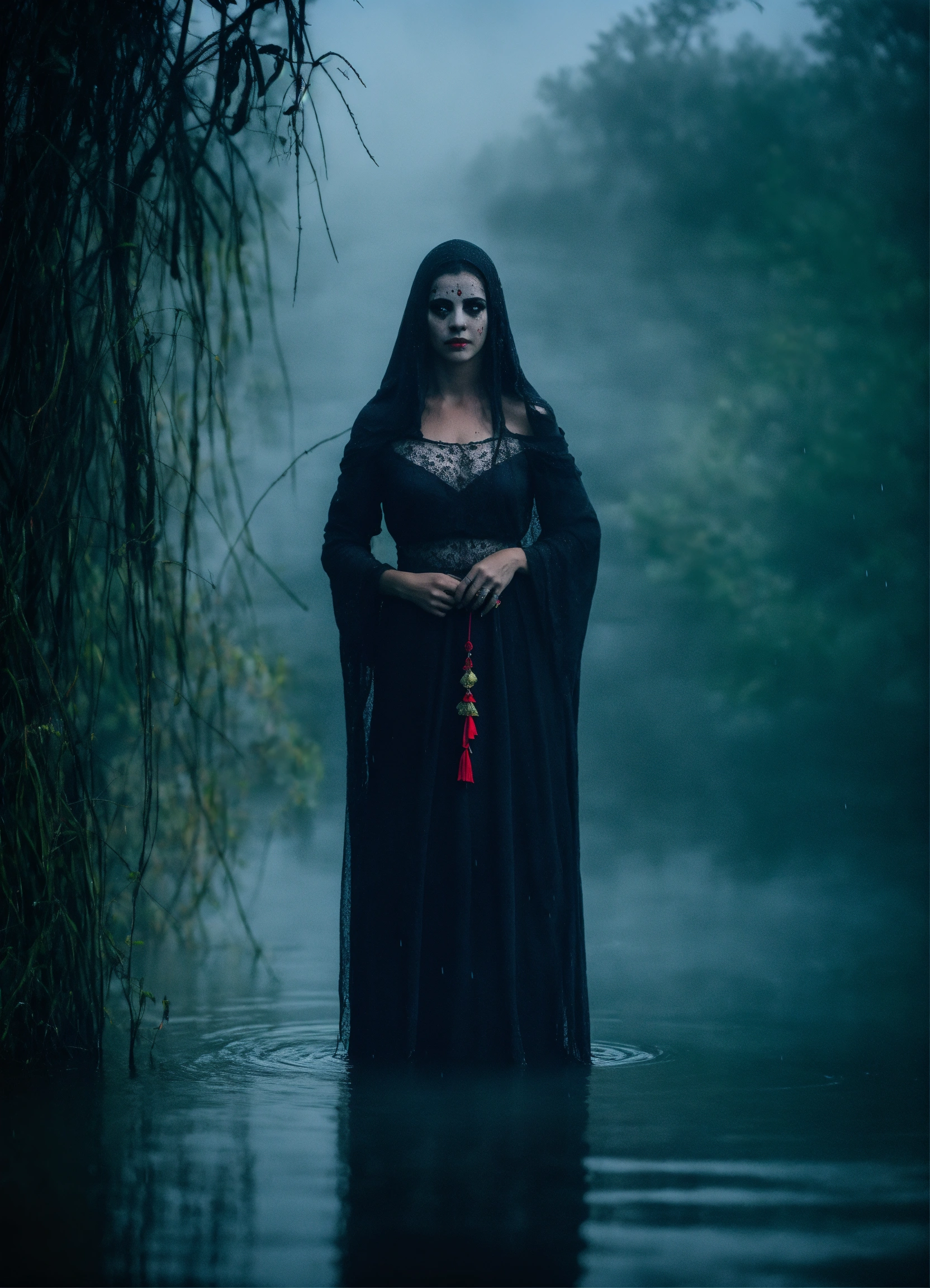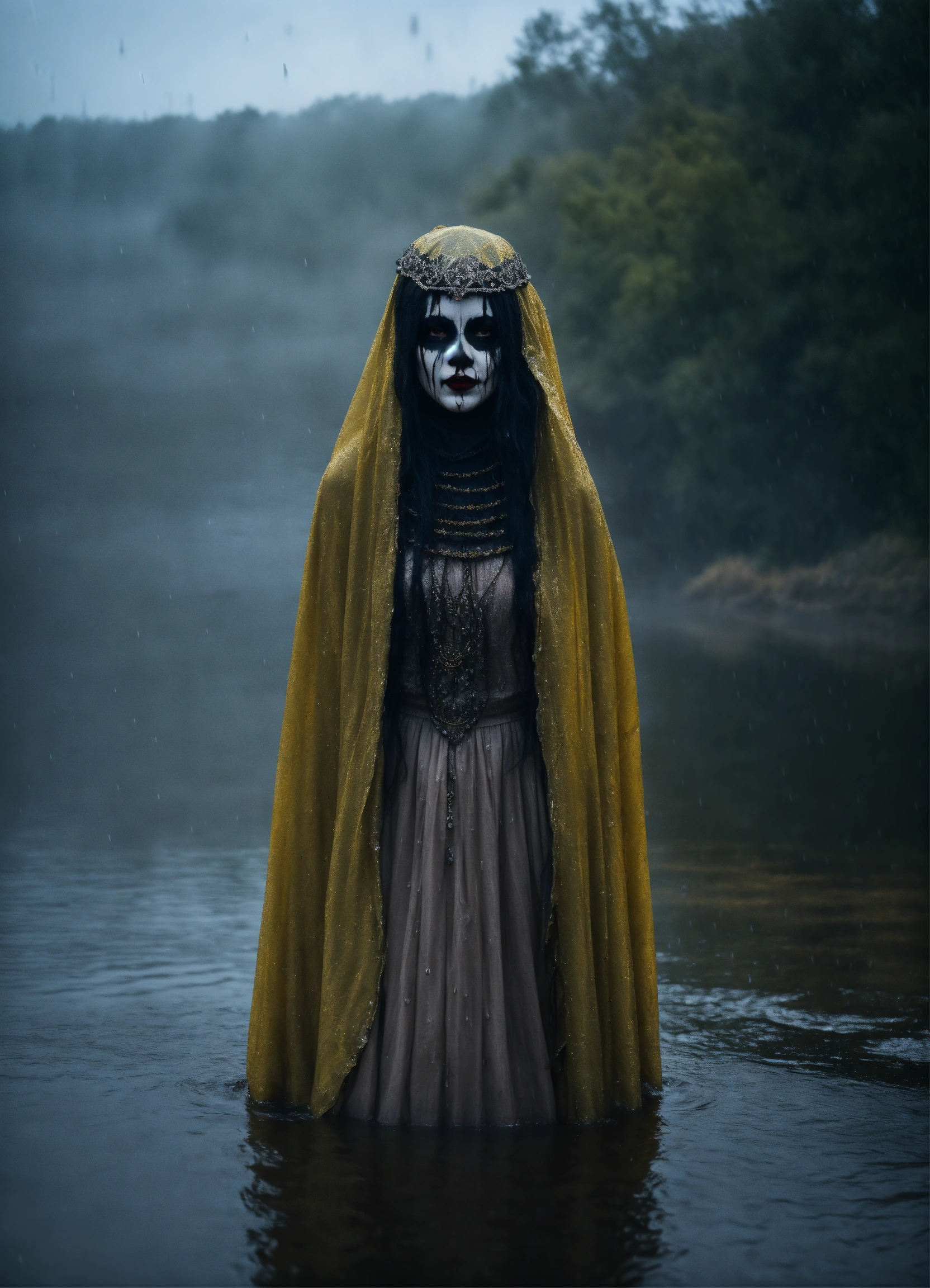 The frightening la yorona with black eyes on her shoulder stands in a dark lake