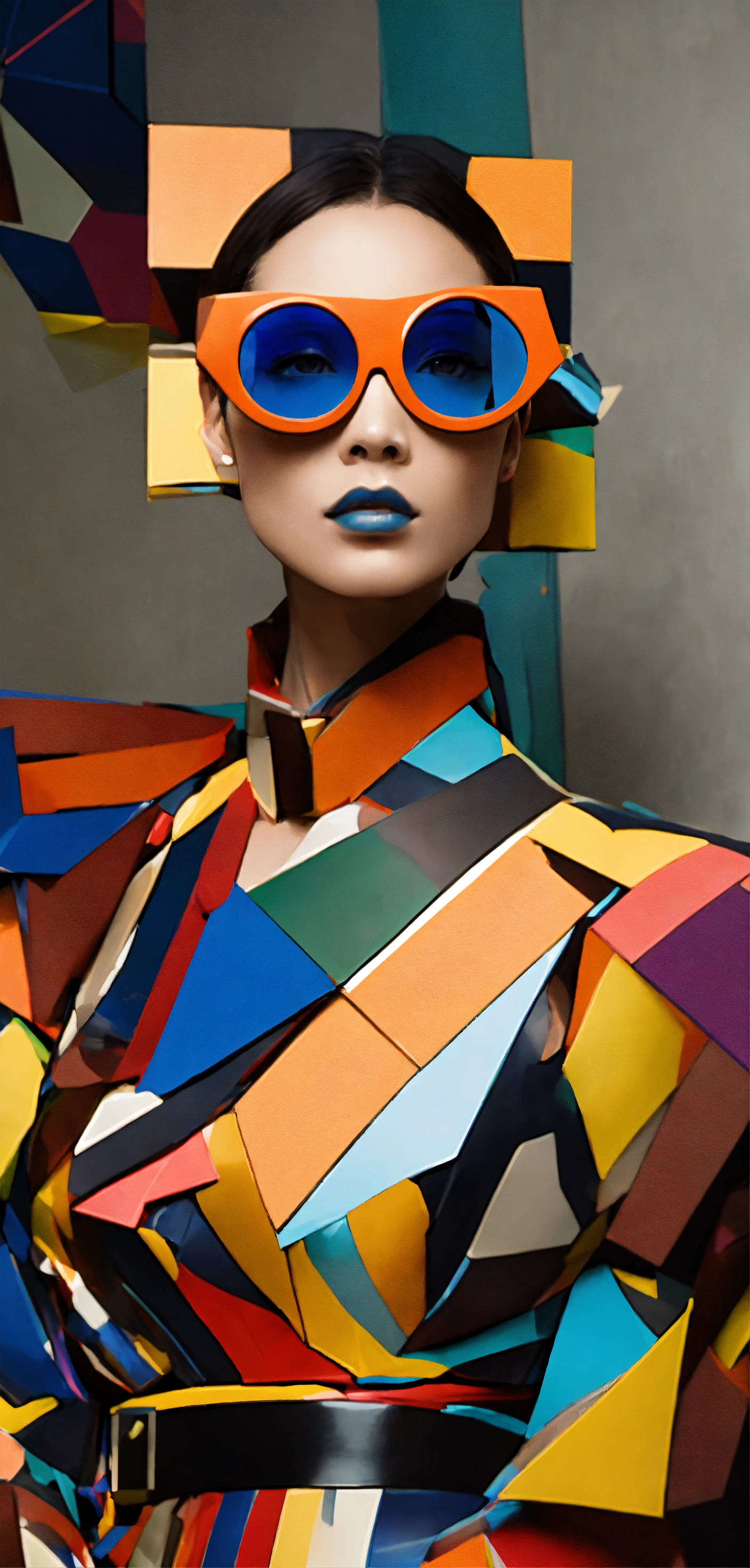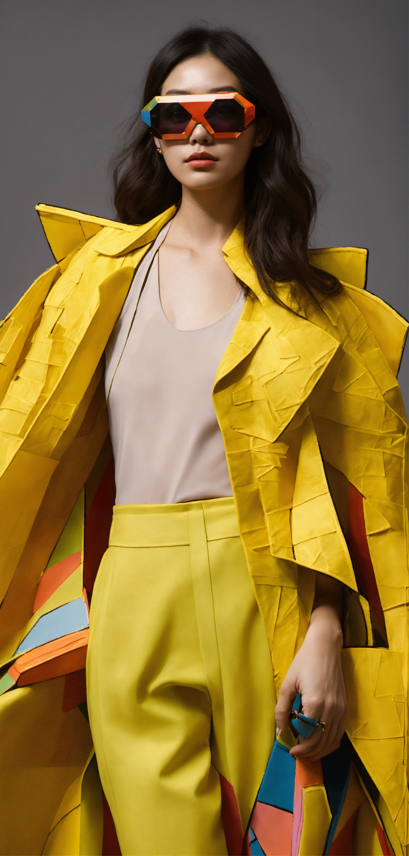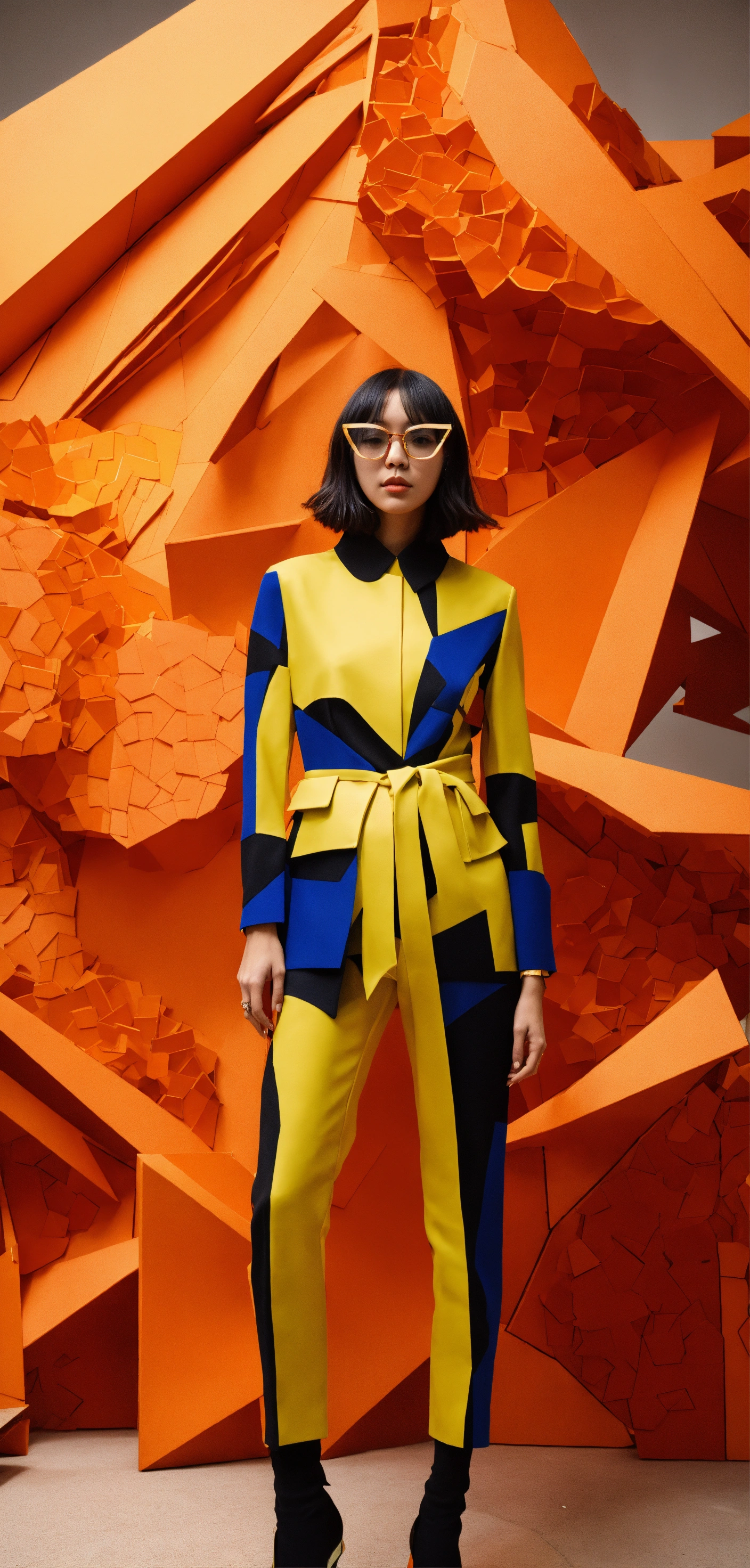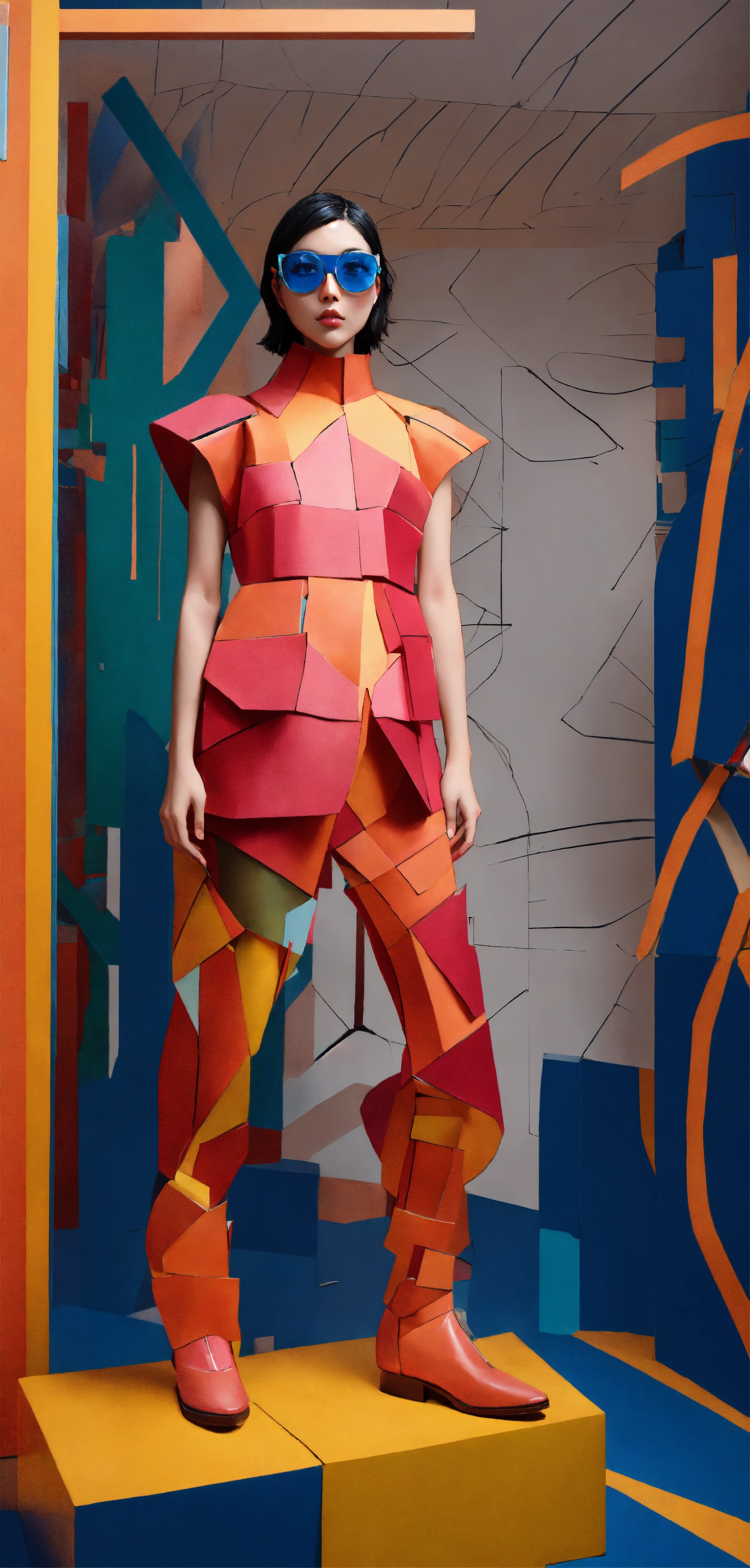 Location an upscale art gallery opening model a south korean abstract expressionist muse, embodying the spirit of innovation. outfit a sculptural wearable art piece, complemented by oversized, geometric glasses. artistic style abstract with bold lines and geometric shapes, reflecting the influence of abstract expressionism in modern art. artistic features interactive, touch-sensitive art installations, inspired by contemporary multimedia art installations.