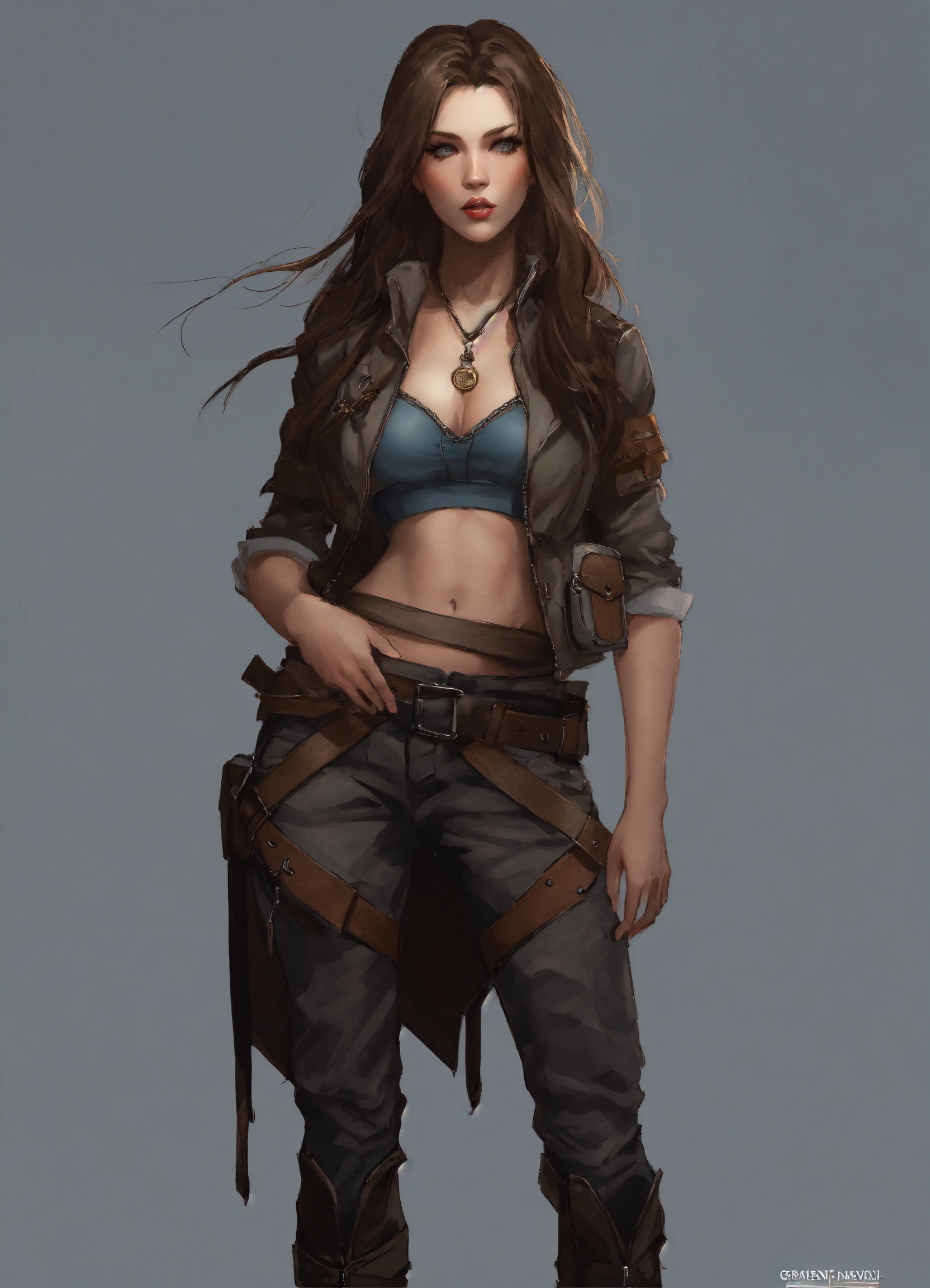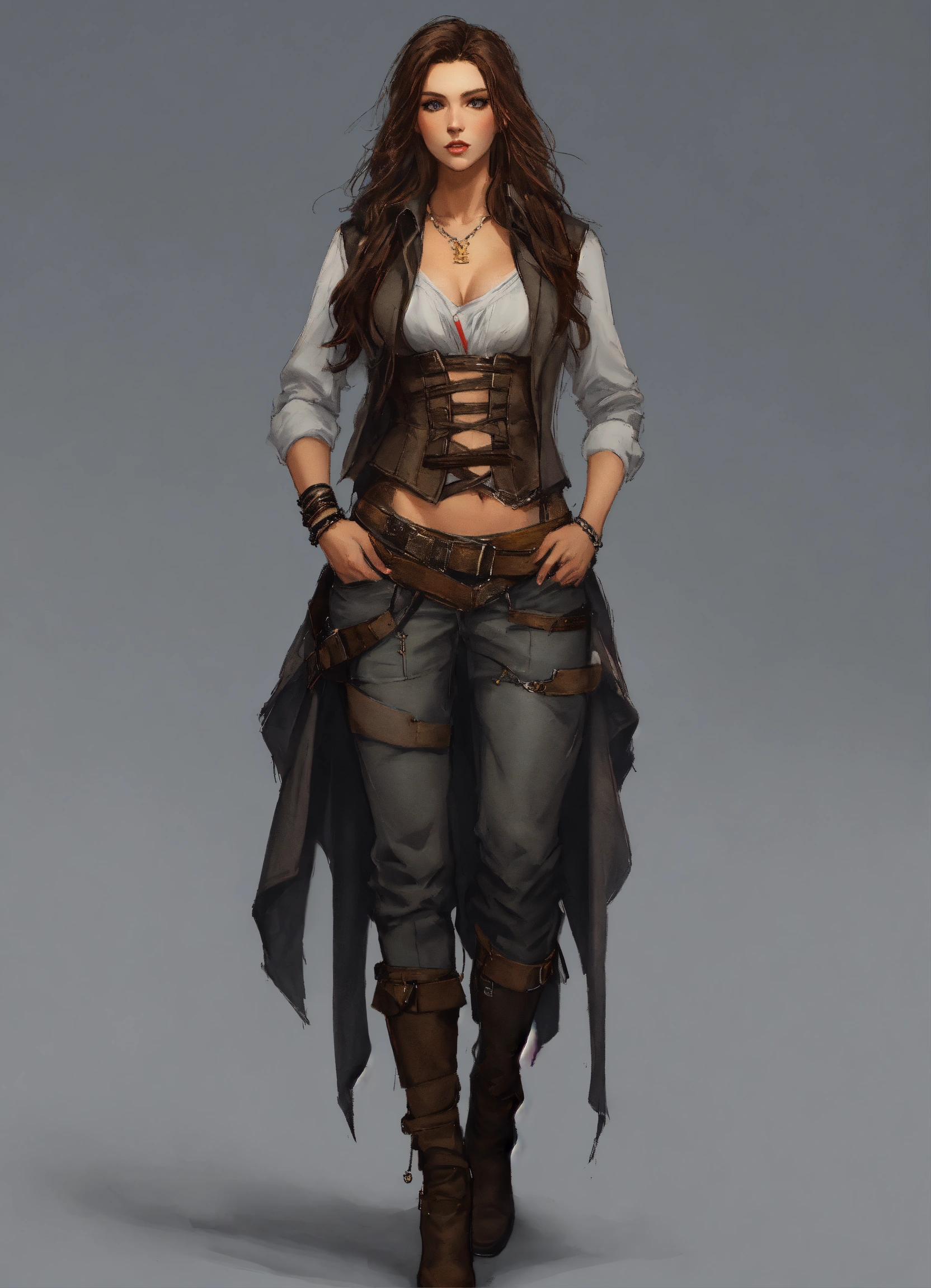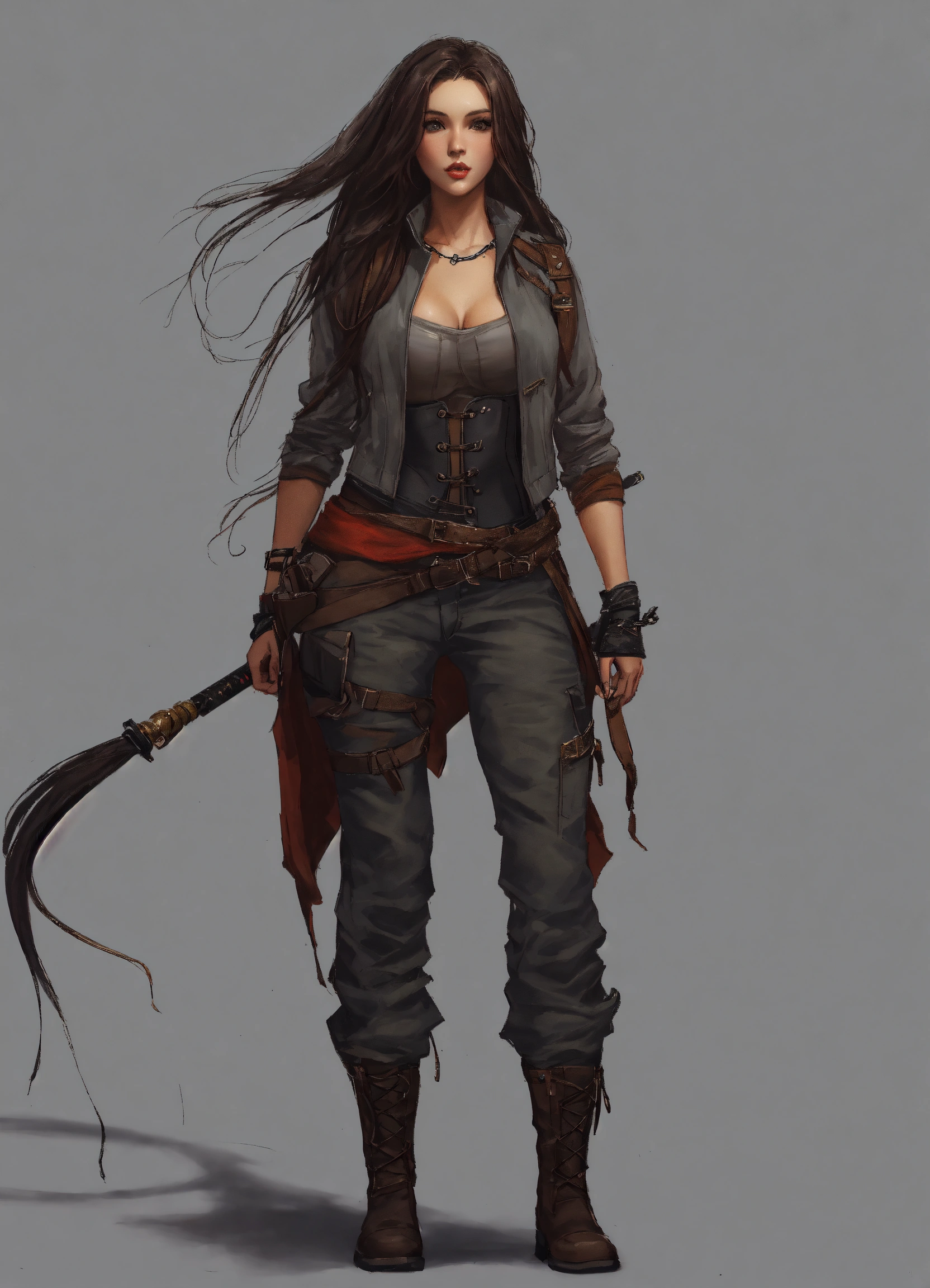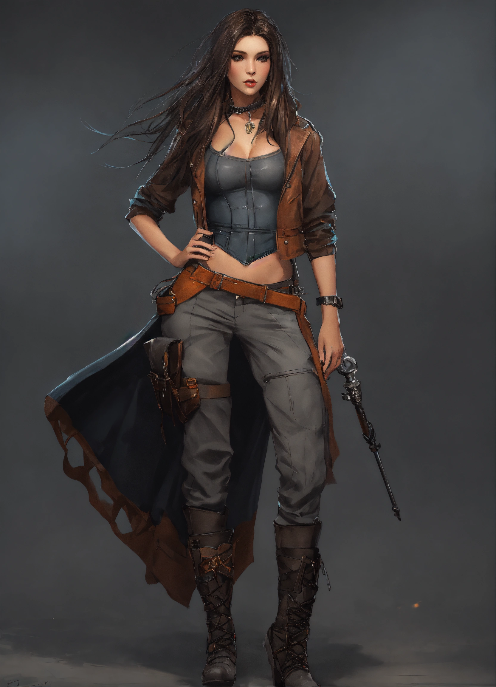 Realistic concept art full body, degenesis rpg, modern urban european female witch, brunette staight long hair, modern urban streetwear pants and top with vest, waist corset, art by marko djurdjevic, grey background