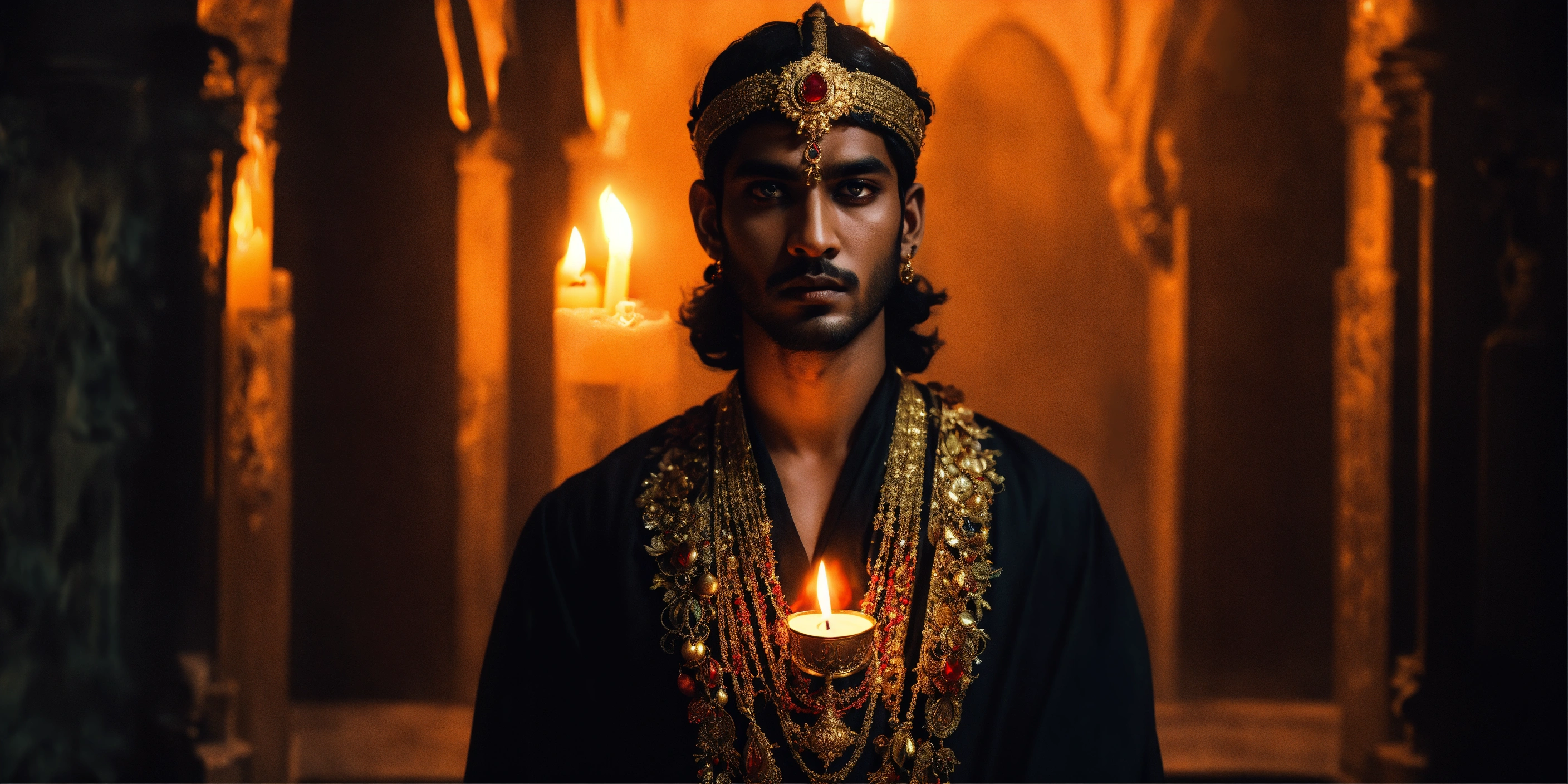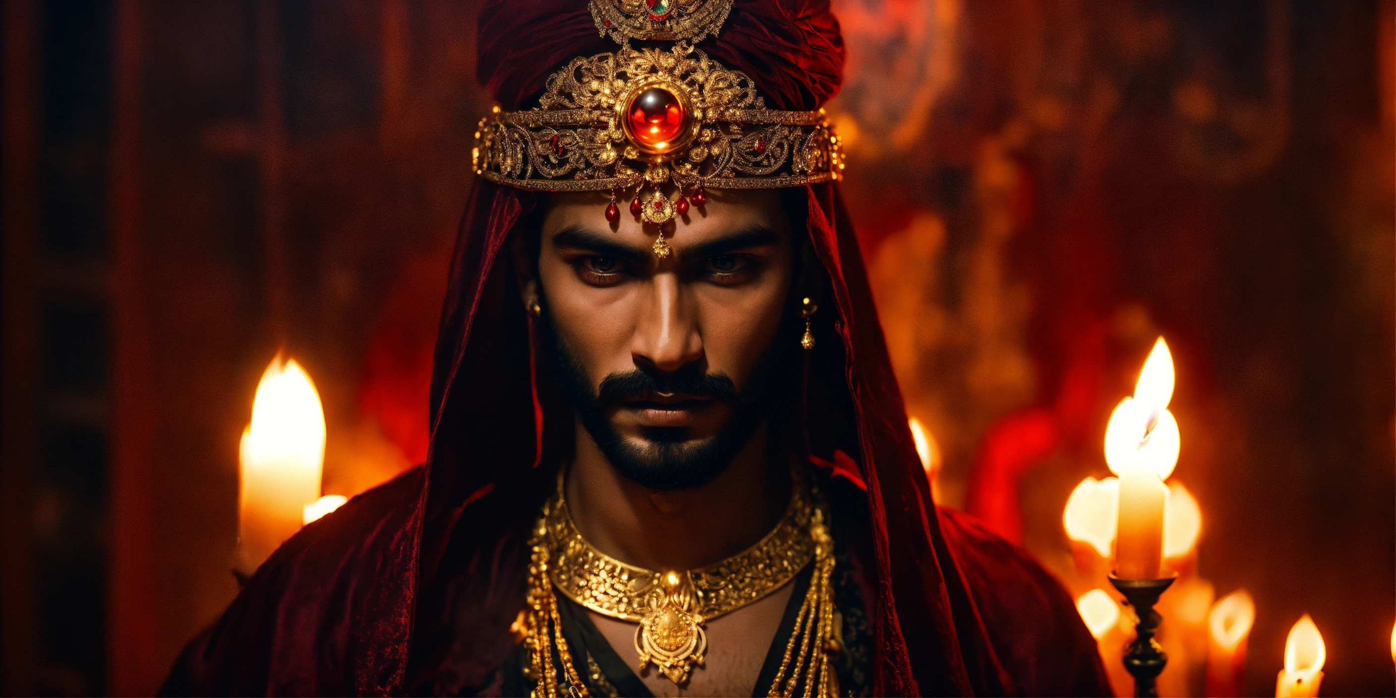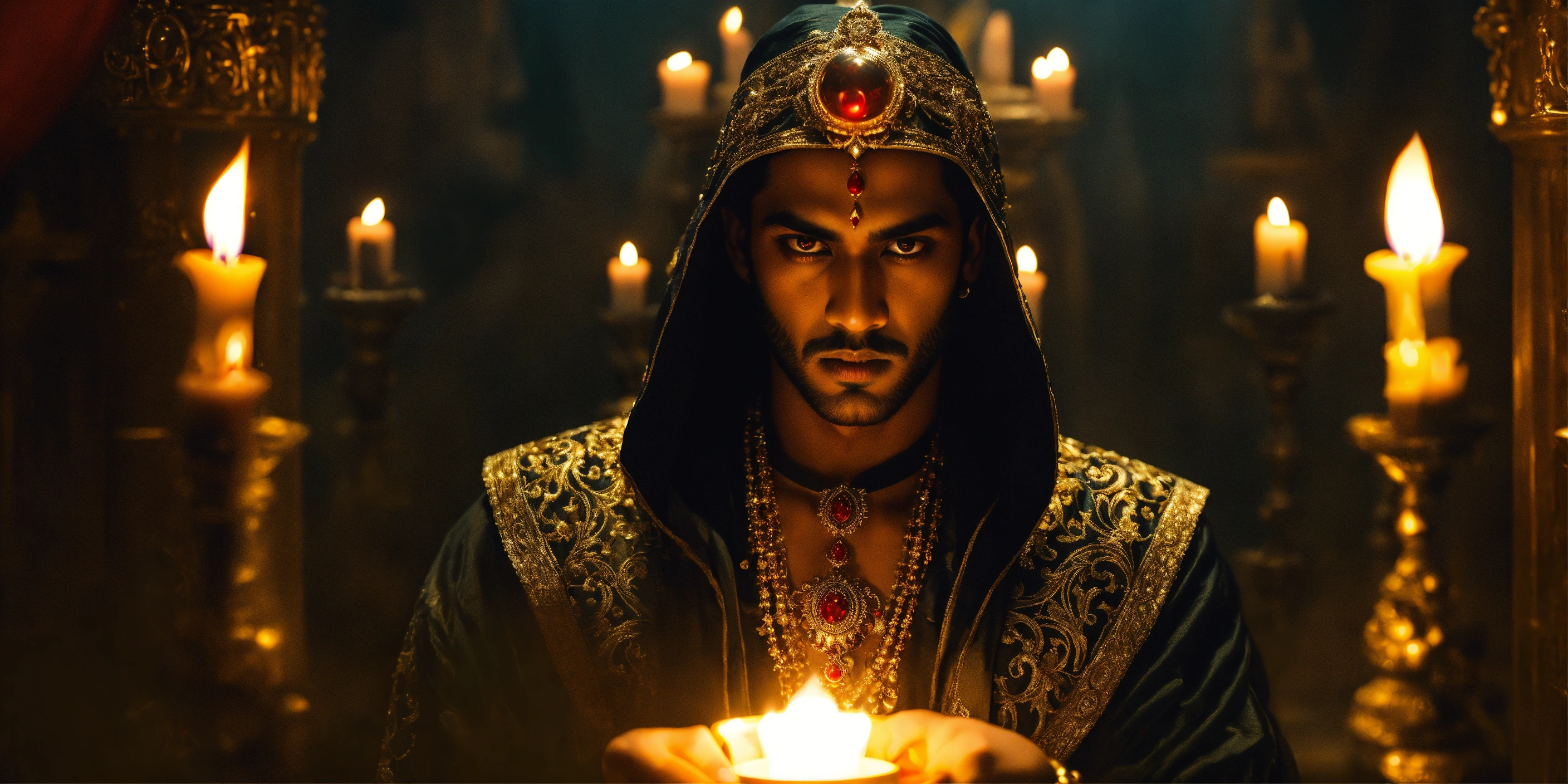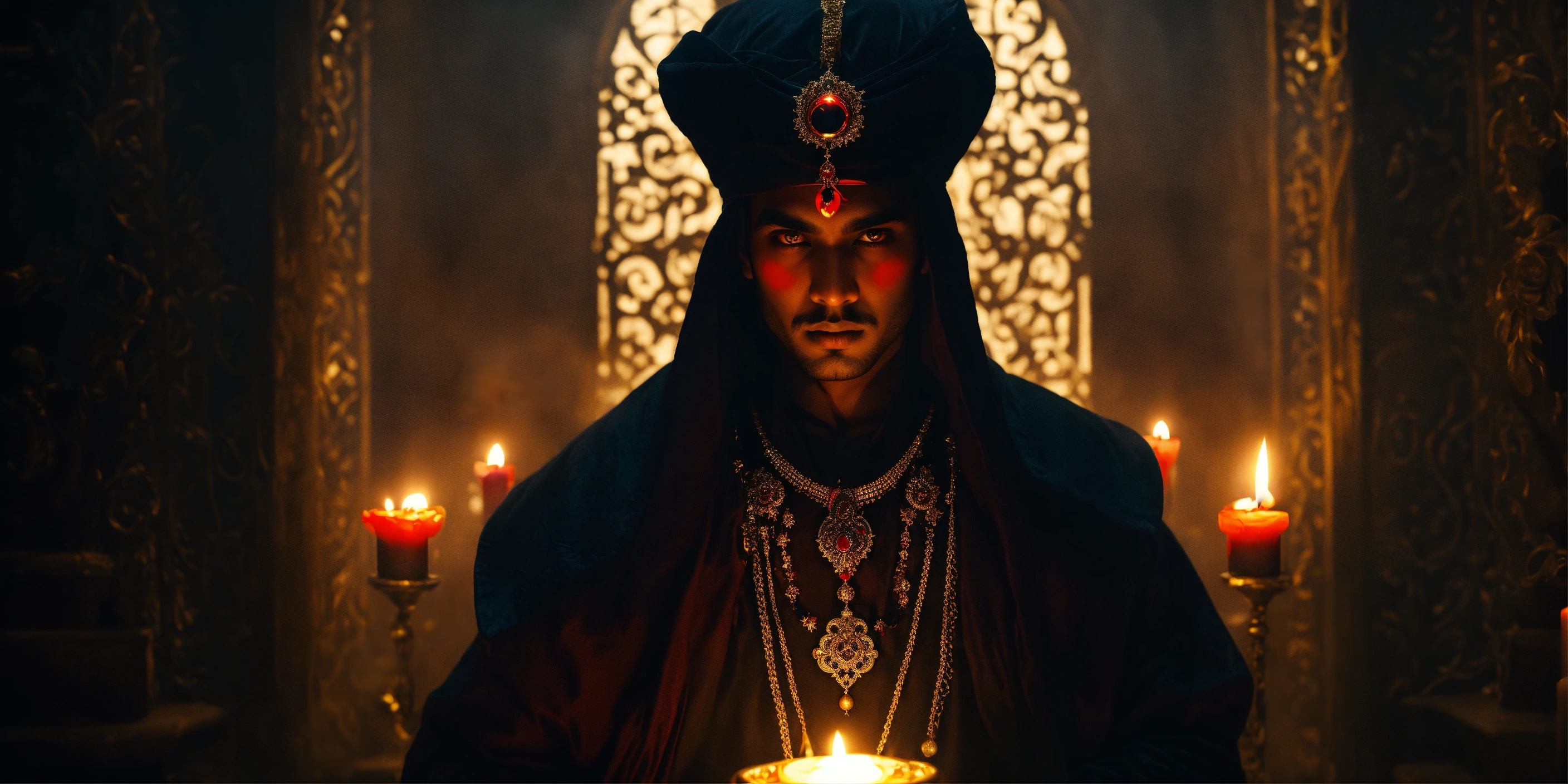 Sinister and dramatic picture of a young handsome south asian diabolical sorcerer with glowing red eyes wearing dark elaborate robes and ornate gold jewellery hypnotising the viewer in a candlelit occult crypt enveloped in mist