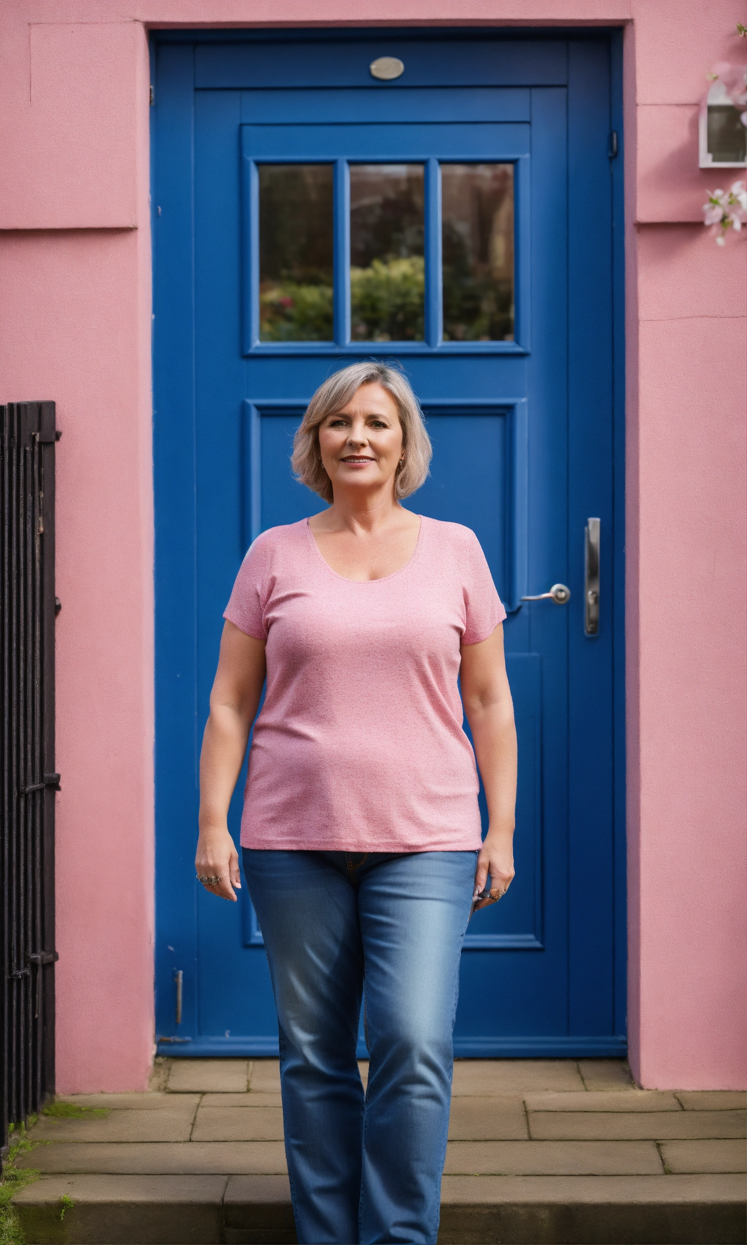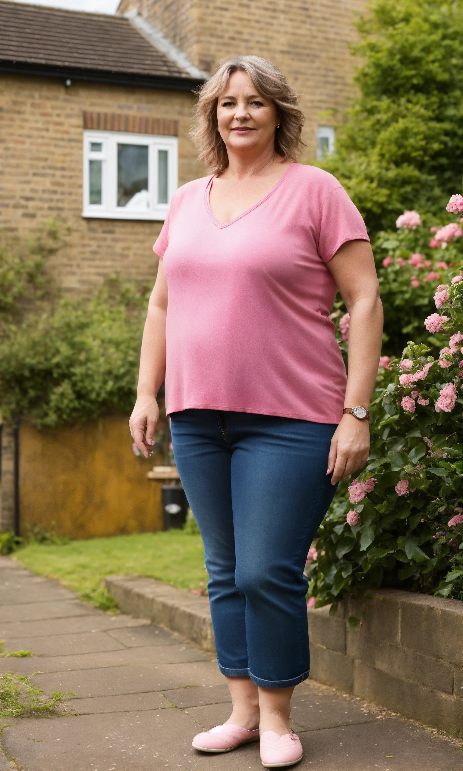 45 year old british woman, she is slightly above average weight, she is wearing blue jeans and an ill-fitting pink top, she is stood outside her house clapping
