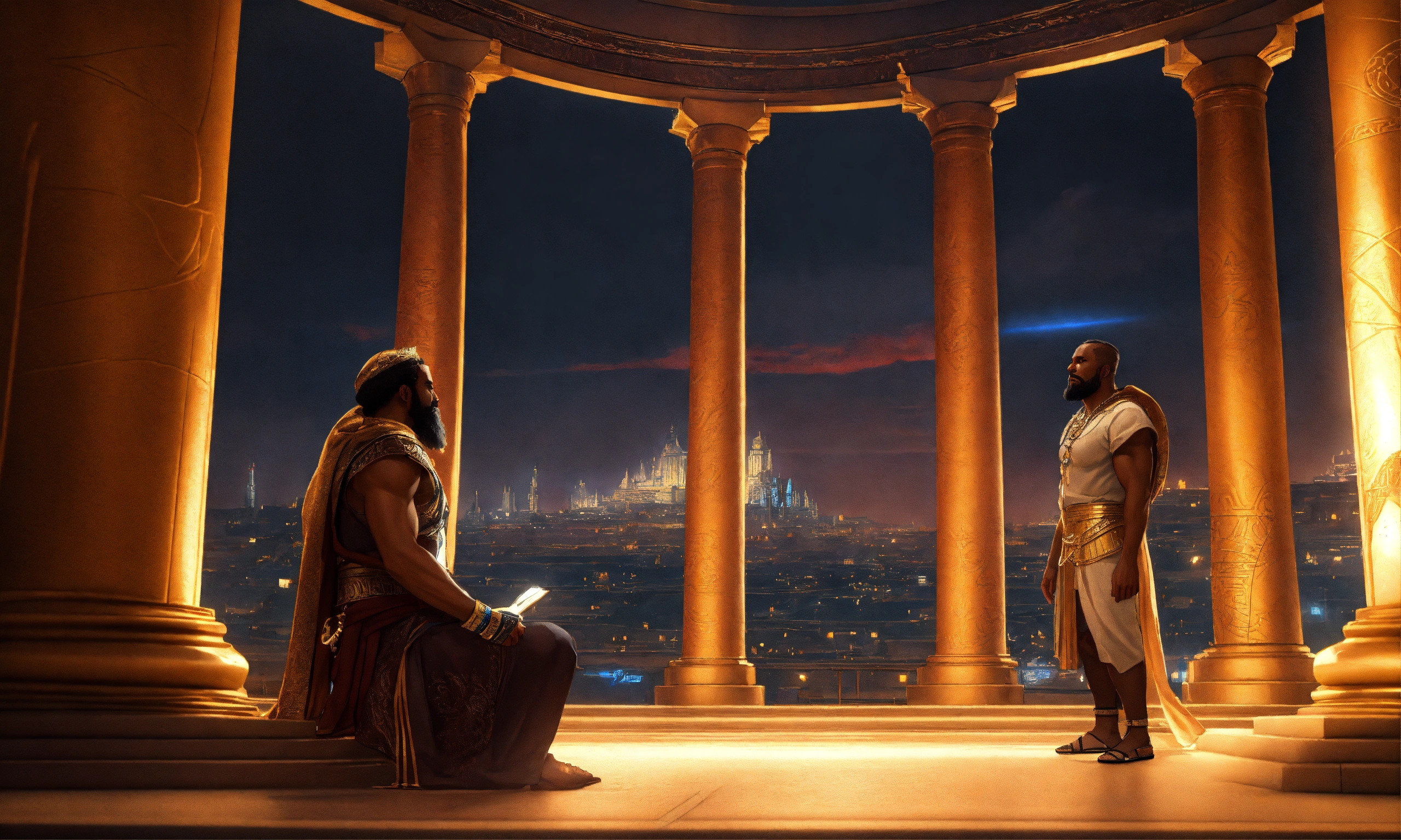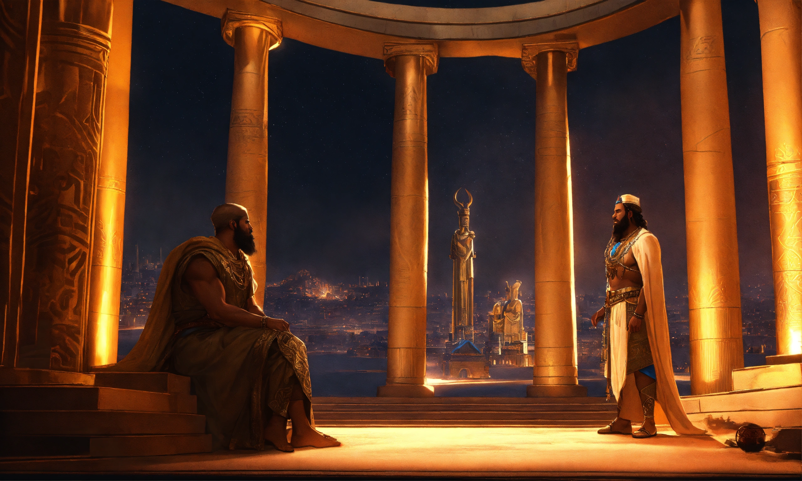 Moses talking to the pharaoh, ultra realistic, concept art, intricate details, mysterious, highly detailed, photorealistic, octane rendering, 8k, unreal engine. art by artgerm and jim lee, pen and ink drawing, cityscape, full body, night