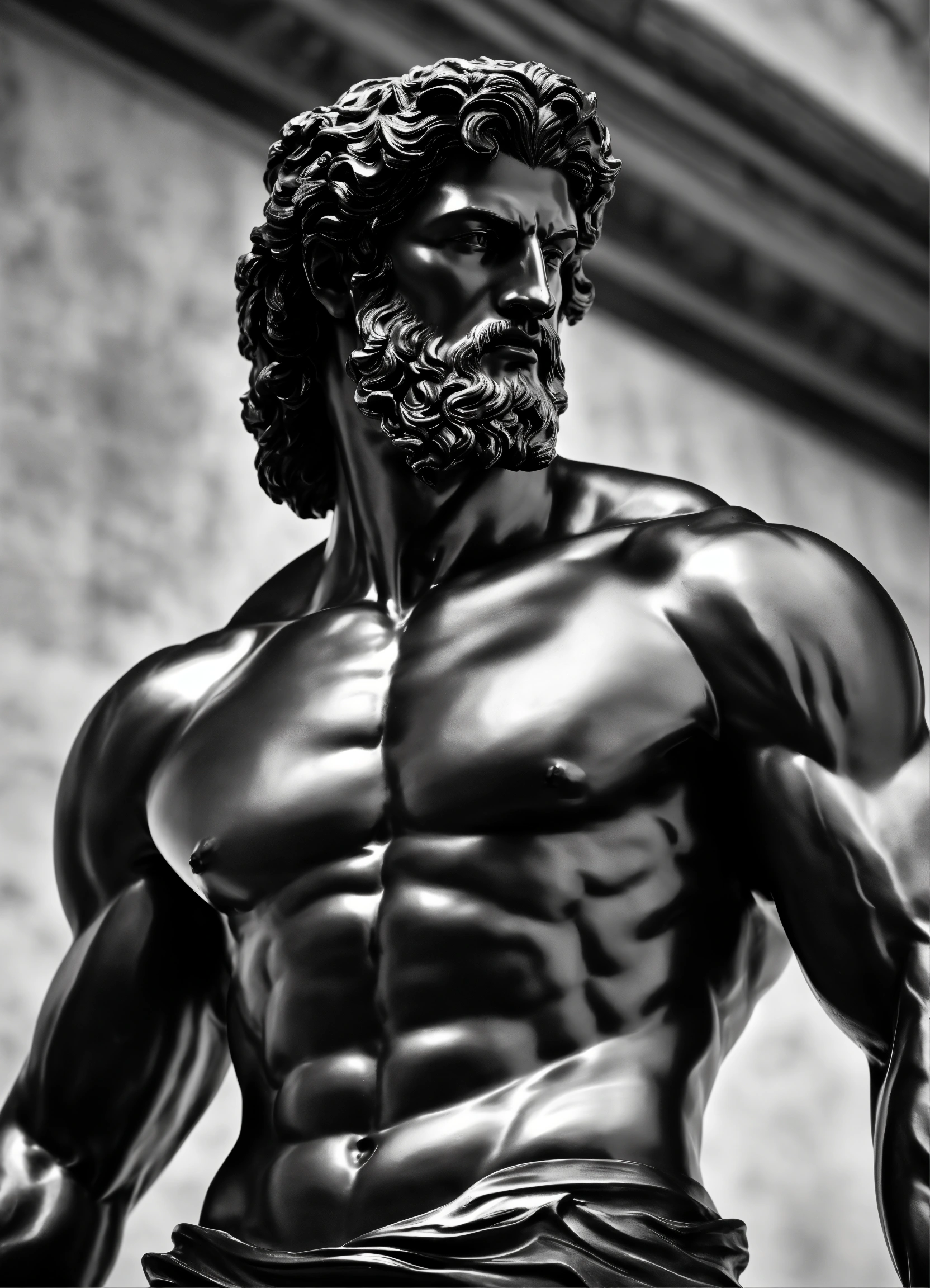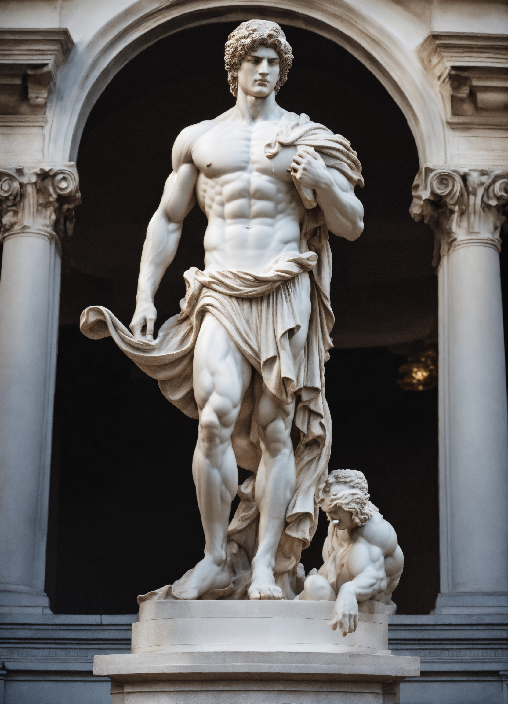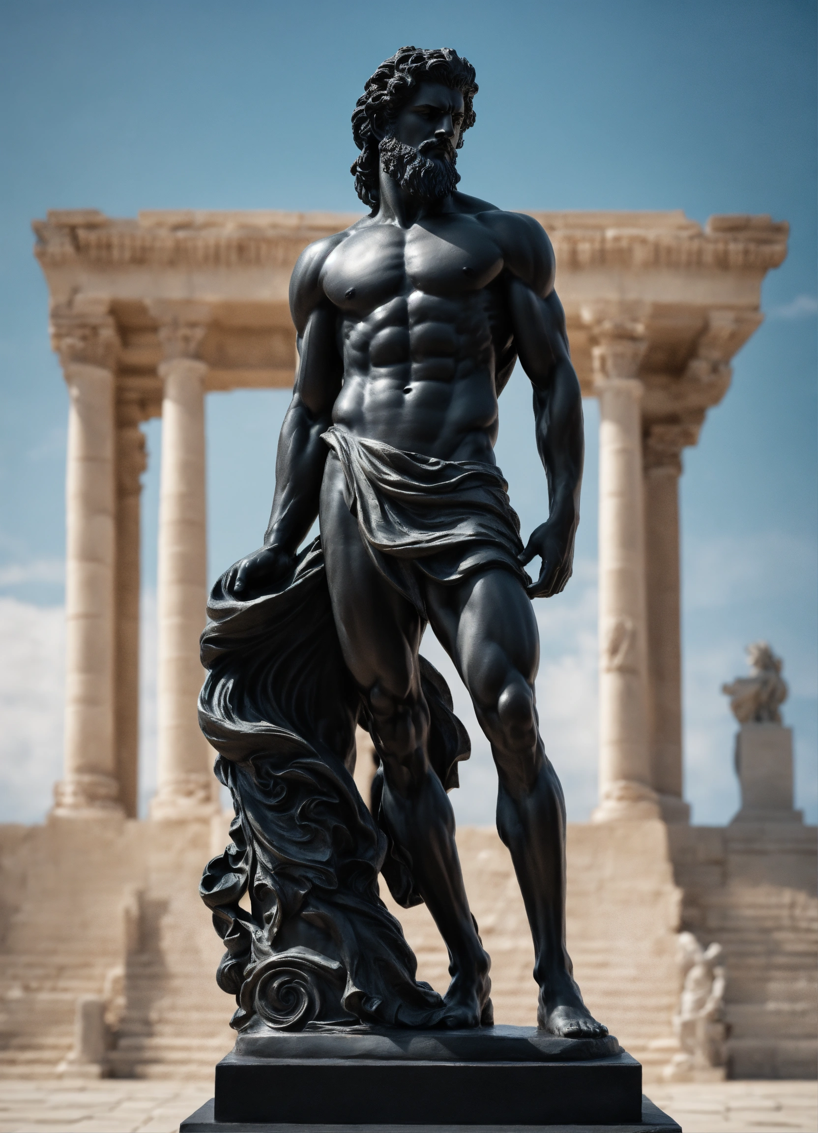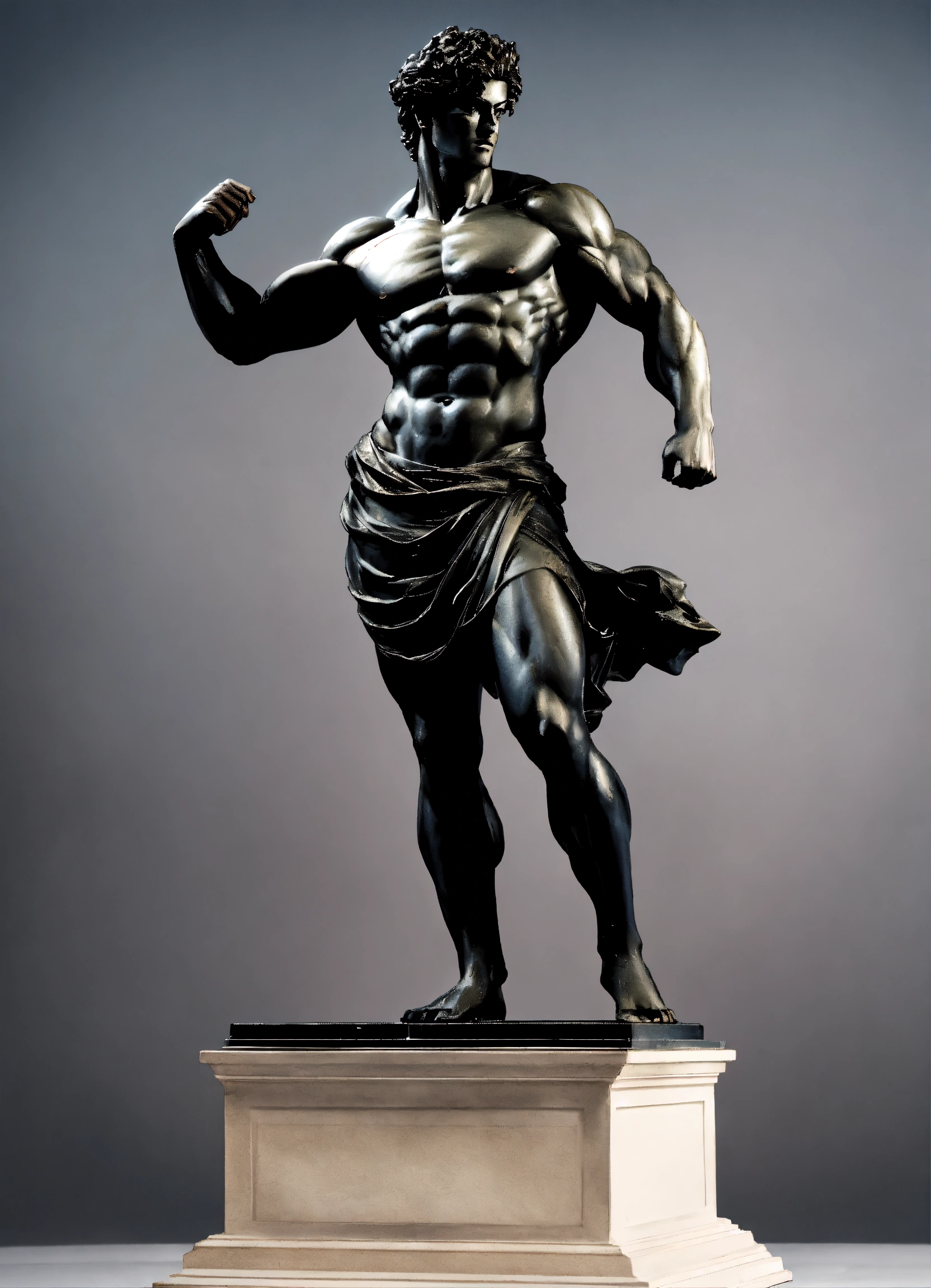 A statue from a muscular greek god statue with a wavey middel parting hair with black color on his body with a white backround standing on a podest animeted style 8k