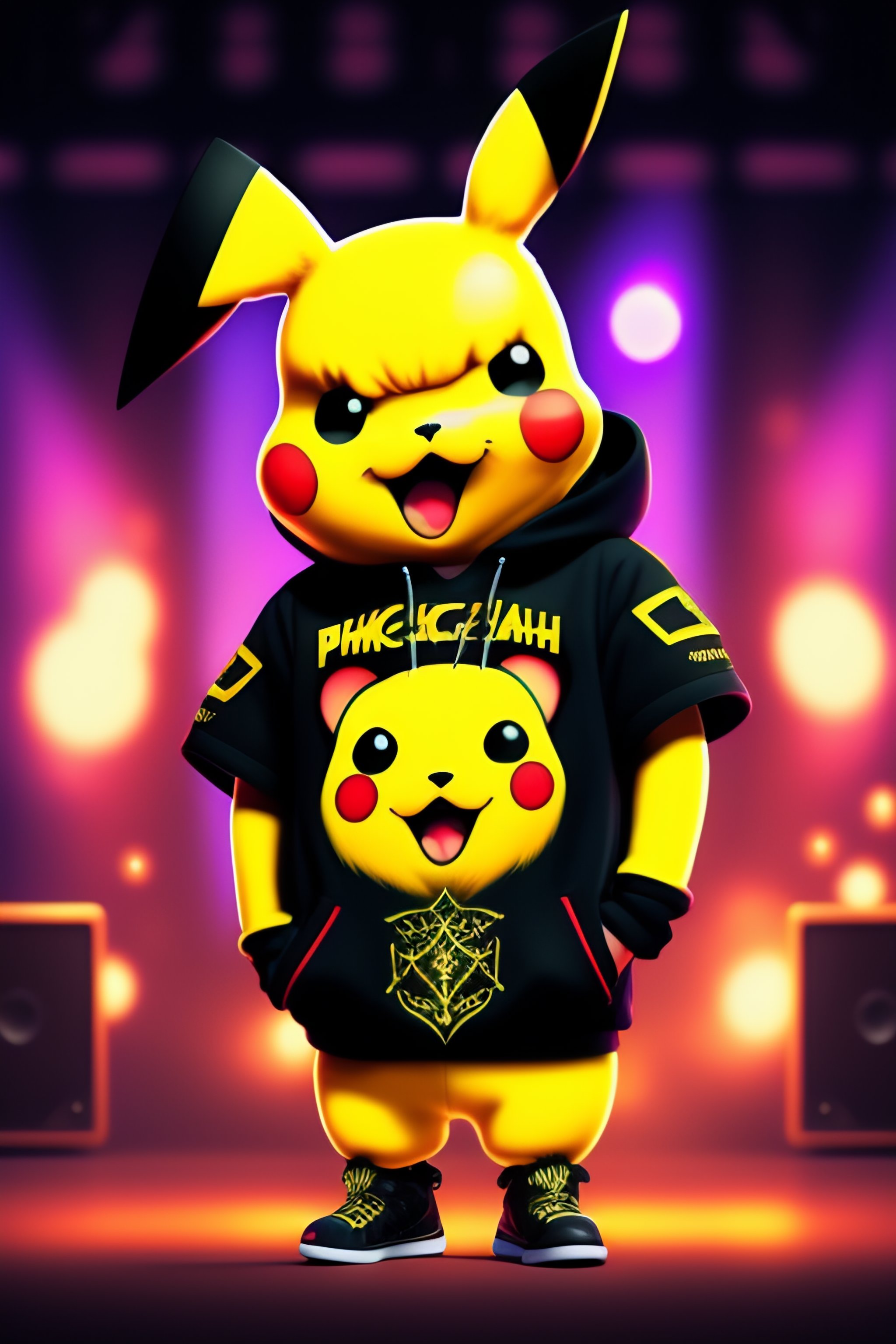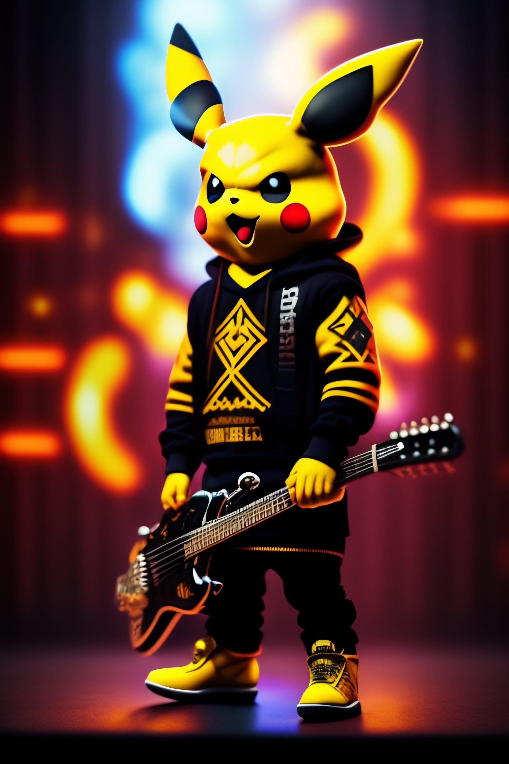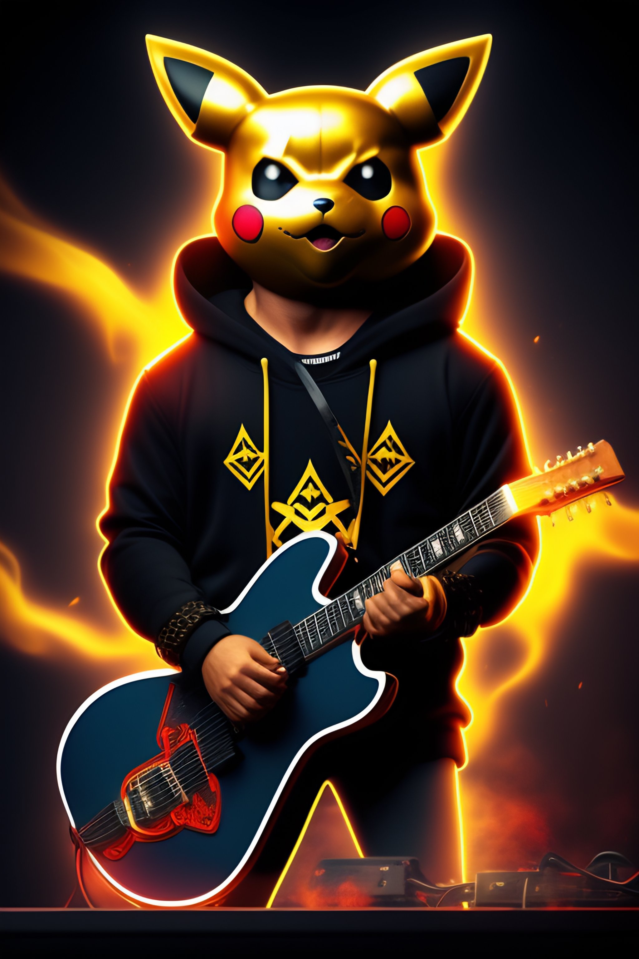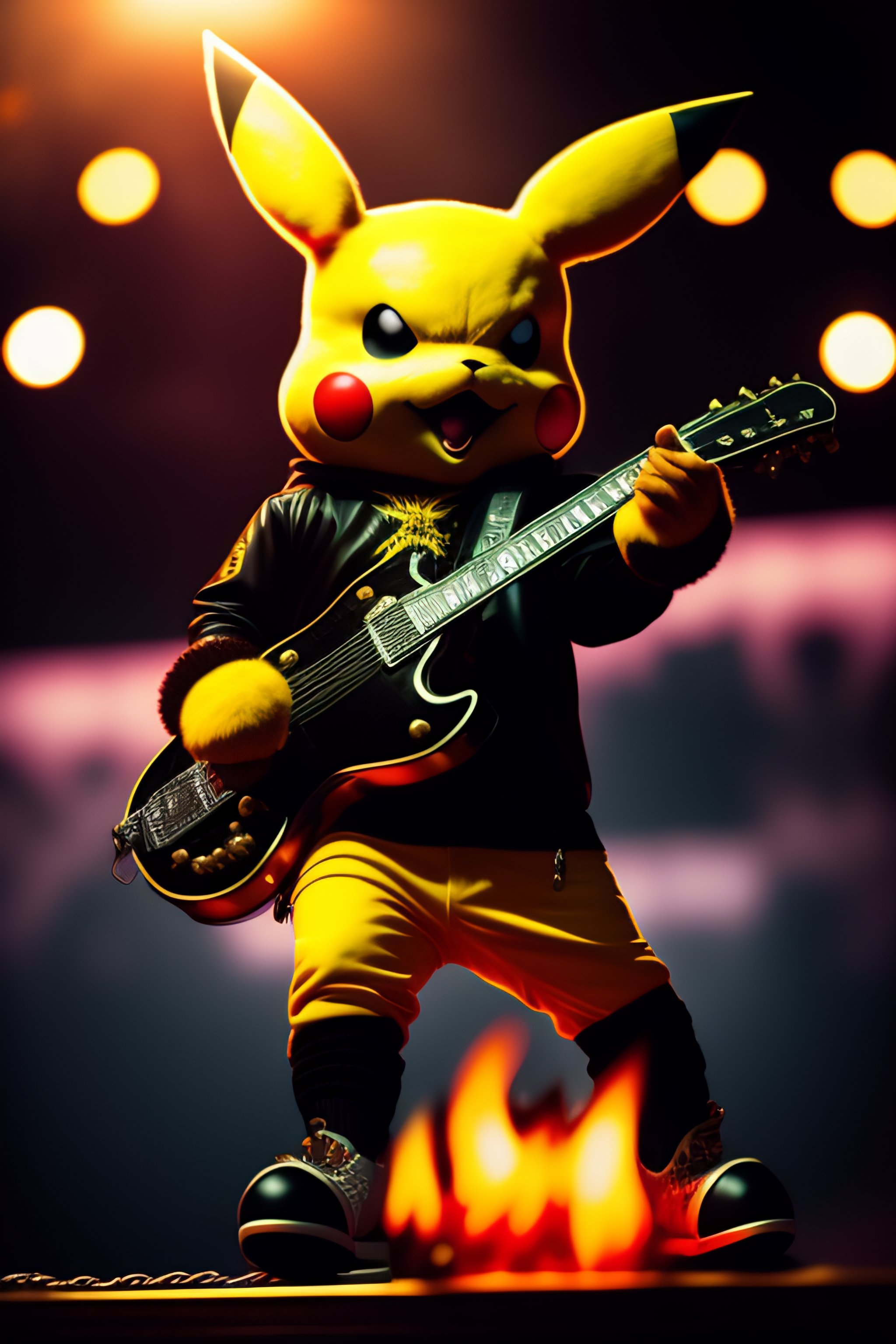 A metalhead pikachu with a black metal logo sweater and spades bracelets, he is standing on a stage and surrounded by broken guitars and fire