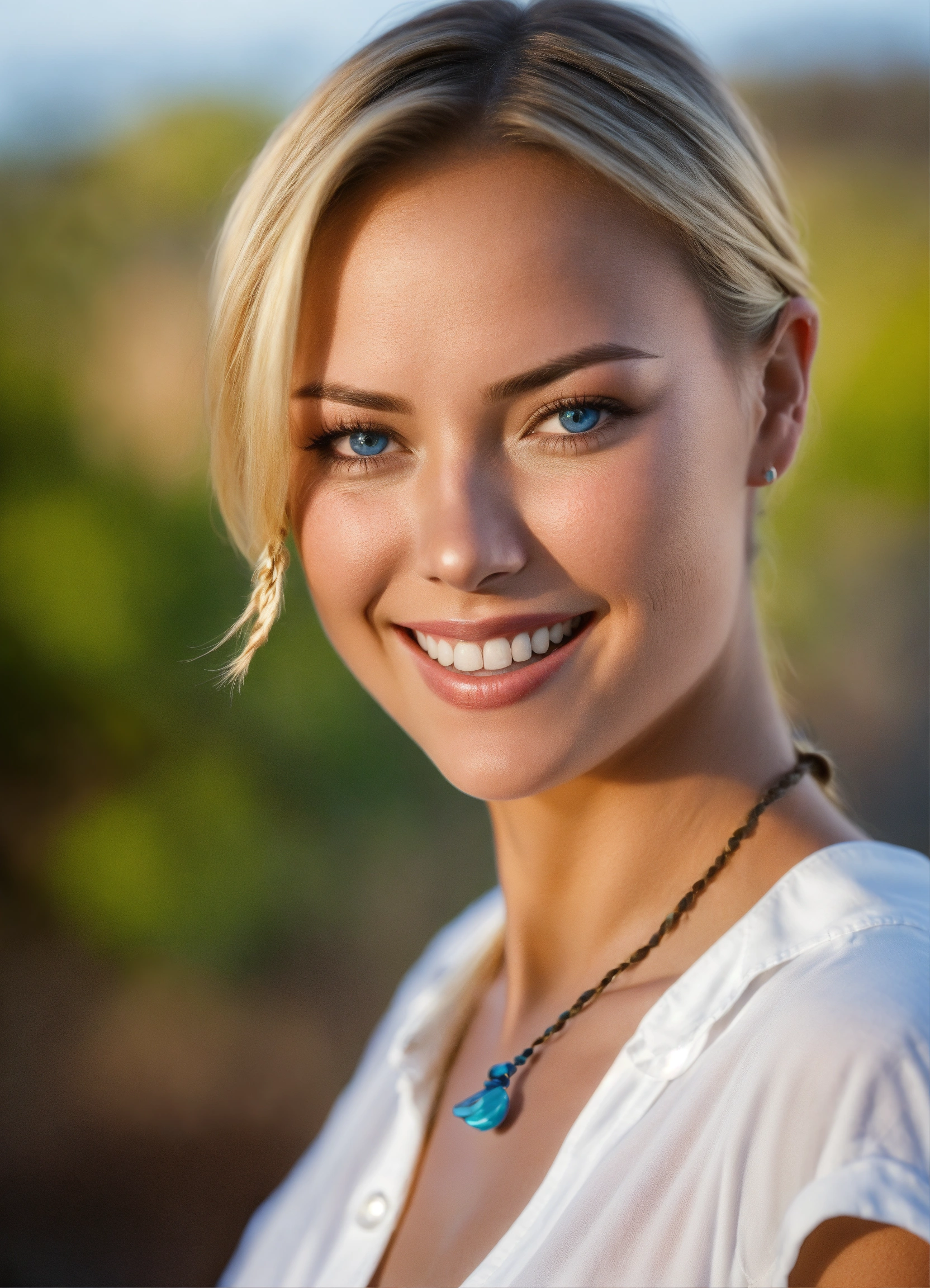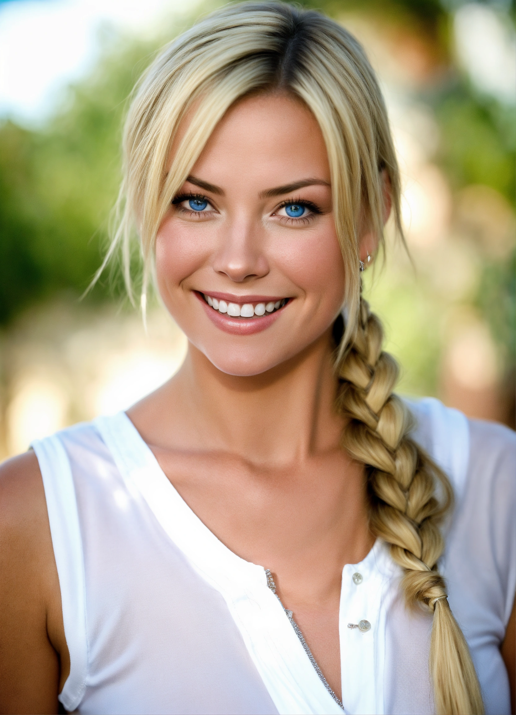 Portrait of a very nice and cute young woman as jaime pressly, short blong hair with braid, perfect blue eyes, perfect smile, wearing an open white shirt or swimsuit in a natural background