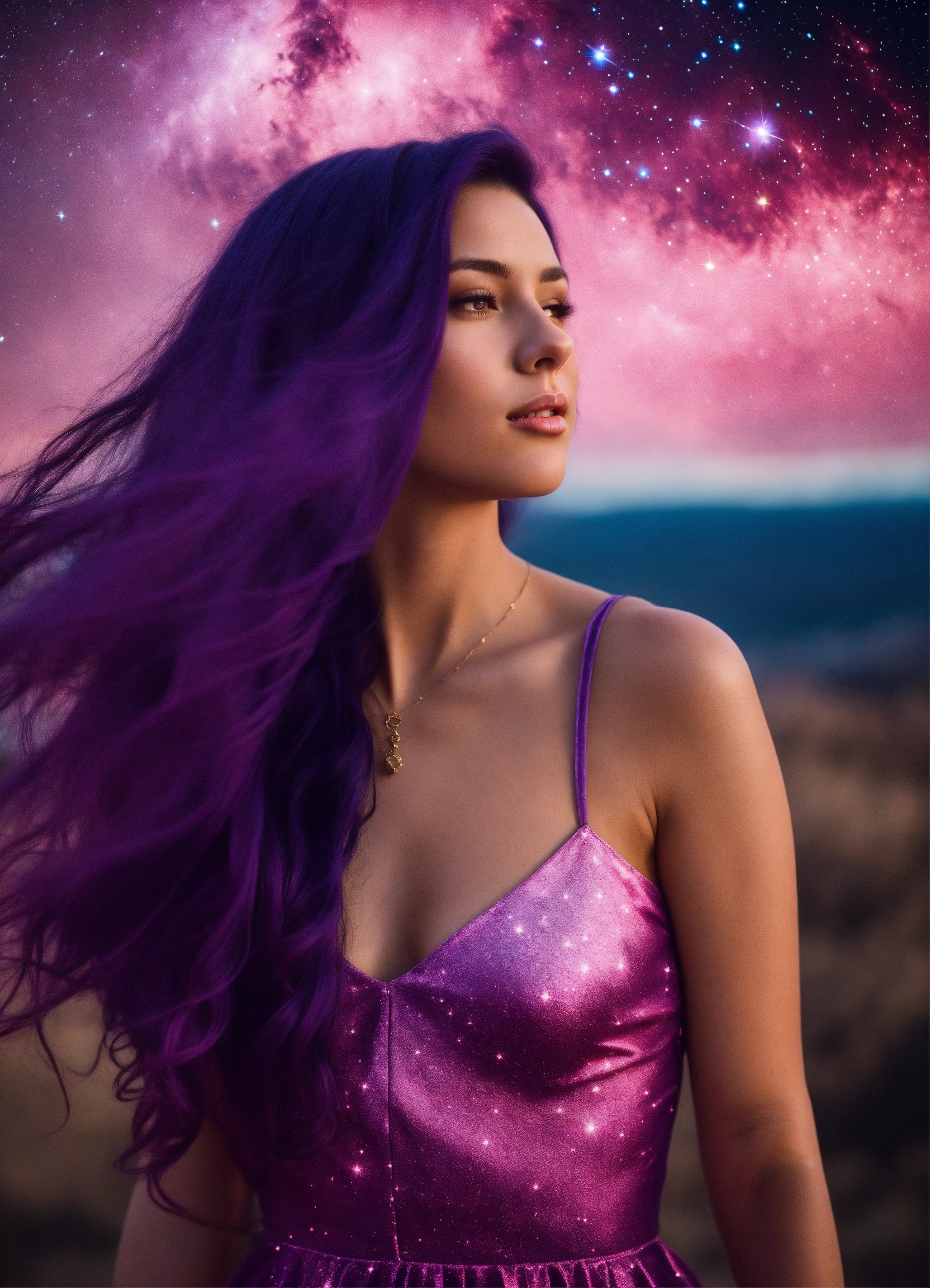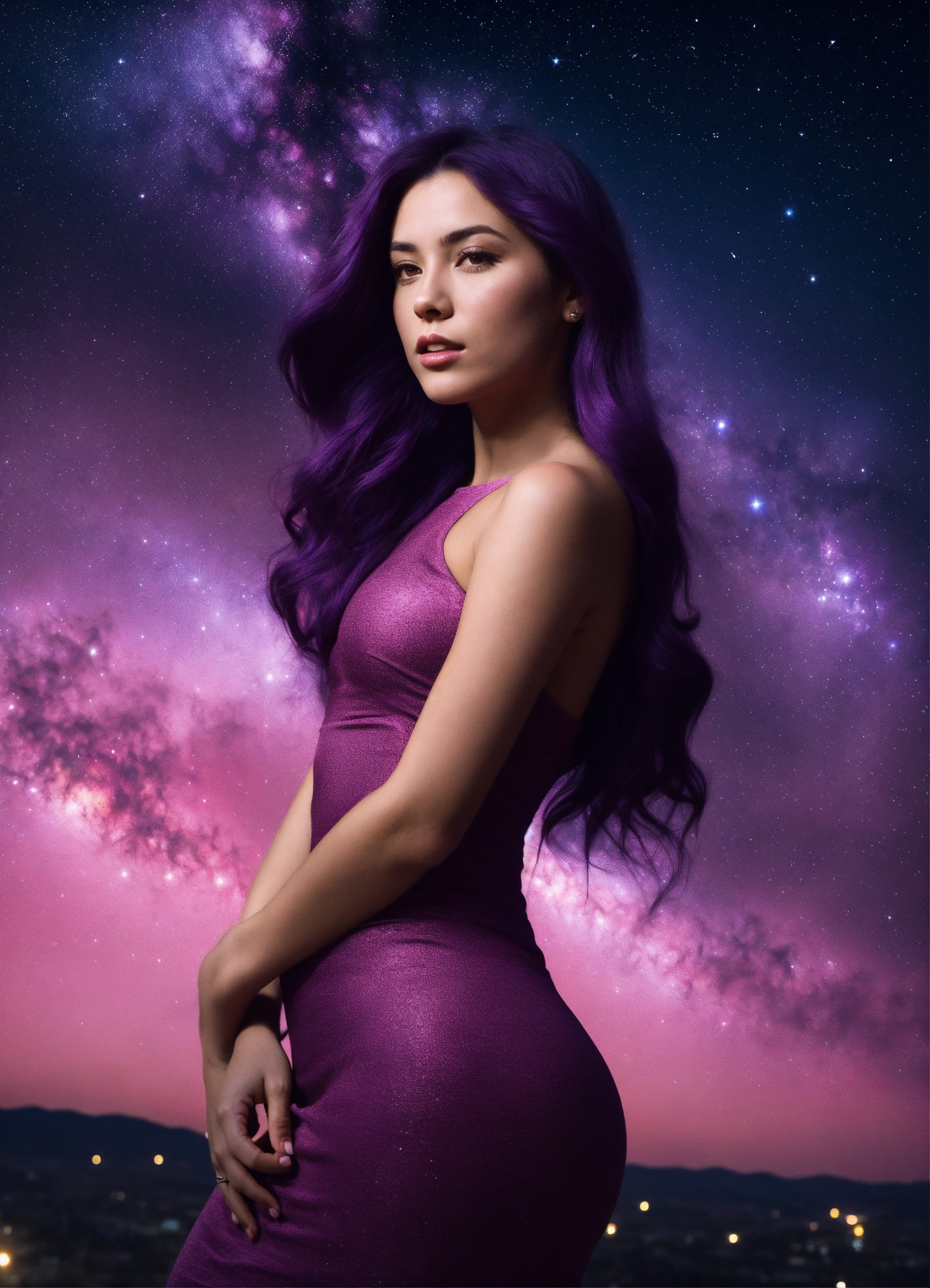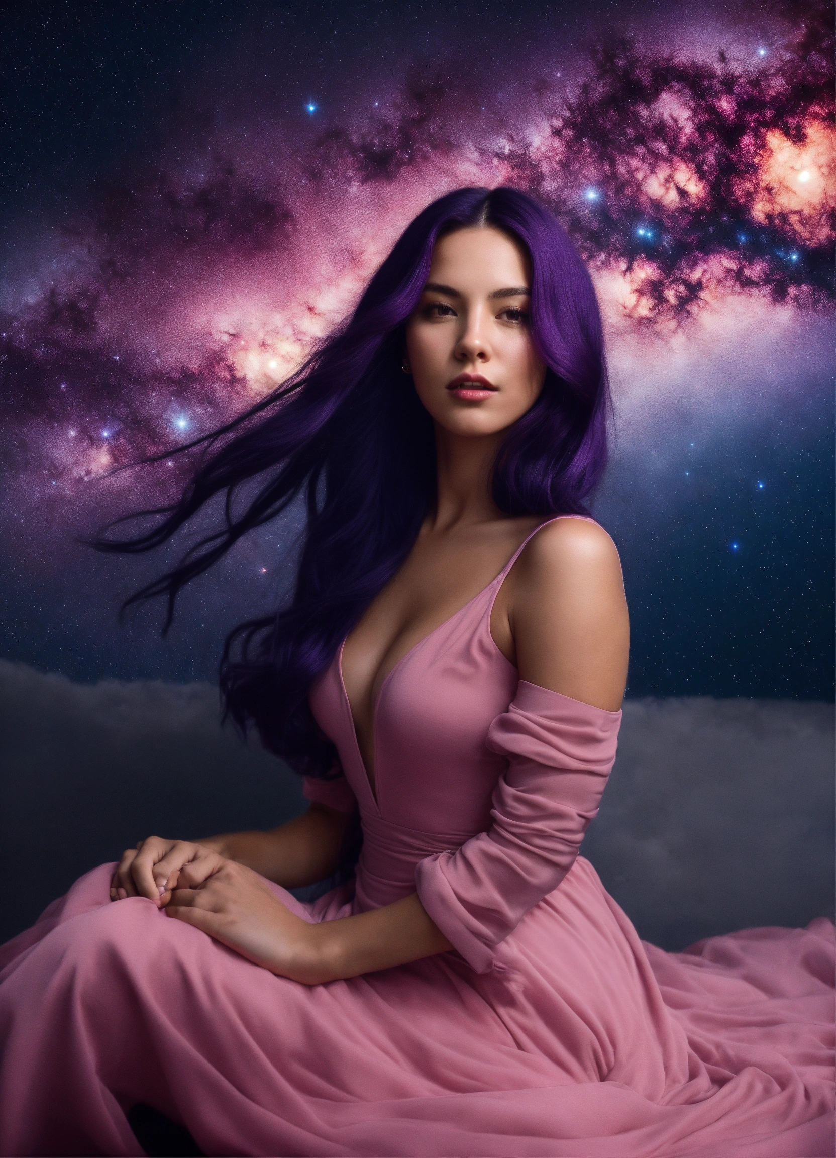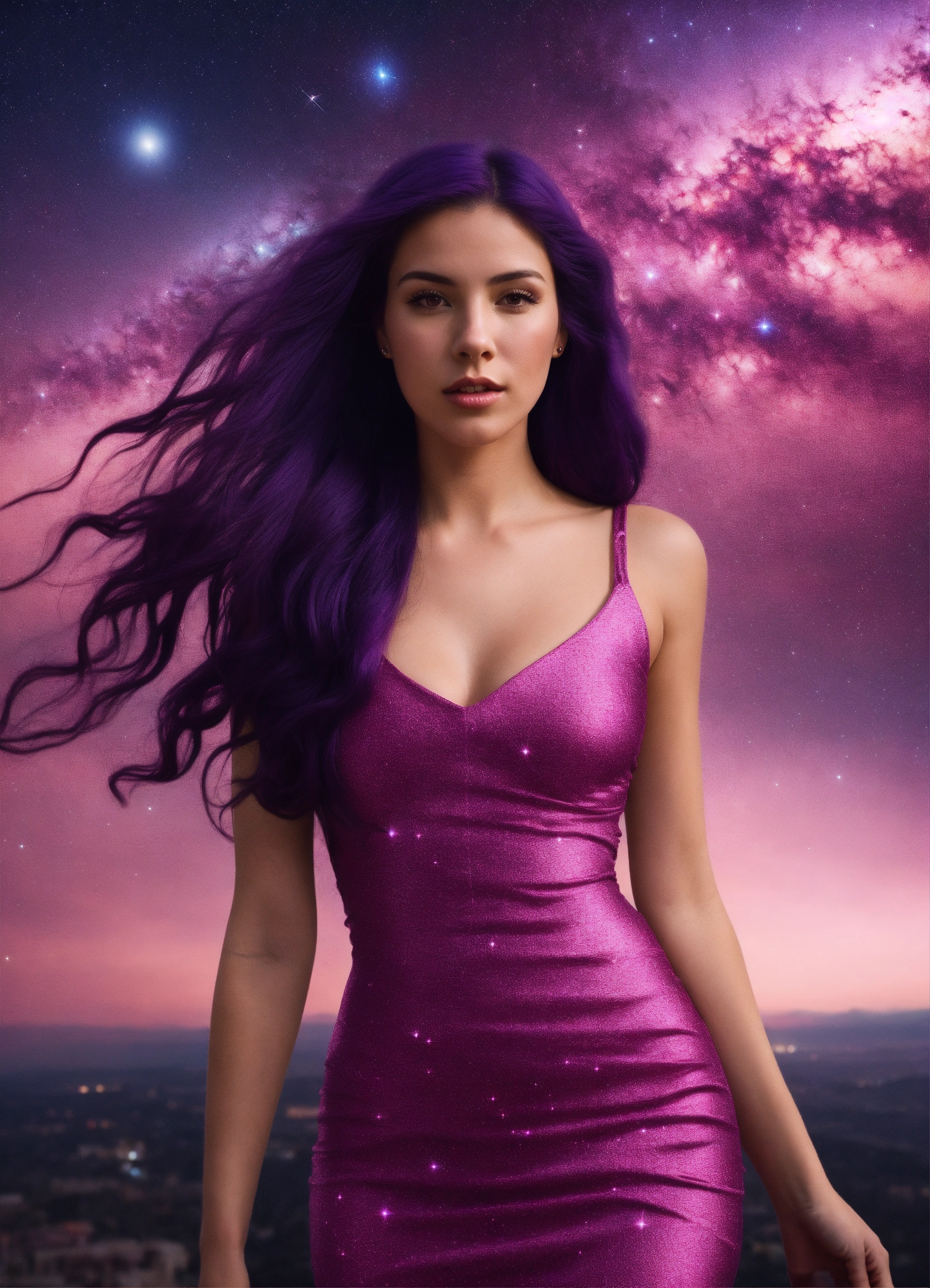 A real photo of a 27 year old girl with long dark purple hair, she is wearing a very tight pink dress, in the sky we see the galaxy