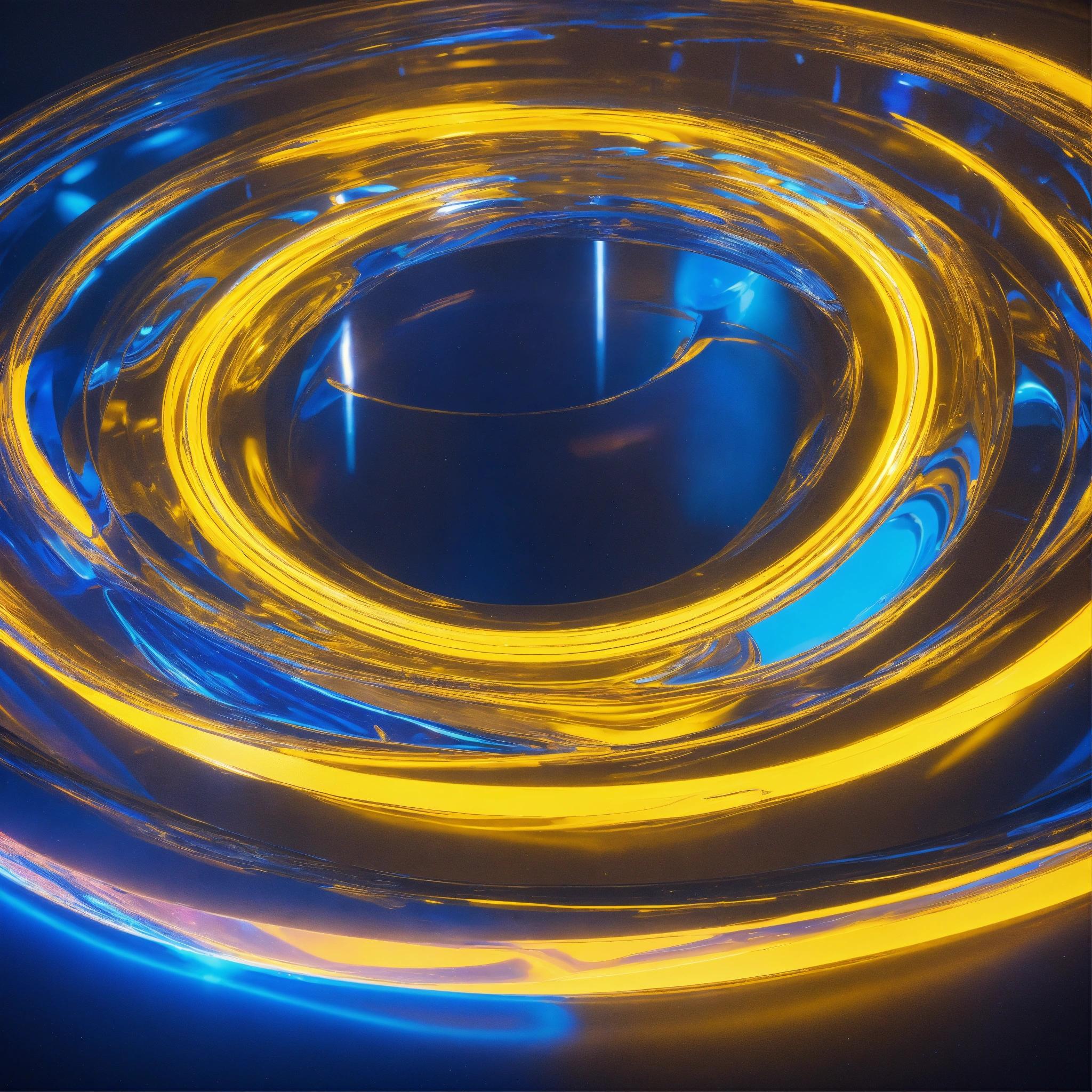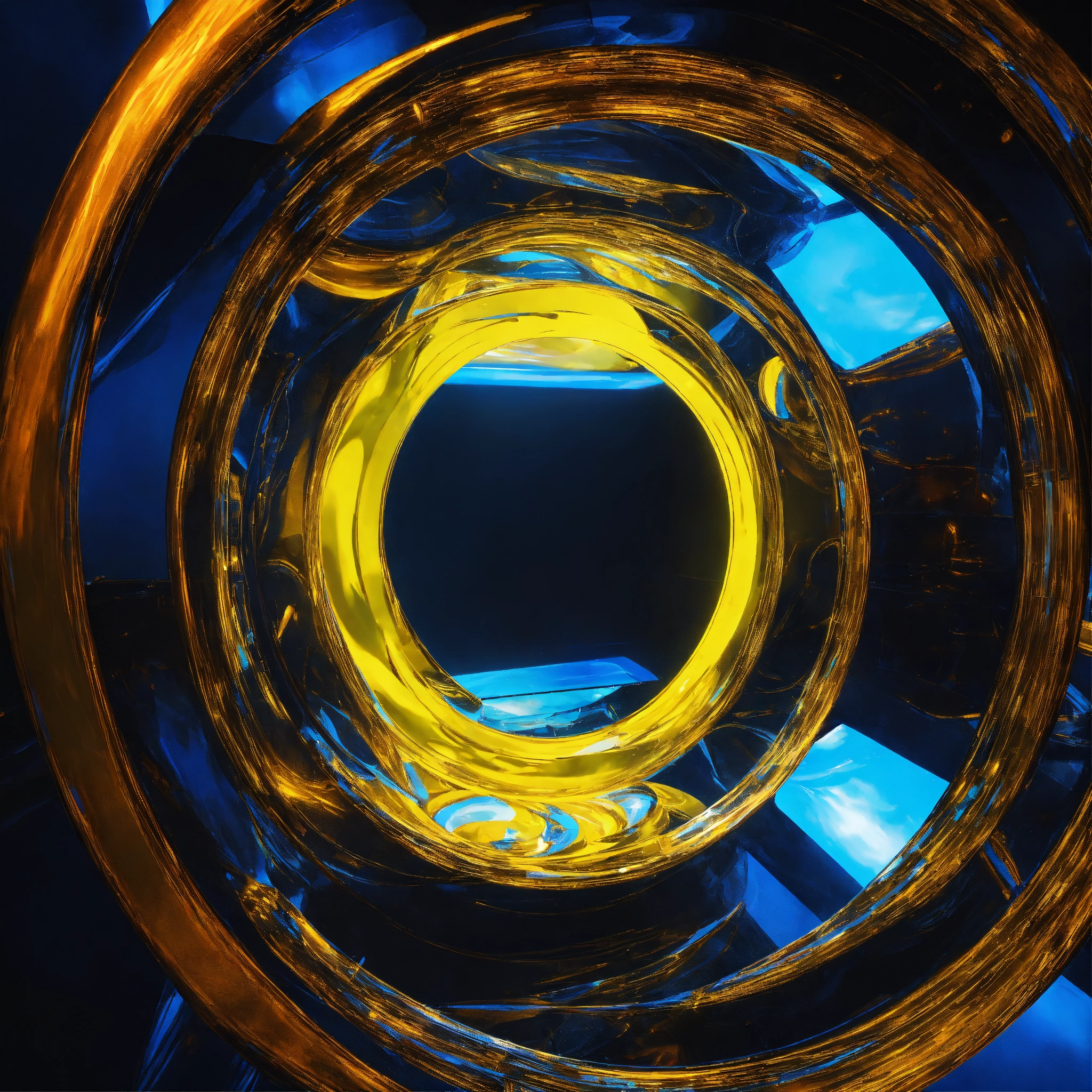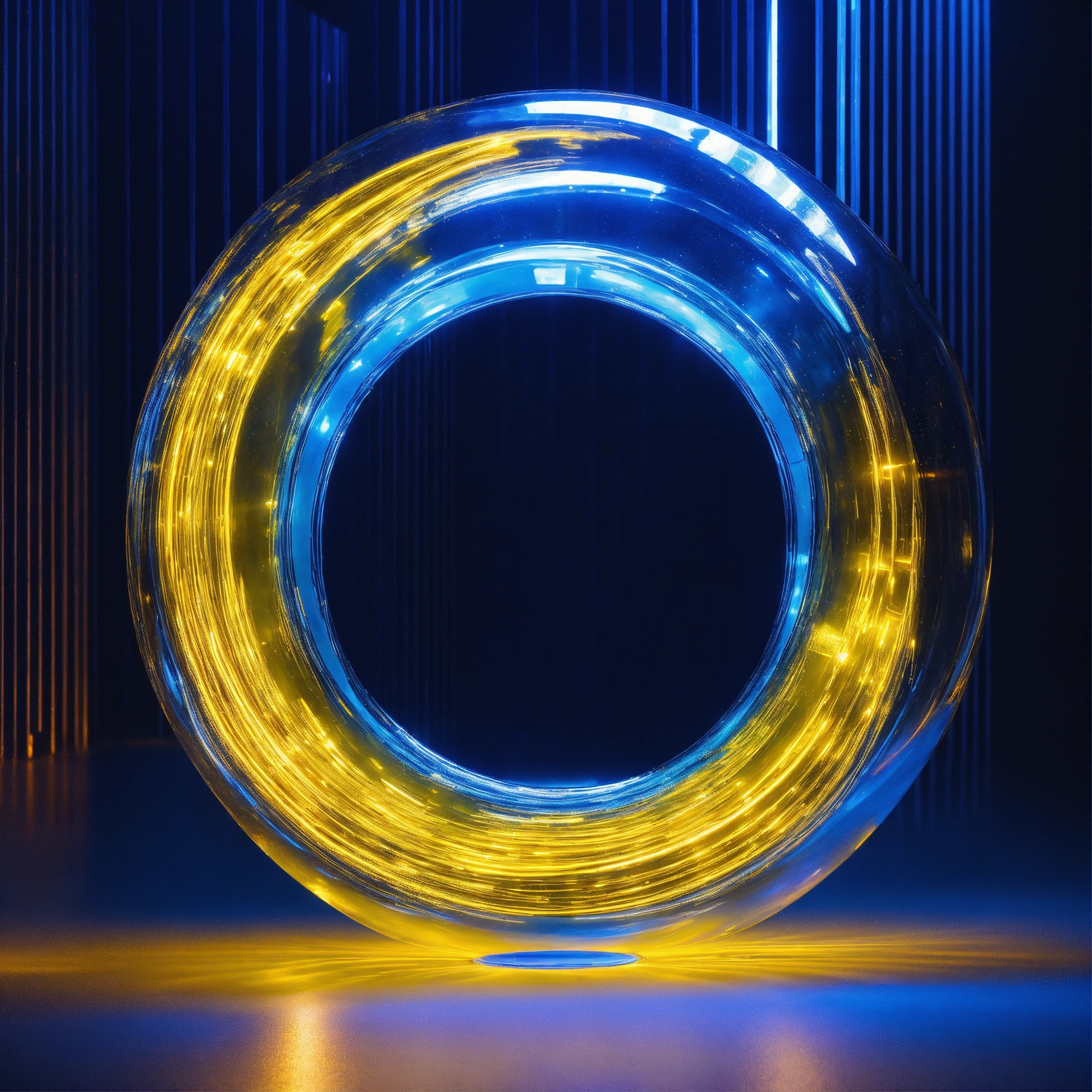 Metallic and glassy surface, vivid tones of blue and yellow, surreal futuristic neatly object, heavenly and intense neon lights, a glass installation on the open spoce. surreal background. symbolizing a portal to another dimension. one abstract representative object floating. --ar 169 --s 1000 --c 15