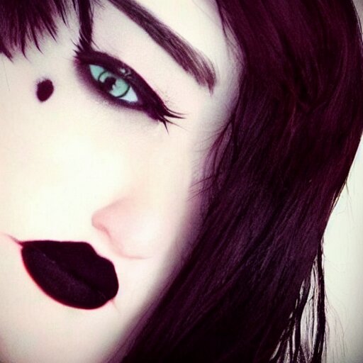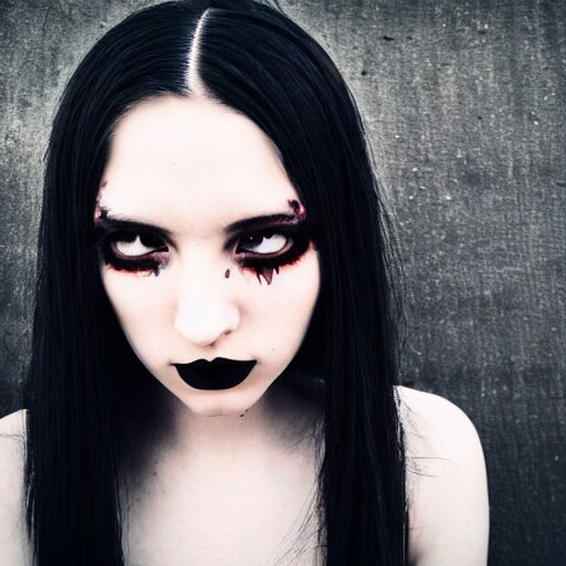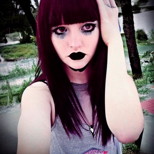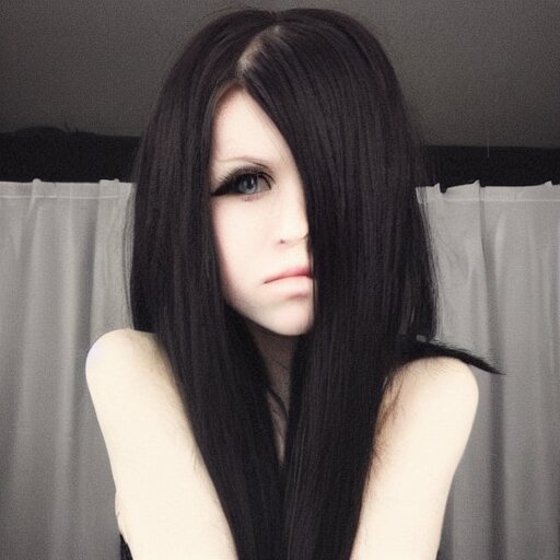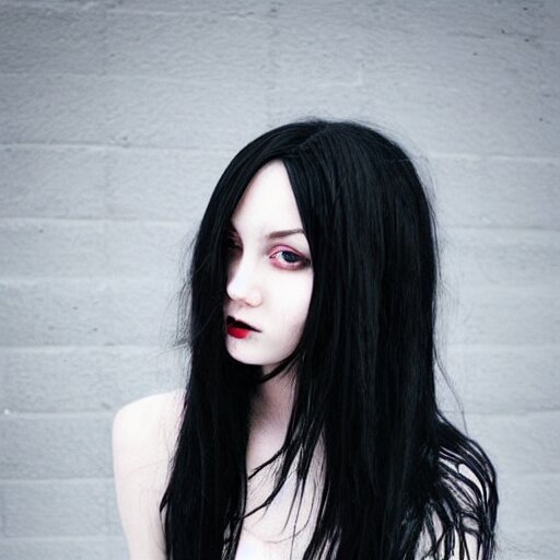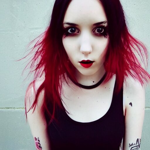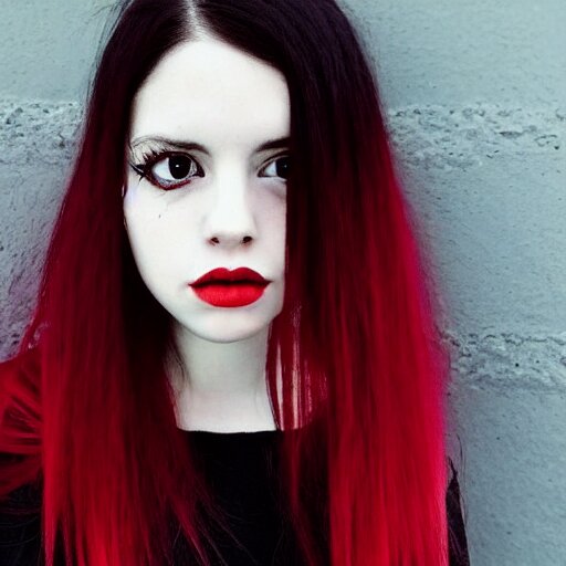 ! dream a pale emo girl, black and red hair, soft facial features, looking directly at the camera, neutral expression, instagram picture