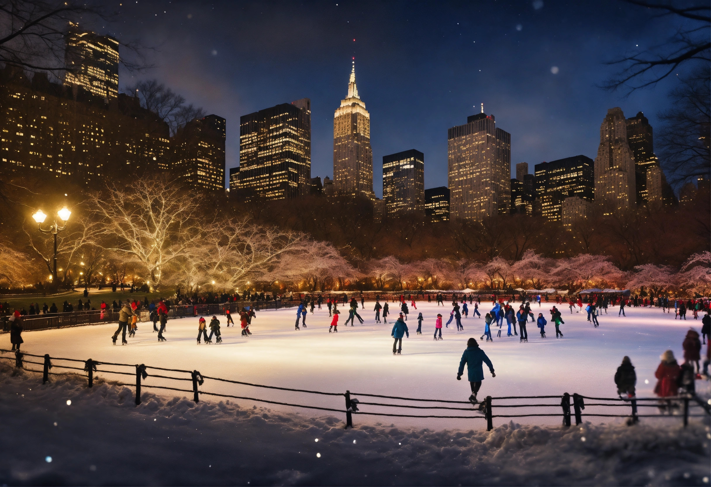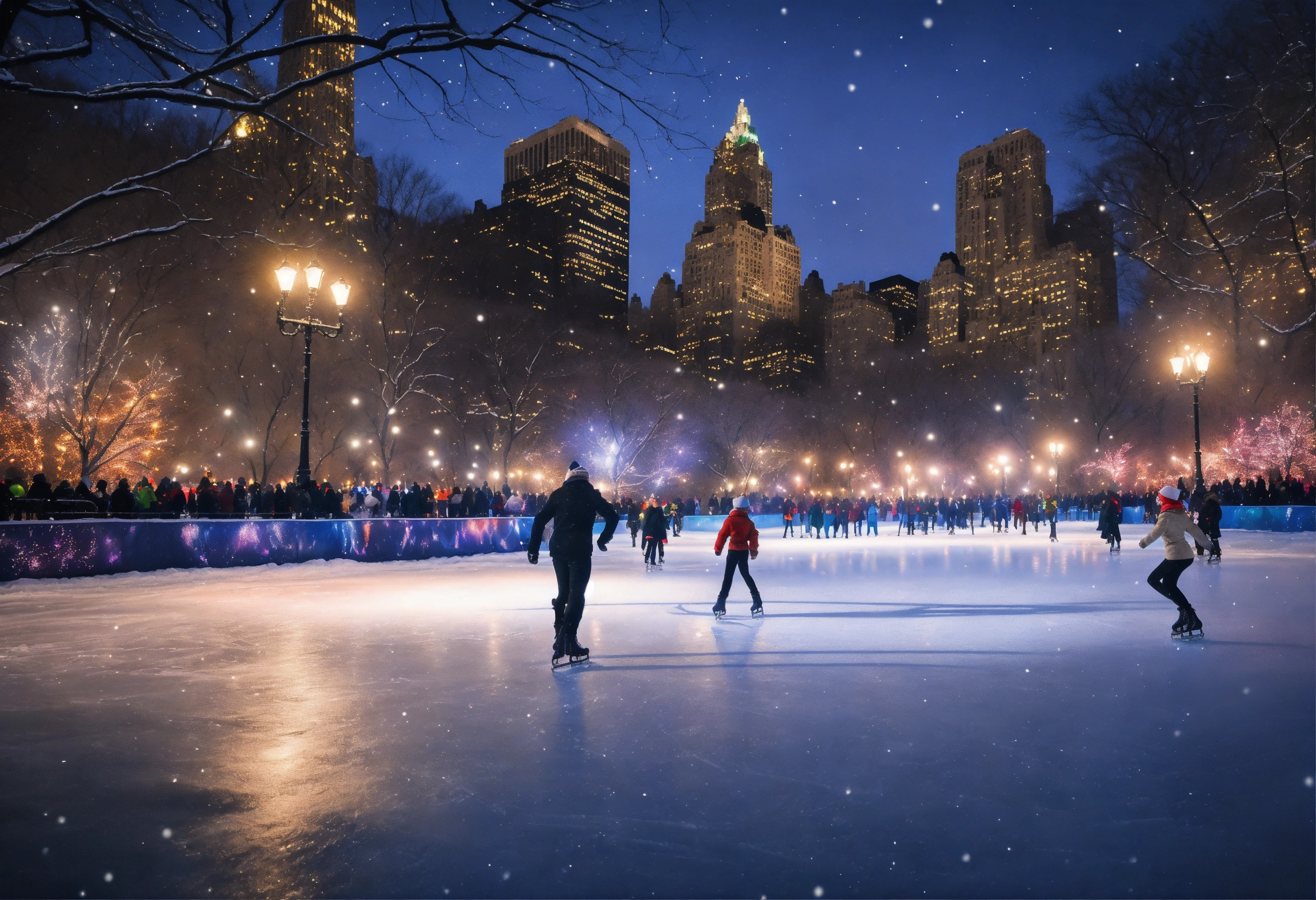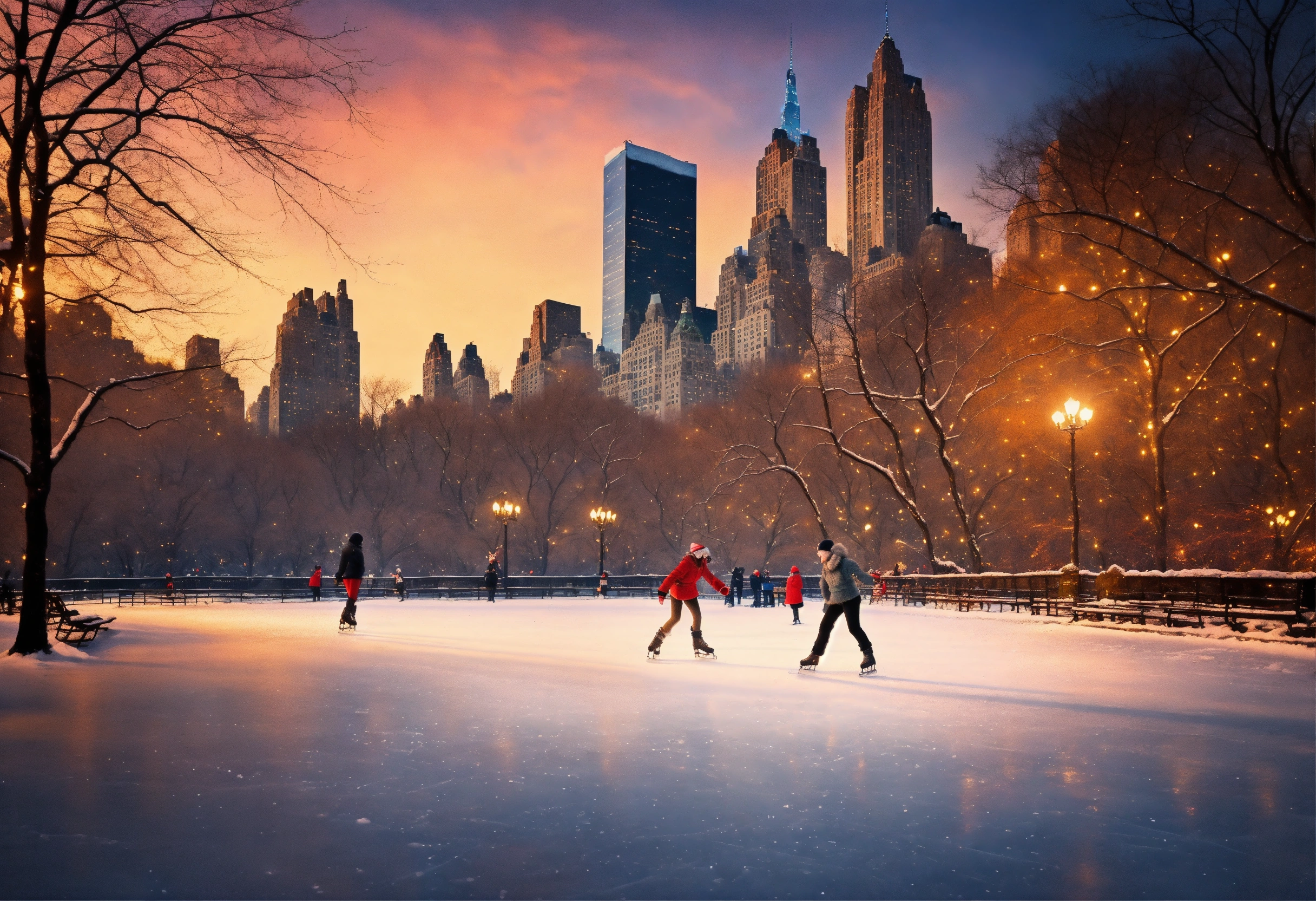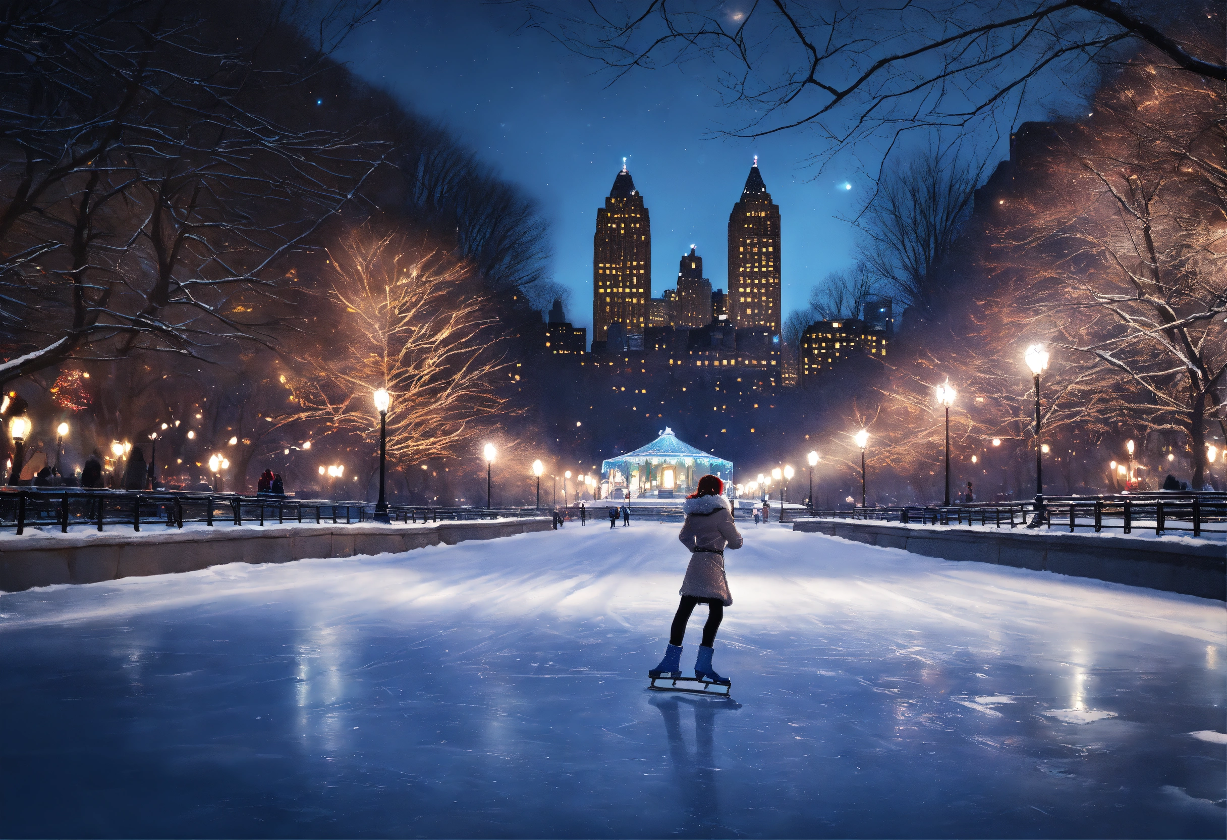 Epic beautiful shot of a ultra detailed little nostalgic adult ice skater in new yorks central park, the ice skater is the right side of the picture, dark christmas background, vintage aesthetics, ultra cozy, luminous, digital painting, sharp focus, ultra cozy and inviting, wish to be there. very detailed, arty, should rank high on youtube for a dream trip.