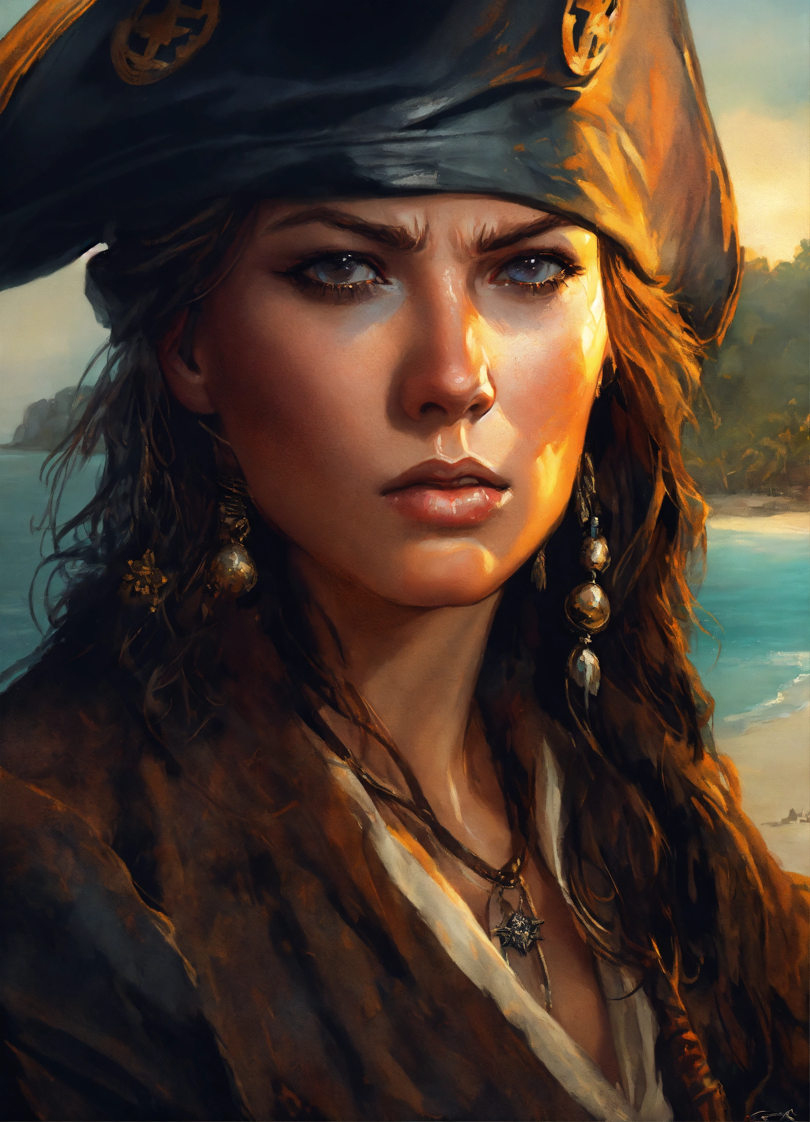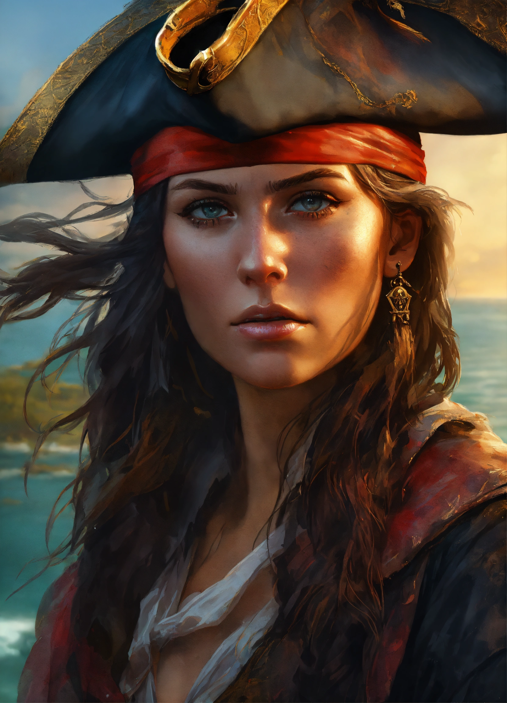 Close up portrait, digital painting, epic defiant angry skinny female pirate captain looking front, head bandana, colonial, bahamas, tropical isle background, dark ambient, ethereal, sadness, sorrow, wearing dirty old ruined robes, sunset, highly detailed, poster art by greg rutkowski, magalie villaneuve, craig mullins, by artgem, artstation, pinterest.