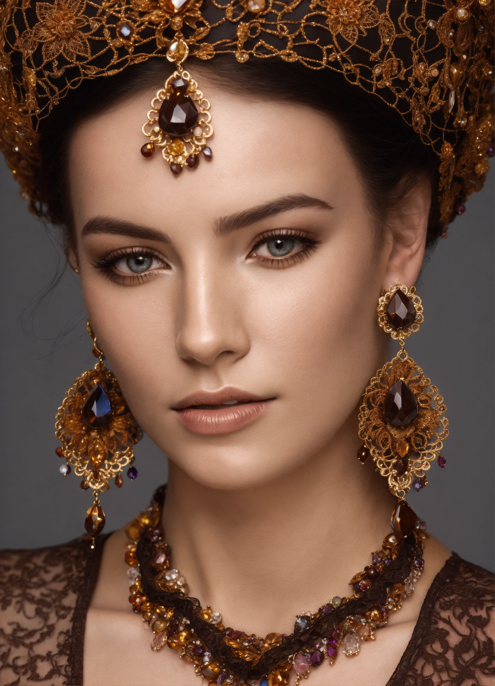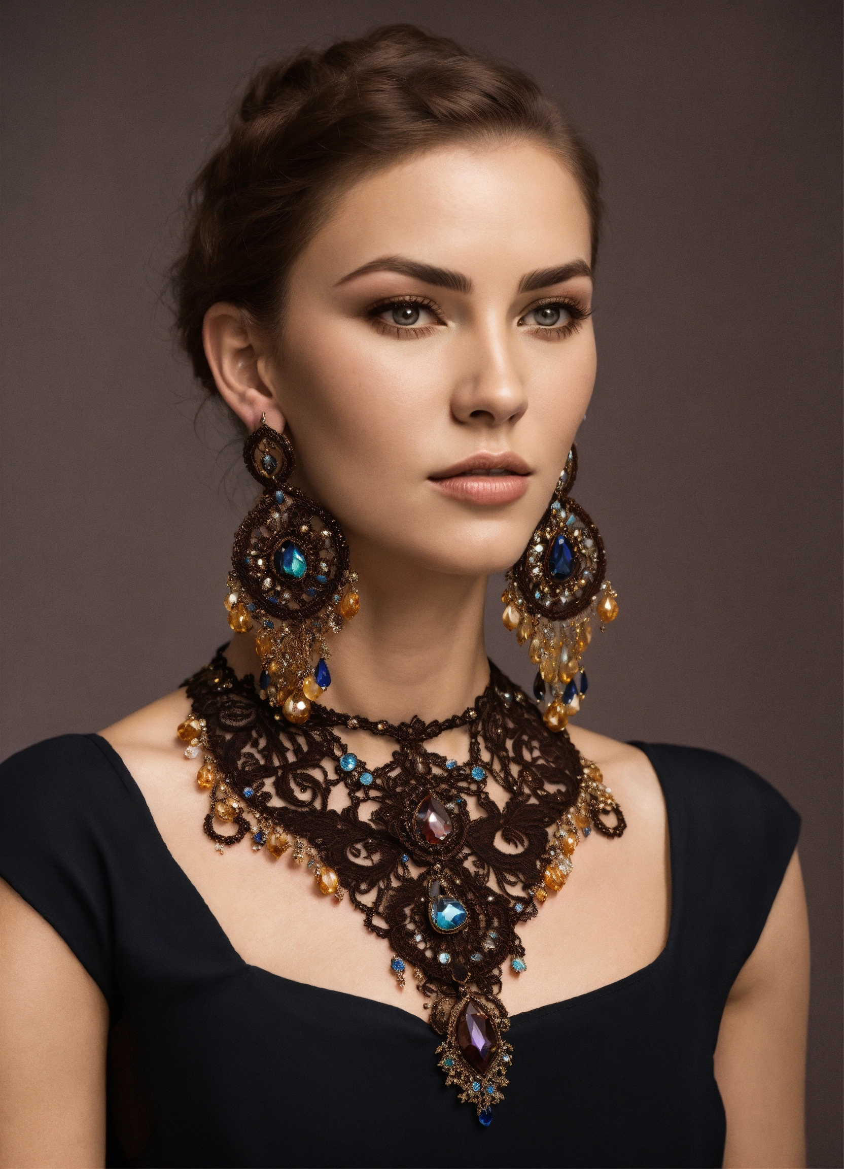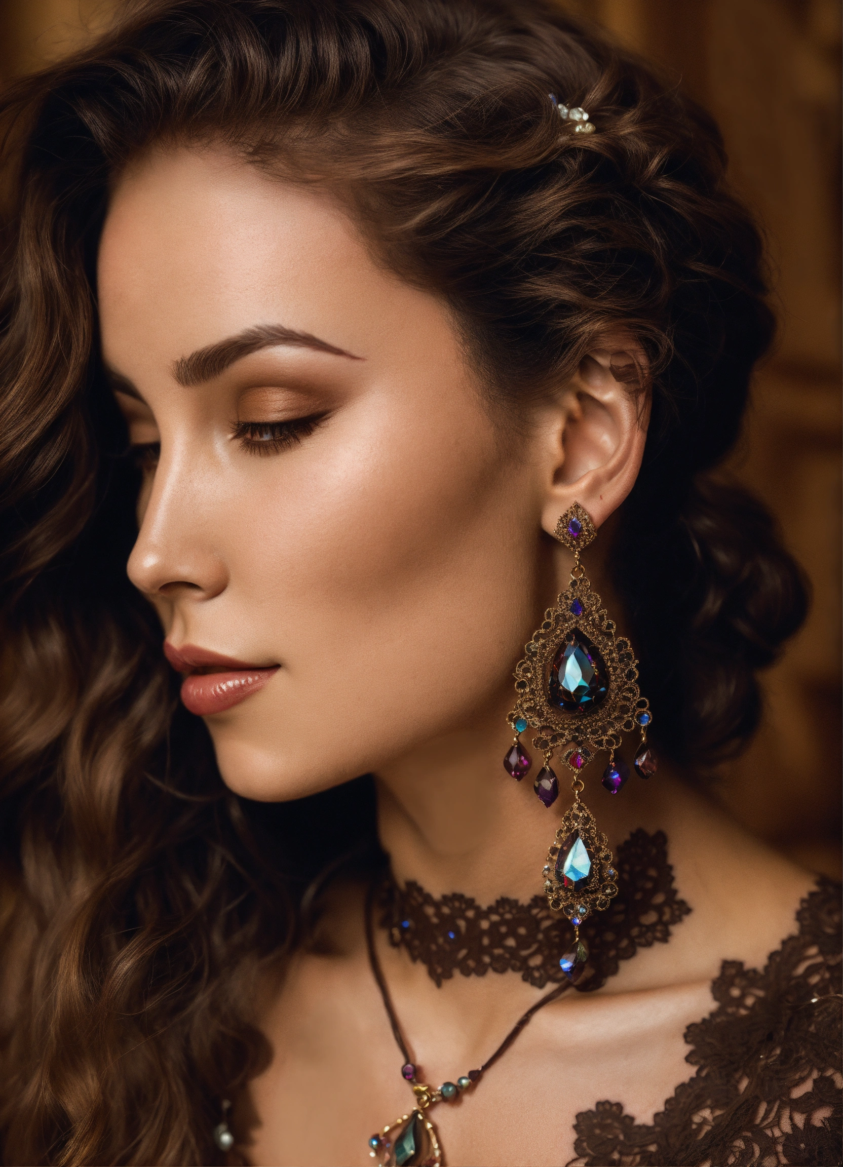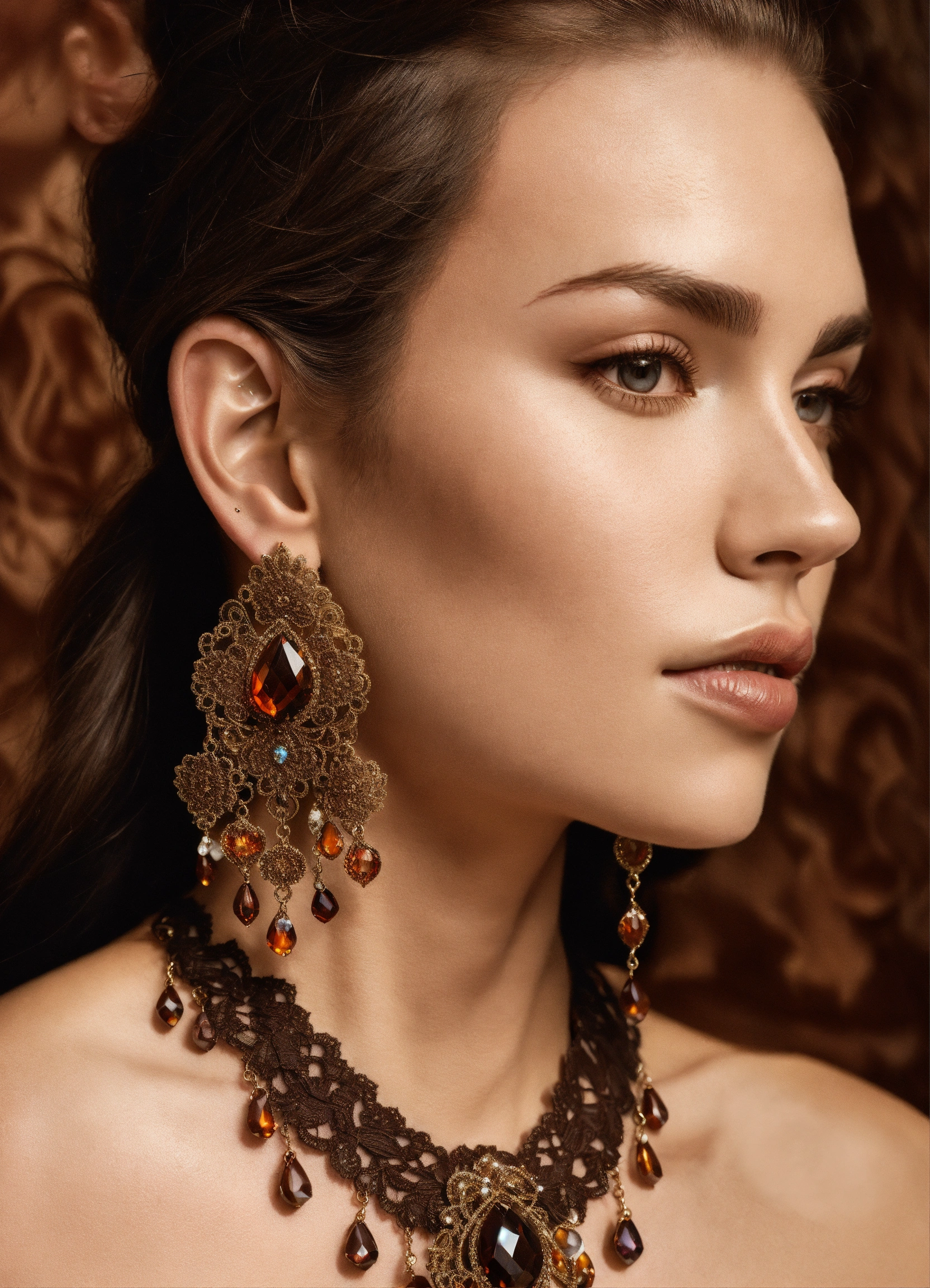 A woman wearing luxurious detailed dark chocolate color tatted lace earrings decorated with precious stones and crystals in the style of liam sharp, dutch tradition, webcam, gail simone, mark seliger, 8k, high resolution