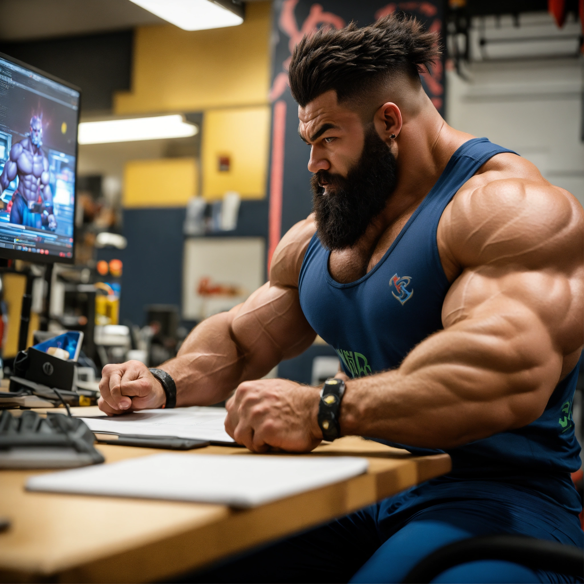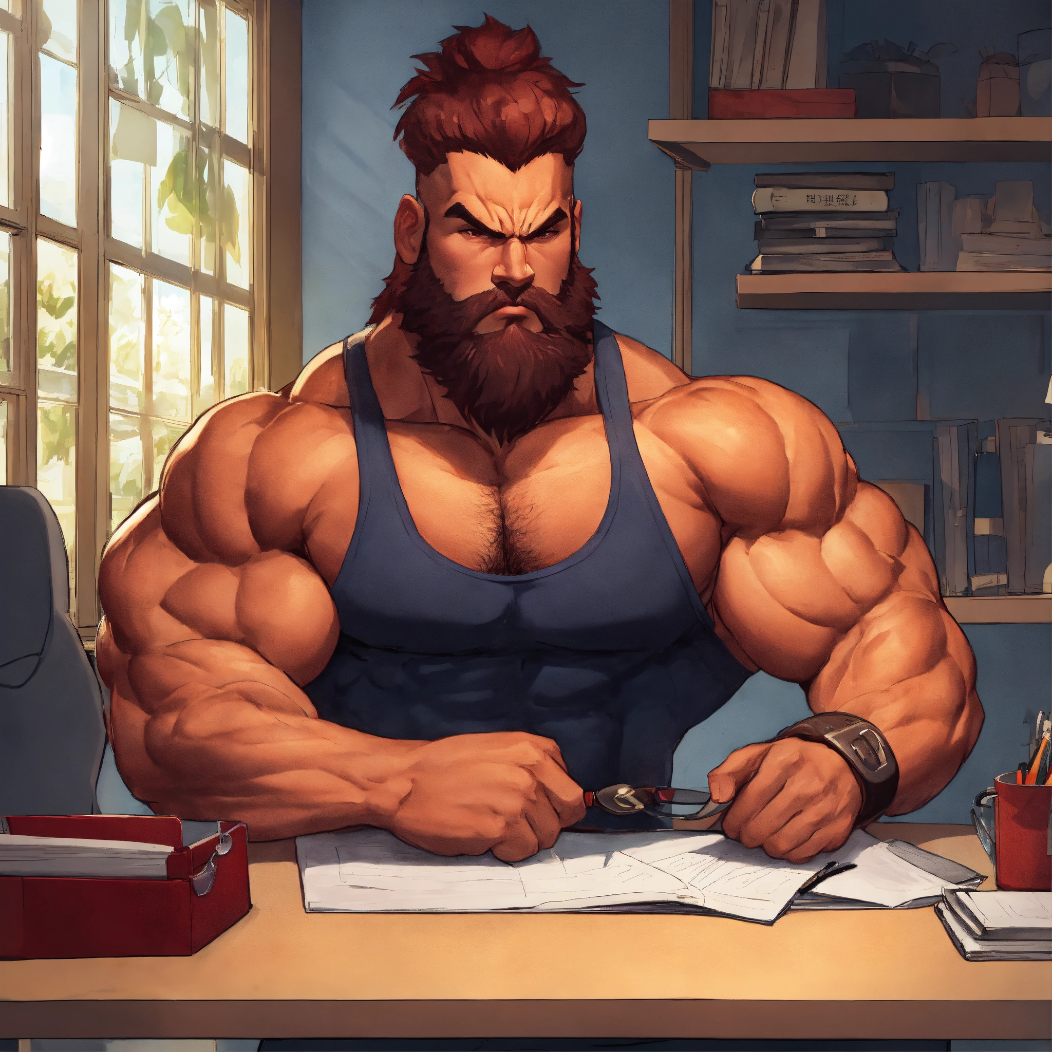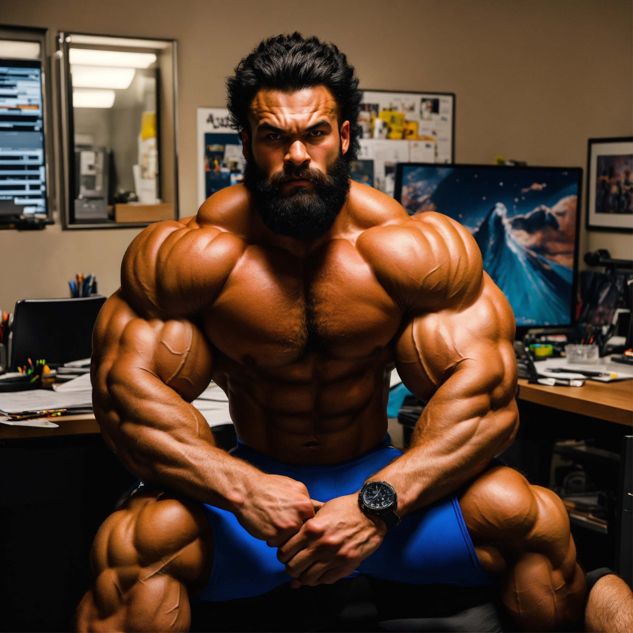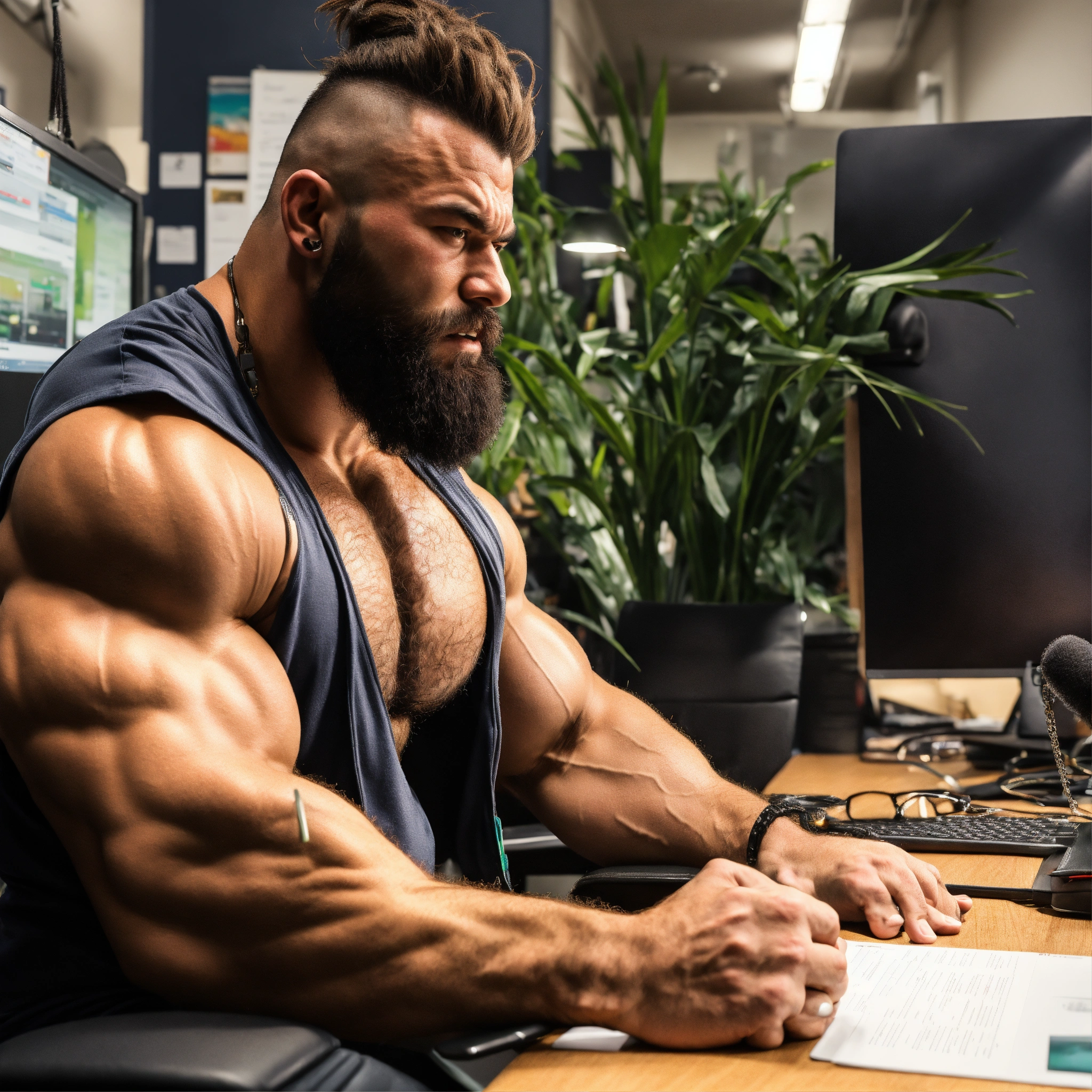 30-year-old hairy man with big muscles, akuma from street fighter, big bodybuilder, body like a wrestler, at work in his office